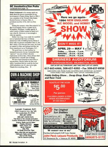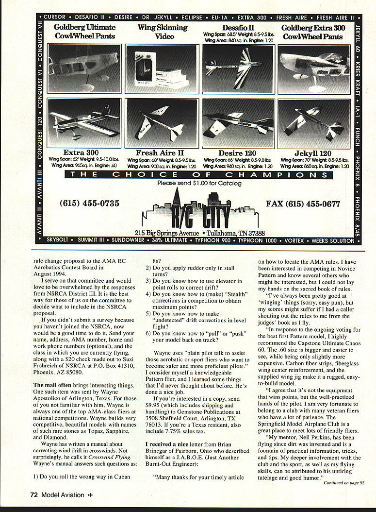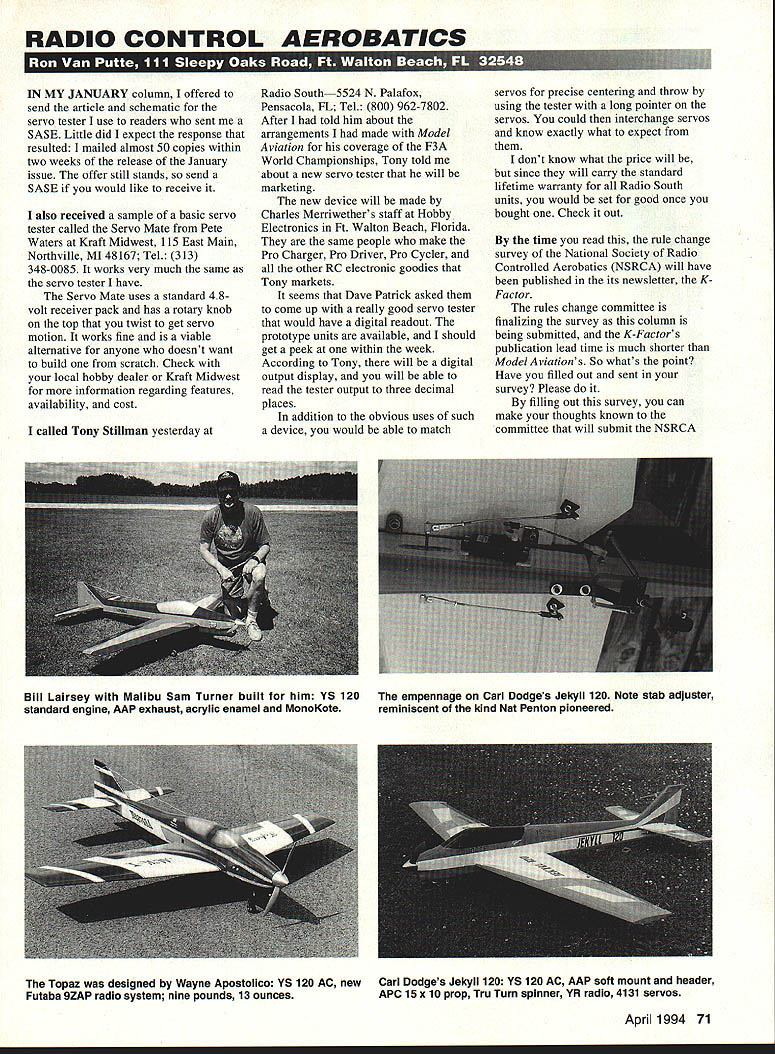 RADIO CONTROL AEROBATICS IN MY JANUARY column offered send article schematic servo tester use readers sent SASE Little did expect response resulted mailed almost 50 copies within two weeks release January issue offer still stands send SASE would like receive also received sample basic servo tester called Servo Mate Pete Waters Kraft Midwest 115 East Main Northville MI 48167 Tel 313 348-0085 works very much same servo tester have Servo Mate uses standard 48volt receiver pack has rotary knob top twist get servo motion works fine viable alternative anyone doesnt want build scratch Check local hobby dealer Kraft Midwest information regarding features availability cost called Tony Stiliman yesterday Radio South5524 N Palafox Pensacola FL Tel 800 962-7802 After told him about arrangements made Model Aviation coverage F3A World Championships Tony told about new servo tester will marketing new device will made Charles Merriwether s staff Hobby Electronics Ft Walton Beach Florida same people make Pro Charger Pro Driver Pro Cycler other RC electronic goodies Tony markets seems Dave Patrick asked come up really good servo tester would have digital readout prototype units available should get peek within week According Tony will digital output display will able read tester output three decimal places addition obvious uses such device would able match servos precise centering throw using tester long pointer servos could interchange servos know exactly what expect dont know what price will since will carry standard lifetime warranty Radio South units would set good once bought Check out time read rule change survey National Society Radio Controlled Aerobatics NSRCA will have published its newsletter KFactor rules change committee finalizing survey column being submitted K-Factors publication lead time much shorter Model Aviations So whats point Have filled out sent survey Please filling out survey can make thoughts known committee will submit NSRCA April 1994 71 Bill Lairsey Malibu Sam Turner built him VS 120 empennage Carl Dodges Jekyll 120 Note stab adjuster standard engine AAP exhaust acrylic enamel MonoKote reminiscent kind Nat Penton pioneered Topaz designed Wayne Apostolico VS 120 AC new Carl Dodges Jekyll 120 VS 120 AC AAP soff mount header Futaba 9ZAP radio system nine pounds 13 ounces APC 15 x 10 prop Tru Turn spinner YR radio 4131 servos GoldbergUltimate CowlWheel Pants Wing Skinning Video Desaflo II Wktq Span AR it 85-95 II Goldberg Extm 300 Cowl/Wheel Pants 615 455-0735 K Please send $100 Catalog 215 Big Springs Avenue ahoma TN 37388 rule change proposal AMA RC Aerobatics Contest Board August 1994 serve committee would love overwhelmed responses NSRCA District III best way us committee decide what include NSRCA proposal didnt submit survey because havent joined NSRCA now would good time Send name address AMA number home work phone numbers optional class currently flying along $20 check made out Suzi Frohreich NSRCA PO Box 41310 Phoenix AZ 85080 mail often brings interesting things such item sent Wayne Apostolico Arlington Texas familiar him Wayne always top AMA-class fliers national competitions Wayne builds very competitive beautiful models names such rare stones Topaz Sapphire Diamond Wayne has written manual about correcting wind drift crosswinds surprisingly calls Crosswind Flying Waynes manual answers such questions 1 Do roll wrong way Cuban 8s 2 Do apply rudder stall turns 3 Do know use elevator point rolls correct drift 4 Do know make Stealth corrections competition obtain maximum points 5 Do know make undetected drift corrections level flight 6 Do know pull push model back track Wayne uses plain pilot talk assist aerobatic sport fliers want become safer proficient pilots consider myself knowledgeable Pattern flier learned some things Id never thought about before Hes done nice job youre interested copy send $995 includes shipping handling Gemstone Publications 3508 Sheffield Court Arlington TX 76013 youre Texas resident also include 775% sales tax received nice letter Brian Brinegar Fairborn Ohio described himself JABOE Just Another Burnt-Out Engineer thanks timely article locate AMA rules have interested competing Novice Pattern know several others might interested could lay hands sacred book rules Ive always pretty good winging things sorry easy pun scores might suffer caller shouting out rules judges book fly response ongoing voting best first Pattern model highly recommend Capstone Ultimate Chaos 60 60 size bigger easier see being slightly expensive Carbon fiber strips fiberglass wing center reinforcement supplied wing jig make rugged easyto-build model agree its equipment wins points well-practiced hands pilot am very fortunate belong club veteran fliers have lot patience Springfield Model Airplane Club great place meet lots friendly fliers mentor Neil Perkins has flying since dirt invented fountain practical information tricks tips deeper involvement club sport well flying skills can attributed untiring tutelage good humor Continued page 92 72 Model Aviation a 300 Wing Span 62 WeIght 95- 100 lbs Wing Area 965sq Engine 60 iresii Wing Span 68 WelgIt 85-95 t Wing Span W WeIght 85-90 lbs Wing Area 9CD sq h Engine 120 Wing Area 940 sq n Engine 120 Wing Span85-95 lbs Wing Area 860 sq h Engine 120 FAX 615 455-0677 RC Aerobatics/Van Putte Continued page 72 Brians testament mentor made think about person responsible involvement Pattern flying Back 19651 member Western Ohio Radio Kontrol Society Dayton Ohio prominent member club Don Lowe During summer Don asked Id like accompany him contest up Wyandotte Michigan readily agreed wasnt really Pattern contest much fun-fly However enough whet appetite Before very long under watchful eye practiced Class Pattern maneuvers Goldberg Senior Falcon know geezers remember Class thats okay Over next few years went contests Ohio Indiana until Air Force transferred Washington DC good times continue treasured memories remember groovy Dons favorite expr