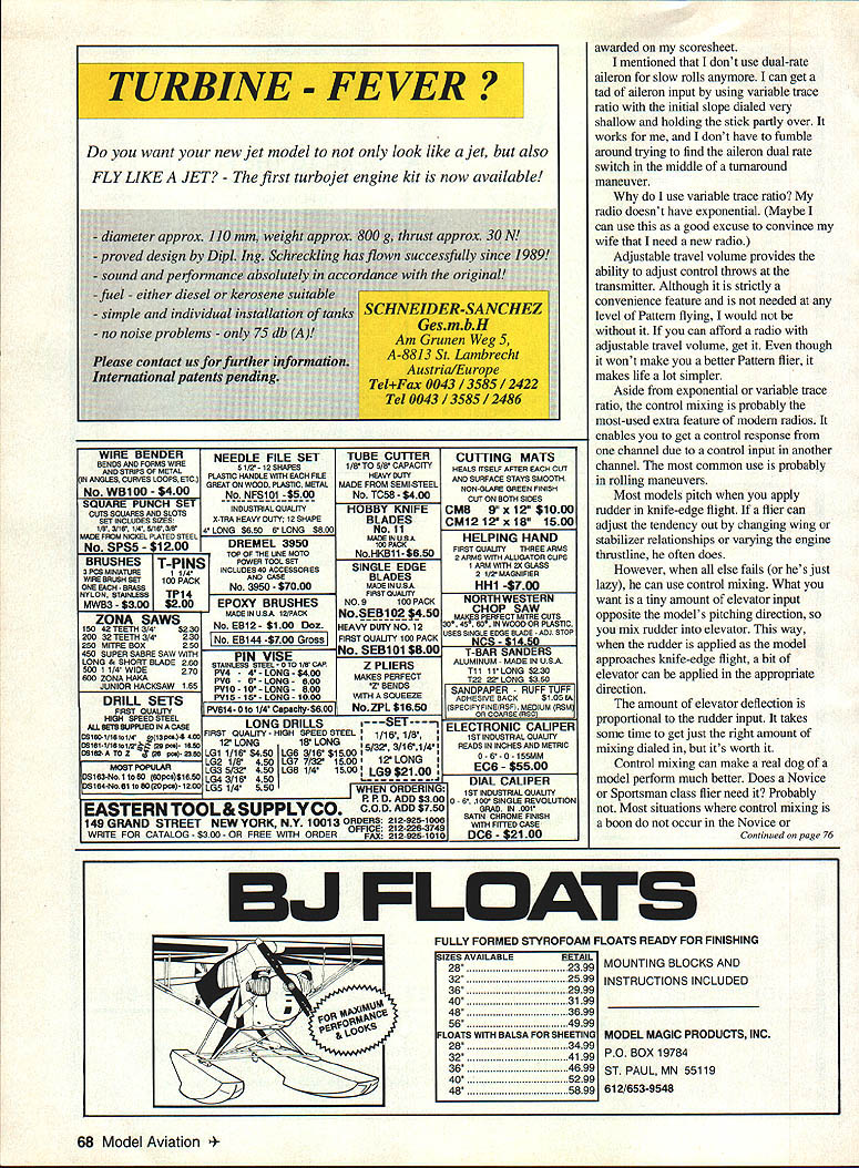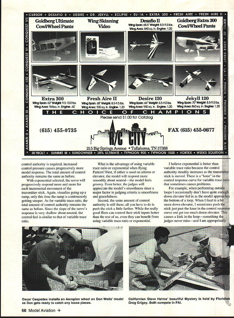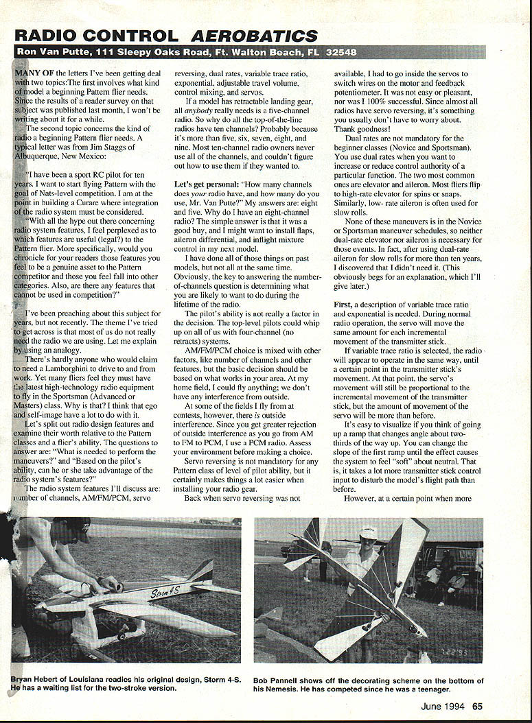 RADIO CONTROL AEROBATICS NY OF letters Ive getting deal two topicsThe first involves what kind odel beginning Pattern flier needs e results reader survey ect published last month wont ing about fhe second topic concerns kind o beginning Pattern flier needs cal letter Jim Staggs uquerque New Mexico have sport RC pilot ten rs want start flying Pattern i Nats-level competition am building Curare integration radio system must considered hype out concerning u system features feel perplexed h features useful legal tern flier specifically would micle readers featares genuine asset Pattern ipetitor feel fall other tgories Also features used competition ye preaching about subject s recently theme Ive tried across us really radio using Let explain sing analogy Theres hardly anyone would claim need Lamborghini drive work Yet fliers feel must have i1atest high-technology radio equipment Sportsman Advanced Masters class think ego id self-image have lot jets split out radio design features aimne worth relative Pattern ~sses fliers ability questions $uwer What needed perform flianeuvers Based pilots aility can take advantage t~io systems features radio system features Ill discuss channels AMIFMIPCM servo reversing dual rates variable trace ratio exponential adjustable travel volume control mixing servos model has retractable landing gear anybody really needs five-channel radio So top-of-the-line radios have ten channels Probably because its five six seven eight nine Most ten-channel radio owners never use channels couldnt figure out use wanted Lets get personal channels does radio have use Mr Van Putte answers eight five have eight-channel radio simple answer good buy might want install flaps aileron differential inflight mixture control next model have done things past models same time Obviously key answering numberof-channels question detennining what likely want during lifetime radio pilots ability really factor decision top-level pilots could whip up us four-channel no retracts systems AMIFMIPCM choice mixed other factors like number channels other features basic decision should based what works area home field could fly anything dont have interference outside some fields fly contests however outside interference Since get greater rejection outside interference go AM FM PCM use PCM radio Assess environment before making choice Servo reversing mandatory Pattern class level pilot ability certainly makes things lot easier installing radio gear Back servo reversing available go inside servos switch wires motor feedback potentiometer easy pleasant nor 100% successful Since almost radios have servo reversing its something usually dont have wony about Thank goodness Dual rates mandatory beginner classes Novice Sportsman use dual rates want increase reduce control authority particular function two common ones elevator aileron Most fliers flip high-rate elevator spins snaps Similarly low- rate aileron often used slow rolls None maneuvers Novice Sportsman maneuver schedules neither dual-rate elevator nor aileron necessary events fact after using dual-rate aileron slow rolls ten years discovered didnt need obviously begs explanation Ill give later First description variable trace ratio exponential needed During normal radio operation servo will move same amount incremental movement transmitter stick variable trace ratio selected radio will appear operate same way until certain point transmitter sticks movement point servos movement will still proportional incremental movement transmitter stick amount movement servo will before Its easy visualize think going up ramp changes angle about twothirds way up can change slope first ramp until effect causes system feel soft about neutral takes lot transmitter stick control input disturb models flight path before However certain point June 1994 65 glyan Hebert Louisiana readies original design Storm 4-S ls has waiting list two-stroke version Bob Pannell shows off decorating scheme bottom Nemesis has competed since teenager control authority required increased control pressure causes progressively model response total amount control authority remains same before exponential selected servo will progressively respond more incremental movement transmitter stick Again visualize going up ramp time ramp continuously getting steeper As variable trace ratio total amount control authority remains same before Since slope servos response very shallow about neutral control feel similar variable trace ratio What advantage using variable trace ratio exponential flying Pattern First either used aileron elevator model will respond smoothly about neutralthe model feels groovy better judges will appreciate models smoothness since major factor judging criteria smoothness gracefulness Second same amount control authority still have push stick little farther really good fliers can control stick inputs better rest us can benefit using variable trace ratio exponential believe exponential better variable trace ratio because control authority steadily increases transn$t stick moved knee control response curve variable trace atio sometimes causes problems example performing outsi& loops occasionally dont have quite enciii4li down elevator fed model approachs bottom loop feed bit~ down elevator sometimes push stick just past knee control response curve get too much down elevator causes kink loopsomething judges never missand am appropriately 66 Model Aviation r Cespedes installs Aeroplan wheel Don Weitz model Californian Steve Helms beautiful Mystery held FloridWA Don gets ready catch loose pieces Greg Grigsy Both compete FAI TURBINE FEVER want new jet model look like jet also FLY LIKE JET first turbojet engine kit now available diameter appro proved design sound -fuel either dies simple mdii no noise probki Please contact UA Intern ational pai WIRE oun BENDS AND FORMS WiRE AND STRIPS OF METAL IN ANGLES CURVES LOOPS ETC No WB100 $400 SQUARE PUNCH sEl CUTS SQUARES AND SLOTS SET INC WOES SIZES No S
