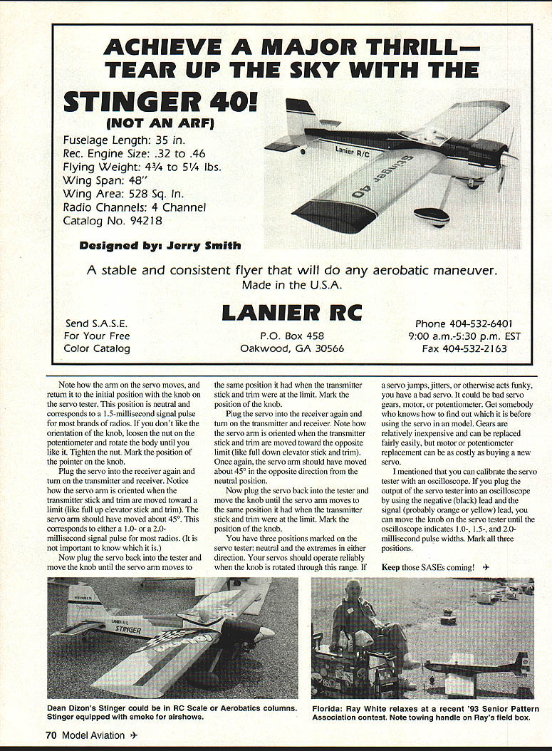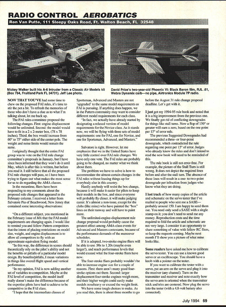 RADIO CONTROL AEROBATICS NOW THAT YOUVE some time chew proposed FAA rules its time stir pot bit refresh memories dont have clue what Im talking about let back up FAT rules committee proposed following changes First engine displacement would unlimited Second model would have fit 2 x 2-meter box 78 x 78 inches Third box would increase 600 750 either side center pole weight noise limits would remain same originally thought entire FAT group vote FAT rule change committees proposals January have since informed wont until May after written before read still believe proposed FAT rule changes will pass have trying figure out what makes sense us regarding AMA classes meantime fliers have responding comments about proposed rule changes appeared February column received letter Salvatore Piu Beachwood New Jersey contained some interesting observations different subject mentioned February issue MA FAT model requirements changing again would like remind fellow Pattern competitors intent placing restrictions model size weight engine displacement allow competitors fly approximate equivalent flying model way difference scores should theoretically rely pilots ability benefits pitfalls particular model design benefits/pitfalls mean variations things like overall flight speed vertical performance opinion FAT now adding another set variables competition Maybe FAT level competition model itself really doesnt make difference because expertise pilots have achieve competitive FAT class hope intermediate classes Sportsman Advanced Masters upgraded same model requirements FAT pursuing anything does happen Pattern community may want consider different model requirements class fact actually have already started designating relaxed version model requirements Novice class As stands now will flying three sets model requirements FAT Novice Sportsman Advanced Masters Salvatore right However let emphasize United States have very little control over FAT rule changes have oaly vote FAT rules probably going changed no matter what think about problem have solve accommodate almost-certain changes FAA rules lousing things up everybody else country Hardiy anybody will resist box change because will make easier pilots keep models box since everyone will probably fly closer will make judging easier Its almost non-issue except clubs like have painted box lines runway will have paint unlimited-engine-displacement rule change proposal would probably cause greatest effect among AMA-class events Advanced Masters contestants because performance demands maneuver schedules adopted two-stroke engine fliers will able use 90s 1 20s maybe larger reach performance levels would exceed what four-stroke fliers have now four-stroke fliers probably wouldnt able increase engine size couple reasons First arent good fourstroke options out Second larger displacement four-stroke engines weigh higher weight could easily make models noseheavy exceed weight limit have some tough choices make As read about three months go before August 31 rule change proposal deadiine Lets get just got 1994-95 rule book noted big improvement previous finally got rid conflicting downgrades things like stall turns Now flop 1500 greater will eam zero based point per 150 error rule previous Suggested Downgrades recommended three- four-point downgrade contradicted rule regarding point per 150 error Judges already know rules dont intend read new book will need reminded rule book still error-free example picture Stall Turn still wrong does depict required lines before after stall turn absence lines will result one- two-point downgrade per infraction judges know what doing lost track copies article schematic servo tester Ive mailed people sent SASE probably around 150 am happy send out need send SASE single stamp dont need send money Reproduction costs time required fold article schematic very large consider opportunity share something value fellow RC fliers keep requests coming Maybe next month Ill show picture what looks like Some readers have asked calibrate servo tester can use known good servo oscilloscope should have knob pointer tester want calibrate tester servo put arm servo plug receiver channel Turn transmitter receiver note exactly servo arm oriented transmitter stick trim centered Now plug servo tester 48-volt battery also connected July1994 69 Mickey Walker built A-6 Intruder Classic Air Models kit David Prices two-year-old Phoenix VI Black Baron film RJL 61 Box 784 Fruitland Park FL 34731 Jeff Lee photo Webra Dynamix carbno pipe Airtronics Module 7P radio ACHIEVE MAJOR THRILL TEAR UP THE SKY WITH THE STINGER 40 NOT ARFJ Fuselage Length 35 Rec Engine Size 32 46 Flying Weight 43/4 5 lbs Wing Span 48 Wing Area 528 Sq Radio Channels 4 Channel Catalog No 94218 Designed byu Jerry SmIIh stable consistent flyer will aerobatic maneuver Made USA Send SASE Free Color Catalog LANIER RC PO Box 458 Oakwood GA 30566 Phone 404-532-6401 900 am-530 pm EST Fax 404-532-2163 Note arm servo moves return initial position knob servo tester position neutral corresponds 15-millisecond signal pulse brands radios dont like orientation knob loosen nut potentiometer rotate body until like Tighten nut Mark position pointer knob Plug servo receiver again turn transmitter receiver Notice servo arm oriented transmitter stick trim moved toward limit like full up elevator stick trim servo arm should have moved about 450 fl corresponds either 10- 20millisecond signal pulse radios important know Now plug servo back tester move knob until servo arm moves same position transmitter stick trim limit Mark position knob Plug servo receiver again turn transmitter receiver Note servo arm oriented transmitter stick trim moved toward opposite limit like full down elevator stick trim Once again servo arm should have moved about 450 opposite direction neutral position Now plug servo back tester move knob until servo arm moves same position transmitter stick trim limit Mark position knob have three positions marked s