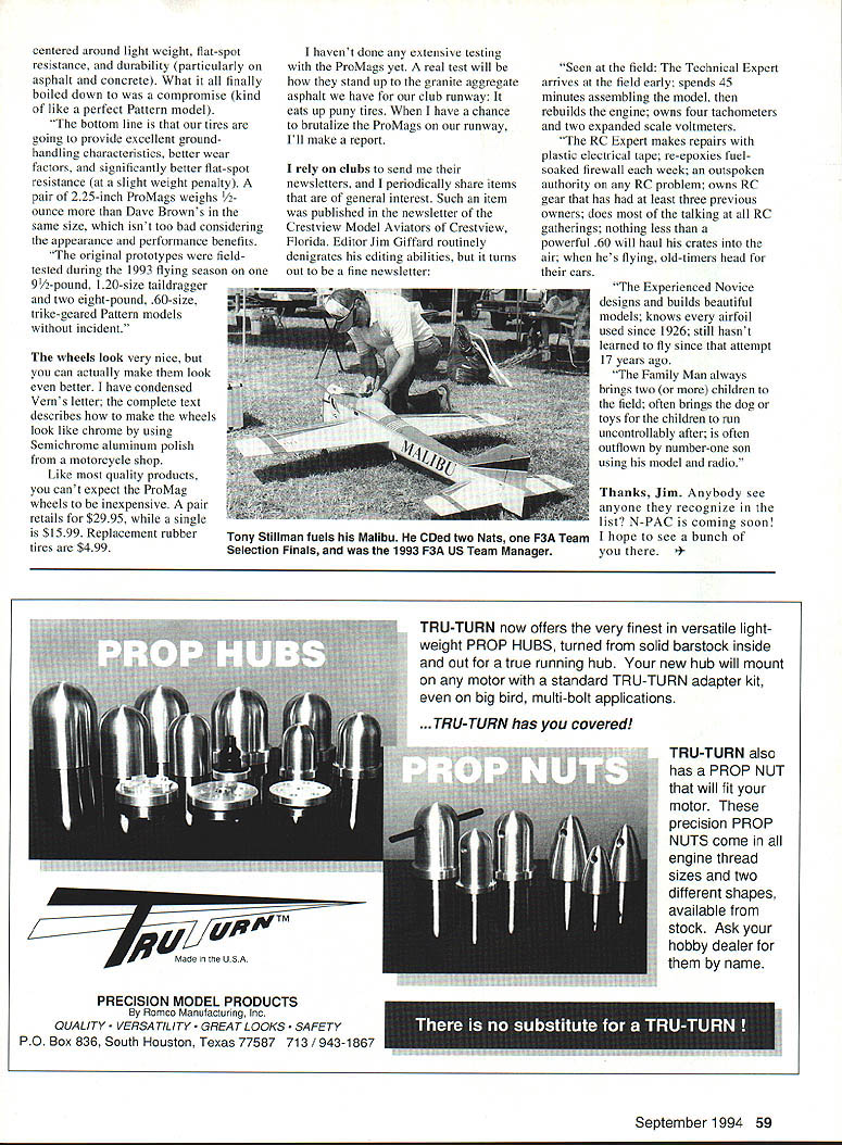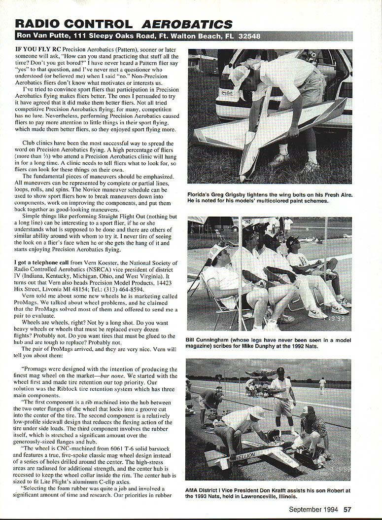 RADIO CONTROL AEROBATICS IF YOU FLY RC Precision Aerobatics Pattern sooner later someone will ask can stand practicing stuff time Dont get bored have never heard Pattern flier say yes question Ive never met questioner understood believed said no Non-Precision Aerobatics fliers dont know what motivates interests us Ive tried convince sport fliers participation Precision Aerobatics flying makes fliers better ones persuaded try have agreed did make better fliers tried competitive Precision Aerobatics flying competition has no lure Nevertheless performing Precision Aerobatics caused fliers pay attention little things sport flying made better fliers enjoyed sport flying Club clinics have successful way spread word Precision Aerobatics flying high percentage fliers 1/3 attend Precision Aerobatics clinic will hang long time clinic needs tell fliers what look fliers can look things own fundamental pieces maneuvers should emphasized maneuvers can represented complete partial lines loops rolls spins Novice maneuver schedule can used show sport fliers break maneuvers down components work improving components put back together good-looking maneuvers Simple things like performing Straight Flight Out nothing long line can interesting sport flier understands what supposed done others similar ability around try never tire seeing look fliers face gets hang starts enjoying Precision Aerobatics flying I got telephone call Vein Koester National Society Radio Controlled Aerobatics NSRCA vice president district IV Indiana Kentucky Michigan Ohio West Virginia turns out Vein also heads Precision Model Products 14423 Hix Street Livonia MI 48154 Tel 313 464-8594 Vein told about some new wheels marketing called ProMags talked about wheel problems claimed ProMags solved offered send pair evaluate Wheels wheels right long shot want heavy wheels wheels must replaced dozen flights Probably want tires must glued hub tough replace Probably pair ProMags arrived very nice Vein will tell about Promags designed intention producing finest mag wheel marketbar started wheel first made tire retention top priority solution Riblock tire retention system has three main components first component rib machined hub between two outer flanges wheel locks groove cut center tire second component relatively low-profile sidewall design reduces flexing action tire under side loads third component involves rubber itself stretched significant amount over generously-sized flanges hub wheel CNC-machined 6061 T-6 solid barstock features true five-spoke classic mag wheel design instead series holes drilled around center high-stress areas radiused additional strength center hub recessed keep wheel collar inside rim center hub sized fit Lite Flights aluminum C-clip axles Selecting foam rubber quite ajnh involved significant amount time research priorities rubber September 1994 57 Floridas Greg Grigsby tightens wing bolts Fresh Aire noted models multicolored paint schemes Bill Cunningham legs have never seen model magazine scribes Mike Dunphy 1992 Nats AMA District Vice President Don Krafft assists son Robert 1993 Nats held Lawrenceville Illinois centered around light weight flat-spot resistance durability particularly asphalt concrete What finally boiled down compromise kind like perfect Pattern model bottom line tires going provide excellent groundhandling characteristics better wear factors significantly better flat-spot resistance slight weight penalty pair 225-inch ProMags weighs 1/2 ounce Dave Browns same size isnt too considering appearance performance benefits original prototypes fieldtested during 1993 flying season 9/2-pound 120-size taildragger two eight-pound 60-size trike-geared Pattern models incident wheels look very nice can actually make look better have condensed Veins letter complete text describes make wheels look like chrome using Semichinome aluminum polish motorcycle shop Like quality products cant expect ProMag wheels inexpensive pair retails $2995 single $1599 Replacement rubber tires $499 havent done extensive testing ProMags yet real test will stand up granite aggregate asphalt have club runway eats up puny tires have chance brutalize ProMags runway Ill make report rely clubs send newsletters periodically share items general interest Such item published newsletter Crestview Model Aviators Crestview Florida Editor Jim Giffard routinely denigrates editing abilities turns out fine newsletter 1 Seen field Technical Expert arrives field early spends 45 minutes assembling model rebuilds engine owns four tachometers two expanded scale voltmeters RC Expert makes repairs plastic electrical tape re-epoxies fuelsoaked firewall week outspoken authority RC problem owns RC gear has least three previous owners does talking RC gatherings nothing less powerful 60 will haul crates air hes flying old-timers head cars Experienced Novice designs builds beautiful models knows airfoil used since 1926 still hasnt learned fly since attempt 17 years ago Family Man always brings two children field often brings dog toys children run uncontrollably after often outfiown number-one son using model radio Thanks Jim Anybody see anyone recognize list N-PAC coming soon hope see bunch 4September 1994 59 Tony Stiliman fuels Malibu CDed two Nats F3A Team Selection Finals 1993 F3A US Team Manager TRU-TURN now offers very finest versatile light weight PROP HUBS turned solid barstock inside out true running hub new hub will mount motor standard TRU-TURN adapter kit big bird multi-bolt applications TRU-TURN has covered Made n u S TRU-TURN also has PROP NUT will fit motor precision PROP NUTS come engine thread sizes two different shapes available stock Ask hobby dealer name PRECISION MODEL PRODUCTS Romeo Manufacturing Inc QUALITY VERSATILITY GREAT LOOKS SAFETY PO Box 836 South Houston Texas 77587 713 / 943-1867