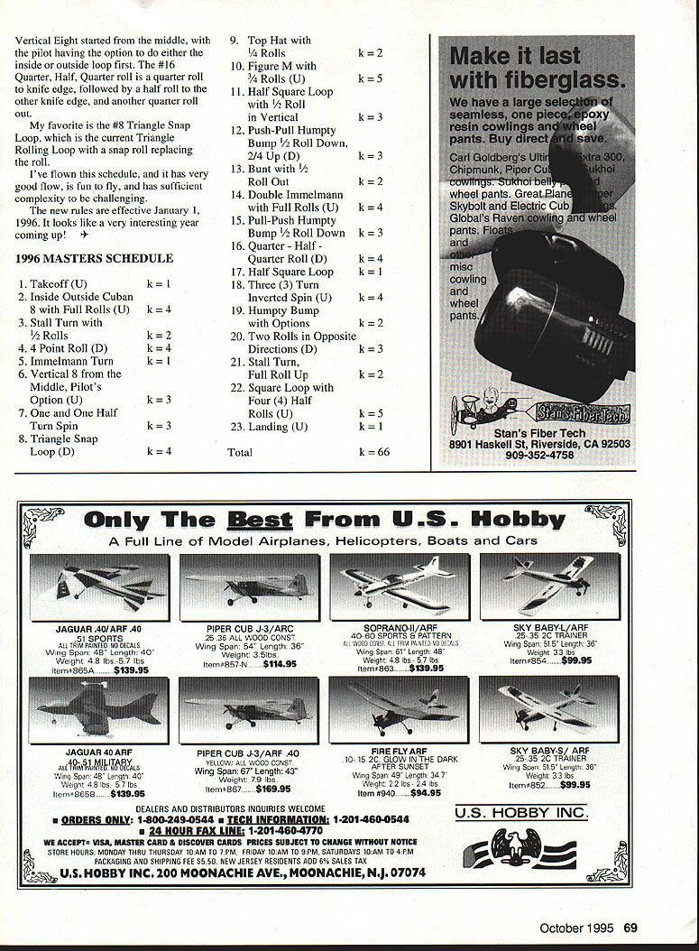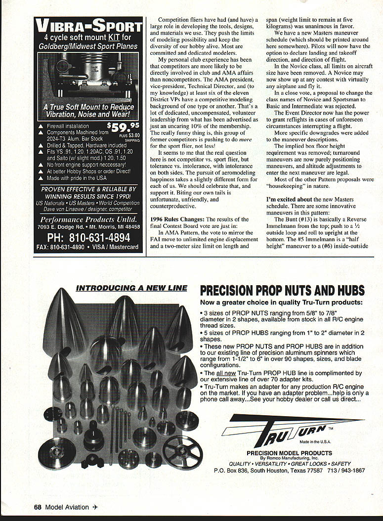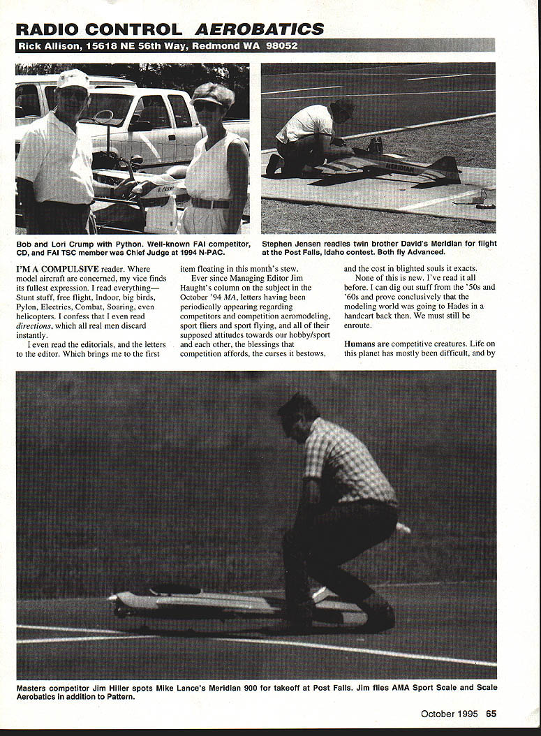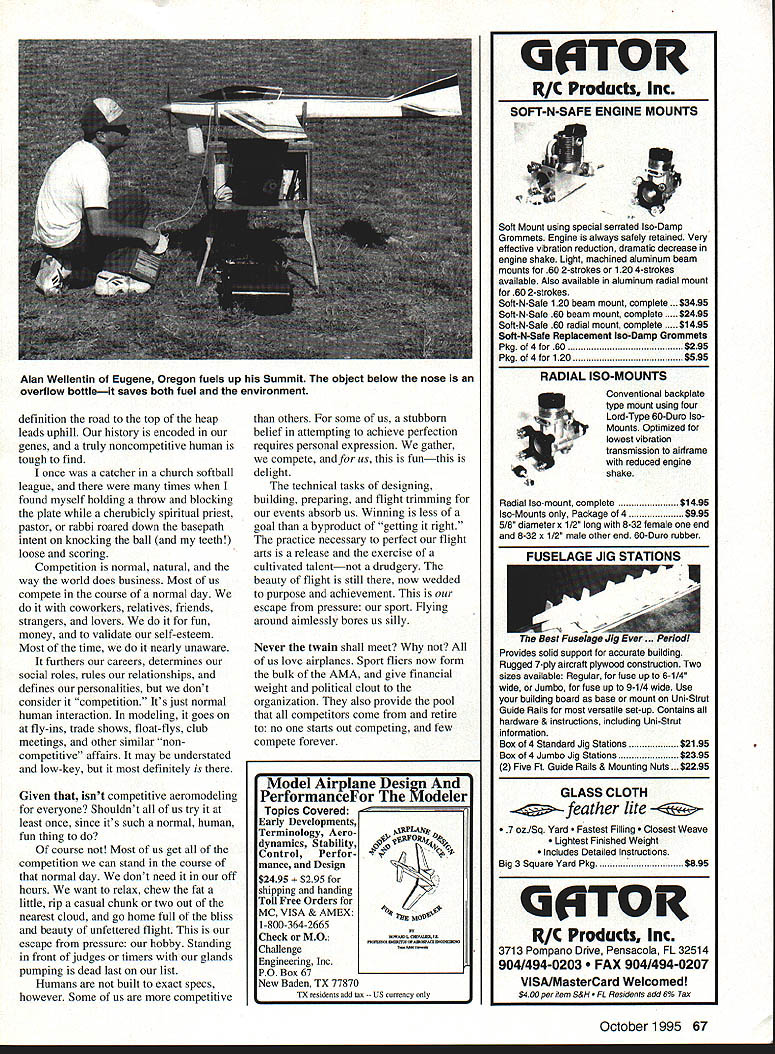 RADIO CONTROL AEROBATICS IM COMPULSIVE reader model aircraft concerned vice finds its fullest expression read everything Stunt stuff free flight Indoor big birds Pylon Electrics Combat Soaring helicopters confess read directions real men discard instantly read editorials letters editor Which brings first item floating months stew Ever since Managing Editor Jim Haughts column subject October 94 MA letters having periodically appearing regarding competitors competition aeromodeling sport fliers sport flying supposed attitudes towards bobby/sport other blessings competition affords curses bestows cost blighted souls exacts None new Ive read before can dig out stuff 50s 60s prove conclusively modeling world going Hades handcart back must still enroute Humans competitive creatures Life planet has mostly difficult October 1995 65 Bob Lan Crump Python Well-known FAI competitor CD FAI TSC member Chief Judge 1994 N-PAC Stephen Jensen readies twin brother Davids Meridian flight Post Falls Idaho contest Both fly Advanced Masters competitor Jim Hiller spots Mike Lances Meridian 900 takeoff Post Falls Jim flies AMA Sport Scale Scale Aerobatics addition Pattern definition road top heap leads uphill history encoded genes truly noncompetitive human tough find once catcher church softball league times found myself holding throw blocking plate cherubicly spiritual priest pastor rabbi roared down basepath intent knocking ball teeth loose scoring Competition normal natural way world does business Most us compete course normal day coworkers relatives friends strangers lovers fun money validate self-esteem Most time nearly unaware furthers careers determines social roles rules relationships defines personalities dont consider competition Its just normal human interaction modeling goes fly-ins trade shows float-flys club meetings other similar non competitive affairs may understated low-key definitely Given isnt competitive aeromodeling everyone Shouldnt us try least once since its such normal human fun thing course Most us get competition can stand course normal day dont need off hours want relax chew fat little rip casual chunk two out nearest cloud go home full bliss beauty unfettered flight escape pressure hobby Standing front judges timers glands pumping dead last list Humans built exact specs however Some us competitive others some us stubborn belief attempting achieve perfection requires personal expression gather compete andfor us funthis delight technical tasks designing building preparing flight trimming events absorb us Winning less goal byproduct getting right practice necessary perfect flight arts release exercise cultivated talentnot drudgery beauty flight still now wedded purpose achievement escape pressure sport Flying around aimlessly bores us silly Never twain shall meet us love airplanes Sport fliers now form bulk AMA give financial weight political clout organization also provide pooi competitors come retire no starts out competing few compete forever GEITOR RIC Products Inc SOFT-N-SAFE ENGINE MOUNTS Soft Mount using special serrated Iso-Damp Grommets Engine always safely retained Very effective vibration reduction dramatic decrease engine shake Light machined aluminum beam mounts 60 2-strokes 120 4-strokes available Also available aluminum radial mount 60 2-strokes Soft-N-Safe 120 beam mount complete . $3495 Soft-N-Safe 60 beam mount complete 95 Soft N-Safe 60 radial mount complete 95 Soft-N-Safe Replacement Iso-Damp Grommets Pkg 4 60 $295 Pkg 4 120 $595 RADIAL ISO-MOUNTS Conventional backplate type mount using four Lord-Type 60-Duro isoMounts Optimized lowest vibration transmission airframe reduced engine shake Radial Iso-mount complete $1495 Iso-Mounts Package 4 $995 5/8 diameter x 1/2 long 8-32 female end 8-32 x 1/2 male other end 60-Duro rubber F Fuselage Provides solid support accurate building Rugged 7-ply aircraft plywood construction Two sizes available Regular fuse up 6-1/4 wide Jumbo fuse up 9-1/4 wide Use building board base mount Uni-Strut Guide Rails versatile set-up Contains hardware & instructions including Uni-Strut information Box 4 Standard Jig Stations $2195 Box 4 Jumbo Jig Stations 2395 2 Five Ft Guide Rails & Mounting Nuts . $2295 GLASS CLOTH 7 oz/Sq Yard est Filling est Weave Lightest Finished Weight Includes Detailed Instructions Big 3 Square Yard Pkg $895 iEITO1I RIC Products Inc 3713 Pompano Drive Pensacola FL 32514 904/494-0203 904/494-0207 VISA/MasterCard Welcomed $400 per item S&H FL Residents add 6% Tax October1995 67 Alan Wellentin Eugene Oregon fuels up Summit object below nose overflow bottleit saves both fuel environment Model Airplane Design PerformanceFor Modeler Topics Covered Early Developments Terminology Aero dynamics Stability d~ % rol Perfor- 4 mance Design $2495 shipping handing Toll Free Orders MC VISA & AMEX 1-800-364-2665 Check MO Challenge Engineering Inc PO Box 67 New Baden TX 77870 TX residents add tax urrency auty Competition fliers have have large role developing tools designs materials use push limits modeling possibility keep diversity hobby alive Most committed dedicated modelers personal club experience has competitors likely directly involved club AMA affairs noncompetitors AMA president vice-president Technical Director knowledge least six eleven District VPs have competitive modeling background type another Thats lot dedicated uncompensated volunteer leadership what has advertised just uncaring 10% membership really funny thing group former competitors pushing sport flier less seems real question competitor vs sport flier tolerance vs intolerance intolerance both sides pursuit aeromodeling happiness takes slightly different form us should celebrate support Biting own tails unfortunate unfriendly counterproductive 1996 Rules Changes results final Contest Board vote just AMA Pattern vote mirror FAI move unlimited engine displacement two-meter size limit length span weight limit remain five kilograms unanimous favor have new Masters man