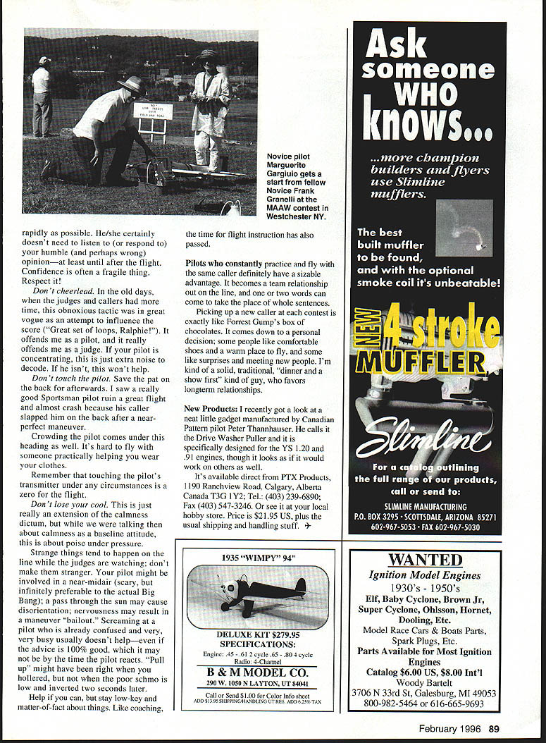RADIO CONTROL AEROBATICS U IY W1 IN THE COURSE writing publication another Ive regurgitated 99% everything ever learned about Pattern Ive covered building designing flying practicing trimming judging engines props visibility radio installation coaching plus numerous subsets sub-subsets topics Ive just about run out new stuff However aspect competitive RC Aerobatics Ive never covered chagrin recently reminded really embarrassing thing isnt minor easily overlooked item its major spoke wheel Its something us other something depend something practice something contests can win lose contests us yet treat afterthought almost never talk about Its calling little doubt good caller can aid pilot no doubt bad caller can literally trash So casual about last thing could think write about did need reminded dont other writers cover subject often Good questions really dont have answers Guessing Id say good caller something pilot wants something pilot feels its important obviously very shortsighted attitude because case what goes around definitely comes aroundoften very next round Part personal reason overlooking subject might simple unconscious avoidance difficult subject because Im renowned crown prince callers really have concentrate decent job am fortunate wife Joan world-class caller well being better-than-decent Pattern pilot own right admit some bias matter much opinion confirmed number requests besieged contest attend What makes good isnt difficult analyze maneuver call comes calmly distinctly exact moment need complete contains no extraneous information requiring thought response never ever well almost never makes mistake has bad tendencies have sit such calling late because caught up watching maneuver coaching getting excited because pilot has either very good very bad round going good bad habits plus few observations Ive made over years have derived some general principles Calmness good pilot excited enough person already vibrating like tuning fork doesnt need extra whack tines caller should anchor flapping sail Timing very important perfect time call next maneuver will vary pilot pilot will usually fall last 1/3 previous maneuver pace todays turnaround style waiting until exit late late late proper time discuss pilot before flight realize removes certain element spontaneity life actually prefer practice pilot several times before tee up front judges right data important favor Joe Friday approach just facts maam call should short concise unambiguous might have time Figure M 3/4 rolls up down will have time Figure M h rolls Dont leave out essential information such inverted exit full roll up pilot may have flown sequence 500 times practice will still perfectly capable forgetting minor details under pressure Concentration task hand important Ideally caller concentrates hard pilot judge Call maneuver fix next maneuver firmly mind Check again call Watching airplane fly has purpose allow properly time next call list don ts longer just important isnt attempt funny Ive seen everything list have done once different people yes bad habit have list Dont coach time coaching long past Imagine being batters box facing Randy Johnsons best high heat game line Now imagine batting coach standing right behind telling square up shoulders spread stance stay back ball etc Some pilots especially inexperienced ones may want little help out they should ask ask keep minimum never never coach pilot hasnt asked huge concentration-breaker Dont criticize know youve screwed up pilots After bad maneuver pilot needs forget get back track 88 Model Aviation e Washer Puller PTX Products handy littleChuck Smith calls Dennis Bastian 95 Nats have gadget VS 91 120 enginesworked together shows Chucks thumb marks next maneuver rapidly possible He/she certainly doesnt need listen respond humble perhaps wrong opinionat least until after flight Confidence often fragile thing Respect Dont cheerlead old days judges callers time obnoxious tactic great vogue attempt influence score Great set loops Ralphie offends pilot really offends judge pilot concentrating just extra noise decode isnt wont help Dont touch pilot Save pat back afterwards saw really good Sportsman pilot ruin great flight almost crash because caller slapped him back after nearperfect maneuver Crowding pilot comes under heading well Its hard fly someone practically helping wear clothes Remember touching pilots transmitter under circumstances zero flight Dont lose cool just really extension calmness dictum talking about calmness baseline attitude about poise under pressure Strange things tend happen line judges watching dont make stranger pilot might involved near-midair scary infinitely preferable actual Big Bang pass through sun may cause disorientation nervousness may result maneuver bailout Screaming pilot already confused very very busy usually doesnt helpeven advice 100% good may time pilot reacts Pull up might have right hollered poor schmo low inverted two seconds later Help can stay low-key matter-of-fact about things Like coaching Novice pilot Marguerite Gargiulo gets start fellow Novice Frank Granelli MAAW contest Westchester NY time flight instruction has also passed Pilots constantly practice fly same caller definitely have sizable advantage becomes team relationship out line two words can come take place whole sentences Picking up new caller contest exactly like Forrest Gumps box chocolates comes down personal decision some people like comfortable shoes warm place fly some like surprises meeting new people Im kind solid traditional dinner show first kind guy favors longterm relationships New Products recently got look neat little gadget manufactured Canadian Pattern pilot Peter Thannhauser calls Drive Washer Puller specifically designed YS 120 91 engines though looks would work others well Its available direct PTX Products 1190 Ranchview Road Calgary Alberta Canada T3G 1Y2 Tel 403 239-6890 Fax 403 547-3246 see local hobby store Price $2195 US plus usual shipping h