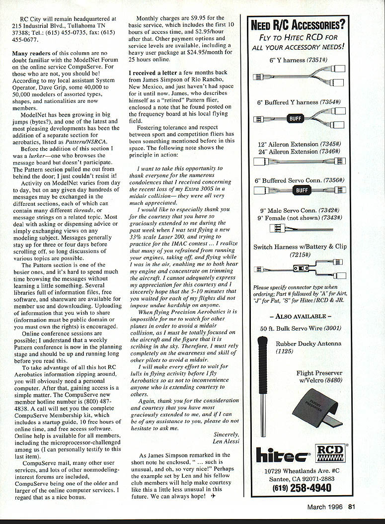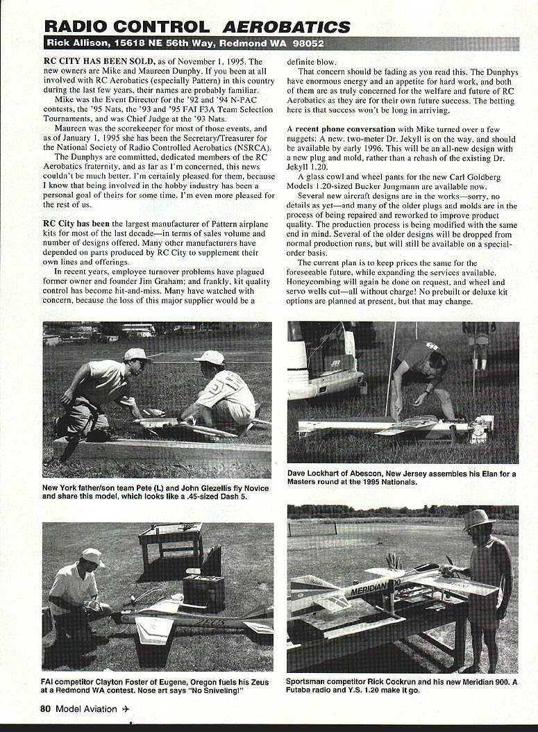 RADIO CONTROL AEROBATICS RC CITY HAS BEEN SOLD November 1 1995 new owners Mike Maureen Dunphy involved RC Aerobatics especially Pattern country during last few years names probably familiar Mike Event Director 92 94 N-PAC contests 95 Nats 93 95 FAI F3A Team Selection Tournaments Chief Judge 93 Nats Maureen scorekeeper events January 1 1995 has Secretary/Treasurer National Society Radio Controlled Aerobatics NSRCA Dunphys committed dedicated members RC Aerobatics fraternity far Im concerned news couldnt much better Im certainly pleased because know being involved hobby industry has personal goal some time Im pleased rest us RC City has largest manufacturer Pattern airplane kits last decadein terms sales volume number designs offered other manufacturers have depended parts produced RC City supplement own lines offerings recent years employee turnover problems have plagued former owner founder Jim Graham frankly kit quality control has become hit-and-miss have watched concern because loss major supplier would definite blow concern should fading read Dunphys have enormous energy appetite hard work both truly concerned welfare future RC Aerobatics own future success betting success wont long arriving recent phone conversation Mike turned over few nuggets new two-meter Dr Jekyll way should available early 1996 will all-new design new plug mold rather rehash existing Dr Jekyll 120 glass cowl wheel pants new Carl Goldberg Models 120-sized Bucker Jungmann available now Several new aircraft designs workssorry no details yetand older plugs molds process being repaired reworked improve product quality production process being modified same end mind Several older designs will dropped normal production runs will still available specialorder basis current plan keep prices same foreseeable future expanding services available Honeycombing will again done request wheel servo wells cutall charge No prebuilt deluxe kit options planned present may change 80 Model Aviation York father/son team Pete L John Glezellis fly Novice share model looks like 45-sized Dash 5 Dave Lockhart Abescon New Jersey assembles Elan Masters round 1995 Nationals FAI competitor Clayton Foster Eugene Oregon fuels Zeus Redmond WA contest Nose art says No Sniveling Sportsman competitor Rick Cockrun new Meridian 900 Futaba radio YS 120 make go RC City will remain headquartered 215 Industrial Blvd Tullahoma TN 37388 Tel 615 455-0735 fax 615 455-0677 readers column no doubt familiar ModelNet Forum online service CompuServe should According local assistant System Operator Dave Grip some 40000 50000 modelers assorted types shapes nationalities now members ModelNet has growing big jumps bytes latest pleasing developments has addition separate section aerobatics listed Pattern/NSRCA Before addition section lurkerone browses message board doesnt participate Pattern section pulled out behind door Ijust couldnt resist Activity ModelNet varies day day given day hundreds messages may exchanged different sections can contain different threads message strings related topic Most deal asking dispensing advice simply exchanging views modeling subject Messages generally stay up three four days before scrolling off long discussions various topics possible Pattern section busier ones its hard spend much time browsing messages learning little something Several libraries full information files free software shareware available member use downloading Uploading information wish share information must public domain must own rights encouraged Online conference sessions possible understand weekly Pattern conference now planning stage should up running long before read take advantage hot RC Aerobatics information zipping around will obviously need personal computer After gaining access simple matter CompuServe new member hotline number 800 4874838 call will net complete CompuServe Membership kit includes startup guide 10 free hours online time free access software Online help available members including microprocessor-challenged among us can personally testify last item CompuServe mail other user services lots other nonmodeling interest forums included CompuServe being older larger online computer services regard nice bonus Monthly charges $995 basic service includes first 10 hours access time $295/hour after Other payment options service levels available including heavy user package $2495/month 25 hours online received letter few months back James Simpson Rio Rancho New Mexico just havent space until now James describes himself retired Pattern flier enclosed note found posted frequency board local flying field Fostering tolerance respect between sport competition fliers has something mentioned before space following note shows principle action want take opportunity thank everyone numerous condolences received concerning recent loss Extra 300S midair collision very much appreciated would like especially thank courtesy have graciously extended during past week 1 test flying new 33% scale Laser 200 trying practice IMAC contest . realize refrained running engines taking off flying air enabling both hear engine concentrate trimming aircraft cannot adequately express appreciation courtesy sincerely hope 5-10 minutes waited flights did impose undue hardship anyone flying Precision Aerobatics impossible watch other planes order avoid midair collision must totally focused aircraft figure scribing sky Therefore must rely completely awareness skill other pilots avoid midair will make effort wait lulls flying activity before Ifly Aerobatics inconvenience anyone extending courtesy others Again thank consideration courtesy have graciously extended can assistance please hesitate ask Sincerely Len Alessi As James Simpson remarked short note enclosed ch unusual oh very nice Perhaps example set Len fellow club members will help make courtesy like little less unusual future can always hope RIC AccEssoRiEs FLY TO HITEC RCD FOR ALL YOUR ACCESSORY NEEDS 6 Y harness 7351# 6 Buffered Y
