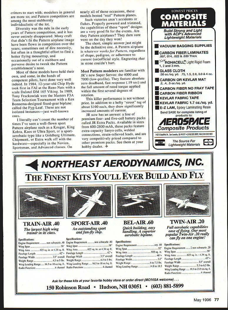 RADIO CONTROL AEROBATICS U 4 rJ111 LISI WHAT IS PATTERN AIRPLANE simple question way answer defines event ourselves might join us simple answer Pattern airplane airplane competitor chooses fly Pattern-style aerobatic competition seems beg question Somewhere must definitive descriptionmaybe old stone tablet AMA Headquarters gathering dust museum crate AMA Competition Regulations arent much help rules event provide weight limits restrictions size rulean ancient safety prohibition against knife-edge wingsdefines shape Still show photo Finesse Dr Jekyll Python three current designs competitors would agree have very different shapes average Sunday flier will instantly identified Pattern models Ask further will likely told Pattern models look alike may look alike Joe Sunday sport flier Like commercial jetliners craft have come have certain family resemblance people Pattern model composed various identifiable elements such wing leading-edge sweep little no dihedral symmetrical airfoil forward canopy tapered planform long tail moment retracts fully cowled engine usually mounted inverted Any airplane features apt called Pattern airplane old Joe Sundaywhether model aerobatically capable much sameness necessary much simply say Pattern airplane world elements arrived scene purpose specific response designer rules day Over years modification another theyve copied design design Some features still aerodynamically useful others seem hang like fiberglass vermiform appendix Conformity can powerful force little can unify group provide feeling fraternity too much can stifle new thought development curb free expression Over last three decades weve sort agreed common ideal what Pattern airplane should look like golly healthy What doing event have major shakeup rules year purpose granting designers builders freedom experiment might time get visual check true condition Emperors flying clothes What actually need Pattern airplane todays rules answer depends set rules specifically means classNovice Sportsman Advanced Masters FAI airframe capability needed increases step up ladder following lists arent definitive just personal opinion Novice-class competitors need airplane predominantly neutrally stable pitch roll grooves well level upright flight capable fair axial roll tracks well through series loops has adequate power perform stall-turns reasonably well much yaw/roll couple Sportsman fliers need plus aircraft tracks well inverted capable multiple axial rolls has enough additional power perform square loop level flight Advanced competitors need airplane has good neutral stability pitch roll both upright inverted has little no pitch roll yaw couple capable extended knife-edge flight snaps spins well upright flight has enough additional power draw extended vertical up line rolling No pitching should evident either up down vertical lines regardless airspeed power on/off condition aircraft should track well hands off vertical flight mode system maintains adequate fuel draw May1996 75 JR Extra Pack features high-capacity Sanyo cells welded connections 1100 mAh five-cell pack shown NSRCA District 2 VP Bob Richards OS 120-powered Great Planes Cap 21 Bob won 12 first-place trophies model Eric Hawkinson entered YS-powered ModelTech Dragon Lady Masters two contests winning both Pilot Elmo 62 1/2 WING SPAN 40 TO 652 STROKE 60 TO 904 STROKE TRICYCLE X SYMMETRICAL WINGplus 5540 MACHINE CUT S&H TAILDRAGGER ENDANGERED SPE beautiful birds no longer being toad. have very Unjited supply Don delay once gone gone forever 96 DIG BEE$12995 plus S&H XLT ESCAPE$8995 plus S&H VAGABOND 40$5995 plus S&H Krafty 60 $4995 plus S&H Loadstar 40$4495 plus S&H TRAINER 40 $3995 plus S&H Bridi 60 Floats$1988 plus S&H TERCEL SO Hand Launch 2 Channel Gliders 1 8 2 4$1495 ea S&H 5to9$1395ea.S&H 10 $1295 * S&H G&S HolMes 967 Hancock Bullhead City Az 96442 800-628-6065 or 520-758-1100 76 Model Aviation * flight attitudes necessary Masters FAI need list longer addition everything needed Advanced airplane must have excellent neutral stability have zero coupling control axes snap spin well both directions both upright inverted have enough excess power maintain maneuvering speed solid control response end extended vertical line aircraft must configured meet sound level requirements Nowhere list items like fully cowled inverted engines soft mounts long tail moments tapered planforms retracts forward canopy placement wing leading-edge sweep appear Also unlisted fiberglass fuselages aluminum spinners plug-in wings swept vertical fins boatload other little doodads found average Pattern flightline dont mean imply some items arent terrifically useful valid design features others dont look neatjust presence isnt mandated engraved stone AMA HQ elsewhere listed rules protected act Congress aviations enduring truths ways skin proverbial feline recall talking TOC competitor related big Scale Extra 3005 flew almost exactly like F3A airplane damped better since bigger struck note wonder voice reflection believe surprised because like us hed unconsciously bought idea proper looking Pattern airplane its familiar features could fly aerobatic pattern well dont advocate tossing out familiar just sake change having everybody build semiscale models going back shoulder-wing designs rubber-band wing holddowns kind like way current crop designs looks food thought merely something else might work well better should give shot isnt much hardware change need some different software fresh attitude flightline judging chair anything goes limit quality shape drawn sky Call creating climate frog feels free jump nothing else might hard History says little room foot door will enough Humans independent Now can order Mustang 50 equipped CHARGING SYSTEM Unhimhd Possibilities Charge receiver batteries fly Charge extra set transmitter batteries board get set full day flying wfth no delays r Operate custom lighting systems electrical options such electrical smoke pumps etc Unequalled Advantages