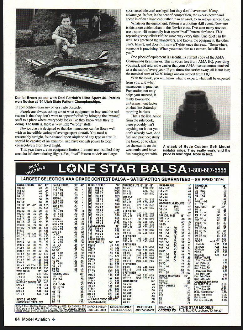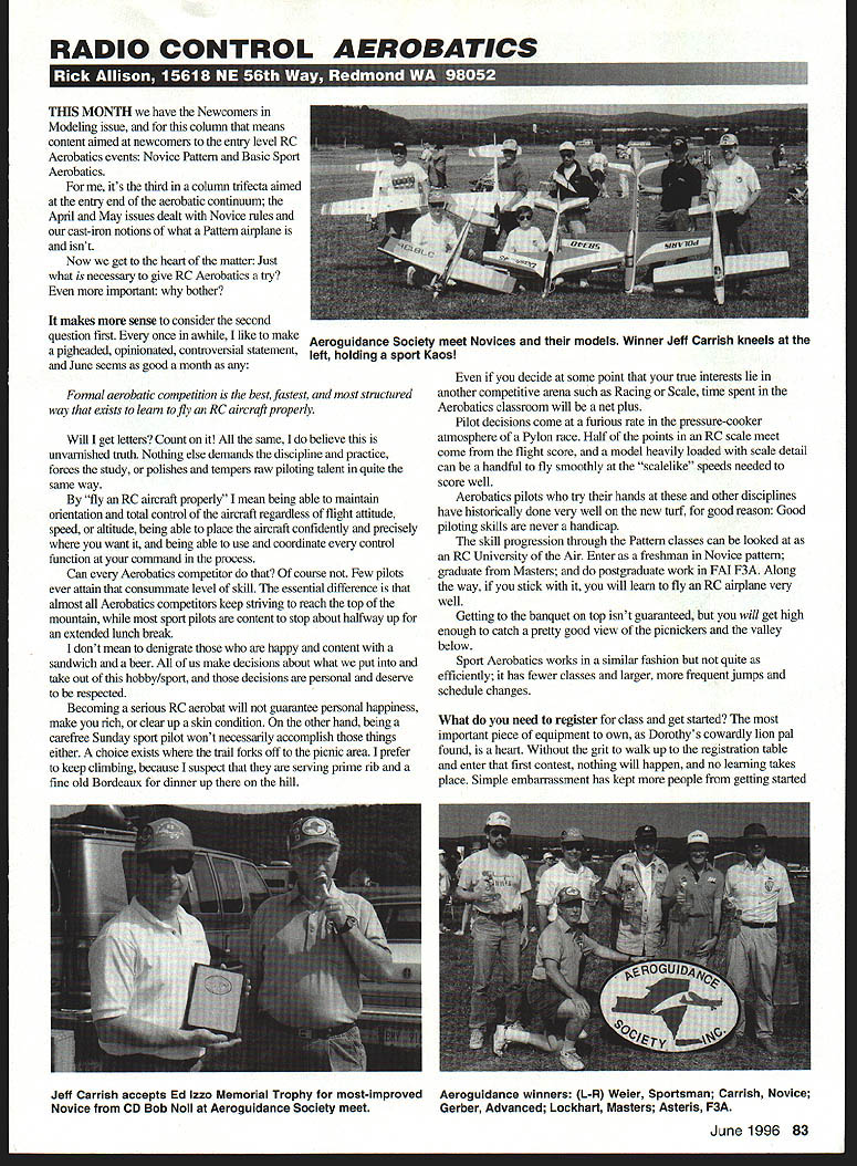 RADIO CONTROL AEROBATICS THIS MONTH have Newcomers Modeling issue column means content aimed newcomers entry level RC Aerobatics events Novice Pattern Basic Sport Aerobatics its third column trifecta aimed entry end aerobatic continuum April May issues dealt Novice rules cast-iron notions what Pattern airplane isnt Now get heart matter Just what necessary give RC Aerobatics try important bother makes sense consider second question first once awhile like make pigheaded opinionated controversial statement June seems good month Formal aerohatic competition best fastest structured way exists learn tofly RC aircraft properly Will get letters Count same believe unvarnished truth Nothing else demands discipline practice forces study polishes tempers raw piloting talent quite same way fly RC aircraft properly mean being able maintain orientation total control aircraft regardless flight attitude speed altitude being able place aircraft confidently precisely want being able use coordinate control function command process Can Aerobatics competitor course Few pilots ever attain consummate level skill essential difference almost Aerobatics competitors keep striving reach top mountain sport pilots content stop about halfway up extended lunch break dont mean denigrate happy content sandwich beer us make decisions about what put take out hobby/sport decisions personal deserve respected Becoming serious RC aerobat will guarantee personal happiness make rich clear up skin condition other hand being carefree Sunday sport pilot wont necessarily accomplish things either choice exists trail forks off picnic area prefer keep climbing because suspect serving prime rib fine old Bordeaux dinner up hill decide some point true interests lie another competitive arena such Racing Scale time spent Aerobatics classroom will net plus Pilot decisions come furious rate pressure-cooker atmosphere Pylon race Half points RC scale meet come flight score model heavily loaded scale detail can handful fly smoothiy scalelike speeds needed score well Aerobatics pilots try hands other disciplines have historically done very well new turf good reason Good piloting skills never handicap skill progression through Pattern classes can looked RC University Air Enter freshman Novice pattern graduate Masters postgraduate work FM F3A Along way stick will learn fly RC airplane very well Getting banquet top isnt guaranteed will get high enough catch pretty good view picnickers valley below Sport Aerobatics works similar fashion quite efficiently has fewer classes larger frequent jumps schedule changes What need register class get started important piece equipment own Dorothys cowardly lion pal found heart Without grit walk up registration table enter first contest nothing will happen no learning takes place Simple embarrassment has kept people getting started June1996 83 Aeroguidance Society meet Novices models Winner Jeff Carrish kneels left holding sport Kaosl Jeff Carrish accepts Ed Izzo Memorial Trophy most-improved Aeroguidance winners L-R Weier Sportsman Carrish Novice Novice CD Bob Nell Aeroguidance Society meet Gerber Advanced Lockhart Masters Asteris F3A OZCC CC CC OtoCC CC 0CC - CCCCCC C ~CCCC0J bo&cbC-CCz OCrCCCC CCOOOCr0CCCOOCC CCft CCC OCr Cr Cr CC000 Cr0 I-9C~0tCC..o o9~CCCCCCCC CrCrCrbLCCC04 o CCCCCCCr COCCOCC.4CC CCCOCCCCCCOCCCC 000cC~ CC CCCCCCCCCCCCCtototO0CCCCCCCCr Pp0ooPCooo o 00 0o 00 CC i3o C 0 rnCC to--C--C.-- NCCCCOCC 00 JO 0 CC O ~0CrsCCCC0CCrCr CCCCOCtoCC CCCOCCa OO-CrCCCC CC Cr 0CC 000 C0O CC OCCOCsCC 0CC CCOOC00000000000000000 .CC0a 0CCCCCCCCC CrCC00.0 00CC000CCCC CCCCCCCO CCCC 00 o---- oca to- CCnCCCCC4. OCCO0J OSC4 J J CC J COlD 0000CCCCC C CCCCCCOOIOOCCCCO to--.---.JCCCCC -CCCClD0fl-4-4erncc 000~-CC0OC.J-CCC00CC00rCCCCC totoUCCCCCCCC0~C C C C C C CICC 00000000CCCCC -c CCCCCCCC0C- CC 0 0-CCC CCCCCCCCC aEto0 WO toCCW-CCCO -CC-CC-CCCO NCFCC _to ~ 0 - CC CCCC CCCC ZZ moototoC3toC to.C Cr0CCC0toCCCCCO.COOCCOCCCCCCC 00Cr0000Cr0CrCrCCOCCOCrOOCCOto Cr0Cr0CCtoCrtoCrto0.CCC-CCO-COCCrtoCCCto bCirCrCCCCCCr0CCCCCOO-COCOCOCCCto 00OCr000000Cr0-CrOCrOCrOCOCrCrCC -CCrOCrJOCOCrCCC00CCCCCCCCCCOsCCC040 O toCCC0CCCCCCJC0CCCCCCCCCCCOOCCCCCrCOCrCrC0 ~CCCrCrOCrCr000Cr0CrCr0CrCrCrCrCr0Cr00Cr 00CC 000CCCCCO CC0CCCCC OCtoCCCCCCCCCCCC ZCCOCCCC oOoooooooPoo~ CCC SC CCCR32 o 4CSCC i3 -. CC CC~ F ZCC._0CC CCVERSLZESAVAILABLECC CCtoO .JC CC C-C-bIC CC Oto CrOOCCOCrCr0 CCftOto ~C0CCC JCr0toOCCCCOCC... . C -CJ 00CCWCrCCtCCC~ CICCOCCCCCCC@ ~002C00CSCCSr NN o "0CCCCCCCC CCCr c 00 00000000 O 000000 Z 0 01 CC0 CC00 CC OGV 5~00O C C Cr Cr Cr CrOOCCrCzia 0 - CC -C-CCC00-4C CC0CCCCC CCCCCCOCCCr0-C CCCCCCCCCC0 CO COO CrCrCrCr 8~000 Cr OCCCOCCCC Jtoto0 C Cr 0 C ii -I m m 0 -4 0 z C 0 m 0 0 z -I m -I w Ia a -n 0 -I 0 z C C z -4 m m 0 5 -U m 0 0 0 n CCr 00 C Cb0C c 0~C~0 0 sg Oo 00 z52 0 C -0 0 U 00 Us -U U 0 CC0000 ~OO Cr -t 0 ~ C/C 0 CC 0j-- Cb mC0b ioo o 0 COO O IO ~Cb 0 gO b 0co C ~CC2rr -0 -~C bjCbo. 0 0CC0CZLOZrb0 0C or~ -~~o CCr CC 0 Co 00 0 CSC OCCC 0q CCC O11 40 Rs C oz cm CDl CO 00 9m 04~ no jiZ WI 0 JZ 01 C cj p CDZ wm 0 00 -gr U -4 CD CC C other students might find have lot common thing can expect first contest welcomed made comfortable Anyone doesnt try brought wrong stuff meet meet does exceptional job making newcomers feel welcome Aeroguidance Society Annual Pattern Contest held Sayre Pennsylvania largest largest club contests held year Attendance consistently tops 60-competitor mark June 1995 68 contestants made official flights 40th annual meet making oldest Pattern contests country Sixty-eight contestants means theyre doing something right Actually long list rights Aeroguidance Society Inc boasts mere 70 members two Pattern fliers Forty-five helped last years meetan incredible 65% roster judging school held year contest starts promptly run efficiently commendable obviously successful impressive thing progressive attitude shown care feeding Novice pilots Last year seven Novices teamed experienced FAI Masters competitor assisted advice coac