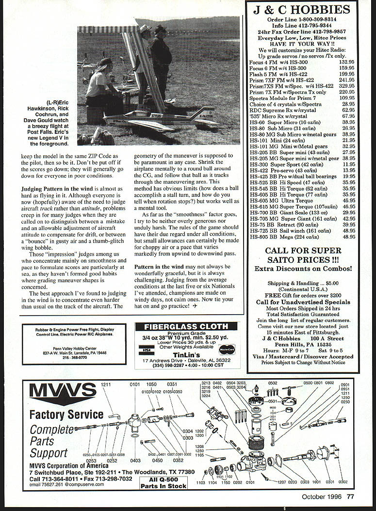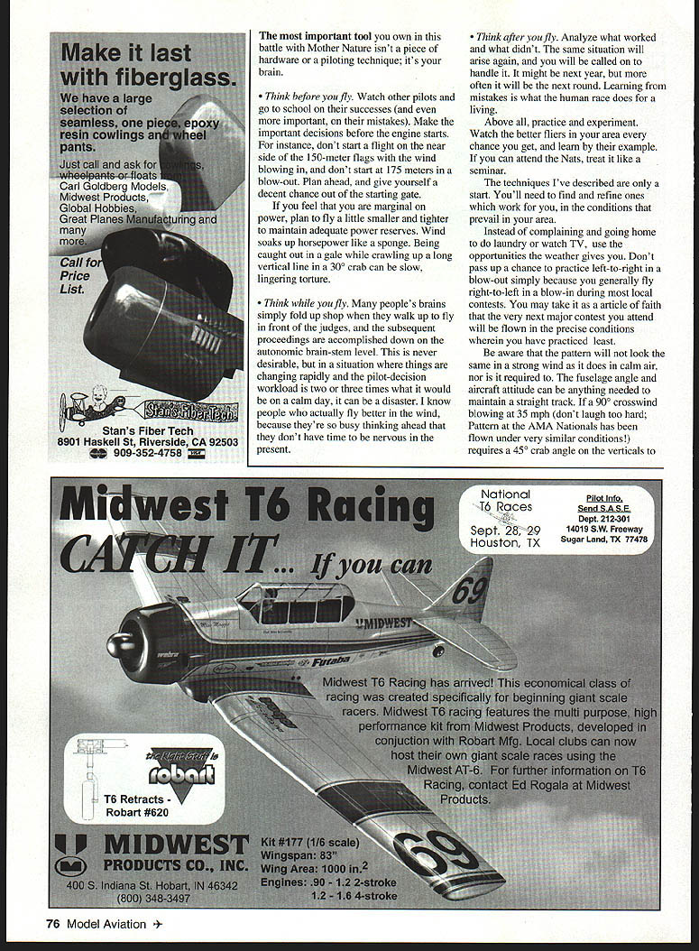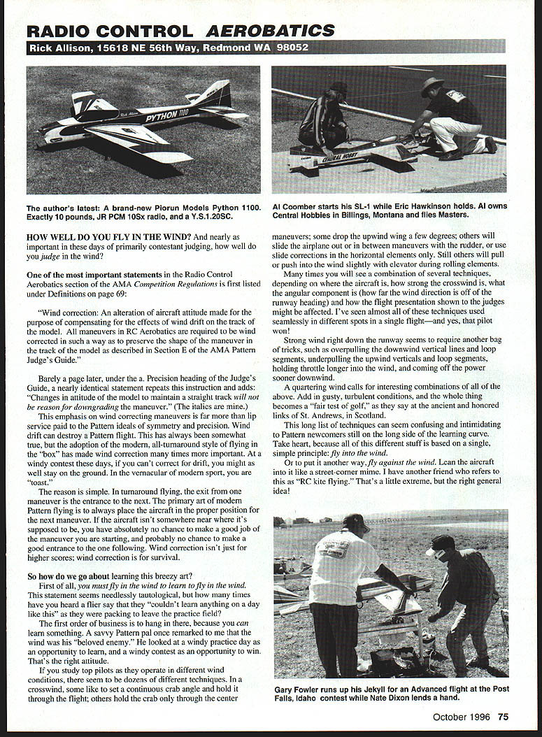 RADIO CONTROL AEROBATICS HOW WELL DO YOU FLY IN THE WIND nearly important days primarily contestant judging well judge wind important statements Radio Control Aerobatics section AIVIA Competition Regulations first listed under Definitions page 69 Wind correction An alteration aircraft attitude made purpose compensating effects wind drift track model maneuvers RC Aerobatics required wind corrected such way preserve shape maneuver track model described Section B AMA Pattern Judges Guide Barely page later under Precision heading Judges Guide nearly identical statement repeats instruction adds Changes attitude model maintain straight track will reason downgrading maneuver italics emphasis wind correcting maneuvers far lip service paid Pattern ideals symmetry precision Wind drift can destroy Pattern flight has always somewhat true adoption modern all-turnaround style flying box has made wind correction times important windy contest days cant correct drift might well stay ground vernacular modern sport 'toast~ reason simple turnaround flying exit maneuver entrance next primary art modern Pattern flying always place aircraft proper position next maneuver aircraft isnt somewhere near its supposed have absolutely no chance make good job maneuver starting probably no chance make good entrance following Wind correction isnt just higher scores wind correction survival So go abont learning breezy art First must fly wind learn fly wind statement seems needlessly tautological times have heard flier say couldnt learn anything day like packing leave practice field first order business hang because can learn something savvy Pattern pal once remarked wind beloved enemy looked windy practice day opportunity learn windy contest opportunity win Thats right attitude study top pilots operate different wind conditions seem dozens different techniques crosswind some like set continuous crab angle hold through flight others hold crab through center maneuvers some drop upwind wing few degrees others will slide airplane out between maneuvers rudder use slide corrections horizontal elements Still others will pull push wind slightly elevator during rolling elements times will see combination several techniques depending aircraft strong crosswind what angular component far wind direction off runway heading flight presentation shown judges might affected Ive seen almost techniques used seamlessly different spots single flightand yes pilot won Strong wind right down runway seems require another bag tricks such overpulling downwind vertical lines loop segments underpulling upwind verticals loop segments holding throttle longer wind coming off power sooner downwind quartering wind calls interesting combinations of above Add gusty turbulent conditions whole thing becomes fair test golf say ancient honored links St Andrews Scotland long list techniques can seem confusing intimidating Pattern newcomers still long side learning curve Take heart because different stuff based single simple principlefly wind put another wayfly against wind Lean aircraft like street-corner mime have another friend refers RC kite flying Thats little extreme right general idea October 1996 75 authors latest brand-new Piorun Models Python 1100 Al Coomber starts SL-1 Eric Hawkinson holds Al owns Exactly 10 pounds JR PCM lOSx radio YS12OSC Central Hobbies Billings Montana flies Masters Gary Fowler runs up Jekyll Advanced flight Post Falls Idaho contest Nate Dixon lends hand important tool own battle Mother Nature isnt piece hardware piloting technique its brain Think before fly Watch other pilots go school successes important mistakes Make important decisions before engine starts instance dont start flight near side 150-meter flags wind blowing dont start 175 meters blow-out Plan ahead give yourself decent chance out starting gate feel marginal power plan fly little smaller tighter maintain adequate power reserves Wind soaks up horsepower like sponge Being caught out gale crawling up long vertical line 300 crab can slow lingering torture Think fly peoples brains simply fold up shop walk up fly front judges subsequent proceedings accomplished down autonomic brain-stem level never desirable situation things changing rapidly pilot-decision workload two three times what would calm day can disaster know people actually fly better wind because theyre busy thinking ahead dont have time nervous present Think after fly Analyze what worked what didnt same situation will arise again will called handle might next year often will next round Learning mistakes what human race does living Above practice experiment Watch better fliers area chance get learn example can attend Nats treat like seminar techniques Ive described start Youll need find refine ones work conditions prevail area Instead complaining going home laundry watch TV use opportunities weather gives Dont pass up chance practice left-to-right blow-out simply because generally fly right-to-left blow-in during local contests may take article faith very next major contest attend will flown precise conditions wherein have practiced least aware pattern will look same strong wind does calm air nor required fuselage angle aircraft attitude can anything needed maintain straight track 900 crosswind blowing 35 mph dont laugh too hard Pattern AMA Nationals has flown under very similar conditions requires 450 crab angle verticals 76 Model Aviation ric Hawkinson Rick Cochrun Dave Gould watch breezy flight Post Falls Erics new Legend V foreground keep model same ZIP Code pilot Dont put off scores go down will generally go down everyone poor conditions Judging Pattern wind almost hard flying Although everyone now hopefully aware need judge aircraft track rather attitude problems creep judges called distinguish between mistake allowable adjustment aircraft attitude compensate drift between bounce gusty air thumb-glitch wing bobble impression judges among us concentrate mainly smoothness pace formulate scores particularly 