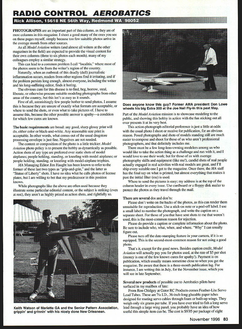RADIO CONTROL AEROBATICS PHOTOGRAPHS important part column columns magazine shoot good ones see pages myself simply because too few suitable photos arrive average month other sources As Model Aviation writers almost writers other magazines field expected provide visual content own columns three six photos month colleagues employ similar strategy can lead common problem call localitis photos seem writers region country Naturally outbreak deadly dull journalistic inilanmiation occurs readers other regions find irritating problem persists long enough almost everyone including writer long-suffering editor finds boring obvious cure disease find beg borrow steal liberate otherwise procure suitable modeling photographs other areas country isnt easy sounds First astonishingly few people bother send photos assume because unsure exactly what formats acceptable send shots what take pictures have assume because other possible answer apathya condition few cures known basic requirements broad good sharp glossy print will either color black-and-white Any reasonable size print acceptable other words what comes out usual drugstore processing envelope just fine Negatives needed content composition photo little trickier Model Aviation photo policy present hobby dynamically possible Action shots type preferred over static shots model airplanes people holding standing kneeling model airplanes people holding standing kneeling model-airplane trophies MA Managing Editor Jim Haught has known refer former last two types grip-and-grin latter Statue Liberty shots have no idea what calls photos license plates am willing bet predecessor position knows photographs like above often used because illustrate some particular editorial content subject striking rest arent highly prized action shots rightfully Part Model Aviation mission showcase modeling public showing hobby action fun sticking out over presents its very best action-photograph editorial preference just little odds usual photo shoot receive publication obvious reason Posed photographs shots models standing still much easier compose shoot us arent professional photographers definitely includes must few long-lens-owning modelers among us would like take action thing challenge run would love use work us average photography skills equipment like candid shots real people actually engaged real activities real models great Ill ship suitable get magazine Once MA staff has final say what printed almost everything makes past initial filter used send pictures easy address top column header issue Use cardboard floppy disk mailer protect photos travel through mail several dos don ts Please dont write backs photos can render unsuitable reproduction Use stick-on note peel-off label use small label number photograph write caption separate sheet have sent shots werent used most-common reason rejection Please provide caption complete information about photo sure include what can usually figure out Please turn off date-stamping feature camera equipped second-most-common reason using good photo Thats except good news Besides caption credit Model Aviation will actually pay photos used rate $5 per shot money few known cures apathy Payment publication usually means sometime close get magazine aware three-month publication lag instance am writing July November issue will see late September Several new products possible use Aerobatics pilots have surfaced mailbox late Ron Chidgey Gator RC Products comes Feather-Lite Servo Lead Tubes 9A6 ID 36-inch-long glueable paper tubes designed routing servo cables through foam built-up wings weigh six grams per tube have ever tried fish long servo lead through large wing panel probably have idea useful simple item can cost $995 per package eight November 1996 83 Does anyone know guy Former AMA president Don Lowe wheels big Extra 300 Joe Nail Fly-In past May Keith Watson Marietta GA Senior Pattern Association grippin grinnin nicely done New Orleanean tubes available direct Gator RC 3713 Pompano Dr Pensacola FL 32514 Tel 904 494-0203 have flying RC Aerobatics length time have no doubt heard Zurich USA R/C Sunglasses wraparound polycarbonate glasses may worn alone over prescription eyeglasses special coatings used block 981% UV-A 100% UV-B light both solid single-gradient tints available variety colors Zurichs also function safety glasses tests have proven polycarbonate base material strong enough stop 22 bullet should make strong enough stop thrown prop spinner new product Zurich USA orange-tinted lens material designed enhance contrast low-light situations such cloudy overcast days near-twilight conditions should just ticket up sometimes cloudy Pacific Northwest pair mail right now price $49 plus $4 shipping handling available direct Newman Optics 5083 Ridgedale Dr Ogden JPX/BVM #1 turbine techno1ogy performance service Heres JPXs new T-260P 3rd generation turbine engine benefits thousands flights 5 years production experience New designs compressor shaft turbine wheel combustor few reasons engine years ahead competition liquid propane fuel reliable safe clean BVM engineers designed complimentary installation package T-260P assures right amount air directed engine also supplies lots air cooling mixing hot exhaust gases thereby producing boost thrust BVM By-Pass System available new T-33 F-80 Bandit kits can also adapted other suitable models Factory trained personnel BVM equipped super precision machinery parts keep JPX T-260P turbine investment running years come makes sense go Team Experience JPX/BVM WMWU 170 SR 419 er Springs FL 32708 USA TEL 407-327-6333 407-327-5020 84 Model Aviation * Introducing EDR- 106 ro Servo 2everser rn ~EDR1O6 Plq Pe Seve Reveise late petit Rs WewI Petite dead U No messy adjustments Microprocessor accurate neutral II No Jitter 3 No Drift Neutral Shifts temperature changes U Fuciproof Jibration proof Encapsulated space-age epa Darren Bowman Vancouver Britsh Columbia tachs Meridian Post Falls Idaho contest Carbonfibera
