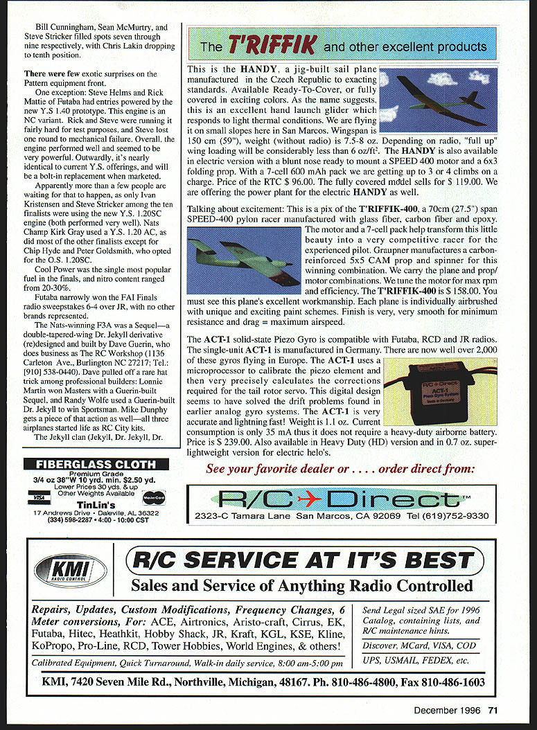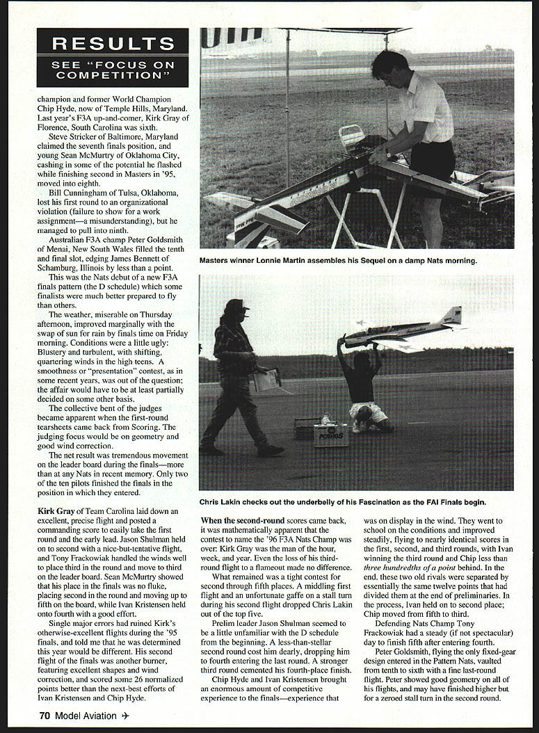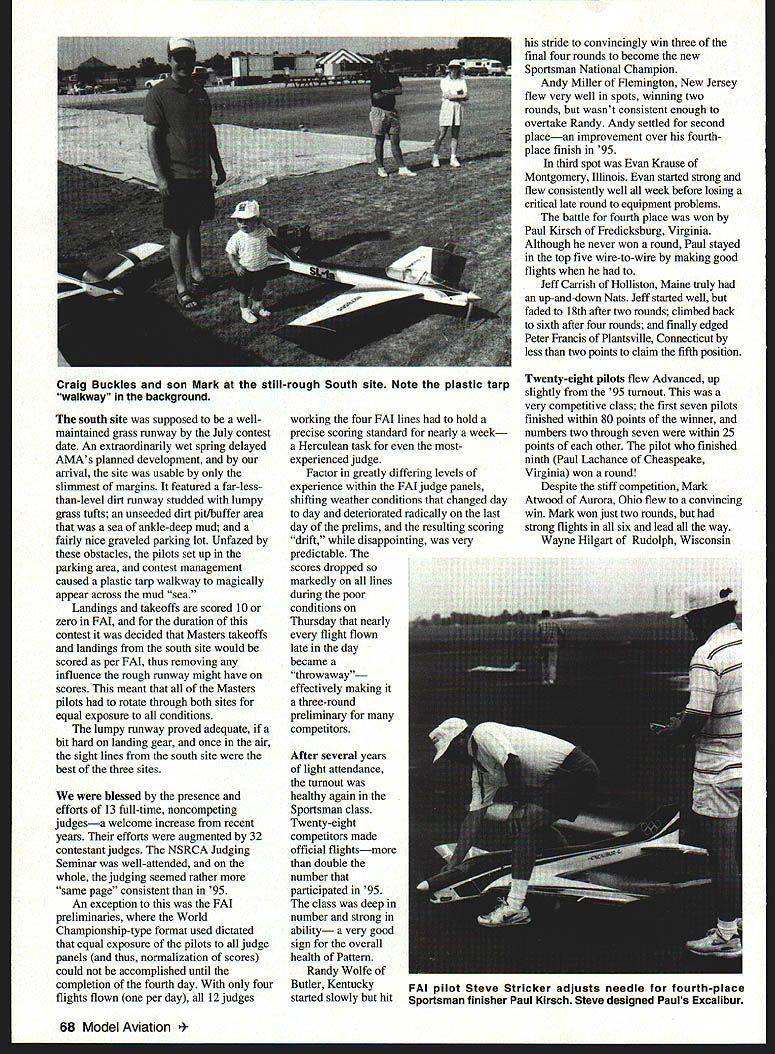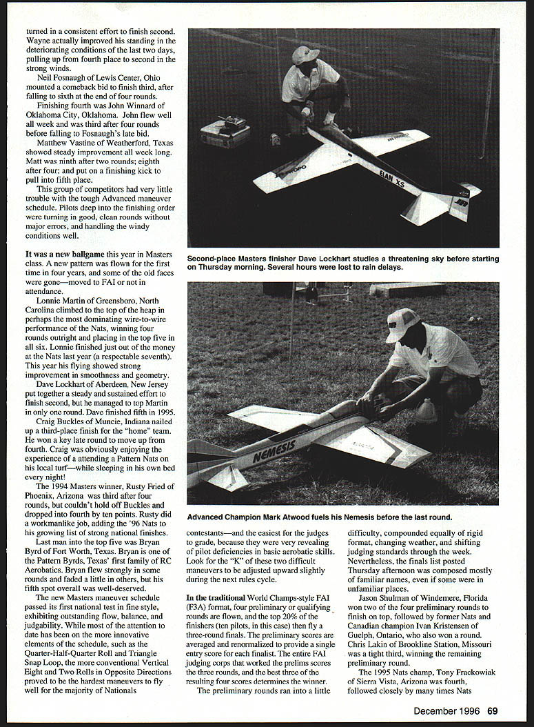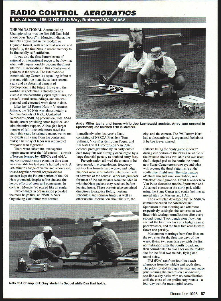 RADIO CONTROL AEROBATICS r4 w, THE 96 NATIONAL Aeromodeling Championships first full Nats held own house Muncie Indiana first Nats organized modern Olympic format sequential venues hopefully first Nats recent memory financially self-sufficient also first Pattern event national international scope flown what will unquestionably become finest site RC Aerobatics countryand perhaps world International Aeromodeling Center squalling infant present true maturity least several years substantial amount development future However world-class potential already clearly visible beautifully open sight lines peaceful rural surroundings wellplanned-and-executed work done date Like 95 Pattern Nats Vincennes Indiana 96 Nats almost totally National Society Radio Controlled Aerobatics NSRCA production AMA Headquarters providing some logistical administrative support Although larger number full-time volunteers eased strain year primary manpower run events still came contestant ranks half-day labor required everyone registered substantial managerial improvements over 95 contesta result lessons learned NSRCA AMA considerably planning time available last years hurried event last-minute change venue confused tossed-together overall organizational concept kept Pattern portion 95 Nats grounded despite fine site heroic efforts crew contestants contrast Muncie 96 soared like eagle Two changes organization provided help first NSRCA Nats Organizing Committee formed immediately after last years Nats consisting NSRCA President Tony Stillman Vice-President John Fuqua 96 Nats Event Director Ron Van Putte Second preregistration early cutoff date May 20 strongly encouraged large financial penalty doubled entry fee Preregistration allowed contest preplanned line breakdowns frequency splits class formats worker judge matrices substantially determined well advance contest Work assignments contestants included Nats packets received before leaving home packets also contained directions practice fields meeting schedules seminar times well other useful information about site city contest 96 Pattern Nats pleasantly solid organized feel about before ever started Pattern being game town during portion Nats whole Muncie site available used L-shaped pad north brandnew Stage Center cross runway what will become third Pattern site south Free flight area sites feature identical sun wind orientation stacked configuration Event Director Ron Van Putte elected run Sportsman Advanced classes north pad using Stage Center south facilities mixed sites Masters FAI event plan developed NSRCA committee called Advanced Sportsman run morning afternoon respectively single-site contests two lines scoring normalization after second round Two rounds flown first two days hedge against poor weather final two rounds flown per day Masters ran mornings four lines two sites first two days week flying two rounds day first normalization after fourth round consolidated two lines middle site final two rounds flying round day FAI F3A ran four lines afternoon middle south sites pilots rotated through sites judge panels during prelims one-round one-line-a-day basis no normalization until close preliminary roundsa four-day wait meaningful scores December 1996 67 Andy Miller tachs tunes Joe Lachowski assists Andy second Sportsman Joe finished 12th Masters Nats F3A Champ Kirk Gray starts Sequel Dan Hart holds south site supposed wellmaintained grass runway July contest date An extraordinarily wet spring delayed AMAs planned development arrival site usable slimmest margins featured far-lessthan-level dirt runway studded lumpy grass tufts unseeded dirt pitlbuffer area sea ankle-deep mud fairly nice graveled parking lot Unfazed obstacles pilots set up parking area contest management caused plastic tarp walkway magically appear across mud sea Landings takeoffs scored 10 zero FAI duration contest decided Masters takeoffs landings south site would scored per FAI thus removing influence rough runway might have scores meant Masters pilots rotate through both sites equal exposure conditions lumpy runway proved adequate bit hard landing gear once air sight lines south site best three sites blessed presence efforts 13 full-time noncompeting judgesa welcome increase recent years efforts augmented 32 contestant judges NSRCA Judging Seminar well-attended whole judging seemed rather same page consistent 95 An exception FAL preliminaries World Championship-type format used dictated equal exposure pilots judge panels thus normalization scores could accomplished until completion fourth day four flights flown per day 12 judges working four FAI lines hold precise scoring standard nearly week Herculean task mostexperienced judge Factor greatly differing levels experience within FAI judge panels shifting weather conditions changed day day deteriorated radically last day prelims resulting scoring drift disappointing very predictable scores dropped markedly lines during poor conditions Thursday nearly flight flown late day became throwaway effectively making three-round preliminary competitors After several years light attendance turnout healthy again Sportsman class Twenty-eight competitors made official flightsmore double number participated 95 class deep number strong ability very good sign overall health Pattern Randy Wolfe Butler Kentucky started slowly hit stride convincingly win three final four rounds become new Sportsman National Champion Andy Miller Flemington New Jersey flew very well spots winning two rounds wasnt consistent enough overtake Randy Andy settled second placean improvement over fourthplace finish 95 third spot Evan Krause Montgomery illinois Evan started strong flew consistently well week before losing critical late round equipment problems battle fourth place won Paul Kirsch Fredicksburg Virginia Although never won round Paul stayed top five wire-to-wire making good flights Jeff Carrish Holliston Maine truly up-and-down Nats Jeff started well faded 18th after two round