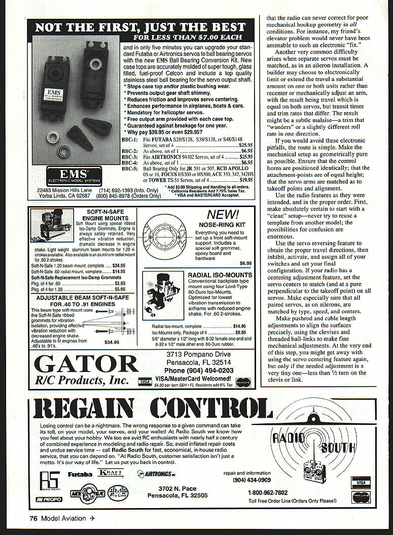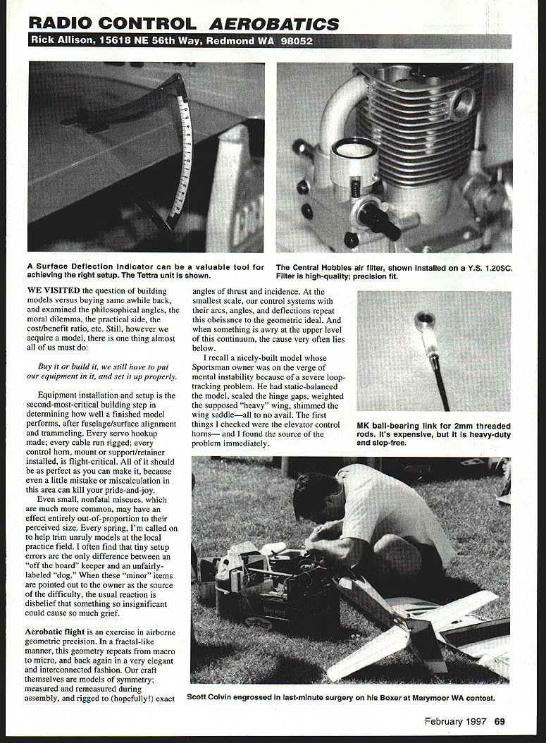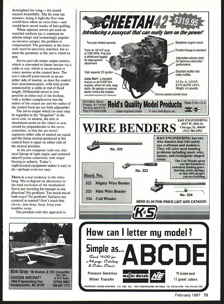 RADIO CONTROL AEROBATICS WE VISITED question building models versus buying same awhile back examined philosophical angles moral dilemma practical side cost/benefit ratio etc Still however acquire model thing almost us must Buy build still have put equipment set up properly Equipment installation setup second-most-critical building step determining well finished model performs after fuselage/surface alignment trammeling servo hookup made cable run rigged control horn mount support/retainer installed flight-critical should perfect can make because little mistake miscalculation area can kill pride-and-joy small nonfatal miscues much common may have effect entirely out-of-proportion perceived size spring Im called help trim unruly models local practice field often find tiny setup errors difference between off board keeper unfairlylabeled dog minor items pointed out owner source difficulty usual reaction disbelief something insignificant could cause much grief Aerobatic flight exercise airborne geometric precision fractal-like manner geometry repeats macro micro back again very elegant interconnected fashion craft themselves models symmetry measured remeasured during assembly rigged hopefully exact angles thrust incidence smallest scale control systems arcs angles deflections repeat obeisance geometric ideal something awry upper level continuum cause very often lies below recall nicely-built model Sportsman owner verge mental instability because severe looptracking problem static-balanced model sealed hinge gaps weighted supposed heavy wing shimmed wing saddleall no avail first things checked elevator control horns found source problem immediately February 1997 69 Surface Deflection Indicator can valuable tool Central Hobbies air filter shown installed VS 12OSC achieving right setup Tettra unit shown Filter high-quality precision fit MK ball-bearing link 2mm threaded rods Its expensive heavy-duty slop-free Scott Colvin engrossed last-minute surgery Boxer Marymoor WA contest As per standard practice long 4-40 bolts nylon horn-ends mounted dowel hard-points both elevators both elevators trailed perfect alignment neutral positionwhich far pilot checked However airplanes dont loop elevators neutral friend overlooked simple geometry matter horns misaligned clevis attachment-point 1A6 inch front hinge line other equal distance behind addition attachment-point 1/i6 higher other Control horns matching surfaces like elevators ailerons must matched clevis attachment-point height displacement fore aft hingeline Any deviation will cause unequal control-surface travel addition attachment-point hole little nylon horn-end centered directly over hinge line result will differential travel up down vice-versa because linear motion pushrod pull cable converted rotary motion horn horn end travels through arc clevis attachment-point front hinge line pushrod below surface result will up travel down converse being true attachment-points aligned aft hingeline Before advent computer radios myriad adjustment features simple technique common method obtaining adjusting aileron differential friends case elevator half deflecting farther up down other half deflecting farther down up since horn shorter side also deflecting greater amount place elevators properly aligned neutral differences significant amounting 450 full travel Several tweaks pair pliers couple turns low horn-end squared away problem unshimmed wing saddle $7995 51 Symmetrical wing extra light 35 50 engines CHASOS constant cord wing Great low wing trainer Also available 25 size $5995 FREE shipping pIn 500 ipperscom/gns/homehtmplus 500 shipiing G&S Hobbies 967 Hfinoock Bullhead dy Az 86442 520-758-1100 O1 1-800-628-6065 LIQUI9ATIOH SALE PlTY PWUY 95 UTTEK CHAOS. $6996 TKAINEK 40$3995 96 PI# PEE$13995 LOAPSTAK 40 5 KKAFTY 60 995 ESCAPE XLT $5995 KILLEK PEE 10$16995 36 FLOATS$1811 plus shippiiiq CALL FOR CATALOG take CREDIT CARDS 70 Model Aviation OVP 40 deweighted wing model tracked beautifully fix took ten minutes doing right first time would have taken no extra timeand would have saved weeks hair-pulling separate servos used matched surfaces common aileron setups increasingly popular elevator setups problem compounded geometry hornends must precisely matched must geometry servo wheel arm Servos provide rotary output motion converted linear motion via cable rod reconverted rotary motion control horn servo takeoff-point travels arc either side neutral does control horn attachment-point both points connected cable rod fixed length Differential travel now possible either end hookup further complication radius output arc radius control horn arc both adjustable servo output wheel arm may regarded hingeline servo end neutral arm attachment-point wheel arm should perpendicular servo centerline arc travelsegments either side neutral equal linear motion produced control horn equal either side ______________________________ neutral position pre-computer radio era ideal lineup right angles centered takeoff points sometimes took major fussing achieve Todays sophisticated equipment makes easy doperhaps too easy real tendency whizbang 90s depend electronics total exclusion mechanical Servo traveling far enough direction No problem Too much travel both ways No problem Surfaces centered neutral Dont touch clevisjust beep beep beep troubles away problem approach is____________________________ can letter mu model Simple IL a44pci Ca sure Sensitivemajor decals 11 sizes Water Transfer11 great colors NORTHEAST SCREEN GRAPHICS PO BOX 304 EAST LONGMEAOOW MA 01028 TEL 413-025-4110 FAX 413-525-7794 February 1997 75 No 322 No 323 K&S ENGINEERING 6917 W 59th St Chicago IL 60638 WIRE BENDER 586-8503 SEND $100 FOR PRICE LIST AND CATALOG No 324 five minutes can upgrade stan dard Futaba Airtronics servos ball bearing servos new EMS Ball Bearing Conversion Kit New casetopsareaccuratelymoldedofsupertough glass filled fuel-proof Celcon include top quality stainless steel ball bearing servo outp