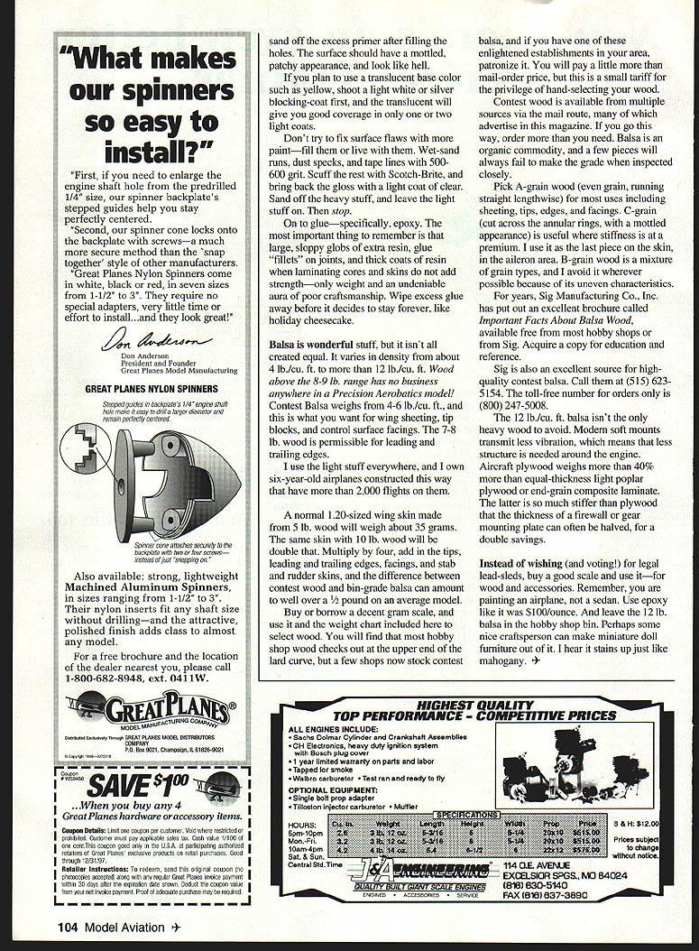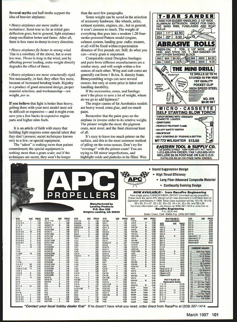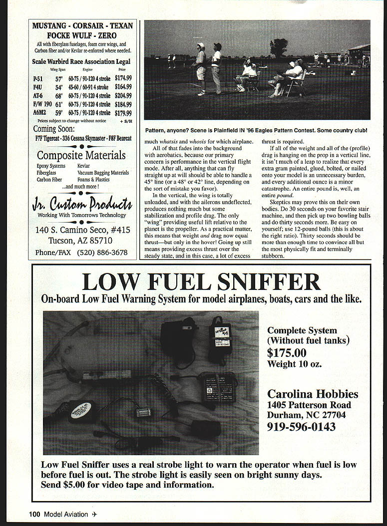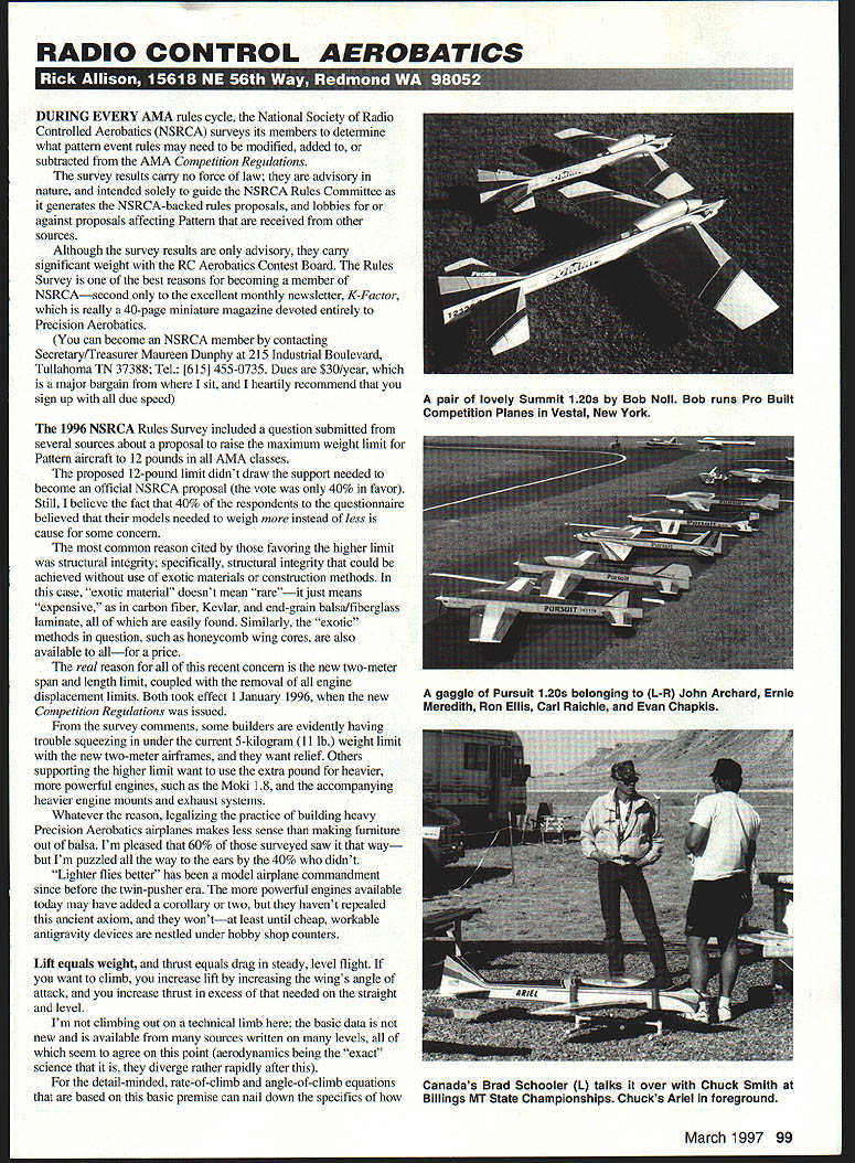 RADIO CONTROL AEROBATICS DURING EVERY AMA rules cycle National Society Radio Controlled Aerobatics NSRCA surveys its members determine what pattern event rules may need modified added subtracted AIVIA Competition Regulations survey results cany no force law advisory nature intended solely guide NSRCA Rules Committee generates NSRCA-backed rules proposals lobbies against proposals affecting Pattern received other sources Although survey results advisory carry significant weight RC Aerobatics Contest Board Rules Survey best reasons becoming member NSRCAsecond excellent monthly newsletter K-Factor really 40-page miniature magazine devoted entirely Precision Aerobatics can become NSRCA member contacting Secretary/Treasurer Maureen Dunphy 215 Industrial Boulevard Tullahoma TN 37388 Tel [615] 455-0735 Dues $30/year major bargain sit heartily recommend sign up due speed 1996 NSRCA Rules Survey included question submitted several sources about proposal raise maximum weight limit Pattern aircraft 12 pounds AMA classes proposed 12-pound limit didnt draw support needed become official NSRCA proposal vote 40% favor Still believe fact 40% respondents questionnaire believed models needed weigh instead less cause some concern common reason cited favoring higher limit structural integrity specifically structural integrity could achieved use exotic materials construction methods case exotic material doesnt mean rare just means expensive carbon fiber Kevlar end-grain balsa/fiberglass laminate easily found Similarly exotic methods question such honeycomb wing cores also available allfor price real reason recent concern new two-meter span length limit coupled removal engine displacement limits Both took effect 1 January 1996 new Competition Regulations issued survey comments some builders evidently having trouble squeezing under current 5-kilogram 11 lb weight limit new two-meter airframes want relief Others supporting higher limit want use extra pound heavier powerful engines such Moki 18 accompanying heavier engine mounts exhaust systems Whatever reason legalizing practice building heavy Precision Aerobatics airplanes makes less sense making furniture out balsa Im pleased 60% surveyed saw waybut Im puzzled way ears 40% didnt Lighter flies better has model airplane commandment since before twin-pusher era powerful engines available today may have added corollary two havent repealed ancient axiom wont-at least until cheap workable antigravity devices nestled under hobby shop counters Lift equals weight thrust equals drag steady level flight want climb increase lift increasing wings angle attack increase thrust excess needed straight level Im climbing out technical limb basic data new available sources written levels seem agree point aerodynamics being exact science diverge rather rapidly after detail-minded rate-of-climb angle-of-climb equations based basic premise can nail down specifics March 1997 99 pair lovely Summit 120s Bob Noll Bob runs Pro Built Competition Planes Vestal New York gaggle Pursuit 120s belonging L-R John Archard Ernie Meredith Ron Ellis Carl Raichie Evan Chapkis Canadas Brad Schooler L talks over Chuck Smith Billings MT State Championships Chucks Ariel foreground MUSTANG CORSAIR TEXAN FOCKE WULF ZERO fiberglass fuselages foam core wings Carbon fiber and/or Keviar re-enforced needed Scale Warbird Race Association Legal Wing SpanEnginePuce P51 F4U AT6 F/W 190 A6M2 576075/9l42O4stroke 544560/60914 stroke 686075 /911204 stroke 616075 91l20 4 stroke 596075 91l2O 4 stroke $17499 $16499 $20499 $18499 $17999 s/H Prices subject change notice Coming Soon F7F Iigercat336 Cessna Skymaster Bearcat posite Materials Epoxy Systems Keviar Fiberglass Vacuum Bagging Materials Carbon Fiber Foams & Plastics much Q44tO4 p4h4 Working Tomorrows Technology 40 S Camino Seco #415 Thcson AZ 85710 Phone/FAX 520 886-3678 much whatsis whosis airplane fades background aerobatics because primary concern performance vertical flight mode After anything can fly straight up will should able handle 450 line 480 42 line depending sort mistake favor vertical wing totally unloaded ailerons undeflected produces nothing much some stabilization profile drag wing providing useful lift relative planet propeller As practical matter means weight drag now equal thrustbut hover Going up still means providing excess thrust over steady state case lot excess thrust required weight profile drag hanging prop vertical line isnt much leap realize extra gram painted glued bolted nailed onto model unnecessary burden additional ounce minor catastrophe An entire pound well entire pound Skeptics may prove own bodies 30 seconds favorite stair machine pick up two bowling balls thirty seconds easy yourself use 12-pound balls about right ratio Thirty seconds should enough time convince physically fit terminally stubborn 100 Model Aviation ern anyone Scene Plainfield IN 96 Eagles Pattern Contest Some country club LOW FUEL SNIFFER On-board Low Fuel Warning System model airplanes boats cars like Complete System Without fuel tanks $17500 Weight 10 oz Carolina Hobbies 1405 Patterson Road Durham NC 27704 919-596-0143 Low Fuel Sniffer uses real strobe light warn operator fuel low before fuel out strobe light easily seen bright sunny days Send $500 video tape information Several myths half-truths support idea heavier airplanes Heavy airplanes stable turbulence Semi-true far initial gust deflection goes general light airplanes damp oscillation better faster After less mass damp direction Heavy airplanes fly better strong wind corollary above less true Thrust king wind affecting power loading extra weight directly degrades effect thrust Heavy airplanes structurally rigid necessarily fact often flex because increased bending loads Rigidity product good structural design proper material selection workmanshipnot weight per se believe light better heavy getting next model need difficult expensive might save few bucks expensive engine parts higher-nitro fuels artic