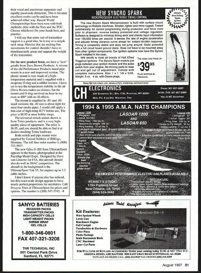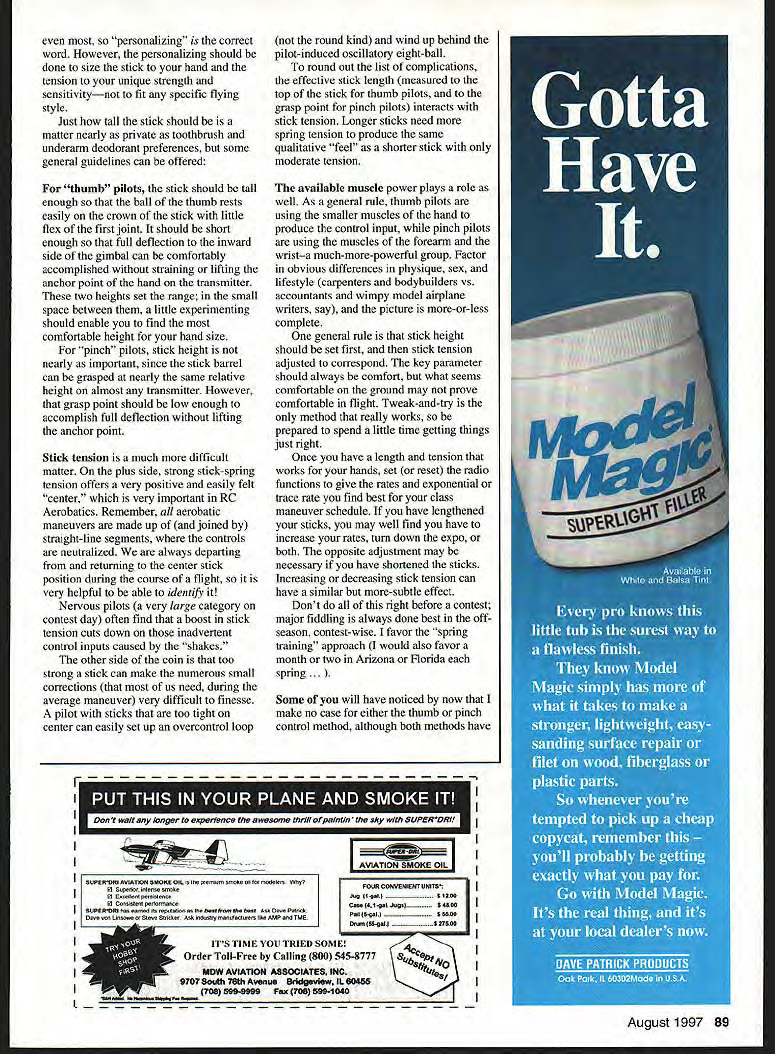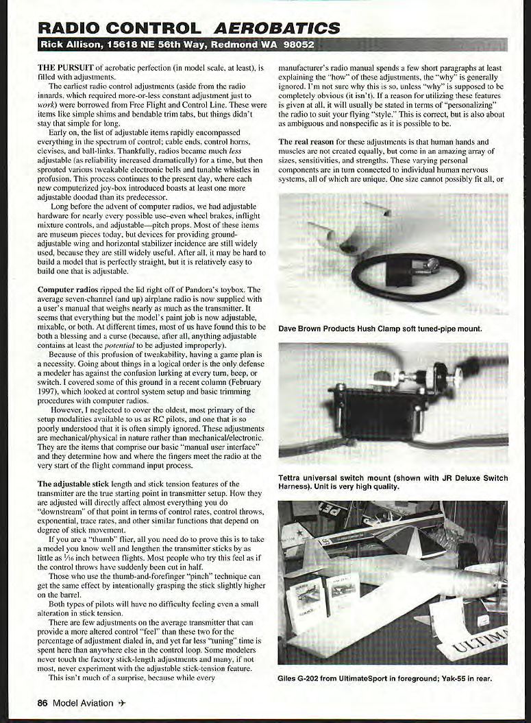 RADIO CONTROL AEROBATICS 11 hduJ1in 13 THE PURSUIT aerobatic perfection model scale least filled adjustments earliest radio control adjustments aside radio innards required more-or-less constant adjustment just work borrowed Free Flight Control Line items like simple shims bendable trim tabs things didnt stay simple long Early list adjustable items rapidly encompassed everything spectrum control cable ends control horns devises ball-links Thankfully radios became much less adjustable reliability increased dramatically time sprouted various tweakable electronic bells tunable whistles profusion process continues present day new computerized joy-box introduced boasts least adjustable doodad its predecessor Long before advent computer radios adjustable hardware nearly possible useeven wheel brakes inflight mixture controls adjustablepitch props Most items museum pieces today devices providing groundadjustable wing horizontal stabilizer incidence still widely used because still widely useful After may hard build model perfectly straight relatively easy build adjustable Computer radios ripped lid right off Pandoras toybox average seven-channel up airplane radio now supplied users manual weighs nearly much transmitter seems everything models paint job now adjustable mixable both different times us have found both blessing curse because after anything adjustable contains least potential adjusted improperly Because profusion tweakability having game plan necessity Going about things logical order defense modeler has against confusion lurking turn beep switch covered some ground recent column February 1997 looked control system setup basic trimming procedures computer radios However neglected cover oldest primary setup modalities available us RC pilots poorly understood often simply ignored adjustments mechanicallphysical nature rather mechanical/electronic items comprise basic manual user interface determine fingers meet radio very start flight command input process adjustable stick length stick tension features transmitter true starting point transmitter setup adjusted will directly affect almost everything downstream point terms control rates control throws exponential trace rates other similar functions depend degree stick movement thumb flier need prove take model know well lengthen transmitter sticks little 1/i6 inch between flights Most people try feel control throws have suddenly cut half use thumb-and-forefinger pinch technique can get same effect intentionally grasping stick slightly higher barrel Both types pilots will have no difficulty feeling small alteration stick tension few adjustments average transmitter can provide altered control feel two percentage adjustment dialed yet far less tuning time spent anywhere else control loop Some modelers never touch factory stick-length adjustments never experiment adjustable stick-tension feature isnt much surprise because manufacturers radio manual spends few short paragraphs least explaining adjustments generally ignored Im sure unless supposed completely obvious isnt reason utilizing features given will usually stated terms personalizing radio suit flying style correct also about ambiguous nonspecific possible real reason adjustments human hands muscles created equally come amazing array sizes sensitivities strengths varying personal components turn connected individual human nervous systems unique size cannot possibly fit 86 Model Aviation Brown Products Hush Clamp soft tuned-pipe mount Tettra universal switch mount shown JR Deluxe Switch Harness Unit very high quality Giles G-202 UltimateSport foreground Yak-55 rear personalizing correct word However personalizing should done size stick hand tension unique strength sensitivitynot fit specific flying style Just tall stick should matter nearly private toothbrush underarm deodorant preferences some general guidelines can offered thumb pilots stick should tall enough ball thumb rests easily crown stick little flex first joint should short enough full deflection inward side gimbal can comfortably accomplished straining lifting anchor point hand transmitter two heights set range small space between little experimenting should enable find comfortable height hand size pinch pilots stick height nearly important since stick barrel can grasped nearly same relative height almost transmitter However grasp point should low enough accomplish full deflection lifting anchor point Stick tension much difficult matter plus side strong stick-spring tension offers very positive easily felt center very important RC Aerobatics Remember aerobatic maneuvers made up joined straight-line segments controls neutralized always departing returning center stick position during course flight very helpful able identify Nervous pilots very large category contest day often find boost stick tension cuts down inadvertent control inputs caused shakes other side coin too strong stick can make numerous small corrections us need during average maneuver very difficult finesse pilot sticks too tight center can easily set up overcontrol loop round kind wind up behind pilot-induced oscillatory eight-ball round out list complications effective stick length measured top stick thumb pilots grasp point pinch pilots interacts stick tension Longer sticks need spring tension produce same qualitative feel shorter stick moderate tension available muscle power plays role well As general rule thumb pilots using smaller muscles hand produce control input pinch pilots using muscles forearm wrista much-more-powerful group Factor obvious differences physique sex lifestyle carpenters bodybuilders vs accountants wimpy model airplane writers say picture more-or-less complete general rule stick height should set first stick tension adjusted correspond key parameter should always comfort what seems comfortable ground may prove comfortable flight Tweak-and-try method really works prepared spend little time getting things just right Once have length tensio