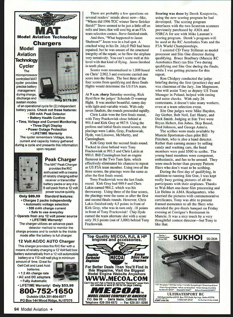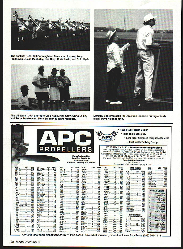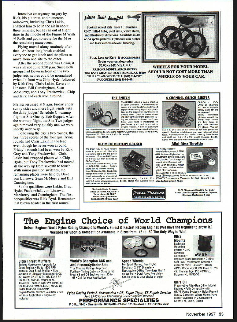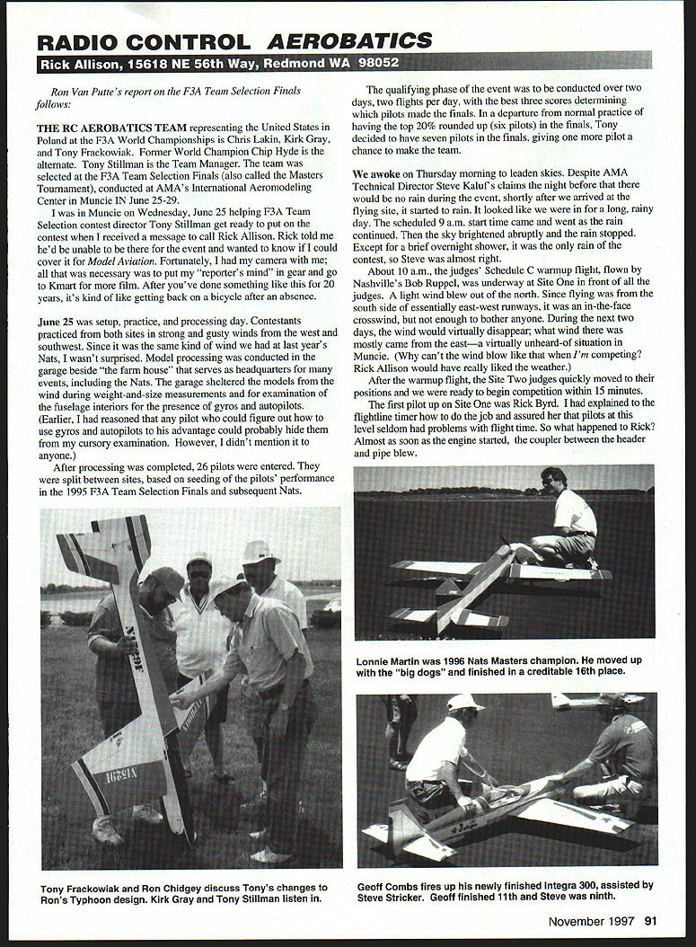 RADIO CONTROL AEROBATICS Ron Van Putte s report F3A Team Selection Finals follows THE RC AEROBATICS TEAM representing United States Poland F3A World Championships Chris Lakin Kirk Gray Tony Frackowiak Former World Champion Chip Hyde alternate Tony Stiliman Team Manager team selected F3A Team Selection Finals also called Masters Tournament conducted AMAs International Aeromodeling Center Muncie IN June 25-29 Muncie Wednesday June 25 helping F3A Team Selection contest director Tony Stillman get ready put contest received message call Rick Allison Rick told hed unable event wanted know could cover Model Aviation Fortunately camera necessary put reporters mind gear go Kmart film After youve done something like 20 years its kind like getting back bicycle after absence June 25 setup practice processing day Contestants practiced both sites strong gusty winds west southwest Since same kind wind last years Nats wasnt surprised Model processing conducted garage beside farm house serves headquarters events including Nats garage sheltered models wind during weight-and-size measurements examination fuselage interiors presence gyros autopilots Earlier reasoned pilot could figure out use gyros autopilots advantage could probably hide cursory examination However didnt mention anyone After processing completed 26 pilots entered split between sites based seeding pilots performance 1995 F3A Team Selection Finals subsequent Nats qualifying phase event conducted over two days two flights per day best three scores determining pilots made finals departure normal practice having top 20% rounded up six pilots finals Tony decided have seven pilots finals giving pilot chance make team awoke Thursday morning leaden skies Despite AMA Technical Director Steve Kaluf s claims night before would no rain during event shortly after arrived flying site started rain looked like long rainy day scheduled 9 am start time came went rain continued sky brightened abruptly rain stopped Except brief overnight shower rain contest Steve almost right About 10 am judges Schedule C warmup flight flown Nashvilles Bob Ruppel underway Site front judges light wind blew out north Since flying south side essentially east-west runways in-the-face crosswind enough bother anyone During next two days wind would virtually disappear what wind mostly came easta virtually unheard-of situation Muncie cant wind blow like Im competing Rick Allison would have really liked weather After wannup flight Site Two judges quickly moved positions ready begin competition within 15 minutes first pilot up Site Rick Byrd explained ffightline timer job assured pilots level seldom problems flight time So what happened Rick Almost soon engine started coupler between header pipe blew November 1997 91 Lonnie Martin 1996 Nats Masters champion moved up big dogs finished creditable 16th place Tony Frackowiak Ron Chidgey discuss Tonys changes Rons Typhoon design Kirk Gray Tony Stiliman listen Geoff Combs fires up newly finished Integra 300 assisted Steve Stricker Geoff finished 11th Steve ninth finalists L-R Bill Cunningham Dave von Linsowe Tony Frackowiak Sean McMurtry Kirk Gray Chris Lakin Chip Hyde USEPRICESIZEUSEPRICE 2118385X7255 395 552 251183852755 363 572311838625237510 363 8X211838752705 3W 6324238597527088S 335 85 22519385875275 S 335 65 237239587527SNN5 2W 65 2803395875275W5 3W 655 55339587527755 363 65 565339587527758J85 3W 6526533958752775WS3W 72315183875288S235 7241518387528899S335 725183875288WS3W 7281838752825S3W 726W18395875X8250JN53W 7271838752825W83W 7281838752855335 72918387528568S335 7218183875282WS335 7252728395875287588S2W 752 7283958752875W53W 76252325. 143958752956853W 7824395875295WS3W 782663958752925WS335 7827639567529588S335 8241425688285S3W 825206882875S3W 82628688290S3W 827286924W239 827321395525W239 828286928325 829256927239 8218 256 928 85254395929239 8525543959210239 85 2655388952658S3W 85 2705395952709S3W Sound Suppression Design High Thrust Efficiency Long Fiber Advanced Composite Material Continually Evolving Design Manufactured Landing Product PO Box 038 Knights Landing CA U645 SIZEUSEPRICESIZEUSEPRICESIZEUSEPRICE 952758S 3W12215W7 73514210 1235 9528585 3W122117 7351421117 12W 9528585 3W1221187 7351421219 13W 9625237516 3W1221157 73514212810 13W 82655 3W122127 7W1421310 13W 92755 3351221257 7W14213810 13W 9282S 3W1221287 7W14213515 13W 9524511 363122137 7W142135815 12W 12233631221387735142141213W 10543631221477W1421481013W 102536512252275839714421351013W 10282631252977W1442121013W 122726312521077W1422131213W 152826312521177814521481513W 1529363135211577W14521456121235 1821036313521277W1528151235 185245113W135212577W152121013W 112323512521377W152111013W 1124 3W 1326 463152121013W 11253W13274351521381213W 112636313284351521461513W 11273W132977W15821381513W 11283W132107735162813W 1129 3W 12211 7 W 16215 13W 1121377W132129177W1621313W 11211773513213997W1621351013W 1121277W132135897W1621413W 11213W77W13529712351621481513W 1121377W135210713W162181363 1121477W 13521156712W 11524839713521351012W1652121013W 115213587735135213319 ... 12W928MR3W 122639713521351013W1026PMR3W 12273971352141013W1027P1gw3W 1228397135214W1013W10297P12W3W 122977W1425813W1126P12W310 1220W77W142613W1127P12W335 1221577W142813W1426P12W 12W MULI9-RUDE2SIZEUSE RerJIamIeRIada22212 SiZEUSEPRICE22214 18282215222216 18212225724210 1821213223524212 185142212224214 18216225724216 22281225633884e9ub17-19 202102563 ~- 202122563 202142557 222162557 212122563 22283163 22210133135 22212133135 222143157 222183157 242153863 242123963 24x143263 242163263 28a409u618-19 1010 288de9ub22-3 3510 281a4e9u5224257 2BIadeHub243563 M8L1I-RLAUE 3 ReplaceabiR Riades 172103302 182103320 192113350 20215133750 22212133700 222143705 21 2103705 212123705 322154557 Contact local hobby dealer first doesnt have what need order direct RacePro 209 267-1414 92 Model Aviation eam L-R alternate Chip Hyde Kirk Gray Chris Lakin Tony Frackowiak Tony Stiliman team manager Dorothy Speights calls Dave von Linsowe during f