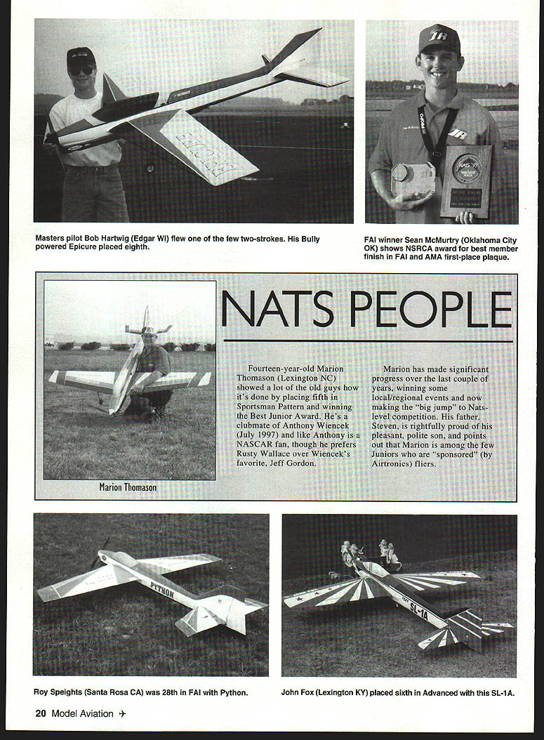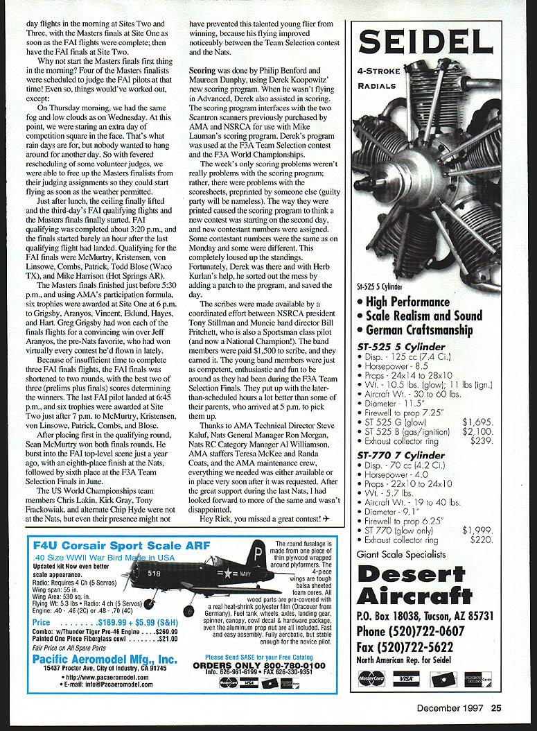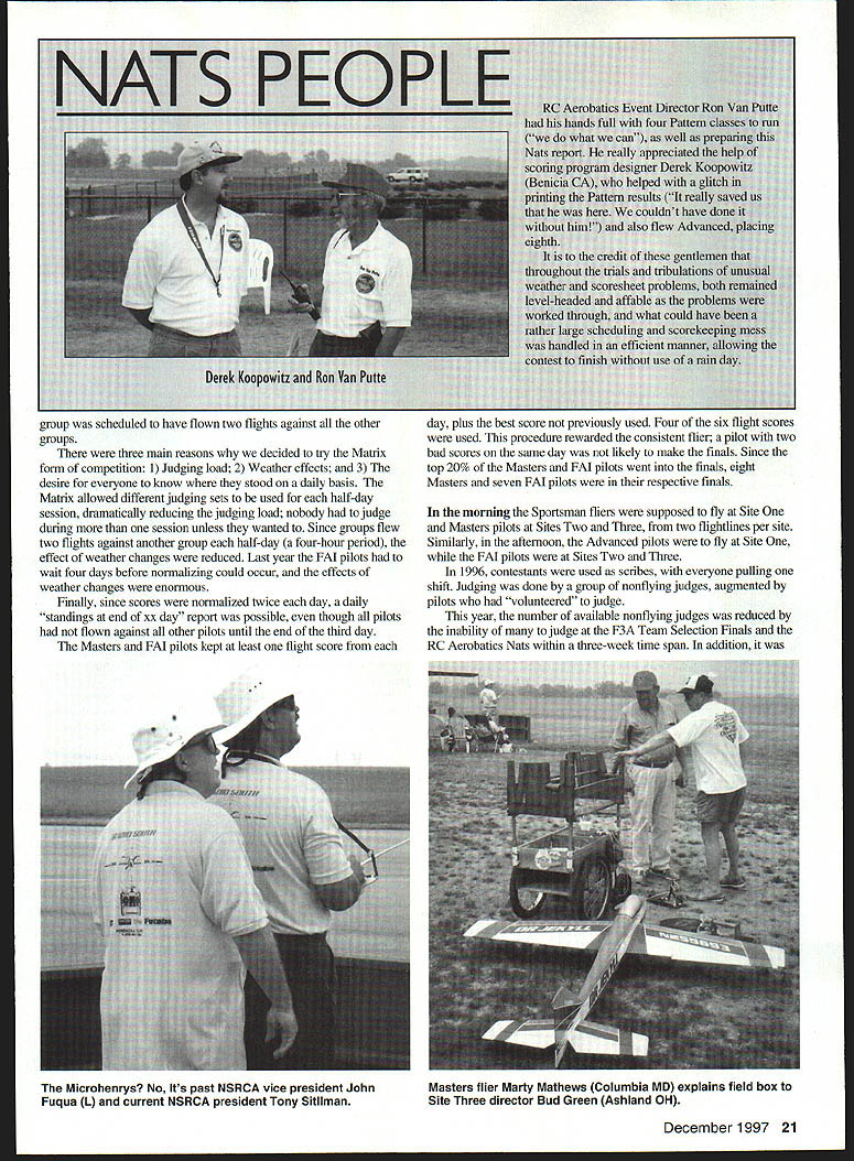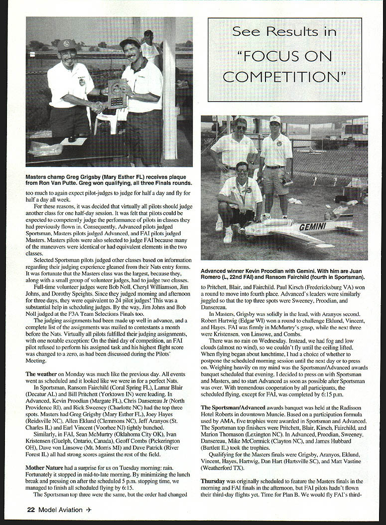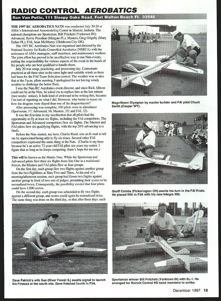RADIO CONTROL AEROBATICS 1997 RC AEROBATICS NATS conducted July 20-24 AMAs International Aeromodeling Center Muncie Indiana national champions Sportsman Bill Pritchett Yorktown IN Advanced Kevin Proodian Margare FL Masters Greg Grigsby Maiy Esther FL FM Sean McMurtry Oklahoma City OK 1997 RC Aerobatics Nats organized directed National Society Radio Controlled Aerobatics NSRCA assistance AIvIA managers staff members maintenance workers joint effort has proved effective way run Nats events putting responsibility various aspects event hands people best qualified handle July 20 setup practicing processing day Contestants practiced three sites same light-and-variable winds FM Team Selection contest weather nice 5 pm pilots meeting apologized having windy weather challenge better fliers Nats RC Aerobatics event director since Rick Allison could Nats asked replace him last minute two weeks notice feels kind awkward writing because Im sort reporting what did However better report dragons slayed dragonslayers After processing complete 100 pilots attendance Sportsman 17 Advanced 16 Masters 35 FAI 32 first time recollection pilots opportunity fly least six flights including FM competitors Sportsman Advanced competitors flew six flights Masters FM pilots flew six qualifying flights top 20% advancing finals Before Nats started hero Charlie Reed sent B-mail tell appreciated being able fly six times Several other FM competitors expressed same thing Nats Charlie hero because hes active 72-year-old FM pilot ten years senior figure long keeps competing theres hope too will known Matrix Nats Sportsman Advanced pilots flew six flights Site traditional format Masters FM pilots flew four groups first day group flew two flights against another group two flighdines Sites Two Three end morning/afternoon session group flown two flights against another group front two sets judges permitting scores normalized twice Consequently possibility existed four pilots could have 1000 scores second day group scheduled fly two flights against different group scores could again normalized twice same thing done third day after three days December 1997 19 Magnificent Olympian master builder FAI pilot Chuck Smith Casper WY Geoff Combs Pickerington OH awaits turn FAI finals placed fifth F3A new Integra 300 Dave Patricks wife Sue River Forest IL awaits signal launch Sportsman winner Bill Pritchett Yorktown IN SL-1 Finesse south site Dave finished fourth F3A arranged Muncie Central HS band members scribe 20 Modei Aviation ers pilot Bob Hartwig Edgar WI flew few two-strokes BullyFAI winner Sean McMurtry Oklahoma City powered Epicure placed eighthOK shows NSRCA award best member finish FAI AMA first-place plaque urteen-ve ason 4 lot pta man Patt st Junior late Ai 1997 AR fan y Wallace rite Jeff G Roy Speights Santa Rosa CA 28th FAI PythonJohn Fox Lexington KY placed sixth Advanced SL-1A group scheduled have flown two flights against other groups three main reasons decided try Matrix form competition 1 Judging load 2 Weather effects 3 desire everyone know stood daily basis Matrix allowed different judging sets used half-day session dramatically reducing judging load nobody judge during session unless wanted Since groups flew two flights against another group half-day four-hour period effect weather changes reduced Last year FM pilots wait four days before normalizing could occur effects weather changes enormous Finally since scores normalized twice day daily standings end xx day report possible though pilots flown against other pilots until end third day Masters FM pilots kept least flight score morning Sportsman fliers supposed fly Site Masters pilots Sites Two Three two flightlines per site Similarly afternoon Advanced pilots fly Site FAI pilots Sites Two Three 1996 contestants used scribes everyone pulling shift Judging done group nonflying judges augmented pilots volunteered judge year number available nonflying judges reduced inability judge F3A Team Selection Finals RC Aerobatics Nats within three-week time span addition December 1997 21 day plus best score previously used Four six flight scores used procedure rewarded consistent flier pilot two bad scores same day likely make finals Since top 20% Masters FM pilots went finals eight Masters seven FM pilots respective finals Microhenrys No Its past NSRCA vice president John Fuqua L current NSRCA president Tony Sitliman Masters flier Marty Mathews Columbia MD explains field box Site Three director Bud Green Ashland OH too much again expect pilot-judges judge half day fly half day week reasons decided virtually pilots should judge another class half-day session felt pilots could expected competently judge performance pilots classes previously flown Consequently Advanced pilots judged Sportsman Masters pilots judged Advanced FAT pilots judged Masters Masters pilots also selected judge FAT because maneuvers identical equivalent elements two classes Selected Sportsman pilots judged other classes based information regarding judging experience gleaned Nats entry forms fortunate Masters class largest because along small group volunteer judges judge two classes Full-time volunteer judges Bob Noll Cheryl Williamson Jim Johns Dorothy Speights Since judged morning afternoon three days equivalent 24 pilot judges substantial help scheduling judges way Jim Johns Bob Noll judged F3A Team Selections Finals too judging assignments made up well advance complete list assignments mailed contestants month before Nats Virtually pilots fulfilled judging assignments notable exception third day competition FAT pilot refused perform assigned task highest flight score changed zero discussed during Pilots Meeting weather Monday much like previous day events went scheduled looked like perfect Nats Sportsman Ransom Fairchild Coral Spring FL Lamar Blair Decatur AL Bill Pritchett Yorktown IN leading Advanced Kevin Proodian Margate FL Chris Dansereau Jr North Providence RI Rick Sweeney Charlotte NC top three spots