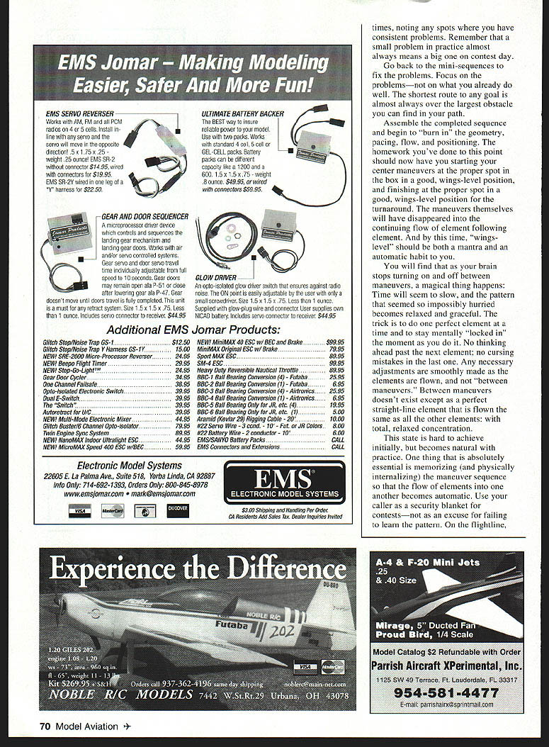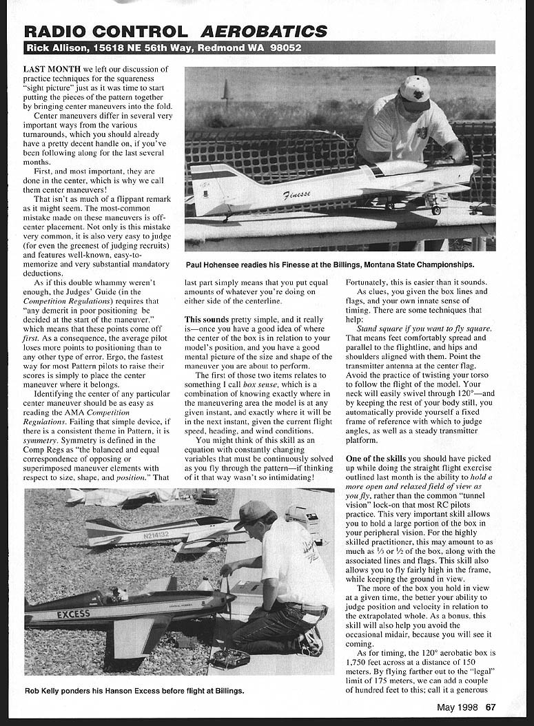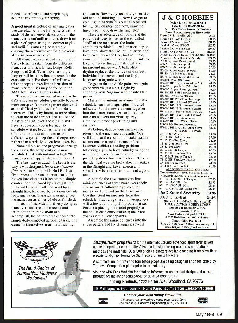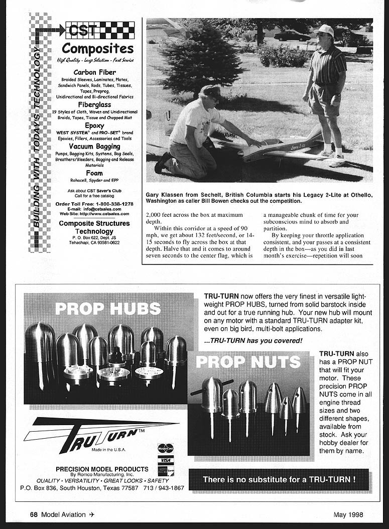 RADIO CONTROL AEROBATICS U JLSI W 1@IIE1UKU S 5 i t4I II [* LAST MONTH left discussion practice techniques squareness sight picture just time start putting pieces pattern together bringing center maneuvers fold Center maneuvers differ several very important ways various turnarounds should already have pretty decent handle youve following along last several months First important done center call center maneuvers isnt much flippant remark might seem most-common mistake made maneuvers offcenter placement mistake very common also very easy judge greenest judging recruits features well-known easy-tomemorize very substantial mandatory deductions As double whammy werent enough Judges Guide Competition Regulations requires demerit poor positioning decided start maneuver means points come off first As consequence average pilot loses points positioning other type error Ergo fastest way Pattern pilots raise scores simply place center maneuver belongs Identifying center particular center maneuver should easy reading AMA Competition Regulations Failing simple device consistent theme Pattern symmetry Symmetry defined Comp Regs balanced equal correspondence opposing superimposed maneuver elements respect size shape position last part simply means put equal amounts whatever youre doing either side centerline sounds pretty simple really isonce have good idea center box relation models position have good mental picture size shape maneuver about perform first two items relates something call box sense combination knowing exactly maneuvering area model given instant exactly will next instant given current flight speed heading wind conditions might think skill equation constantly changing variables must continuously solved fly through patternif thinking way wasnt intimidating Fortunately easier sounds As clues given box lines flags own innate sense timing some techniques help Stand square f want fly square means feet comfortably spread parallel flightline hips shoulders aligned Point transmitter antenna center flag Avoid practice twisting torso follow flight model neck will easily swivel through 1200—and keeping rest body still automatically provide yourself fixed frame reference judge angles well steady transmitter platform skills should have picked up doing straight flight exercise outlined last month ability hold open relaxed field view fly rather common tunnel vision lock-on RC pilots practice very important skill allows hold large portion box peripheral vision highly skilled practitioner may amount much /3 /2 box along associated lines flags skill also allows fly fairly high frame keeping ground view box hold view given time better ability judge position velocity relation extrapolated whole As bonus skill will also help avoid occasional midair because will see coming As timing 1200 aerobatic box 1750 feet across distance 150 meters flying farther out legal limit 175 meters can add couple hundred feet call generous May1998 67 Paul Hohensee readies Finesse Billings Montana State Championships Rob Kelly ponders Hanson Excess before flight Billings Composites lll Ill Carbon Fiber Braided Sleeves Laminates Plates Sandwich Panels lods Tubes Tissues Tapes Prepreg Unidirectional Bi-directional Fabrics 19 Styles Fiberglass Cloth Woven Unidirectional Braids Tapes Tissue Chopped Mat Epoxy WEST SYSTEM P0SETn brand Epoxies Fillers Accessories Tools Vacuum Bagging Pumps Bagging Kits Systems Bag Seals Breathers/Bleeders Bagging lelease Materials Foam Rohacell Spyder EPP Ask about CST Savers Club Call far free catalog Order Toll Free 1-800-338-1278 E-mail info@cstsalescom Web Site http/Iwwwcstsalemcom Composite Structures Technology P0 Bax622 Dept JS Tehachapi CA B3581 -0622 2000 feet across box maximuma manageable chunk time depthsubconscious mind absorb Within corridor speed 90partition mph get about 132 feet/second 14- ing throttle application 15 seconds fly across box thatconsistent passes consistent depth Halve comes arounddepth boxas did last seven seconds center flag ismonths exerciserepetition will soon 68 Model Aviation May 1998 Gary Kiassen Sechelt British Columbia starts Legacy 2-Lite Othello Washington caller Bill Bowen checks out competition TRU-TURN now offers very finest versatile light weight PROP HUBS turned solid barstock inside out true running hub new hub will mount motor standard TRU-TURN adapter kit big bird multi-bolt applications TRU-TURN has covered R de n U S TRU-TURN also has PROP NUT will fit motor precision PROP NUTS come engine thread sizes two different shapes available stock Ask hobby dealer name U V1S4 PRECISION MODEL PRODUCTS Romco Manufactu ng nc QUALITY VERSA TILITY GREAT LOOKS SAFETY PO Box 836 South Houston Texas 77587 713 943 1867 breed comfortable surprisingly accurate rhythm flying good mental picture maneuver placing frame starts study maneuver description maneuver unfamiliar draw piece paper using correct angles radii Its amazing simply drawing maneuver can fix overall shape minds eye maneuvers consist number basic elements taken different maneuver families Lines Loops Rolls Snaps Stall Turns simple loop roll includes line elements entry exit unfamiliar concept excellent discussion maneuver families may found AMA RC Pattern Judges Guide center maneuvers called out different class schedules generally become complex containing elements difficulty/skill level class increases intent force pilots learn basic aerobatic skills Masters F3A level basic skills have supposedly learned schedule writing becomes matter arranging familiar elements different ways keep challenge fresh rather strictly educational exercise Nonetheless progresses through classes complexity new schedule filled unfamiliar high K maneuvers can appear daunting indeed best way attack beast way designed learn elements first Square Loop Half Rolls first appears enormous task broken elements becomes simple quarter loop followed straight line followed half roll followed straight line followed quarter outside loop trick