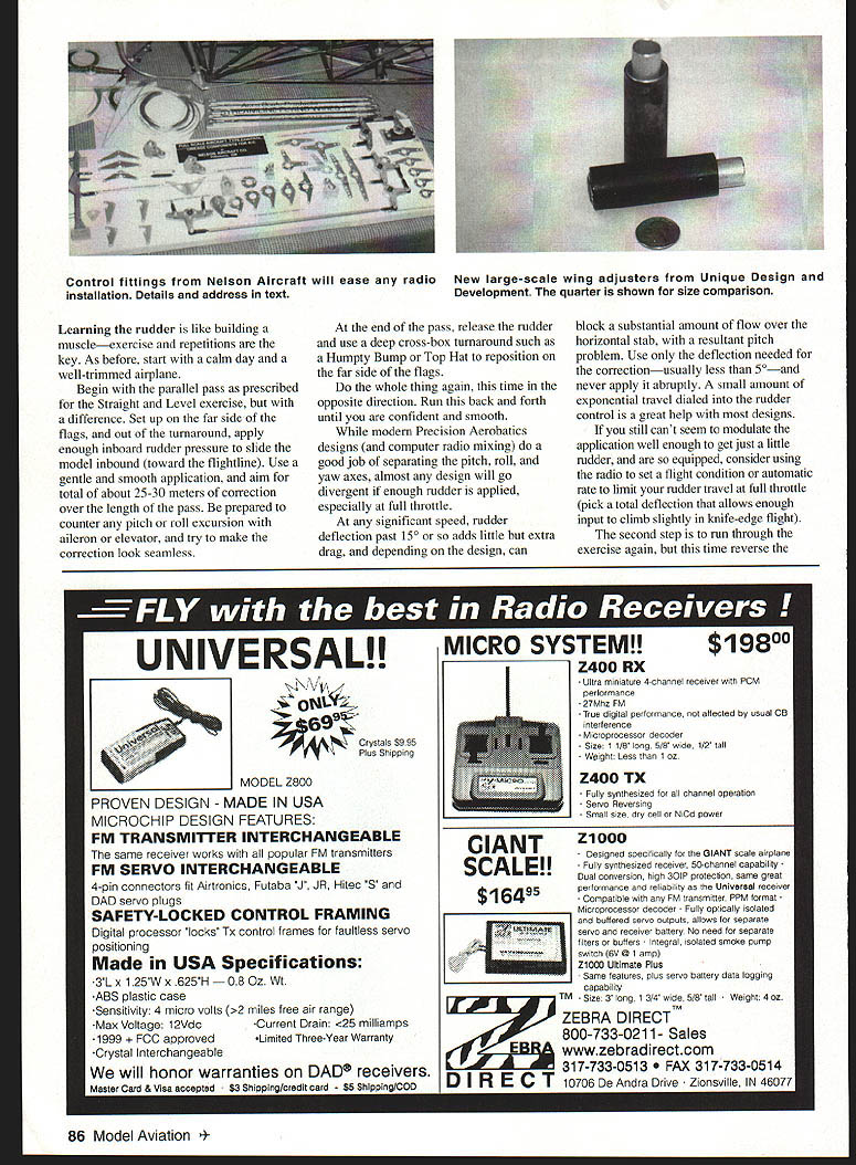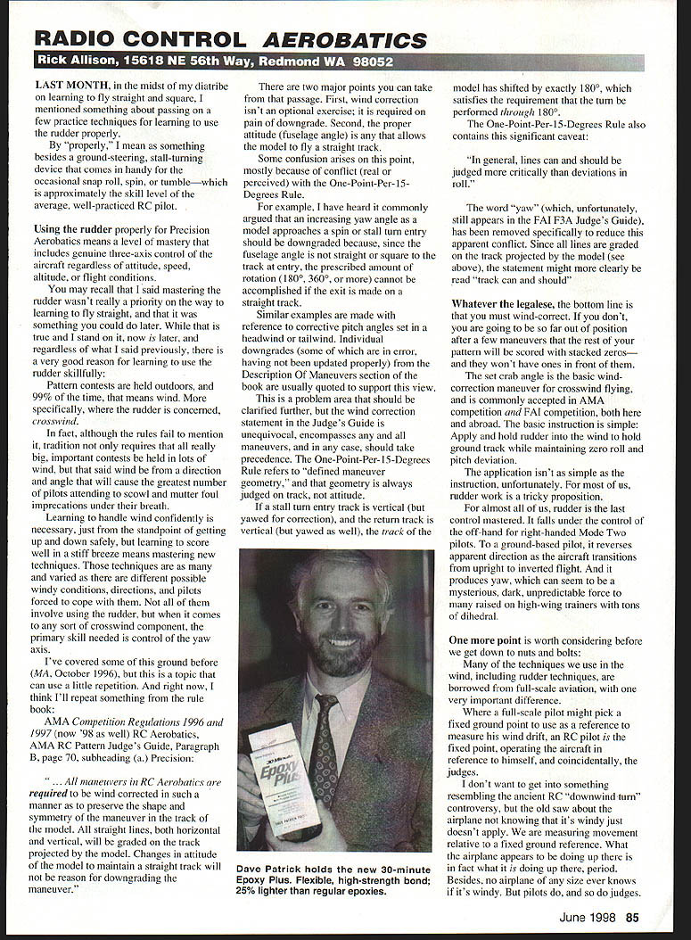 RADIO CONTROL AEROBATICS LAST MONTH midst diatribe learning fly straight square mentioned something about passing few practice techniques learning use rudder properly properly mean something besides ground-steering stall-turning device comes handy occasional snap roll spin tumblewhich approximately skill level average well-practiced RC pilot Using rudder properly Precision Aerobatics means level mastery includes genuine three-axis control aircraft regardless attitude speed altitude flight conditions may recall said mastering rudder wasnt really priority way learning fly straight something could later true stand now later regardless what said previously very good reason learning use rudder skillfully Pattern contests held outdoors 99% time means wind specifically rudder concerned crosswind fact although rules fail mention tradition requires really big important contests held lots wind said wind direction angle will cause greatest number pilots attending scowl mutter foul imprecations under breath Learning handle wind confidently necessary just standpoint getting up down safely learning score well stiff breeze means mastering new techniques techniques varied different possible windy conditions directions pilots forced cope them involve using rudder comes sort crosswind component primary skill needed control yaw axis Ive covered some ground before MA October 1996 topic can use little repetition right now think Ill repeat something rule book AMA Competition Reguations 1996 1997 now 98 well RC Aerobatics AMA RC Pattern Judges Guide Paragraph B page 70 subheading Precision maneuvers RC Aerobatics required wind corrected such manner preserve shape symmetry maneuver track model straight lines both horizontal vertical will graded track projected model Changes attitude model maintain straight track will reason downgrading maneuver two major points can take passage First wind correction isnt optional exercise required pain downgrade Second proper attitude fuselage angle allows model fly straight track Some confusion arises point mostly because conflict real perceived One-Point-Per-15Degrees Rule example have heard commonly argued increasing yaw angle model approaches spin stall turn entry should downgraded because since fuselage angle straight square track entry prescribed amount rotation 1800 3600 cannot accomplished exit made straight track Similar examples made reference corrective pitch angles set headwind tailwind Individual downgrades some error having updated properly Description Maneuvers section book usually quoted support view problem area should clarified further wind correction statement Judges Guide unequivocal encompasses maneuvers case should take precedence One-Point-Per- 15-Degrees Rule refers defined maneuver geometry etry always judged track attitude stall turn entry track vertical yawed correction return track vertical yawed well track model has shifted exactly 1800 satisfies requirement turn performed through 1800 One-Point-Per-IS-Degrees Rule also contains significant caveat general lines can should judged critically deviations roll word yaw unfortunately still appears FAI F3A Judges Guide has removed specifically reduce apparent conflict Since lines graded track projected model see above statement might clearly read track can should Whatever legalese bottom line must wind-correct dont going far out position after few maneuvers rest pattern will scored stacked zeros wont have ones front set crab angle basic windcorrection maneuver crosswind flying commonly accepted AMA competition FAI competition both abroad basic instruction simple Apply hold rudder wind hold ground track maintaining zero roll pitch deviation application isnt simple instruction unfortunately us rudder work tricky proposition almost us rudder last control mastered falls under control off-hand right-handed Mode Two pilots ground-based pilot reverses apparent direction aircraft transitions upright inverted flight produces yaw can seem mysterious dark unpredictable force raised high-wing trainers tons dihedral point worth considering before get down nuts bolts techniques use wind including rudder techniques borrowed full-scale aviation very important difference full-scale pilot might pick fixed ground point use reference measure wind drift RC pilot fixed point operating aircraft reference himself coincidentally judges dont want get something resembling ancient RC downwind turn controversy old saw about airplane knowing its windy just doesnt apply measuring movement relative fixed ground reference What airplane appears doing up fact what doing up period Besides no airplane size ever knows its windy pilots judges June 1998 85 Dave Patrick holds new 30-minute Epoxy Plus Flexible high-strength bond 25% lighter regular epoxies Learning rudder like building muscleexercise repetitions key As before start calm day well-trimmed airplane Begin parallel pass prescribed Straight Level exercise difference Set up far side flags out turnaround apply enough inboard rudder pressure slide model inbound toward flightline Use gentle smooth application aim total about 25-30 meters correction over length pass prepared counter pitch roll excursion aileron elevator try make correction look seamless end pass release rudder use deep cross-box turnaround such Humpty Bump Top Hat reposition far side flags whole thing again time opposite direction Run back forth until confident smooth modem Precision Aerobatics designs computer radio mixing good job separating pitch roll yaw axes almost design will go divergent enough rudder applied especially full throttle significant speed rudder deflection past 150 adds little extra drag depending design can block substantial amount flow over horizontal stab resultant pitch problem Use deflection needed correctionusually less 50—and never apply abruptly small amount exponential travel dialed rudder control great help designs still cant seem modulate application well enough get just little rudder equippe