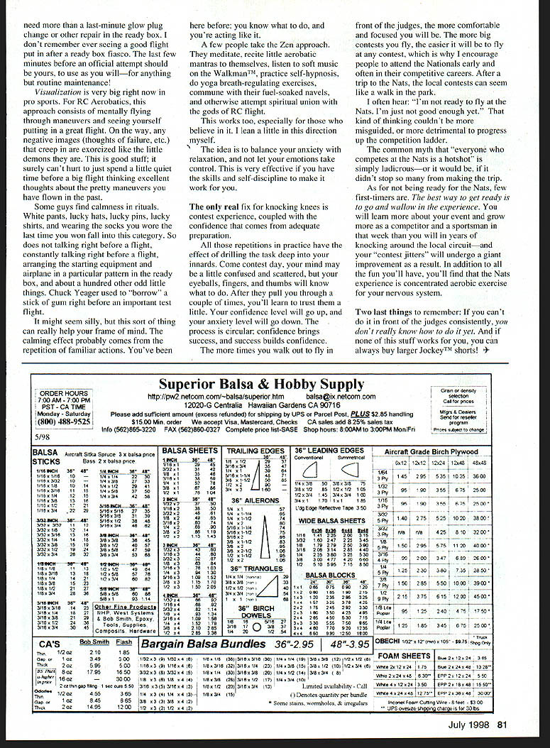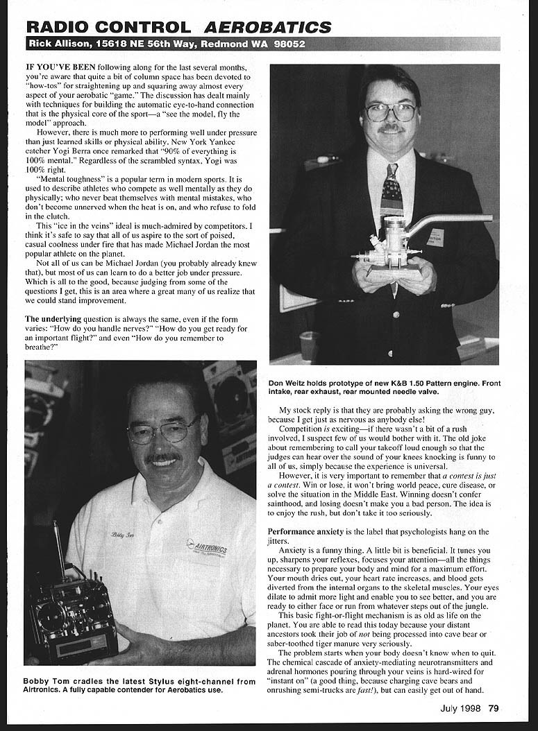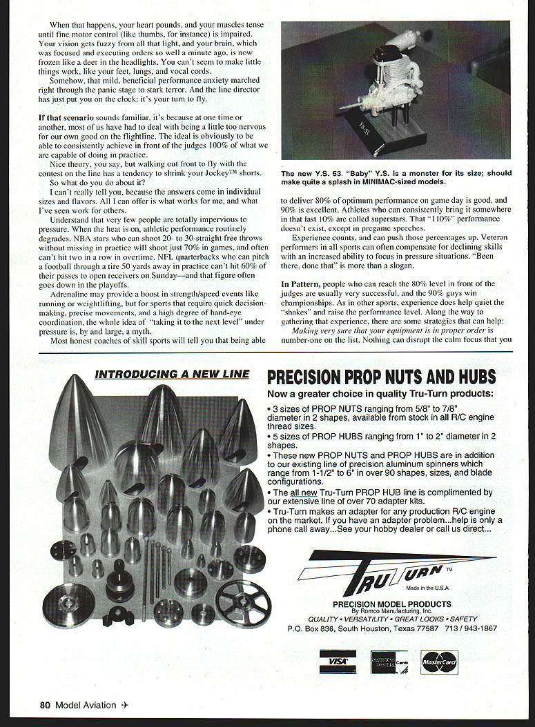 RADIO CONTROL AEROBATICS IF YOUVE BEEN following along last several months youre aware quite bit column space has devoted how-tos straightening up squaring away almost aspect aerobatic game discussion has dealt mainly techniques building automatic eye-to-hand connection physical core sporta see model fly model approach However much performing well under pressure just learned skills physical ability New York Yankee catcher Yogi Berra once remarked 90% everything 100% mental Regardless scrambled syntax Yogi 100% right Mental toughness popular term modern sports used describe athletes compete well mentally physically never heat themselves mental mistakes dont become unnerved heat refuse fold clutch ice veins ideal much-admired competitors think its safe say us aspire sort poised casual coolness under fire has made Michael Jordan popular athlete planet us can Michael Jordan probably already knew us can learn better job under pressure Which good because judging some questions get area great us realize could stand improvement underlying question always same form varies handle nerves get ready important flight remember breathc stock reply probably asking wrong guy because get just nervous anybody else Competition excitingif wasnt bit rush involved suspect few us would bother old joke about remembering call takeoff loud enough judges can hear over sound knees knocking funny us simply because experience universal However very important remember con test just contest Win lose wont bring world peace cure disease solve situation Middle East Winning doesnt confer sainthood losing doesnt make bad person idea enjoy rush dont take too seriously Performance anxiety label psychologists hang jitters Anxiety funny thing little bit beneficial tunes up sharpens reflexes focuses attentionall things necessary prepare body mind maximum effort mouth dries out heart rate increases blood gets diverted internal organs skeletal muscles eyes dilate admit light enable see better ready either face run whatever steps out jungle basic fight-or-flight mechanism old life planet able read today because distant ancestors took job being processed cave bear saber-toothed tiger manure very seriously problem starts body doesnt know quit chemical cascade anxiety-mediating neurotransmitters adrenal hormones pouring through veins hard-wired instant good thing because charging cave bears onrushing semi-trucks arefast can easily get out hand July1998 79 Don Weitz holds prototype new K&B 150 Pattern engine Front intake rear exhaust rear mounted needle valve Bobby Tom cradles latest Stylus eight-channel Airtronics fully capable contender Aerobatics use happens heart pounds muscles tense until fine motor control like thumbs instance impaired vision gets fuzzy light brain focused executing orders well minute ago now frozen like deer headlights cant seem make little things work like feet lungs vocal cords Somehow mild beneficial performance anxiety marched right through panic stage stark terror line director has just put clock its turn fly scenario sounds familiar its because time another us have deal being little too nervous own good flightline ideal obviously able consistently achieve front judges 100% what capable doing practice Nice theory say walking out front fly contest line has tendency shrink JockeyTM shorts So what about cant really tell because answers come individual sizes flavors can offer what works what Ive seen work others Understand very few people totally impervious pressure heat athletic performance routinely degrades NBA stars can shoot 20- 30-straight free throws missing practice will shoot just 70% games often cant hit two row overtime NFL quarterbacks can pitch football through tire 50 yards away practice cant hit 60% passes open receivers Sundayand figure often goes down playoffs Adrenaline may provide boost strength/speed events like running weightlifting sports require quick decisionmaking precise movements high degree hand-eye coordination whole idea taking next level under pressure large myth Most honest coaches skill sports will tell being able deliver 80% optimum performance game day good 90% excellent Athletes can consistently bring somewhere last 10% called superstars 1 10% performance doesnt exist except pregame speeches Experience counts can push percentages up Veteran performers sports can often compensate declining skills increased ability focus pressure situations Been done slogan Pattern people can reach 80% level front judges usually very successful 90% guys win championships As other sports experience does help quiet shakes raise performance level Along way gathering experience some strategies can help Making very sure equipment proper order number-one list Nothing can disrupt calm focus INTRODUCING NEW LINE PRECISION PROP NUTS AND HUBS Now greater choice quality Tru-Turn products 3 sizes PROP NUTS ranging 5/8 7/8 diameter 2 shapes available stock RIC engine thread sizes 5 sizes PROP HUBS ranging 1 2 diameter 2 shapes new PROP NUTS PROP HUBS addition existing line precision aluminum spinners range 1-1/2 6 over 90 shapes sizes blade configurations new Tru-Turn PROP HUB line complimented extensive line over 70 adapter kits Tru-Turn makes adapter production RIO engine market have adapter problem.help phone call away.See hobby dealer call us direct. UsA TM RU Made n U S PRECISION MODEL PRODUCTS Ronco Manufacturing Inc QUALITY ATILITY T LOOKS TY PO Box 836 South Houston Texas 77587 713/943-1867 80 Model Aviation V5 53 Baby VS monster its size should make quite splash MINIMAC-sized models need last-minute glow plug change other repair ready box dont remember ever seeing good flight put after ready box fiasco last few minutes before official attempt should yours use willfor anything routine maintenance Visualization very big right now pro sports RC Aerobatics approach consists mentally flying through maneuvers seeing yourself putting great flight way negative images thoughts failure etc creep exorcized like