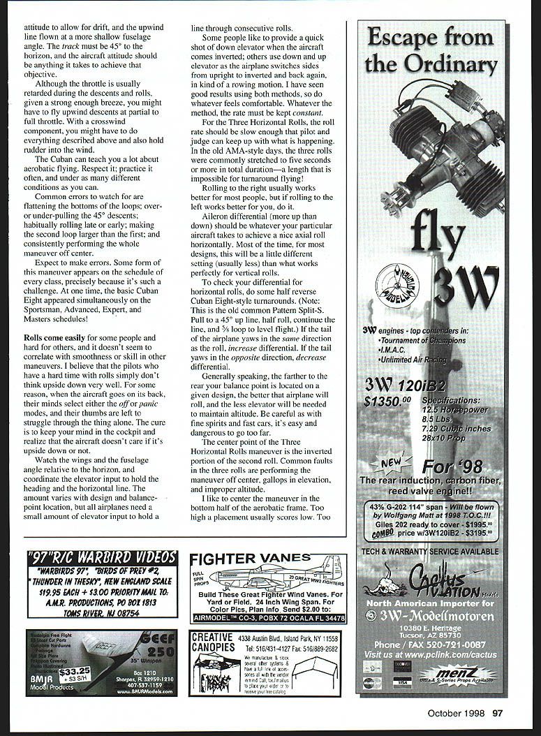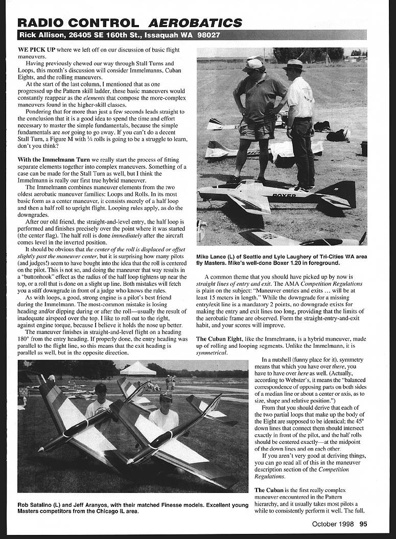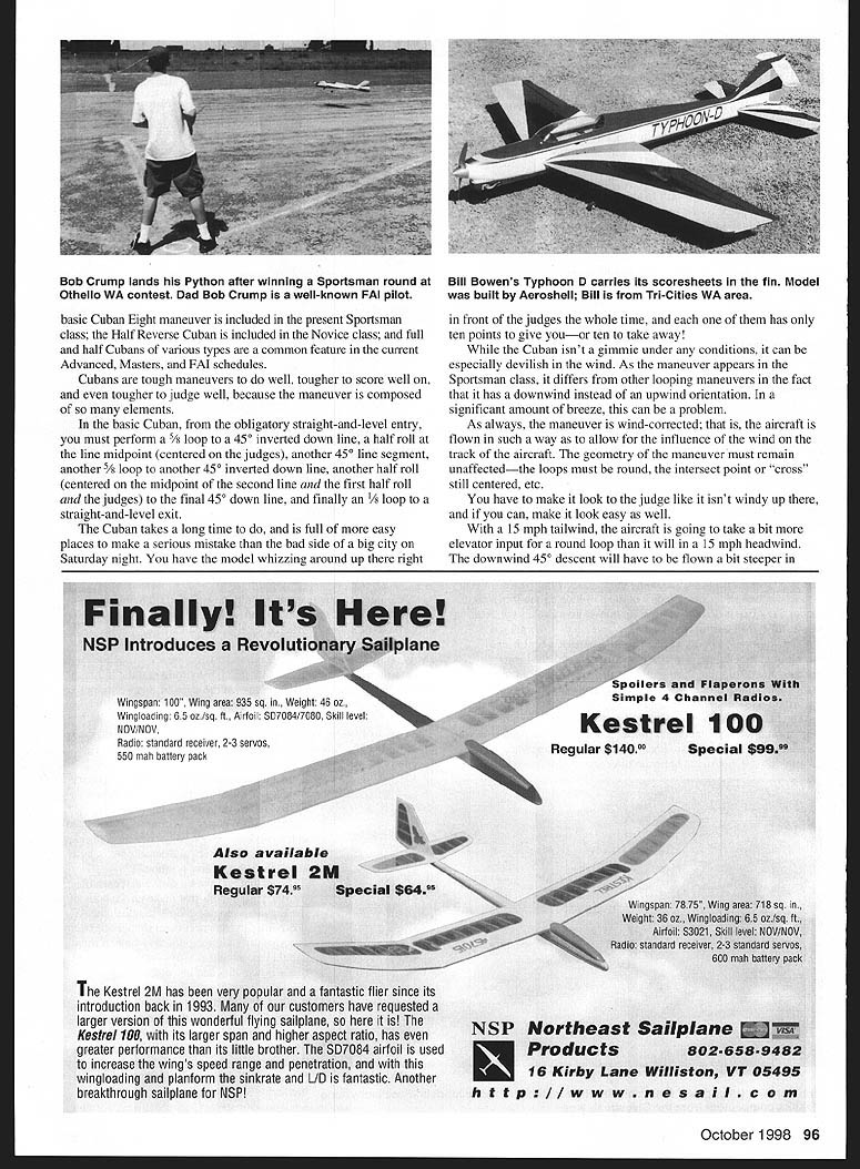 RADIO CONTROL AEROBATICS U 4 ra SIll LT&IiWJ7T iiizwzi fl i7II SI LtThI kl WE PICK UP left off discussion basic flight maneuvers Having previously chewed way through Stall Turns Loops months discussion will consider Jmmelmanns Cuban Eights rolling maneuvers stan last column mentioned progressed up Pattern skill ladder basic maneuvers would constantly reappear elements compose more-complex maneuvers found higher-skill classes Pondering just few seconds leads straight conclusion good idea spend time effort necessary master simple fundamentals because simple fundamentals going go away cant decent Stall Turn Figure M s going struggle learn dont think Immelmana Turn really stan process fitting separate elements together complex maneuvers Something case can made Stall Turn well think Immelmann really first true hybrid maneuver Immelmann combines maneuver elements two oldest aerobatic maneuver families Loops Rolls its basic form center maneuver consists merely half loop half roll upright flight Looping rules apply downgrades After old friend straight-and-level entry half loop performed finishes precisely over point started center flag half roll done immediately after aircraft comes level inverted position should obvious center roll displaced offset slightly past maneuver center surprising pilots judges seem have bought idea roll centered pilot doing maneuver way results buttonhook effect radius half loop tightens up near top roll done slight up line Both mistakes will fetch stiff downgrade front judge knows rules As loops good strong engine pilots best friend during Immelmann most-common mistake losing heading andlor dipping during after rollusually result inadequate airspeed over top like roll out right against engine torque because believe holds nose up better maneuver finishes straight-and-level flight heading 1800 entry heading properly done entry heading parallel flight line means exit heading parallel well opposite direction common theme should have picked up now straight lines entry exit AMA Competition Regulations plain subject Maneuver entries exits . will least 15 meters length downgrade missing entrylexit line mandatory 2 points no downgrade exists making entry exit lines too long providing limits aerobatic frame observed Form straight-entry-and-exit habit scores will improve Cuban Eight like Immelmann hybrid maneuver made up rolling looping segments Unlike Immelmann symmetrical nutshell funny place symmetry means have over have have over well Actually according Websters means balanced correspondence opposing pans both sides median line about center axis size shape relative position should derive two partial loops make up body Eight supposed identical 450 down lines connect should intersect exactly front pilot half rolls should centered exactlyat midpoint down lines other arent very good deriving things can go read maneuver description section Competition Regulations Cuban first really complex maneuver encountered Pattern hierarchy usually takes pilots consistently perform well full October1998 95 Mike Lance L Seattle Lyle Laughery Tn-Cities WA area fly Masters Mikes well-done Boxer 120 foreground Rob Satalino L Jeff Aranyos matched Finesse models Excellent young Masters competitors Chicago IL area basic Cuban Eight maneuver included present Sportsman class Half Reverse Cuban included Novice class full half Cubans various types common feature current Advanced Masters FAI schedules Cubans tough maneuvers well tougher score well tougher judge well because maneuver composed elements basic Cuban obligatory straight-and-level entry must perform 5/ loop 450 inverted down line half roll line midpoint centered judges another 450 line segment another /v loop another 450 inverted down line another half roll centered midpoint second line first half roll judges final 450 down line finally 1/8 loop straight-and-level exit Cuban takes long time full easy places make serious mistake bad side big city Saturday night have model whizzing around up right front judges whole time has ten points give youor ten take away Cuban isnt gimmie under conditions can especially devilish wind As maneuver appears Sportsman class differs other looping maneuvers fact has downwind instead upwind orientation significant amount breeze can problem As always maneuver wind-corrected aircraft flown such way allow influence wind track aircraft geometry maneuver must remain unaffectedthe loops must round intersect point cross still centered etc have make look judge like isnt windy up can make look easy well 15 mph tailwind aircraft going take bit elevator input round loop will 15 mph headwind downwind 450 descent will have flown bit steeper Kestrel 2M has very popular fantasi since its introduction back 1993 customers have requested larger version wonderful flying sailplane Kestrel 100 its larger span higher aspect ratio has greater performance its little brother SD7084 airfoil used increase wings speed range penetration wingloading planform sinkrate L/D fantastic Another breakthrough sailplane NSP October 1998 96 Bob Crump lands Python after winning Sportsman round Bill Bowens Typhoon D carries its scoresheets fin Model Othello WA contest Dad Bob Crump well-known FAI pilot built Aeroshell Bill Tn-Cities WA area Wingspan 100935 sq weight 46 oz Wingloading 65 ozisq Airfoil 507084/7080 Skill level NOV/N Radio standard receiver 2-3 servos 550 mah battery pack P Northeast Products 16 Kirby Lane Willis h t t p 11w w w aiR c attitude allow drift upwind line flown shallow fuselage angle track must 450 horizon aircraft attitude should anything takes achieve objective Although throttle usually retarded during descents rolls given strong enough breeze might have fly upwind descents partial full throttle crosswind component might have everything described above also hold rudder wind Cuban can teach lot about aerobatic flying Respect practice often under different conditions can Common errors watch flattening bottoms loops overor under-pu