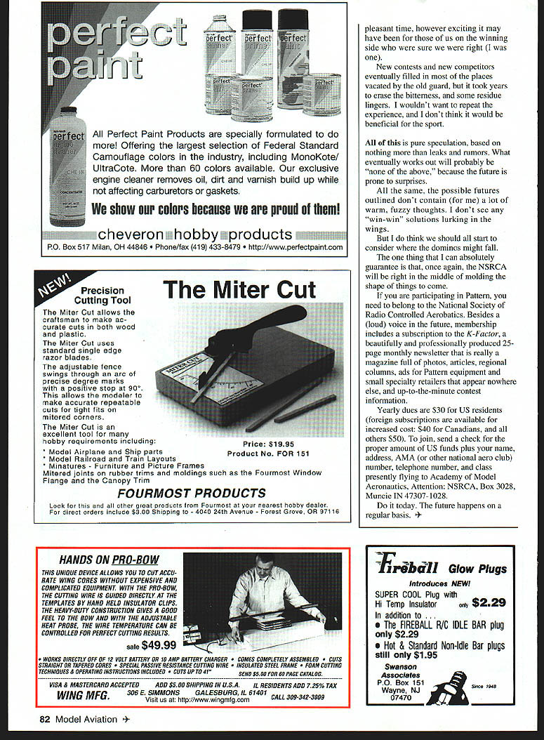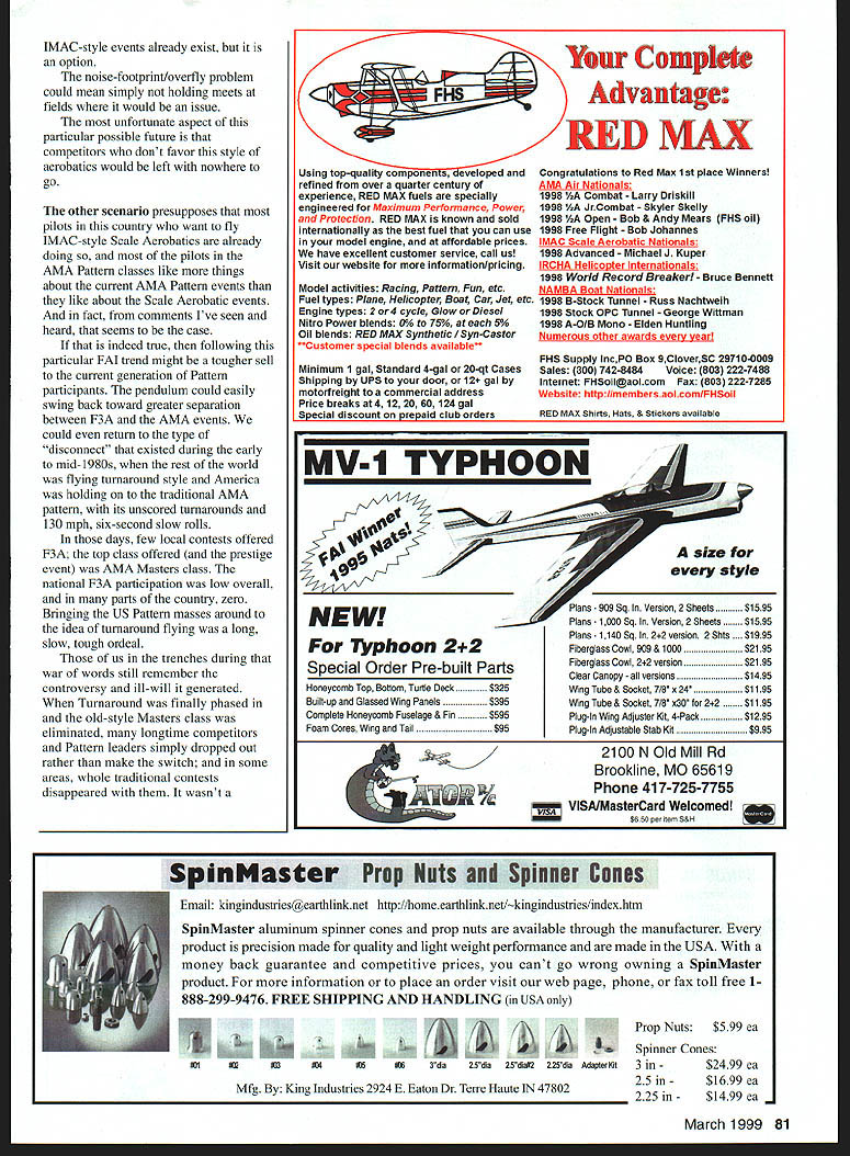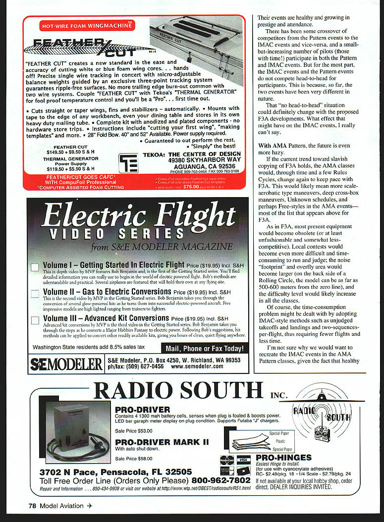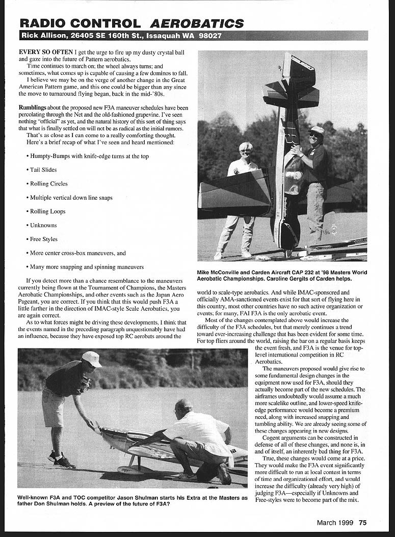 RADIO CONTROL AEROBATICS IT Wiii EVERY SO OFTEN get urge fire up dusty crystal ball gaze future Pattern aerobatics Time continues march wheel always turns sometimes what comes up capable causing few dominos fall believe may verge another change Great American Pattern game could bigger since move turnaround flying began back mid- 80s Rumblings about proposed new F3A maneuver schedules have percolating through Net old-fashioned grapevine Ive seen nothing official yet natural history sort thing says what finally settled will radical initial rumors Thats close can come really comforting thought Heres brief recap what Ive seen heard mentioned Humpty-Bumps knife-edge turns top Tail Slides Rolling Circles Multiple vertical down line snaps Rolling Loops Unknowns Free Styles center cross-box maneuvers snapping spinning maneuvers detect chance resemblance maneuvers currently being flown Tournament Champions Masters Aerobatic Championships other events such Japan Aero Pageant correct think would push F3A little farther direction IMAC-style Scale Aerobatics again correct As what forces might driving developments think events named preceding paragraph unquestionably have influence because have exposed top RC aerobats around world scale-type aerobatics IMAC-sponsored officially AMA-sanctioned events exist sort flying country other countries have no such active organization events FAI F3A aerobatic event Most changes contemplated above would increase difficulty F3A schedules merely continues trend toward ever-increasing challenge has evident some time top fliers around world raising bar regular basis keeps event fresh F3A venue toplevel international competition RC Aerobatics maneuvers proposed would give rise some fundamental design changes equipment now used F3A should actually become part new schedules airframes undoubtedly would assume much scalelike outline lower-speed knifeedge performance would become premium need along increased snapping tumbling ability already seeing some changes appearing new designs Cogent arguments can constructed defense of changes itself inherently bad thing F3A True changes would come price would make F3A event significantly difficult run local contest terms time organizational effort would increase difficulty already very high judging F3Aespecially Unknowns Free-styles become part mix March 1999 75 Mike McConville Carden Aircraft CAP 232 98 Masters World Aerobatic Championships Caroline Gergits Carden helps Well-known F3A TOC competitor Jason Shulman starts Extra Masters father Don Shulman holds preview future F3A Some less-skilled less-committed F3A competitors might prompted leave event some prospective newcomers now competing Masters class might hesitate longer before making jump F3Aor might jump some pilots might leave event simply because fundamental dislike maneuver schedules would place increased premium ability perform rapid violent autorotative maneuvers decreasing traditional rewards smoothness grace plus side ledger could raise fun interest quotient very topechelon F3A pilots around world might increase spectator appeal F3A New pilots favor type aerobatic flying might attracted other events face value looks like wash F3A win some lose some what other Pattern IMAC events country What happens Predicting future AMA Pattern IMAC-style events tougher call Any several scenarios could play out Pattern have spent last decade trying reduce distance between AMA FAT events terms equipment requirements judging criteria National Society Radio Controlled Aerobatics NSRCA AMA Special Interest Group Pattern aerobatics through membership surveys other activities NSRCA has taken leadership role narrowing gap Since mid- 1 980s NSRCA members have consistently voted follow FAI lead shaping nature AMA Pattern events F3A has definitely become prestige Pattern event country top F3A pilots country looked up styles copied equipment choices imitated F3A pilots design models used other classes AMA equipment rules have revised keep pace changes FAI rules F3A-style maneuvers consistently find way down upper-level AMA classes FAI-style finals now flown AMA Nats AMA classes short rule has F3A goes goes AMA has way long enough become habit might hard break International Miniature Aerobatic Club IMAC Scale Aerobatics have grown rapidly during last 10 years IMAC rapidly growing AMA Special Interest Groups top pilots have improving both skill respect level around country 76 Model Aviation ces Christophe Paysant La Roux performs law-level free-style 97 TOC FEATHER CUT creates new standard ease ana accuracy cutting white blue foam wing cores ds off Precise single wire tracking concert micro-adjustable balance weights guided exclusive three-point tracking system guarantees ripple-free surfaces No trailing edge burn-out common two wire systems Couple FEATHER CUT Tekoas THERMAL GENERATOR fool proof temperature control youll Pro. first time out Cuts straight taper wings fins stabilizers matically ts tape edge workbench dining table stores its own heavy duty mailing tube lete kit anodized plated components no hardware store trips Instructions include cutting first wing making templates 28 Fold Bow 40 52 Available Power supply required Guaranteed out perform rest Simply bestl TEKOA THE CENTER OF DESIGN 49380 SKYHARBOR WAY AElIA& CA FEATHER CUT $14950 S & H THERMAL GENERATOR Power Supply $11950 S & H w Volume II Electric Conversions Price $1995 mci S&H second video MVP Getting Started series Bob Benjamin takes through conversion seseral glow-powered kits turns successful electric-powered aircraft Five impressive models high lighted ranging trainers fighters 7 Volume Ill nced Kit Conversions Price $1995 mci S&H Advanced kit consersions MVP ird video Getting Started series Bob Benjamin takes through steps converts Major Hobbies Fantasy electric power Following Bobs suggestions methods can applied convert other readily available kits giving hours clean quiet flying anywhere Washinglon State residents add 