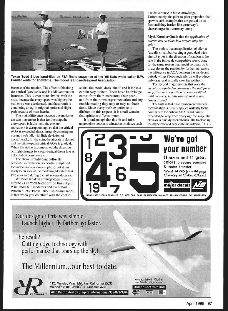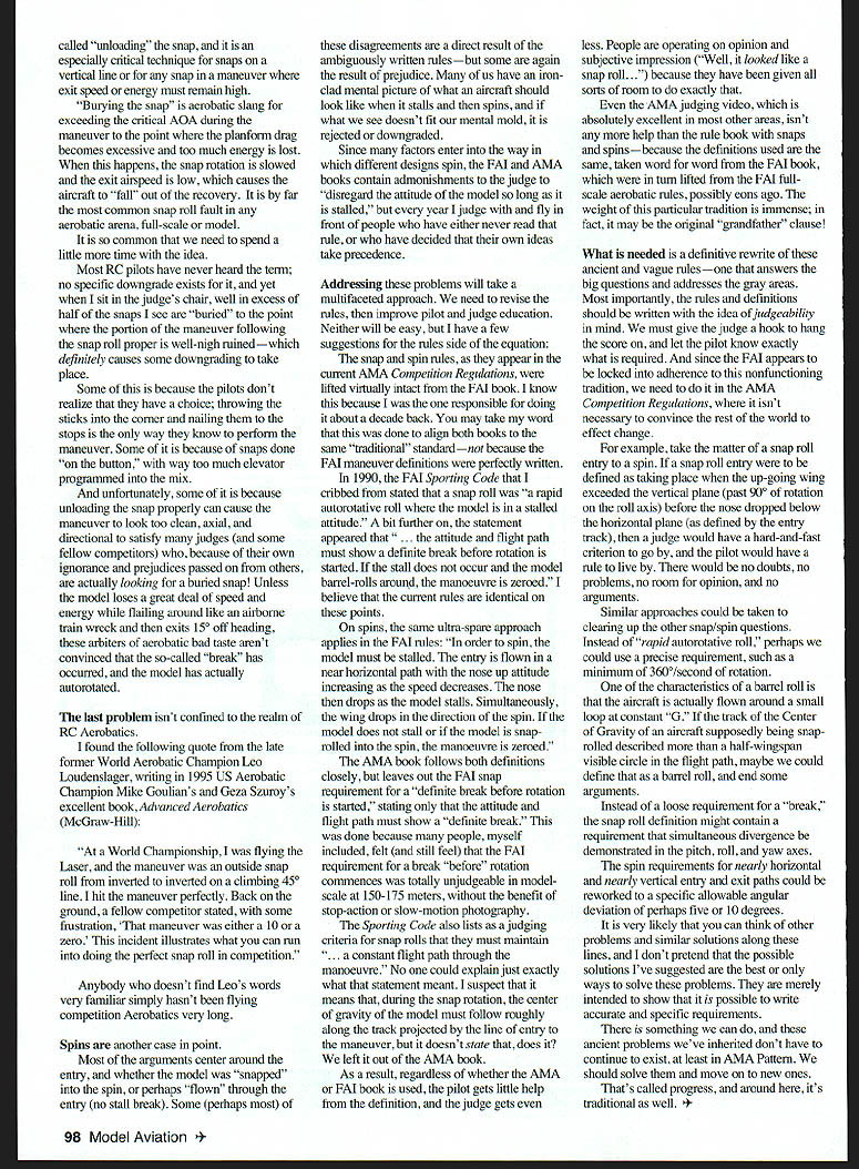 RADIO CONTROL AEROBATICS IF WERE TO pick ten pilots judges average Aerobatics contest ask what single maneuver family generates argument controversy sport am certain least nine would answer hesitating snap rolls tenth would say spins mostly same maneuvers done slightly different way Im willing bet ten answers would announced forcefully accompanied jutting jawlines full eyecontact unspoken invitation disagree peril almost religious aura attached peoples opinions matters aerobatic comes snaps spins aura changes fervor socalled opinions incontrovertible fact nine ten would name same maneuver would seem indicate least minor amount agreement subject fact what minor amount problem nine might say snap rolls nine might have rock-hard opinions exactly what good snap roll should nine opinions will different fact chances finding identical opinions subject average gathering Aerobatics cognoscenti slightly less chances hitting lottery surviving airliner crash same day some reasons Pattern structured individual pursuit pilot judges attracts people like think themselves rise fall own merits compete Generally speaking sort people reach agreement easily modify cherished beliefs simply avoid confrontation another age would have referred rugged individualists prefer simply pigheaded insert noun choices FAI AMA rule books describe execution snaps rolls spins general ambiguous terms judging criteria provided extraordinarily subjective nature Room has left honest opinions conflict great deal predictably have done lessthan-admirable job rule-writing AMA FAI levels emotion point heated because isnt trivial matter Contests won lost application conflicting opinions Few us possess nobility lose well cannot agree judges interpretation rulesespecially interpretation leads directly zero high K maneuver ruined round same token few judges possess forbearance tolerate competitors heated protest score know right whether disagreement directed properly contest management Fixing such wide-spread problem isnt easy would have accomplished long time ago same fixing worthwhile goal aim friendly competition should maximum fun minimum fuss Nowadays people have great deal choice spend leisure time Angry Aerobatics competitors judges often choose participate future events absence diminishes sport doesnt mean must fix little flaw set Pattern bone contention fortunate because isnt possible Disagreement will always us see paragraph above average Pattern competitors personality profile would vanilla-bean world everyone always same page However single snap/spin flash point responsible such high percentage most-destructive bickering makes very little sense continue ignoring hopes some magical means agreement will eventually emerge easiest way fix whole mess would simply ban snaps spins isnt option whole roomful reasons boil down would cop out Snaps spins legitimate aerobatic maneuvers belong Pattern competition Before get possible fixes need take look what makes controversial maneuvers tick since maneuvers werent invented RC modelers should go source full-scale aerobatics basic horizontal inside snap roll really spin done level flight Autorotation induced difference drag lift between in-snap in-spin wing inside rotation out-snap out-spin outside rotation wing start horizontal snap upright spin aircraft pitched up until critical AOA angle attack exceeded whereupon hard rudder applied desired direction rotation resulting yaw decelerates inside wing accelerates outside wing slowing inside wing produces less lift yes some lift still exists past critical AGA accelerating outside wing produces thus producing autorotation roll component along longitudinal roll axis As autorotation starts inside wing AOA increases thus produces drag outside wing AOA decreases produces less drag because shift relative wind airflow wing sees 96 Model Aviation f Combs Integra design 1998 Nats Fixed gear two-meter scalelike design follows new F3A trends Geoff Pickerington Ohio F3A competitor Don Szczur Chantilly VA relaxes Dr Jekyll 1998 Nats wide variance basic knowledge Unfortunately pilot-to-pilot grapevine also spawns various myths passed fact until harden like yesterdays cheeseburger coronary artery Myth Number application aileron has no place proper snap spin truth application alleron usually small varying good deal aircraft type direction rotation rule full-scale competitive arena done same reason model aerobats accelerate rotation further increasing difference AOA between inside Texan Todd Blase hand-flies F3A finals sequence 98 Nats caller BWoutside wings Too much aileron will produce Ponder waits shawtime model Blase-designed Associationonly drag actually slow rotation second major myth once elevator applied commence stall snap control position never modtfied until recovery lest aircraft unstall barrel around truth once rotation commences forward stick usually applied instantly point critical AOA just barely exceeded keep burying snap elevator quickly backed out little clean up maneuver accelerate rotation because rotation effect felt along vertical yaw axis additive rotation increases obvious snap because entry speed higher stall entry accelerated aircraft continuing along its original horizontal flight path because mass inertia main difference between entries two maneuvers snap entry speed higher elevator movement abrupt enough critical AOA exceeded almost instantly causing accelerated stall little deviation aircraft track spin aircraft slowed pitch-up past critical AOA gradual stall accomplished direction flight changes near-vertical down line autorotation commences above fairly basic full-scale aerobatic information somewhat simplified understandable consumption has rarely seen modeling literature Ive reviewed during last several decades have what anthropologist would refer oral tradition subject What RC modelers Pattern pilots know about spins snaps control sticks model does looks certain way basic knowledge comes instructors peers own experimentation