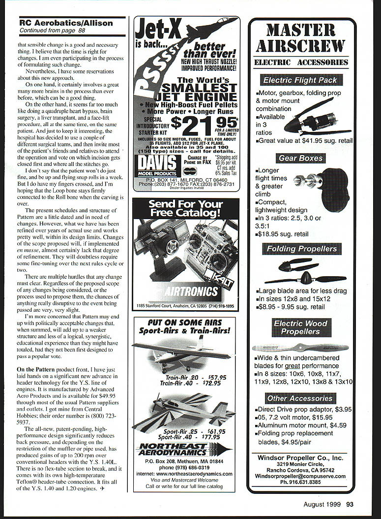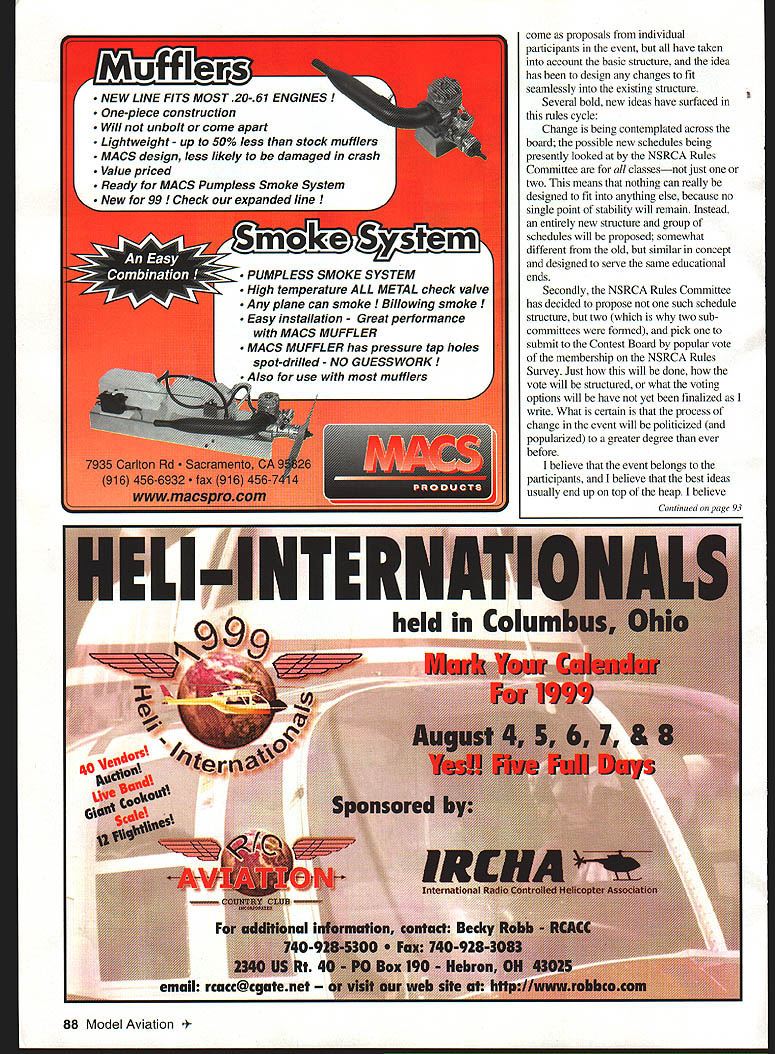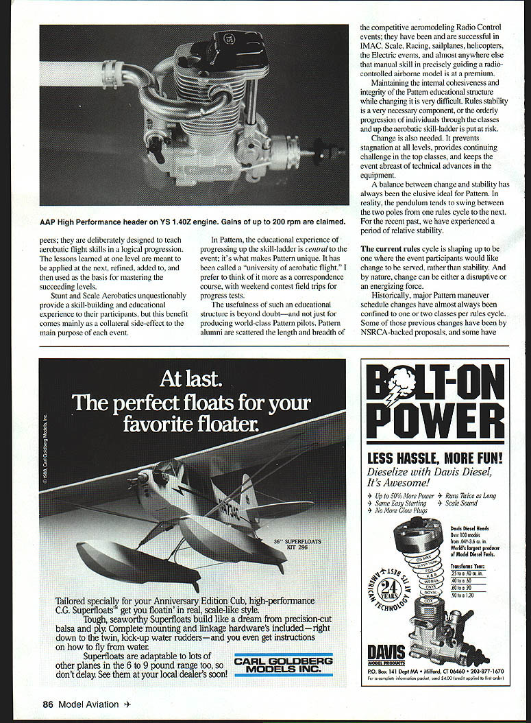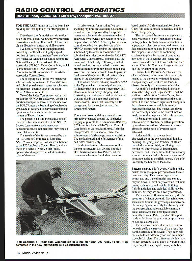 RADIO CONTROL AEROBATICS U i L-1 — E IL-t4T1i1 U' FOR THE PAST month Ive busy building testing things other people fly items arent model aircraft dont sit front porch waiting favorite trinket-truck drop off couple nice big cardboard containers like see Ive serving nonglamorous nonvoting unofficial highly unpaid position creative consultant two maneuver schedule subcommittees National Society Radio Controlled Aerobatics NSRCA Rules Committee traditionally AMA Advisory Committee RC Aerobatics AMA RC Aerobatics Contest Board sole purpose two maneuver schedule subcommittees formulate test submit possible new maneuver schedules Pattern classes main NSRCA Rules Committee Rules Committees tasks put out NSRCA Rules Survey questionnaire/poll sent members NSRCA near beginning rules cycle designed harvest membership opinions votes comments current matters Pattern import present plan include two sets possible new schedules NSRCA Survey set maneuver subcommittee members may vote relative merits results Survey used NSRCA Rules Committee formulate NSRCA rules proposals submitted RC Aerobatics Contest Board series votes either finally approved disapproved additions rules event other words anything Ive spending time actually adopted would have approved specific maneuver schedule subcommittee contribute services would have placed NSCRA Survey main committee win competitive vote NSRCA membership against schedules submitted other subcommittee submitted rules proposal AMA RC Aerobatics Contest Board pass initial vote body following would need survive period crossproposals modify may submitted voted done would have pass final vote Contest Board before being placed Competition Regulations whole process takes up entire AMA Rules Cycle currently three years Its longer elephants pregnancy times can messy slippery frustrating convincing muddy pig wants ride pickup truck during thunderstorm merely little background subject hand structure Pattern three modeling events primarily organized around subjective judging pilot skill RC Aerobatics Pattern RC Scale Aerobatics IMAC Control Line Precision Aerobatics Stunt similar idea provides basis three achievement airborne geometric precision methods used furtherance end differ considerably Scale Aerobatics event like Pattern structure divided skillclassification classes like Pattern maneuver schedules classes based IAC International Aerobatic Club full-scale aerobatic schedules like change yearly purpose event replicate closely possible maximum possible prototype fidelity full-scale aerobatics appearance rules procedures maneuvers Scale models must used competition emphasis provide continuing challenge pilots means continuing alteration schedules maneuvers flown Freestyles Unknown schedules part mix Constant change designed structure event Control Line Precision Aerobatics oldest modeling aerobatic events loaded gunwales tradition changes very slowly four skill classes two maneuver schedules simplified abbreviated schedule serves entry-level Beginner class traditional AMA Stunt pattern yes thats term came serves other three time between significant changes main maneuver schedule usually measured decades maneuvers flown necessarily unique control method used seldom replicate full-scale practice Stunt emphasis achievement absolute balletlike perfection continued repetition Movement between classes basis average score achieved Rules stability has always characteristic event traditionally building designing technical skills regarded almost highly piloting skills top three classes Intermediate Advanced Expert skills admired rewarded bonus appearance points added flight scores pilot actually builder model Pattern pure pilots event Nothing really counts model/pilot performance air contest day no appearance points type model scale may flown subject certain technical limits such size weight Building finishing design technical skills may admired directly rewarded maneuvers flown mirror nearly full spectrum what currently flown fullscale arena minus gyroscopic maneuvers plus figures currently feasible power/weight ratios available modelscale Unknowns Freestyles currently flown Pattern no attempt made duplicate practices appearance full-scale aerobatics maneuver schedules used Pattern guide structure event structure event interlock tailored differently unique skill class different schedules just provided pilots varying skills may compete equal footing 84 Model Aviation Cochrun Redmond Washington gets Meridian 900 ready go Rick competes new Intermediate old Sportsman class peers deliberately designed teach aerobatic flight skills logical progression lessons learned level meant applied next refined added used basis mastering succeeding levels Stunt Scale Aerobatics unquestionably provide skill-building educational experience participants benefit comes mainly collateral side-effect main purpose event Pattern educational experience progressing up skill-ladder central event its what makes Pattern unique has called university aerobatic flight prefer think correspondence course weekend contest field trips progress tests usefulness such educational structure beyond doubtand just producing world-class Pattern pilots Pattern alumni scattered length breadth competitive aeromodeling Radio Control events have successful IMAC Scale Racing sailplanes helicopters Electric events almost anywhere else manual skill precisely guiding radiocontrolled airborne model premium Maintaining internal cohesiveness integrity Pattern educational structure changing very difficult Rules stability very necessary component orderly progression individuals through classes up aerobatic skill-ladder put risk Change also needed prevents stagnation levels provides continuing challenge top classes keeps event abreast technical advances equipment balance between change stability has always elusive ideal Pattern reality pendulum tends swing between two poles rules cycle next recent past have experienced period relative stabili
