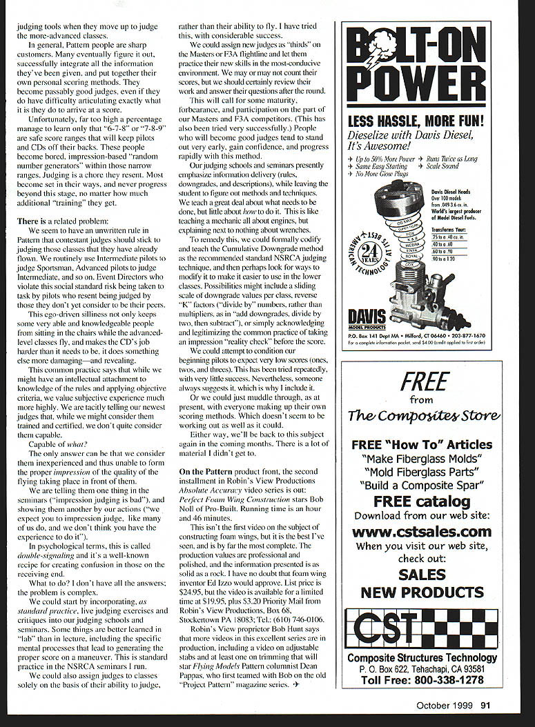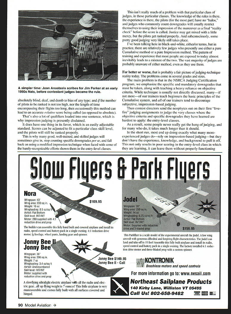 RADIO CONTROL AEROBATICS IF WERE INTO college course titles month would come billed Downgrading 101 An Introduction Modern Pattern Judging Techniques most-common judging technique use skilled judges today simple system might called Cumulative Downgrade Method least Im going call discussion purposes judge observes downgrades occur assigning numerical value numbers downgrades added together maneuver continues end tbe maneuver quick subtraction base 10 yields score passed scribe recorded judge may simply remember numbers physically count fingers toes well day warm maneuver bad enough require use additional digits very good system number reasons chief requires judge use objective standard difficult vary pilot pilot Lack entry line always two points off pendulum movement after stall turn point off 150 error maneuver geometry point off forth Cumulative method conjunction standard downgrades listed Judges Guide maneuver family maneuvers also tends focus judges attention points maneuver big ticket mistakes likely occur radii lines angles rotations An excellent side benefit Cumulative system method work specific downgrades listed rules must known judge point automatically recalled conscious effort excellent idea case train train retrain show AMA Judging Flying Precision RCAerobarics video until peoples eyes glaze over No system perfect consensus Cumulative method best technique presently have does have significant weak point fairly inflexible absolutist approach works best applied more-advanced classes flying polished accomplished example excellent relatively easy system employ judging F3A Team Selection Tournament However can become small field identical technique standard rigidly applied Sportsman class local event latter circumstances major downgrades sometimes arrive rapidly available fingers toes used up mid-maneuver poor pilot ends up owing points judge can unfortunate because pilots may become discouraged point decline participate future events brave honest upright judge dispensed totally accurate scores may find social standing compromised will hold such minor considerations shouldnt allowed sully aerobatic ideal real world real world people want temper justice bit mercy Cumulative Downgrade system can difficultwhich brings main alternative Before Cumulative method started gaining popularity most-common judging technique something might call Impression systemwhich really wasnt system judge would simply observe maneuver apply knowledge rules downgrades experience might might possess arrive score score would based predominately subjective comparative impression maneuver quality hence name Impression method held little regard days reasons bard understand very subjective method scoring subjective methods much prone influence judges internal bias whether based flying style equipment friendship pilot reputation whatever depends heavily judges personal experience expense objective criteria does particularly emphasize nor usually employ extensive current knowledge rules downgrades relative system difficult maintain standard over time pilots flying first round contest routinely suffer scoring drifts higher later flights However no system perfect no system utterly redeeming value judge has wide complete current knowledge rules judge has extensive recent experience f judge October 1999 89 Big Time Judges mid-i 990s Tournament Champions focused sky task picking winner Judging methods discussed text Contestant judge Neil Udell checks 600 top box Othello Washington meet absolutely blind deaf dumb bias type number pilots ranked too high nor length time encompassing flights too long occasionally method can lead accurate relative score being called opposed absolute Thats also lot qualifiers loaded sentence impression judging presently disdained does have thing its favor easily adjustable standard Scores can adjusted fit particular class skill level pilots will still ranked properly good well-trained skilled judges will sometimes give stop counting specific downgrades per se fall back using modified impression technique faced some barely-recognizable efforts shown entry-level classes isnt really much problem particular class judges particular classes knowledge rules experience pilots part have no halos judges commonly count downgrades will usually restrict themselves using impression maneuver final reality check before score called Justice may get mixed little mercy pilots get ranked properly subconsciously some pretty good judging very likely still takes place Ive talking black-and-white eitherlor terms practice relatively few judges presently use either pure Cumulative method pure Impression method pattern training experience people exposed today almost inevitably leads mixture two vast majority judges probably unaware either method use better worse probably fair picture judging-technique reality today problems come several grades sizes main problem NSRCA Judging Certification program emphasize specific mandatory downgrades must taken along teaching heavy reliance objective criteria technique usually directly discussed manyif mostof trainers teach beginners basic principles Cumulative system trainers tend discourage subjective impression-based judging contest directors send neophytes out first live fire judging assignments judge very classes objective criteria specific downgrades have learned hardest apply entry-level classes As result some people never really get hang ofjudging takes much longer should short run end up doing exactly what moreexperienced judges dorely impression-based judgingbut dont have experience knowledge background pull off results poor scoring entry-level class learning can leave properly functioning Blow rs Nora Wingspan 43 Wing area 233 sq $10995 Weight 16 oz Wingloading 85 ozlsq ft Airfoil Flat Bottom Skill level INT/INT Motor280suppliedwith4 reduction drive prop builder can assemble fully hand buitt covered airplane install its radio speed control battery pack single evening 41