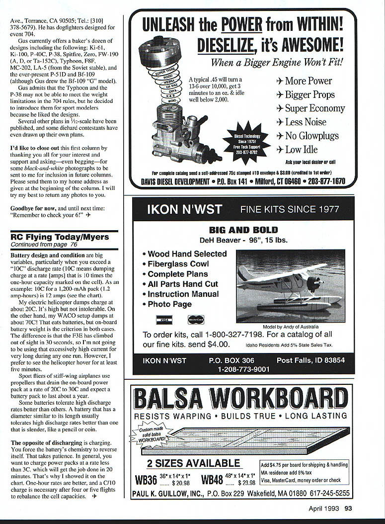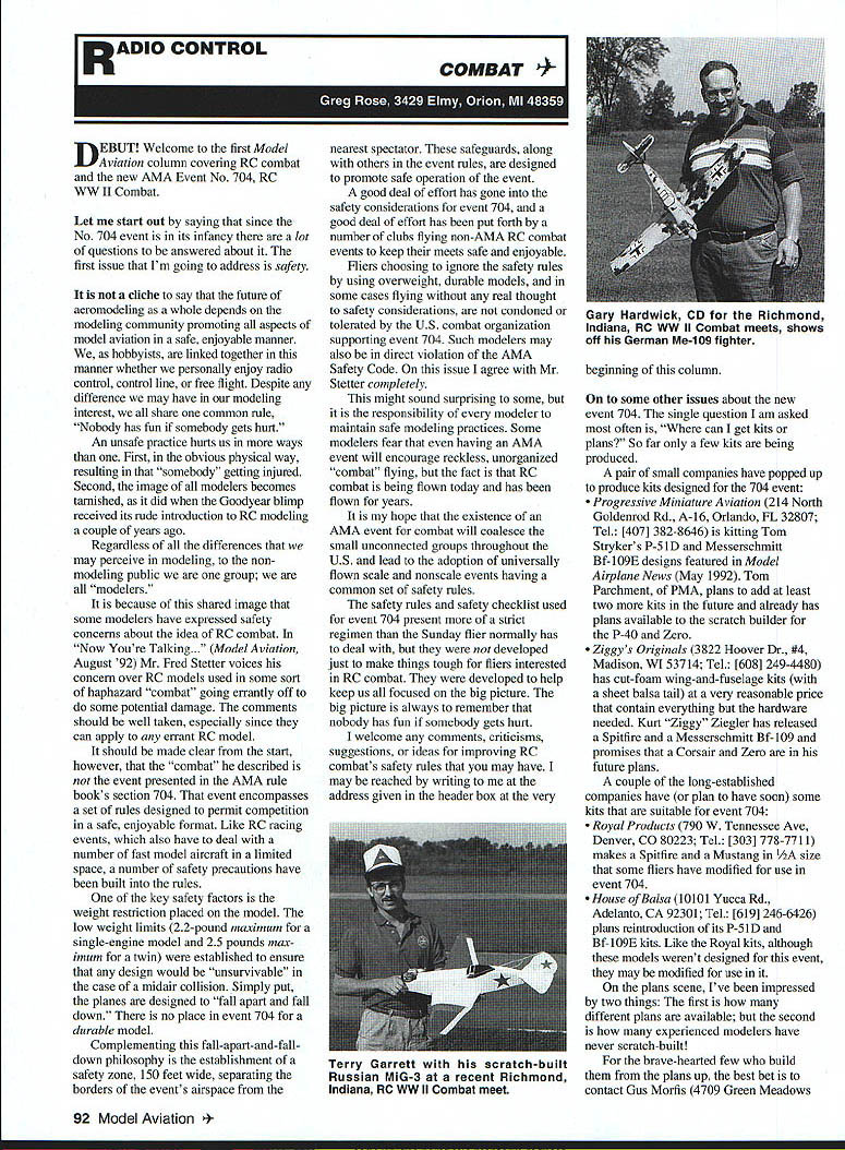 I R ADIOCONTROL DEBUT Welcome first Model Aviation column covering RC combat new AMA Event No 704 RC WW II Combat Let start out saying since No 704 event its infancy lot questions answered about first issue Im going address safety cliche say future aeromodeling whole depends modeling community promoting aspects model aviation safe enjoyable manner hobbyists linked together manner whether personally enjoy radio control control line free flight Despite difference may have modeling interest share common rule Nobody has fun somebody gets hurt An unsafe practice hurts us ways First obvious physical way resulting somebody getting injured Second image modelers becomes tarnished did Goodyear blimp received its rude introduction RC modeling couple years ago Regardless differences may perceive modeling nonmodeling public group modelers because shared image some modelers have expressed safety concerns about idea RC combat Now Youre Talking. Model Aviation August 92 Mr Fred Stetter voices concern over RC models used some sort haphazard combat going errantly off some potential damage comments should well taken especially since can apply errant RC model should made clear start however combat described event presented AMA rule books section 704 event encompasses set rules designed permit competition safe enjoyable format Like RC racing events also have deal number fast model aircraft limited space number safety precautions have built rules key safety factors weight restriction placed model low weight limits 22-pound maximum single-engine model 25 pounds max imum twin established ensure design would unsurvivable case midair collision Simply put planes designed fall apart fall down no place event 704 durable model Complementing fall-apart-and-falldown philosophy establishment safety zone 150 feet wide separating borders events airspace COMBAT est spectator safeguards along others event rules designed promote safe operation event good deal effort has gone safety considerations event 704 good deal effort has put forth number clubs flying non-AMA RC combat events keep meets safe enjoyable Fliers choosing ignore safety rules using overweight durable models some cases flying real thought safety considerations condoned tolerated US combat organization supporting event 704 Such modelers may also direct violation AMA Safety Code issue agree Mr Stetter completely might sound surprising some responsibility modeler malntain safe modeling practices Some modelers fear having AMA event will encourage reckless unorganized combat flying fact RC combat being flown today has flown years hope existence AMA event combat will coalesce small unconnected groups throughout US lead adoption universally flown scale nonscale events having common set safety rules safety rules safety checklist used event 704 present strict regimen Sunday flier normally has deal developed just make things tough fliers interested RC combat developed help keep us focused big picture big picture always remember nobody has fun somebody gets hurt welcome comments criticisms suggestions ideas improving RC combats safety rules may have may reached writing address given header box very beginning column some other issues about new event 704 single question am asked often can get kits plans So far few kits being produced pair small companies have popped up produce kits designed 704 event Progressive Miniature Aviation 214 North Goldenrod Rd A-16 Orlando FL 32807 Tel [407] 382-8646 kitting Tom Strykers P-S lD Messerschmitt Bf-109E designs featured Model Airplane News May 1992 Tom Parchment PMA plans add least two kits future already has plans available scratch builder P-40 Zero Ziggys Originals 3822 Hoover Dr #4 Madison WI 53714 Tel [608] 249-4480 has cut-foam wing-and-fuselage kits sheet balsa tail very reasonable price contain everything hardware needed Kurt Ziggy Ziegler has released Spitfire Messerschmitt Bf-109 promises Corsair Zero future plans couple long-established companies have plan have soon some kits suitable event 704 Royal Products 790 W Tennessee Aye Denver CO 80223 Tel [303] 778-7711 makes Spitfire Mustang /2A size some fliers have modified use event 704 House Balsa 10101 Yucca Rd Adelanto CA 92301 Tel [619] 246-6426 plans reintroduction its P-S lD Bf-109E kits Like Royal kits although models werent designed event may modified use plans scene Ive impressed two things first different plans available second experienced modelers have never scratch-built brave-hearted few build plans up best bet contact Gus Morfis 4709 Green Meadows 92 Model Aviation Hardwick CD Richmond Indiana RC WW II Combat meets shows oft German Me-i 09 fighter Terry Garrett scratch-built Russian MiG-3 recent Richmond Indiana RC WW II Combat meet Ave Torrance CA 90505 Tel [310] 378-5679 has dogfighters designed event 704 Gus currently offers bakers dozen designs including following Ki-61 Ki-100 P-40C P-38 Spitfire Zero FW-190 D Ta-152C Typhoon F8F MC-202 LA-S Soviet stable ever-present P-51D Bf-109 although Gus drew Bf-109 G model Gus admits Typhoon P-38 may able meet weight limitations 704 rules decided introduce sport modelers because liked designs Several other plans 1A2-scale have published some diehard contestants have drawn up own plans Id like close out first column thanking interest support askingeven beggingfor some black-and-white photographs sent inclusion future columns Please send home address given beginning column will try best return photos Goodbye now until next time Remember check 6 lying TodaylMyors Continued page 76 Battery design condition big variables particularly exceed bC discharge rate lOC means dumping charge rate [amps] 10 times one-hour capacity marked cell As example lOC l200-mAh pack 12 amp-hours 12 amps see chart electric helicopter dumps charge about 20C Its high intolerable other hand WACO setup dumps about 70C eats batteries on-board battery weight criterion both cases difference F3E has climbed out sight 30 seconds Im going using excessively