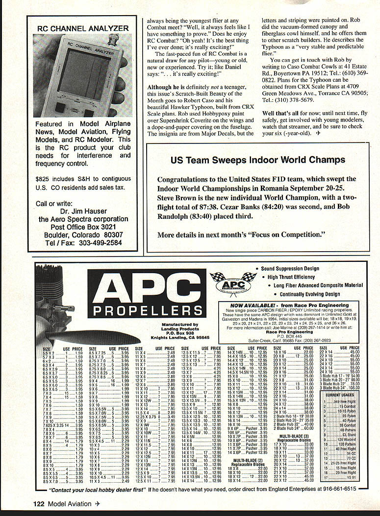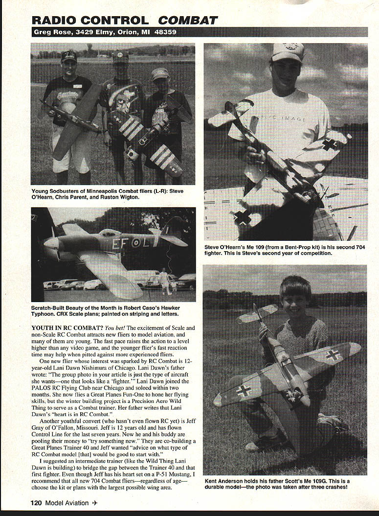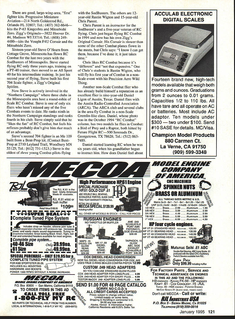 RADIO CONTROL COMBAT kc1i-T. YOUTH IN RC COMBAT bet excitement Scale non-Scale RC Combat attracts new fliers model aviation young fast pace raises action level higher video game younger fliers fast reaction time may help pitted against experienced fliers new flier interest sparked RC Combat 12year-old Lani Dawn Nishimura Chicago Lani Dawns father wrote group photo article just type aircraft wantsone looks like fighter Lani Dawn joined PALOS RC Flying Club near Chicago soloed within two months now flies Great Planes Fun-One hone flying skills winter building project Precision Aero Wild Thing serve Combat trainer father writes Lani Dawns heart RC Combat Another youthful convert hasnt flown RC yet Jeff Gray OFallon Missouri Jeff 12 years old has flown Control Line last seven years Now buddy pooling money try something new co-building Great Planes Trainer 40 Jeff wanted advice what type RC Combat model [that] would good start suggested intermediate trainer like Wild Thing Lani Dawn building bridge gap between Trainer 40 first fighter though Jeff has heart set P-5 Mustang recommend new 704 Combat fliersregardless age choose kit plans largest possible wing area 120 Model Aviation g Sodbusters Minneapolis Combat fliers L-R Steve OHearn Chris Parent Ruston Wigton Steve OHearns 109 Bent-Prop kit second 704 fighter Steves second year competition Scratch-Built Beauty Month Robert Casos Hawker Typhoon CRX Scale plans painted striping letters Kent Anderson holds father Scotts 109G durable modelthe photo taken after three crashes good large-wing-area first fighter kits Progressive Miniature Aviation214 North Goldenrod Rd Orlando FL 32807 Tel 407 382-8646 kits P-63 Kingcobra Mitsubishi Zero Ziggs Originals3822 Hoover Dr #4 Madison WI 53714 Tel 608 2494480kits Vought F4U Corsair Mitsubishi Zero Sixteen-year-old Steve OHearn Cottage Grove Minnesota has flown RC Combat last two years SodBusters Minneapolis Steve started flying RC three years ago training PT-40 trainer moved Sport 40 intermediate training just second year flying Steve built first 704 Scale fighter Ziggs Original Spitfire Now Steve actively involved Northern Campaign three clubs Minneapolis area host round-robin Scale RC Combat Steve six fliers hasnt missed five Combats events date ranks ninth Northern Campaign standings ranks fourth club Steve simply said likes fun RC Combat feels reflexes probably dont give him much advantage Steves second 704 fighter 109 built Bent-Prop kit Contact BentProp 2710 Leyland Trail Woodbury MN 55125 Tel [612] 731-1523 Steve oldest three young Combat pilots flying SodBusters others 12year-old Rustin Wigton 15-year-old Chris Parent Chris Parent instructor SodBusters five-year veteran RC flying Chris just began flying RC Combat 1994 now has own Ziggs Original Corsair Corsair slower some other Combat planes flown meets Chris says know can get because Ive done it just takes time Chris likes RC Combat because its different expensive Chriss students Rustin Wigton will fly first year Combat nonScale event Precision Aero Wild Thing Another non-Scale Combat flier has already build himself reputation excellent flier nine-year-old Daniel Ligon Austin Texas Daniel flies Austin Radio Controlled Association ARCA ARCA club several clubs area fly Combat non-Scale Gremlin-like class Daniel photo October 1994 RC Combat column has two models flies Combat Bird Prey Raptor both kitted Future Flight RC500 Serenada Dr Georgetown TX 78628 Tel 512 8637489 Daniel started learning RC six years old grandfather began instrnct him does Daniel feel about $1 Retail value si 89 95 F SUPER DEALL Complete Tuned Pt eS stem Imi p ontube & power easily meets sound requirements Tuning structions included Great looking Black tinieh Tight nor mel extended headers available moat engines I Corn pte pipe system. I i46-45 Sizeonry 3339mm 1 SPECIAL PURCHASE --OILY $2995 far COMPLETE TUNED PIPE SYSTEM FOR K&B SPORTSTER 20-28 INCLUDES ALL MOUNTING HARDWARE AND BOOSTS POWER 1500 RPMS WITHOUT NOISE INCREASE NOTHROTTLE OR MUFFLER AME 049 SCHNUERLE PORT ABN PISTON/CYL SIDE EXHAUST $39 99 MAP3 15TAIPHOON 15 DIESEL ORMK 1709 GLOWDIESEL ABC SIDE REAR REAR EXHAUST INTAKEINTAKEin. SCHNUERLE $29 99$39 99PORT $46 99 COX DIESEL HEAD CONVERSION NEW RJL DIESEL HEAD CONVERSION FOR COX 049 USES TRUE 0-RING SEALED CONTRA PISTON 1299 CUSTOM 049 HEAD ADAPTERS SO YOU CAN USE STANDARD GLOW PLUGS COX 049 HEAD ADAPTER FOR LONG PLUG COX 049 HEAD ADAPTER FOR SHORT PLUG .. 499 TESTOR MCCOY 049 ADAPTER LONG PLUG .. 599 MD5H EV5AVE5UMWFDFAUEWU PO Box 80830 -- San Marlno California 91118 SEND $100 FOR 48 PAGE CATALOG TO ORDER ITEMS IN THIS AD SORRY NO CODs 2CREDIT CARDS ACCEPTED CALL TOLL FREEc~-Prices sublect change notice 800FLY MY Kg Limited supply some items Shipping Handling continental US NO PARTS OR TECHNICAL HELP FROM THIS NUMBERAlaska $400 size order CHawaii &internationalhigher LOCAL & INTERNATIONAL 1-818-FLY MY RC 359-6972California Residents add 825% Sales Tax iWifhift EKCJAE - CWPA1IY 5FAiWEffC4M CIC MACHINED LSPINNER NUTS_ OH ALUMINUM ALL THREAD SIZES METRIC & U S V UHF US 6x1 7x 8x1 8s125 10x125 -8x32 1/4x28 5/16s24 3/8s24 1/2 HEXBrass299Aluminum199 s/a HEXBrass399Aluminum299 3/4 HEXBrass449Aluminum299 7/8 HEXBrass599Aluminum399 1 rass699Aluminum499 HP fair cycle emmines HPVT21 STANDARD HEAD esusruw 12999 HP VT 21 BEARING HEAD.. esumew 13999 HP VT 49 STANDARD HEAD eueew 14999 HP VT49 BEARING HEAD.. REG25595 Mutunuc Seiki 61 ABC Double Ball BearisgABC Lang Streke 6t prodsced latest ONO muchisery Parts & Service available 1mm RJL Save wice Only $9999 including muffler FOR FACTORY PARTS ICE AND TECHNICAL ASSISTANCE ON ENGINES IN THIS AD AND THE FOLLOWING HB ENGINES KAVAN FK-50 HP ENGINES KRApr 61 Cox OONOUEST 15 -RJL TAiPAN 40 HOK ENGiNES FoesTes ENGINEs McCoy SEsiEs 21 eLack HEAD FINNED CASE Dont call MECOA Call write IRIrnws USA PO Box 5-SIERRA MADRE CA 91025 TEL EPHONE 818 359-0016 January1995 121 ACCU LAB ELECTRONIC DIGITAL SCALES Fourteen brand new high-tech models avai