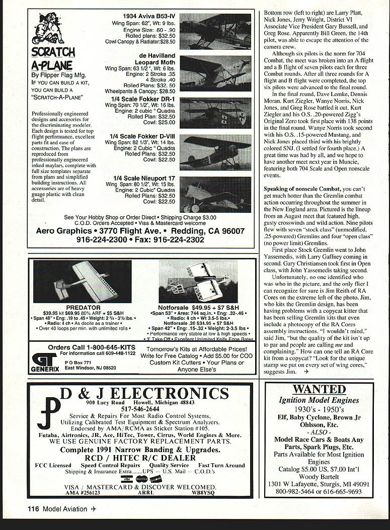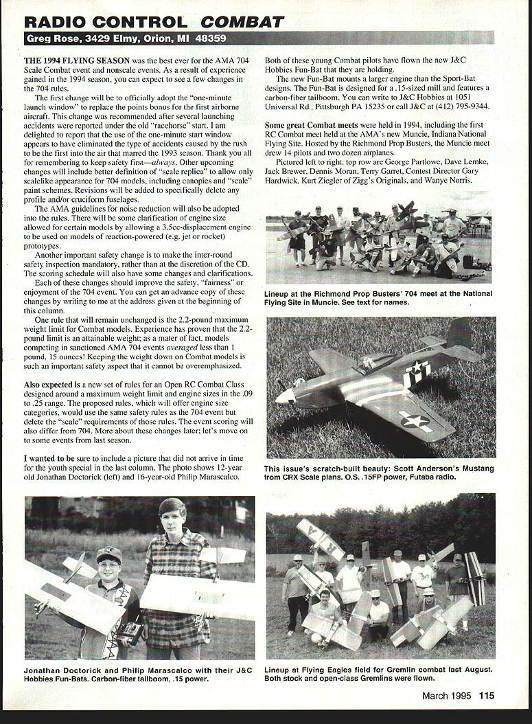 RADIO CONTROL COMBAT THE 1994 FLYING SEASON best ever AMA 704 Scale Combat event nonscale events As result experience gained 1994 season can expect see few changes 704 rules first change will officially adopt one-minute launch window replace points bonus first airborne aircraft change recommended after several launching accidents reported under old racehorse start am delighted report use one-minute start window appears have eliminated type accidents caused rush first air marred 1993 season Thank remembering keep safety firstalways Other upcoming changes will include better definition scale replica allow scalelike appearance 704 models including canopies scale paint schemes Revisions will added specifically delete profile and/or cruciform fuselages AMA guidelines noise reduction will also adopted rules will some clarification engine size allowed certain models allowing 35cc-displacement engine used models reaction-powered eg jet rocket prototypes Another important safety change make inter-round safety inspection mandatory rather discretion CD scoring schedule will also have some changes clarifications changes should improve safety fairness enjoyment 704 event can get advance copy changes writing address given beginning column rule will remain unchanged 22-pound maximum weight limit Combat models Experience has proven 22pound limit attainable weight mater fact models competing sanctioned AMA 704 events averaged less 1 pound 15 ounces Keeping weight down Combat models such important safety aspect cannot overemphasized Also expected new set rules Open RC Combat Class designed around maximum weight limit engine sizes 09 25 range proposed rules will offer engine size categories would use same safety rules 704 event delete scale requirements rules event scoring will also differ 704 about changes later lets move some events last season wanted sure include picture did arrive time youth special last column photo shows 12-year old Jonathan Doctorick left 16-year-old Philip Marascalco Both young Combat pilots have flown new J&C Hobbies Fun-Bat holding new Fun-Bat mounts larger engine Sport-Bat designs Fun-Bat designed 15-sized mill features carbon-fiber tailboom can write J&C Hobbies 1051 Universal Rd Pittsburgh PA 15235 call J&C 412 795-9344 Some great Combat meets held 1994 including first RC Combat meet held AMAs new Muncie Indiana National Flying Site Hosted Richmond Prop Busters Muncie meet drew 14 pilots two dozen airplanes Pictured left right top row George Partlowe Dave Lemke Jack Brewer Dennis Moran Terry Garret Contest Director Gary Hardwick Kurt Ziegler Zigg s Originals Wanye Norris March1995 115 Lineup Richmond Prop Busters 704 meet National Flying Site Muncie See text names issues scratch-built beauty Scott Andersons Mustang CRX Scale plans OS 15FP power Futaba radio Jonathan Doctorick Philip Marascalco J&C Hobbies Fun-Bats Carbon-fiber tailboom 15 power Lineup Flying Eagles field Gremlin combat last August Both stock open-class Gremlins flown scArcH A-PLANE Fhpper Flag Mfg IF YOU CAN BUILD KIT YOU CAN BUILD SCRATCH-A-PLANE Professionally engineered designs accesories discriminating modeler design tested top flight performance excellent parts fit ease construction plans reproduced professionally engineered inked maylars complete full size templates separate plans simplified building instructions accessories heavy guage plastic clean detail 1934 Aviva B53-IV Wing Span 62 Wt 9 lbs Engine Size 60 90 Rolled plans $3250 Cowl Canopy & Radiator$2850 de Havilland Leopard Moth Wing Span 63 1/2 lbs Engine 2 Stroke 35 4 Stroke 40 Rolled Plans $32 50 Wheelpants & Canopy $2850 1/4 Scale Fokker DR-i Wing Span 70 1/2 WI 16 lbs Engine 2 cubic Quadra Rolled Plan $3250 Cowl $2500 1/4 Scale Fokker D-VIII Wing Span 82 1/3 WI 14 lbs Engine 2 Cubic ra Rolled Plans $3250 Cowl $2250 1/4 Scale Nieuport 17 Wing Span 80 1/2 WI 15 lbs Engine 2 Cubic Quadra Rolled Plans $3250 Cowl $2250 See Hobby Shop Order Direct ping charge $300 COD Orders Accepted & Mastercard welcome Aero Graphics Flight Ave ing CA 96007 916-224-2300 916-224-2302 Bottom row left right Larry Platt Nick Jones Jeny Wright District VI Associate Vice President Gary Bussell Greg Rose Apparently Bill Green 14th pilot able escape attention camera crew Although six pilots norm 704 Combat meet broken flight B flight seven pilots three Combat rounds After three rounds flight B flight completed top six pilots advanced final round final round Dave Lemke Dennis Moran Kurt Ziegler Wanye Norris Nick Jones Greg Rose battled out Kurt Ziegler 05 20-powered Ziggs Original Zero took first place 138 points final round Wanyc Norris took second 05 15-powered Mustang Nick Jones placed third brightly colored SNJ settled fourth place great time hope have another meet next year Muncie featuring both 704 Scale Open nonscale events Speaking nonscale Combat cant get much hotter Gremlin combat action occurring throughout summer New England area Pictured lineup August meet featured high gusty crosswinds wild action Nine pilots flew seven stock class unmodified 25-powered Gremlins four open class no power limit Gremlins First place Stock Gremlin went John Yassemedis Larry Gaffney coming second Gary Christiansen took first Open class John Yassemedis taking second Unfortunately no identified who picture flier can recognize sure Jim Reith RA Cores extreme left photo Jim kits Gremlin design has having problems copycat kitter has selling Gremlin kits include photocopy RA Cores assembly instructions wouldnt mind said Jim quality kit isnt up par people calling complaining can tell RA Core kit copycat Look unique stamp put set wing cores suggests Jim Model Aviation orsaie QB 95 $5 S&HSpan 53 744 sqin 32-46 Span 48 Eng i qa nt 2Is 31/2 lbs. Radio 4 ch 5-5 lbs. Radio 4 ch ocile trainer Notforsale 20 $3495 &H Over 40 loops per mm unlimited rolls Span 42 15-32 ht 2-35 lbs Pertormance very stable low & high speeds Off Inl Inlimitprl Knitp Fclrip Rtp1 Orders Call 1800645KITS Tomorrows Kits A