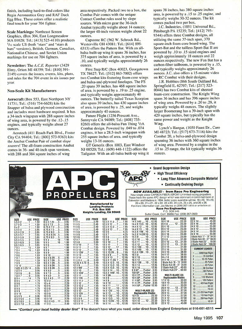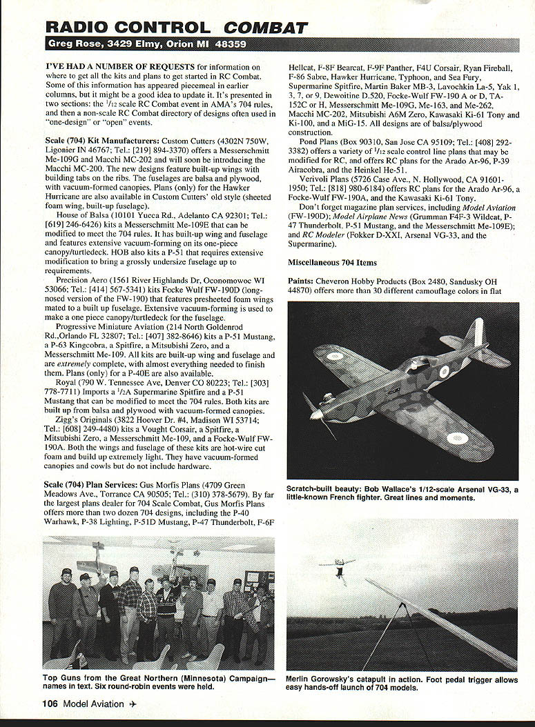 RADIO CONTROL COMBAT K IVE HAD NUMBER OF REQUESTS information get kits plans get started RC Combat Some information has appeared piecemeal earlier columns might good idea update Its presented two sections 1/12 scale RC Combat event AMAs 704 rules non-scale RC Combat directory designs often used one-design open events Scale 704 Kit Manufacturers Custom Cutters 4302N 750W Ligonier IN 46767 Tel [219] 894-3370 offers Messerschmitt Me-109G Macchi MC-202 will soon introducing Macchi MC-200 new designs feature built-up wings building tabs ribs fuselages balsa plywood vacuum-formed canopies Plans Hawker Hurricane also available Custom Cutters old style sheeted foam wing built-up fuselage House Balsa 10101 Yucca Rd Adelanto CA 92301 Tel [619] 246-6426 kits Messerschmitt Me-109E can modified meet 704 rules has built-up wing fuselage features extensive vacuum-forming its one-piece canopy/turtledeck HOB also kits P-5 1 requires extensive modification bring grossly undersize fuselage up requirements Precision Aero 1561 River Highlands Dr Oconomowoc WI 53066 Tel [414] 567-5341 kits Focke Wulf FW-190D long nosed version FW- 190 features presheeted foam wings mated built up fuselage Extensive vacuum-forming used make piece canopy/turtledeck fuselage Progressive Miniature Aviation 214 North Goldenrod RdOrlando FL 32807 Tel [407] 382-8646 kits P-51 Mustang P-63 Kingcobra Spitfire Mitsubishi Zero Messerschmitt Me-109 kits built-up wing fuselage extremely complete almost everything needed finish Plans P-40E also available Royal 790 W Tennessee Aye Denver CO 80223 Tel [303] 778-7711 Imports 12A Supermarine Spitfire P-Si Mustang can modified meet 704 rules Both kits built up balsa plywood vacuum-formed canopies Ziggs Originals 3822 Hoover Dr #4 Madison WI 53714 Tel [608] 249-4480 kits Vought Corsair Spitfire Mitsubishi Zero Messerschmitt Me-109 Focke-Wuif FW 190A Both wings fuselage kits hot-wire cut foam build up extremely light have vacuum-formed canopies cowls include hardware Scale 704 Plan Services Gus Morfis Plans 4709 Green Meadows Ave Torrance CA 90505 Tel 310 378-5679 far largest plans dealer 704 Scale Combat Gus Morfis Plans offers two dozen 704 designs including P-40 Warhawk P-38 Lighting P-51D Mustang P-47 Thunderbolt F-6F Hellcat F-8F Bearcat F-9F Panther F4U Corsair Ryan Fireball F-86 Sabre Hawker Hurricane Typhoon Sea Fury Supermarine Spitfire Martin Baker MB-3 Lavochkin La-5 Yak 1 3 7 9 Dewoitine D520 Focke-WulfFW-190 D TA 152C H Messerschmitt Me-109G Me-163 Me-262 Macchi MC-202 Mitsubishi A6M Zero Kawasaki Ki-61 Tony Ki-l00 MiG-iS designs balsa/plywood construction Pond Plans Box 90310 San Jose CA 95109 Tel [408] 2923382 offers variety 1/12 scale control line plans may modified RC offers RC plans Arado Ar-96 P-39 Airacobra Heinkel He-Si Verivoli Plans 5726 Case Ave N Hollywood CA 9 16011950 Tel [818] 980-6184 offers RC plans Arado Ar-96 Focke-Wulf FW-190A Kawasaki Ki-61 Tony Dont forget magazine plan services including Model Aviation FW-190D Model Airplane News Grumman F4F-3 Wildcat P 47 Thunderbolt P-S 1 Mustang Messerschmitt Me-109E RC Modeler Fokker D-XXI Arsenal VG-33 Supermarine Miscellaneous 704 Items Paints Cheveron Hobby Products Box 2480 Sandusky OH 44870 offers 30 different camouflage colors flat 106 Model Aviation tch-built beauty Bob Wallaces 1/12-scale Arsenal VG-33 little-known French fighter Great lines moments Top Guns Great Northern Minnesota Campaign names text Six round-robin events held Merlin Gorowskys catapult action Foot pedal trigger allows easy hands-off launch 704 models finish including hard-to-find colors like Regia Aeronautica Grey RAF Duck Egg Blue colors offer realistic final touch 704 fighter Scale Markings Northeast Screen Graphics Box 304 East Longmeadow MA 01028 Tel [413] 525-4110 produces 1/12 scale US both stars stars & bars versions British German Canadian Nationalist Chinese Soviet Union markings use 704 fighters Newsletter ACE Reporter 3429 Elmy Orion Ml 48359 Tel [810] 3912149 covers issues events kits plans rules 704 event six issues per year Non-Scale Kit Manufacturers Aerocraft Box 553 East Northport NY 11731 Tel 516 754-6628 kits Snapper balsa plywood construction includes hardware required has 34-inch wingspan 288 square inches wing area powered 12-15 engines typically weighs about 27 ounces Aerotech 411 Beach Park Blvd Foster City CA 94404 Tel [800] 573-9363 kits Anabat Combat Pair combat slope soarers all-foam construction Anabat comes 36- 48-inch span versions 288 384 square inches wing area respectively Packed two box Combat Pair comes unique Contact Combat rules used slope soarers micro gear 36-inch Anabat typically weighs about 14 ounces larger 48-inch version weighs about 22 ounces Capstone RC 562 W Schrock Rd Westerville OH 43081 Tel [614] 89963 13 offers Pattern Bat allbalsa built-up wing spans 36 inches has 375 square inches area powered 10 typically weighs approximately 26 ounces First Step R/C Box 40023 Georgetown TX 78627 Tel [512] 863-7002 offers two Combat kits featuring foam-core wings balsa-and-plywood fuselages FS 20 spans 39 inches has 468 square inches area powered 19 25 engine typically weighs approximately 40 ounces butterfly tailed Texas Scorpion also spans 39 inches has 430 square inches area powered 25 weighs approximately 40 ounces Future Flight 1256 Prescott Ave Sunnyvale CA 94089 Tel [408] 7358260 offers all-balsa Fun Thing 112A Combat design Powered 049 074 engines has 285-inch wingspan 255 square inches area typically weighs 13-16 ounces GT Generix Box 1003 East Windsor NJ 08520 Tel 609 448-1122 offers Tailgator all-balsa built-up wing spans 38 inches has 380 square inches area powered 15 25 engine typically weighs 30-32 ounces kit comes packed two per box JC Industries 1051 Universal Rd Pittsburgh PA 15235 Tel [412] 7959344 offers three Combat designs utilizing same 37-inch span 370 square-inch foam-core board wing Sport-Bat tailless Sport-Bat II powered 10 15 sized engines weigh approximately 18 ounces 22 ounces res