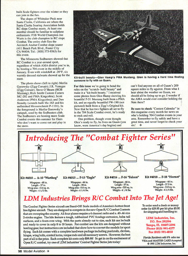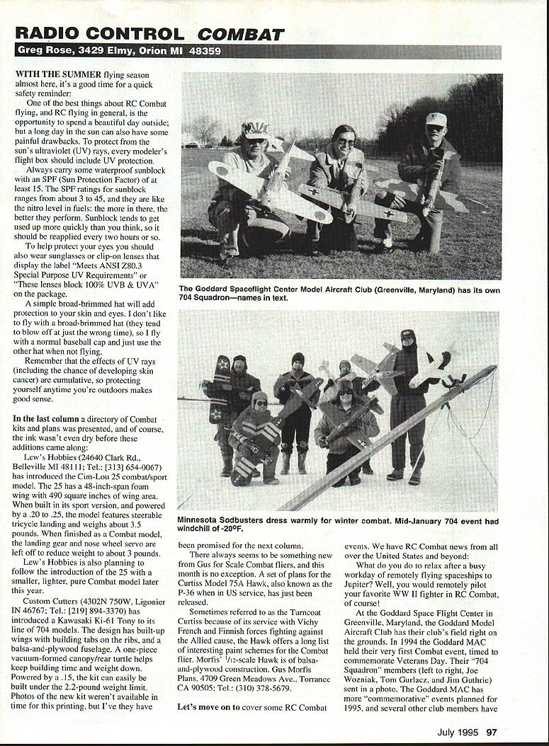 RADIO CONTROL COMBAT WITH THE SUMMER flying season almost its good time quick safety reminder best things about RC Combat flying RC flying general opportunity spend beautiful day outside long day sun can also have some painful drawbacks protect suns ultraviolet UV rays modelers flight box should include UV protection Always carry some waterproof sunblock SPF Sun Protection Factor least 15 SPF ratings sunblock ranges about 3 45 like nitro level fuels better perform Sunblock tends get used up quickly think should reapplied two hours help protect eyes should also wear sunglasses clip-on lenses display label Meets ANSI Z803 Special Purpose UV Requirements lenses block 100% UVB & UVA package simple broad-brimmed hat will add protection skin eyes dont like fly broad-brimmed hat tend blow off just wrong time fly normal baseball cap just use other hat flying Remember effects UV rays including chance developing skin cancer cumulative protecting yourself anytime youre outdoors makes good sense last column directory Combat kits plans presented course ink wasnt dry before additions came along Lews Hobbies 24640 Clark Rd Belleville MI 48111 Tel [313] 654-0067 has introduced Cim-Lou 25 combat/sport model 25 has 48-inch-span foam wing 490 square inches wing area built its sport version powered 20 25 model features steerable tricycle landing weighs about 35 pounds finished Combat model landing gear nose wheel servo left off reduce weight about 3 pounds Lews Hobbies also planning follow introduction 25 smaller lighter pure Combat model later year Custom Cutters 4302N 750W Ligonier IN 46767 Tel [219] 894-3370 has introduced Kawasaki Ki-6 1 Tony its line 704 models design has built-up wings building tabs ribs balsa-and-plywood fuselage one-piece vacuum-formed canopy/rear turtle helps keep building time weight down Powered 15 kit can easily built under 22-pound weight limit Photos new kit werent available time printing Vve have promised next column always seems something new Gus Scale Combat fliers month no exception set plans Curtiss Model 75A Hawk also known P-36 US service has just released Sometimes referred Turncoat Curtiss because its service Vichy French Finnish forces fighting against Allied cause Hawk offers long list interesting paint schemes Combat flier Morfis 1/12-scale Hawk balsaand-plywood construction Gus Morfis Plans 4709 Green Meadows Ave Torrance CA 90505 Tel 310 378-5679 Lets move cover some RC Combat events have RC Combat news over United States beyond What relax after busy workday remotely flying spaceships Jupiter Well would remotely pilot favorite WW II fighter RC Combat course Goddard Space Flight Center Greenville Maryland Goddard Model Aircraft Club has clubs field right grounds 1994 Goddard MAC held very first Combat event timed commemorate Veterans Day 704 Squadron members left right Joe Wozniak Tom Gurlacz Jim Guthrie sent photo Goddard MAC has commemorative events planned 1995 several other club members have July1995 97 Goddard Spaceflight Center Model Aircraft Club Greenville Maryland has its own 704 Squadronnames text Minnesota Sodbusters dress warmly winter combat Mid-January 704 event windchill -200F built Scale fighters over winter can join fun slopes Whittaker Peak near Santa Clarita California Santa Clarita Soaring Association holds RC slope Combat meets least member should familiar sailplane enthusiasts F3B World Champion Joe Wurts club champion RC slope Combat entire club flies Aerotech Anabat Combat slope soarer 411 Beach Park Blvd Foster City CA 94404 Tel [800] 573-9363 event Minnesota Sodbusters showed RC Combat year-around sport regardless AMA district youre hosting 704 event middle January windchill -200F six warmly dressed stalwarts showed up meet photo shows left right Merlin Gorowsky Zigg Corsair JR Venegas Zigg Corsair Steve OHearn HOB Mustang Rick Smith Custom Cutters MC-202 PMA Kingcobra Scott Anderson PMA Kingcobra Dan Stensby scratch-built Me-163 unfinished Messerschmitt P-l 101 foreground Merlin Gorowskys catapult used Sodbusters club Sodbusters hosting Scale Combat events summer fliers dont want come out play snow issue going bend rules scratch- built beauty make kit-built beauty received some photos Glen Hamp showing beautiful P-S 1 Mustang built PMA kit equally beautiful FW-190 pictured built Ziggs Original kit Now has two fighters set fly 704 Scale Combat event hes ready rock roll problem though thought Glens ready fly lives Guam know Americas day begins cant find anyone Guams 209 square miles fly against what hear about weather Guam should lining up go wonder AMA would ever consider holding Nats sure check Contest Calendar magazine month news whos holding 704 Combat events area Remember fly safely have great time never forget check six oducing Combat Fighter Series 4 w Kit #4010 . A-la Warthog Wingspan -48 Length-37 Wmgarea-5IOsq Weight-4 1/2 lbs Kit #4015 . F-iS Eagle Wingspan -44 Length-38 Wing area -510 sq Weight-4 1/4 lbs Kit #4016 . F-16 FalconKit #4018 . F-18 Hornet Wingspan -46 Length -37 Wing area -520 sq Weight-4 1/4 lbs Wingspan -46 Length -375 Wing area -510 sq Weight-4 1/4 lbs LDM Industries Brings RIC Combat Jet Age Combat Fighter Series aircraft Stand-Off Scale models Americas hottest front line fighter aircmft designed compete new Open RIG Combat Contests sweeping country four planes require 4 channel radio 40-46 size 2-stroke engine kits feature tough rubberized PVC fuselage extrusion balsa tail surfaces foam core wing parts already cut size kit can built ready cover 8 10 hours combat use kits designed landing gear instructions included show convert models sport flying kit comes complete hardware package including pushrods devises hinges wing bolts control horns torque rods necessary screws However best part price complete kit costs $3995 So get excitement Open R/C combat try LDM Industries Combat Fighter Series Jets today order send check money order $3995 per kit plus $500 shipping handling LDM Industries Inc PO Box 292396 Tampa FL