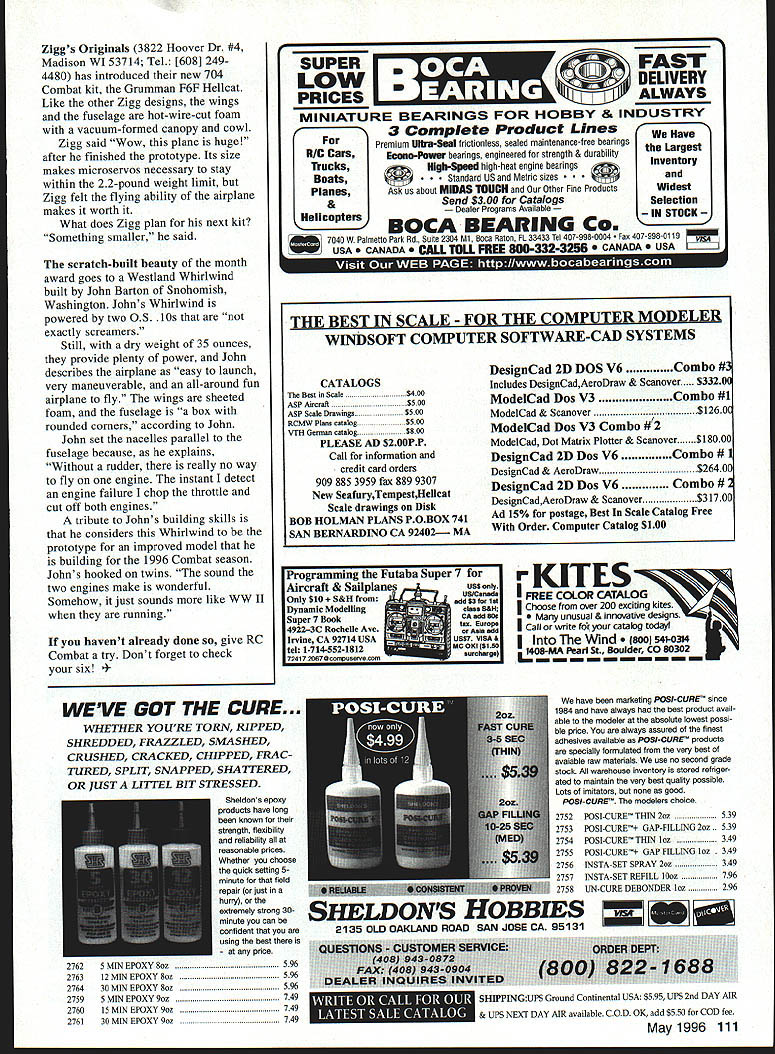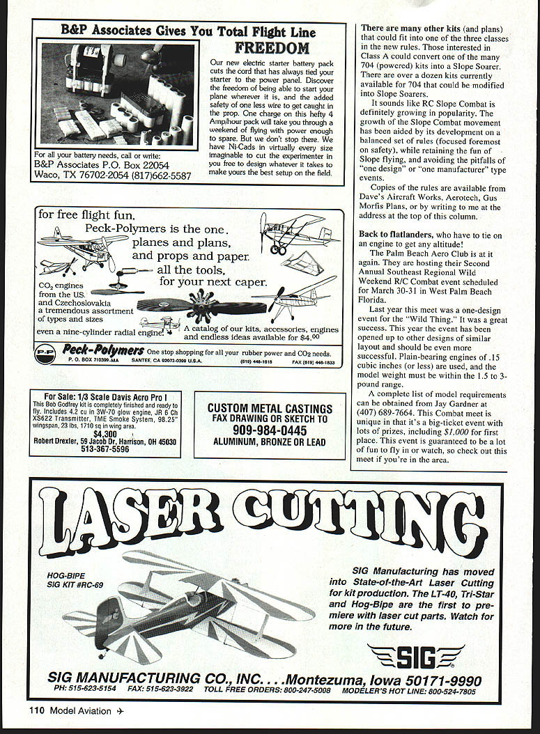 RADIO CONTROL COMBAT FeTy WISH LIVED BY GOOD SLOPE because RC Slope Soaring Combat really taking off havent chance try yet set rules has put together Slope Soaring Combat covers current interest allows room sport grow new Slope Soaring rules based loosely AMA 704 Combat event Since no propulsion required Slope Soaring type prototype jet prop multiengine can modeled equal ease event presented three different classes Class WW II Slope Glider Combat Class B Jet Slope Glider Combat Class C Open Design Combat WW II Jet Combat rules require recognizable replica combat aircraft bears approximately scale military finish minimum fuselage width 125 inches required two recognizable scale classes Open Combat class does have dimensional requirements models have two pound weight limit other two classes Safety considerations including controlled spectator placement preflight inspections maximum-allowable flying weight built rules Unlike AMA 704 event requires streamer can cut propeller lightweight Mylar streamers used have almost no effect models performance Since cuts arent possible scoring based mostly streamer strikes rather cuts Some sources kits plans Slope Soaring Combat include Daves Aircraft Works 123 Avenida Buena Ventura San Clemente CA 92672 Tel [714] 498-4478 has five Class Atype kits WW II Slope Combat models wingspans range 30 36 inches model has flying weight approximately pound Daves offers P-40 Warhawk 51 Mustang Ki-61 Tony Messerschmitt 109 Focke-Wulf Ta 152 Daves designs have precut foam wings utilizing popular Selig 3021 airfoil K&A Models Unlimited 13819 Winter Wood Way Albuquerque NM 87123 produces three very scale Class Atype kits epoxy-fiberglass construction Available kits include P-38 Lightning P-40 Warhawk P-Si Mustang Aerotech 411 Beach Park Blvd Foster City CA 94404 Tel [800] 573-9363 dominates Class C superb-flying Anabat Combat Anabat Combat comes two models packed box Combat Pair Aerotech figured out long ago solo Combat just fun Combat buddy Aerotech also produces Class B-type kit A-b Warthog reported fly well Anabat plan-builders Gus Morfis Plans 4709 Green Meadows Ave Torrance CA 90505 Tel [310] 378-5679 offers 1/12. scale Class B jet plans F9F Panther F-86 Sabre MiG-l 5 F-84 Thunderjet also offer two dozen 704 designs could used Class WW II event Some designs like Messerschmitt 262 163 could fly Class Class B John Barton holds scratch-built twin-engine Westland Ziggs Originals new Grumman F6F Hellcat kit Like other Zigg Whirlwind Avid Combat flier Mark Metge L test pilot designs wings fuselage hot-wire-cut foam May1996 109 Ki-61 Tony Daves Aircraft Works five Class A-type kits WW II Slope Combat Weighs 14-18 ounces 36-inch span B&P Associates Gives Total Flight Line FREEDOM new electnc starter battery pack cuts cord has always tied starter power panel Discover freedom being able start plane wherever added safety less wire get caught prop charge hefty 4 Amp/hour pack will take through weekend flying power enough spare dont stop have Ni-Cads virtually size imaginable cut experimenter free design whatever takes make yours best setup field battery needs call write B&P Associates PO Box 22054 Waco TX 76702-2054 817662-5587 HOG-B IPE SIG KIT #RC-69 other kits plans could fit three classes new rules interested Class could convert 704 powered kits Slope Soarer over dozen kits currently available 704 could modified Slope Soarers sounds like RC Slope Combat definitely growing popularity growth Slope Combat movement has aided its development balanced set rules focused foremost safety retaining fun Slope flying avoiding pitfalls design manufacturer type events Copies rules available Daves Aircraft Works Aerotech Gus Morfis Plans writing address top column Back flatlanders have tie engine get altitude Palm Beach Aero Club again hosting Second Annual Southeast Regional Wild Weekend RIC Combat event scheduled March 30-31 West Palm Beach Florida Last year meet one-design event Wild Thing great success year event has opened up other designs similar layout should successful Plain-bearing engines 15 cubic inches less used model weight must within 15 3pound range complete list model requirements can obtained Jay Gardner 407 689-7664 Combat meet unique its big-ticket event lots prizes including $1000 first place event guaranteed lot fun fly watch check out meet youre area SIG Manufacturing has moved State-of-the-Art Laser Cutting kit production LT-40 Tn-Star Hog-Bipe first pre miere laser cut parts Watch future 5I6Y SIG MANUFACTURING CO INC. Montezuma Iowa 50 171-9990 PH 515-623-5154 FAX 515-623-3922 TOLL FREE ORDERS 800-247-5008 MODELERS HOT LINE 800-524-7805 110 Model Aviation flight fun Peck-Polymers planes plans props paper tools CO enginesfor next caper Czechoslovakia tremendous assortment types sizes nine-cylinder radial engiV A catalog kits accessories engines endless ideas available $400 PeckP/yaes stop shopping rubber power co2 needs P 0 BOX 7IO399MASANTEE cA 920728389 USA619 4481818FAX 6194481833 Sale 1/3 Scale Davis Acro Pro Bob Godfrey kit completely finished ready 10 fly Includes 42 cu 3W-70 glow engine JR 6 Ch X5622 Transmitter TME Smoke System g825 wingspan 23 Ibs 1710 sq ming area $4300 Roberi Drexler 59 Jacob Dr Harrison OH 45830 513-367-5596 CUSTOM METAL CASTINGS FAX DRAWING OR SKETCH TO 909-984-0445 ALUMINUM BRONZE OR LEAD Ziggs Originals 3822 Hoover Dr #4 Madison WI 53714 Tel [608] 2494480 has introduced new 704 Combat kit Grumman F6F Hellcat Like other Zigg designs wings fuselage hot-wire-cut foam vacuum-formed canopy cowl Zigg said Wow plane huge after finished prototype Its size makes microservos necessary stay within 22-pound weight limit Zigg felt flying ability airplane makes worth What does Zigg plan next kit Something smaller said scratch-built beauty month award goes Westland Whirlwind built John Barton Snohomish Washington Johns Whirlwind powered two OS exactly screamers Still dry weight 35 ounces provide plenty power John describes airplane easy launch very