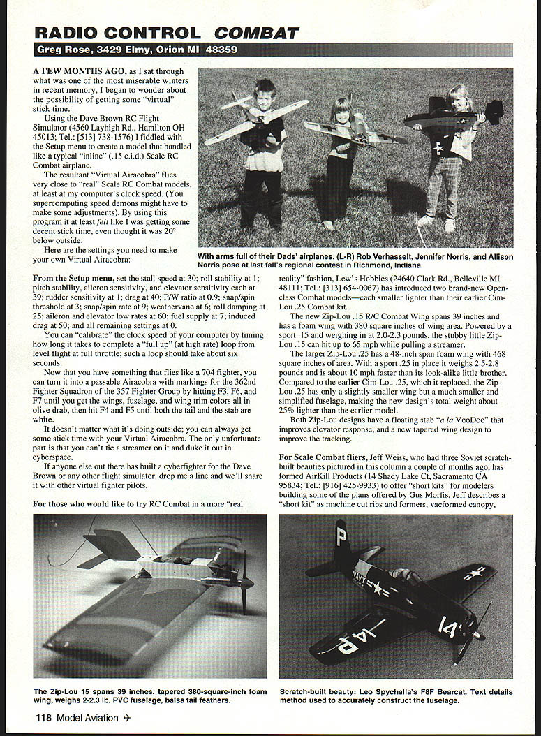 RADIO CONTROL COMBAT FEW MONTHS AGO sat through what miserable winters recent memory began wonder about possibility getting some virtual stick time Using Dave Brown RC Flight Simulator 4560 Layhigh Rd Hamilton OH 45013 Tel [513] 738-1576 fiddled Setup menu create model handled like typical inline 15 cid Scale RC Combat airplane resultant Virtual Airacobra flies very close real Scale RC Combat models least computers clock speed supercomputing speed demons might have make some adjustments using program leastfelt like getting some decent stick time thought 200 below outside settings need make own Virtual Airacobra Setup menu set stall speed 30 roll stability 1 pitch stability aileron sensitivity elevator sensitivity 39 rudder sensitivity 1 drag 40 P/W ratio 09 snap/spin threshold 3 snap/spin rate 9 weathervane 6 roll damping 25 aileron elevator low rates 60 fuel supply 7 induced drag 50 remaining settings 0 can calibrate clock speed computer timing long takes complete full up high rate loop level flight full throttle such loop should take about six seconds Now have something flies like 704 fighter can turn passable Airacobra markings 362nd Fighter Squadron 357 Fighter Group hitting F3 F6 F7 until get wings fuselage wing trim colors olive drab hit F4 FS until both tail stab white doesnt matter what its doing outside can always get some stick time Virtual Airacobra unfortunate part cant tie streamer duke out cyberspace anyone else out has built cyberfighter Dave Brown other flight simulator drop line well share other virtual fighter pilots reality fashion Lews Hobbies 24640 Clark Rd Belleville MI 48111 Tel [313] 654-0067 has introduced two brand-new Openclass Combat modelseach smaller lighter earlier Cim Lou 25 Combat kit new Zip-Lou 15 R/C Combat Wing spans 39 inches has foam wing 380 square inches wing area Powered sport 15 weighing 20-23 pounds stubby little ZipLou 15 can hit up 65 mph pulling streamer larger Zip-Lou 25 has 48-inch span foam wing 468 square inches area sport 25 place weighs 25-28 pounds about 10 mph faster its look-alike little brother Compared earlier Cim-Lou 25 replaced ZipLou 25 has slightly smaller wing much smaller simplified fuselage making new designs total weight about 25% lighter earlier model Both Zip-Lou designs have floating stab Ia VooDoo improves elevator response new tapered wing design improve tracking Scale Combat fliers Jeff Weiss three Soviet scratchbuilt beauties pictured column couple months ago has formed AirKill Products 14 Shady Lake Ct Sacramento CA 95834 Tel [916] 425-9933 offer short kits modelers building some plans offered Gus Morfis Jeff describes short kit machine cut ribs formers vacformed canopy 118 Model Aviation full Dads airplanes L-R Rob Verhasselt Jennifer Norris Allison Norris pose last falls regional contest Richmond Indiana would like try RC Combat real Zip-Lou 15 spans 39 inches tapered 380-square-inch foam Scratch-built beauty Leo Spychallas F8F Bearcat Text details wing weighs 2-23 lb PVC fuselage balsa tail feathers method used accurately construct fuselage vacformed details air scoops etc dependent model radial designs vacformed cowls No plans supplied short kits must purchased Gus Morfis Plans 4709 Green Meadows Ave Torrance CA 90505 Tel [310] 378-5679 AirKill currently offers short kits F4U Corsair FSF Bearcat Curtiss P-36 Hawker Sea Fury La-5 MiG-3 Yak-9 Call write AirKill details scratch-built beauty month goes F8F Bearcat built Leo Spychalla Watertown WI Leo achieved accurate contour Bearcat stacking 22 one-inch-wide foam blocks hot-wire-cut accurate cross section using plywood templates After assembling blocks sanded shape covered nylon pantyhose coated epoxy entire model painted PPG Delstar Acrylic Enamel Leo says very fuel proof Leo also made plugs vacform cowl canopy Leo chose Bames MB253515 airfoil improve stall characteristics small wing after test flying reported plane very fast yet did fall like rock landing particular model built Christmas present son does plan using Combat build OS 25 weights 29 pounds 20 engine Leo says 22-lb legal weight within reach next Bearcat have under construction liked plane much Ive got build myself Leo should have Cat ready time join years Great Northern Campaign Minnesota details round-robin campaign contact call Scott Anderson 6765 Vermar Terrace Eden Prairie MN 55346 Tel 612 934-1471 Now flying season upon us sure check Contest Calendar magazine month news whos holding 704 Combat events area Remember fly safely have great time never ever forget check six Austin Blvd Island Park NV 11558 516-431-4127 516-889-2682 FEATURING UTEWEIGHT EMT CONDUIT TUBING & QUICK LOCK ON FITflNGS NO TOOLS 0 F1NCLUD1 13/4tl asia sas $130 $135 BREAKDOWN MODEL Fits in Cars & Can Shipped UPS Add Amounts Below Unit Price axlo& lOslO Flat 540 314 & $45 1 5x10 & lOslO Peaked $35 1314 & $45 IP 10x20 Flat $64 13141 & $73 P 10x20 Peaked $6211 I3/4P I asia$80SilO I tOslO$85$115 3/4600 3/4-600 3f4 650 3/4400 3/4-600 3/4-650 3/4-750 1aooI 900I 5001 aoovooo 1-1000 P4LP4DPSFFOOT PAD F03FOLBUNGlE 003/4-6503/47503/46503/4-6003/4-6006405 P-900P-900 1 10001 7501 eoo1 -BOO WE MAMIFACIURE & STOUC SEVER AL OtHER SYSIFIIS & HAVE FUI LW4E OF ACCESEORS ALL WItH tHE VENDOR 14 uwt CALL FAX OR MAL US TO PLACE YOUR OROER OR TO RECEFAE YOUR FREE CATALOG 1. UBAIIY uses versatility power PC set up battery test print hardcopy te results UBAIII designed specifically AC flyers take batteries seriously accept nothing less best analyzes rechargeable batteries identifies weak cells before fail ________________ records prints results including charge/discharge curve have complete permanent record battery test best fully automatic Just connect PCs serial port tell type battery youre testing does UBALII comes complete software connectors serial cable two year warrant 30-day money-back guarantee Requires IBM compatible PC serial port Tests MOd NIMH & gel-cetsflead acid cat 15V July1996 119 POP UP CANOPIES $29900 lOxlO LIGHTWEIGHT $39900 lOxlO HE
