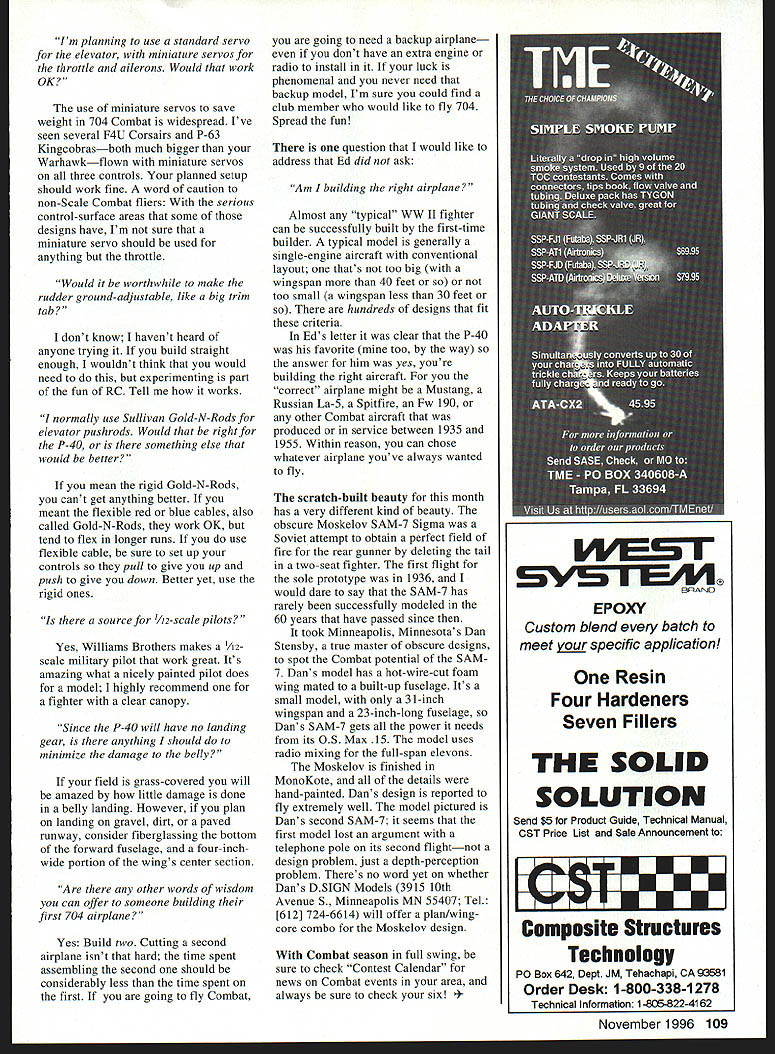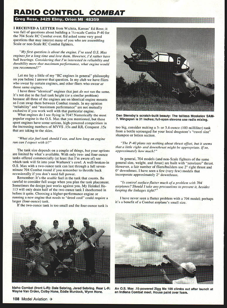 RADIO CONTROL COMBAT RECEIVED LETTER Wichita Kansas Ed Ross full questions about building 1A2-scale Curtiss P-40 704 Scale RC Combat event Ed asked some very good questions may interest assembling Scale non-Scale RC Combat fighters first question about engine Ive used 05 Max engines long time love However Id rather have ball bearings Considering Im interested reliability durability maximum performance what engine would recommend Let lay little RC engines general philosophy before answer question club have fliers swear certain engines other fliers swear same engines have three identical engines just run same Its due fuel tank height similar problem because three engines identical engine mounts can swap between Combat rounds opinion reliability maximum performance mutually exclusive work well particular engine What engines see flying 704 Numerically popular engine OS Max mentioned sport engines have some serious high-powered competition increasing numbers MVVS 15s RJL Conquest 15s taking skies What size fuel tank should fuse long engine run can 1 expect tank size depends couple things options limited whats available two- four-ounce tanks offered commercially least Im aware see tank will fit Warhawks cowl well-broken-in OS Max two-ounce tank can last through full sevenminute 704 Combat round remember throttle back occasionally dont need full power Remember Its usable fuel tank counts careful consider full usage plan tank placement Sometimes design just works against Heinkel He113 will drain half two-ounce tank shoehorned before quits Choosing higher-performance engine running new engine needs drool cool could require larger four-ounce tank two-ounce tank too small four-ounce tank too big consider making 3- 34-ounce 100 milliliter tank bottle scrounged local drugstores travel size shampoo lotion section P-40 plans say nothing about thrust offset seems little right- downthrust might appropriate app roximately much general 704 models non-Scale fighters same general size weight thrust built zero/zero thrust However fair number fliers/builders use 20 right thrust 00 downthrust have seen few very few models incorporate approximately 20 downthrust control surface flutter much problem 704 airplanes Should take precautions prevent besides keeping linkages tight have never seen flutter problem 704 model perhaps its benefit Combat airplanes small size 108 Model Aviation Stensbys scratch-built beauty tailless Moskeloy SAM7 Wingspan 31 inches full-span elevons use radio mixing Idaho Combat front L-R Dale Sebring Jared Sebring Rear L-R Wayne Van Orden Colby Hone Eddie Murdock Wynn Hone An 05 Max 15-powered Zigg 109 climbs out after launch Indiana Combat meet House paint over foam Im planning use standard servo elevator miniature servos throttle ailerons Would work OK use miniature servos save weight 704 Combat widespread Ive seen several F4U Corsairs P-63 Kingcobrasboth much bigger Warhawkflown miniature servos three controls planned setup should work fine word caution non-Scale Combat fliers serious control-surface areas some designs have Im sure miniature servo should used anything throttle Would worthwhile make rudder ground-adjustable like big trim tab dont know havent heard anyone trying build straight enough wouldnt think would need experimenting part fun RC Tell works normally use Sullivan Gold-N-Rods elevator pushrods Would right P-40 something else would better mean rigid Gold-N-Rods cant get anything better meant flexible red blue cables also called Gold-N-Rods work OK tend flex longer runs use flexible cable sure set up controls pull give up push give down Better yet use rigid ones source 1/12-scale pilots Yes Williams Brothers makes 1/12. scale military pilot work great Its amazing what nicely painted pilot does model highly recommend fighter clear canopy Since P-40 will have no landing gear anything should minimize damage belly field grass-covered will amazed little damage done belly landing However plan landing gravel dirt paved runway consider fiberglassing bottom forward fuselage four-inchwide portion wings center section Are other words wisdom can offer someone building first 704 airplane Yes Build two Cutting second airplane isnt hard time spent assembling second should considerably less time spent first going fly Combat going need backup airplane dont have extra engine radio install luck phenomenal never need backup model Im sure could find club member would like fly 704 Spread fun question would like address Ed did ask Am building right airplane Almost typical WW II fighter can successfully built first-time builder typical model generally single-engine aircraft conventional layout thats too big wingspan 40 feet too small wingspan less 30 feet hundreds designs fit criteria Eds letter clear P-40 favorite too way answer him yes youre building right aircraft correct airplane might Mustang Russian La-5 Spitfire Fw 190 other Combat aircraft produced service between 1935 1955 Within reason can chose whatever airplane youve always wanted fly scratch-built beauty month has very different kind beauty obscure Moskelov SAM-7 Sigma Soviet attempt obtain perfect field fire rear gunner deleting tail two-seat fighter first flight sole prototype 1936 would dare say SAM-7 has rarely successfully modeled 60 years have passed since took Minneapolis Minnesotas Dan Stensby true master obscure designs spot Combat potential SAM7 Dans model has hot-wire-cut foam wing mated built-up fuselage Its small model 31-inch wingspan 23-inch-long fuselage Dans SAM-7 gets power needs its OS Max 15 model uses radio mixing full-span elevons Moskelov finished MonoKote details hand-painted Dans design reported fly extremely well model pictured Dans second SAM-7 seems first model lost argument telephone pole its second flightnot design problem just depth-perception problem Theres no word yet whether Dans DSIGN Models 3915 10th Avenue S Minneapolis MN 55407 Tel [612] 724-6614 will offer plan/wingcore combo Moskelov design Comb