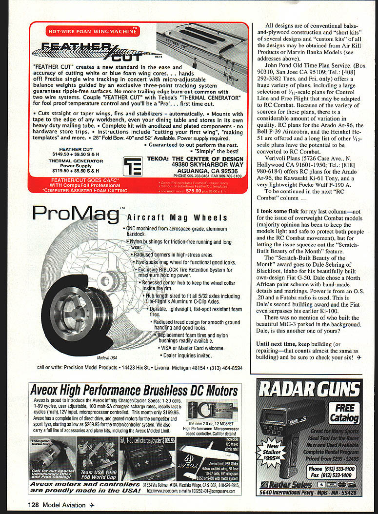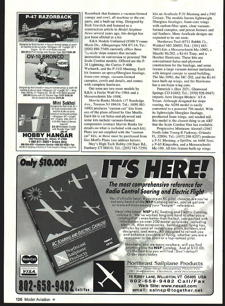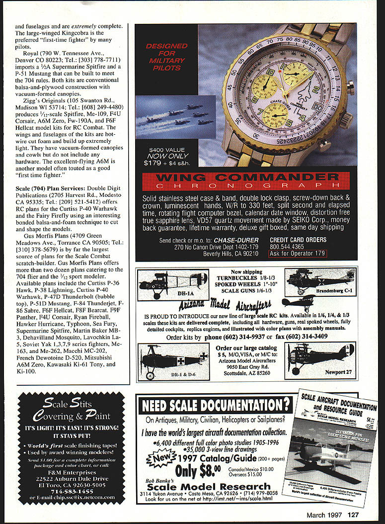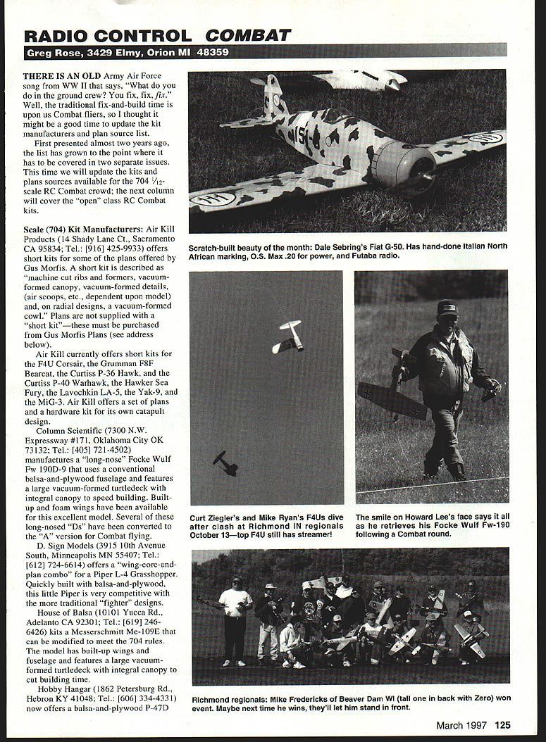RADIO CONTROL COMBAT THERE IS OLD Army Air Force song WW II says What ground crew fix fix fix Well traditional fix-and-build time upon us Combat fliers thought might good time update kit manufacturers plan source list First presented almost two years ago list has grown point has covered two separate issues time will update kits plans sources available 704 A2scale RC Combat crowd next column will cover open class RC Combat kits Scale 704 Kit Manufacturers Air Kill Products 14 Shady Lane Ct Sacramento CA 95834 Tel [916] 425-9933 offers short kits some plans offered Gus Morfis short kit described machine cut ribs formers vacuumformed canopy vacuum-formed details air scoops etc dependent upon model radial designs vacuum-formed cowl Plans supplied short kitthese must purchased Gus Morfis Plans see address below Air Kill currently offers short kits F4U Corsair Grumman F8F Bearcat Curtiss P-36 Hawk Curtiss P-40 Warhawk Hawker Sea Fury Lavochkin LA-5 Yak-9 MiG-3 Air Kill offers set plans hardware kit its own catapult design Column Scientific 7300 NW Expressway #171 Oklahoma City OK 73132 Tel [405] 721-4502 manufactures long-nose Focke Wulf Fw 190D-9 uses conventional balsa-and-plywood fuselage features large vacuum-formed turtledeck integral canopy speed building Builtup foam wings have available excellent model Several long-nosed Ds have converted version Combat flying D Sign Models 3915 10th Avenue South Minneapolis MN 55407 Tel [612] 724-6614 offers wing-core-and plan combo Piper L-4 Grasshopper Quickly built balsa-and-plywood little Piper very competitive traditional fighter designs House Balsa 10101 Yucca Rd Adelanto CA 92301 Tel [619] 2466426 kits Messerschmitt Me-109E can modified meet 704 rules model has built-up wings fuselage features large vacuumformed turtledeck integral canopy cut building time Hobby Hangar 1862 Petersburg Rd Hebron KY 41048 Tel [606] 334-4331 now offers balsa-and-plywood P-47D March 1997 125 Scratch-built beauty month Dale Sebrings Fiat G-50 Has hand-done Italian North African marking 05 Max 20 power Futaba radio Curt Zieglers Mike Ryans F4Us dive smile Howard Lees face says after clash Richmond IN regionals retrieves Focke Wuif Fw-190 October 1 3top F4U still has streamer following Combat round Richmond regionals Mike Fredericks Beaver Dam WI tall back Zero won event Maybe next time wins theyll let him stand front Designed Rich Uravitch um rurmen canopy & cowl ine & die-cut parts Wingspan 52 Length 52 Wing Area 533 Sq ln Engine 2 20-25 Radio repaired $9999 Combo 2 Thunder Tiger 25GP $19999 OR 2 Geared 05 Electric $17499 Mini Sukhoi good Nick Ziroli Sr wood constroction vs 011511W nqn-n10 C4 Ch Mini Radio & Servos repaired $3299 Kit Sukhoi Combs Thandur Tiger lOGE $89 99 HUBBY HANGAR 1862 Petersburg Rd Kebren KY 41948 1-800-611-3850 Orders Only 806-334-4331 Custemar Sereice 334-4333 Add $6 tsr Shipping & Handling es Subject Change Any Time Razorback features vacuum-formed canopy cowl machine die-cut parts built-up wing Designed Rich Uravitch featured construction article Model Airplane News several years ago design has just offered kit K&A Models Unlimited 9300 Yvonne Marie Dr Albuquerque NM 87114 Tel [505] 890-7549 currently offers three 1/12-scale slope soarers include instruction conversion powered 704 Scale Combat models Offered P 38 Lightning Curtiss P-40B Warhawk P-51D Mustang kit features epoxy/fiberglass fuselage foam-core wings vacuum-formed canopies cowls details comes complete hardware Out soon two models K&A Focke WuIf Fw-190A Messerschmitt Me- 109K Marvin Banka Models 17 Ruteledge Ave Trenton NJ 08618 Tel [609] 8831490 produces custom cut kits plans offered Gus Morfis kit cut balsa-and-plywood some kits include vacuum-formed components contact Marvin Banka details what included kit Plans supplied custom cut kits must purchased Gus Morfis Plans see address below Meys High Tech Hobby 10 Starr Rd Danbury CT 06810 Tel [203] 743-7259 kits AcuScale P-Si Mustang F4U Corsair models feature lightweight fiberglass fuselages foam-core wings carbon-fiber spars clear vacuumformed canopies precut formers tail feathers AcuScale designs expected out soon Northwest Tool 6711 Rabbit Ct Waldorf MD 20603 Tel [301] 8437601 kits Messerschmitt Me-109G Macchi Mc202 Ki-61 Tony Hawker Hurricane kits use conventional balsa-and-plywood construction fuselage some feature large vacuum-formed turtledeck integral canopy speed building Me-109G MC-202 Ki-61 have built-up wings Hurricane has cut-foam wing core Pattericks Box 2031 Glenwood Springs CO 81602 Tel [970] 928-0947 imports Aero Design Models AT-6 Texan Although designed slope soaring ADM model easily converted powered 704 model its lightweight fiberglass fuselage presheeted foam wings sanded tail model closest thing ARF Scale Combat flier has available Progressive Miniature Aircraft 2467 North John Young B Parkway Orlando FL 32804 Tel [407] 298-8257 produces P-5 1 Mustang Spitfire A6M Zero P-63 Kingcobra Messerschmitt Me-109 kits feature built-up wings 126 Model Aviation nnen xv aaicn uravmnco um tormea canopy cowl All40 th 20 $54499 fuselages extremely complete large-winged Kingcobra preferred first-time fighter pilots Royal 790 W Tennessee Ave Denver CO 80223 Tel [303] 778-7711 imports 1/2A Supermanne Spitfire P-Si Mustang can built meet 704 rules Both kits conventional balsa-and-plywood construction vacuum-formed canopies Ziggs Originals 105 Swanton Rd Madison WI 53714 Tel [608] 249-4480 produces 1/12-scale Spitfire Me-109 F4U Corsair A6M Zero Fw-190A F6F Hellcat model kits RC Combat wings fuselages kits hotwire cut foam build up extremely light have vacuum-formed canopies cowls include hardware excellent-flying A6M another model often touted good first time fighter Scale 704 Plan Services Double Digit Publications 2705 Harvest Rd Modesto CA 95335 Tel [209] 521-5412 offers RC plans Curtiss P-40 Warhawk Fairy Firefly using interesting bonded balsa-and-foam technique cut shape models Gus Morfis Plans 4709 Green Meadows Ave Tor