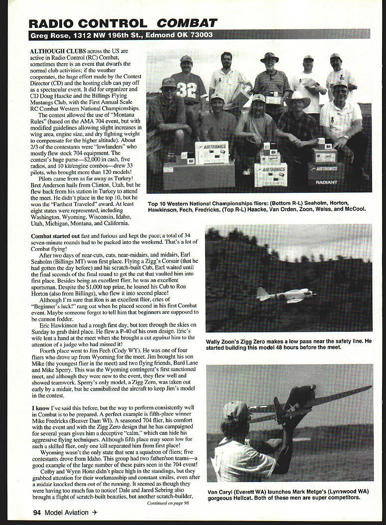 RADIO CONTROL COMBAT ALTHOUGH CLUBS across US active Radio Control RC Combat sometimes event dwarfs normal club activities weather cooperates huge effort made Contest Director CD hosting club can pay off spectacular event did organizer CD Doug Haacke Billings flying Mustangs Club First Annual Scale RC Combat Western National Championships contest allowed use Montana Rules based AMA 704 event modified guidelines allowing slight increases wing area engine size dry fighting weight compensate higher altitude About 2/3 contestants lowlanders mostly flew stock 704 equipment contests huge purse$2000 cash five radios 10 kitlengine combosdrew 33 pilots brought 120 models Pilots came far away Turkey Bret Anderson halls Clinton Utah flew back station Turkey attend meet didnt place top 10 won Farthest Traveled award least eight states represented including Washington Wyoming Wisconsin Idaho Utah Michigan Montana California Combat started out fast furious kept pace total 34 seven-minute rounds packed weekend Thats lot Combat flying After two days near-cuts cuts near-midairs midairs Earl Seaholm Billings MT won first place flying Ziggs Corsair gotten day before scratch-built Cub Earl waited until final seconds final round get cut vaulted him first place Besides being excellent flier excellent sportsman Despite $1000 top prize loaned Cub Ron Horton also Billings flew second place Although Im sure Ron excellent flier cries Beginners luck rang out placed second first Combat event Maybe someone forgot tell him beginners supposed cannon fodder Eric Hawkinson rough first day tore through skies Sunday grab third place flew P-40 own design Erics wife lent hand meet brought cut against him attention judge missed Fourth place went Jim Fech Cody WY four fliers drove up Wyoming meet Jim brought son Mike youngest flier meet two flying friends Bard Lane Mike Sperry Wyoming contingents first sanctioned meet although new event flew well showed teamwork Speny s model Zigg Zero taken out early midair hut cannibalized aircraft keep Jims model contest know Ive said before way perform consistently well Combat prepared perfect example fifth-place winner Mike Fredricks Beaver Dam WI seasoned 704 flier comfort event Zigg Zero design has campaigned several years gives him deceptive calm can hide aggressive flying techniques Although fifth place may seem low such skilled flier kill separated him first place Wyoming wasnt state sent squadron fliers five contestants drove Idaho group two father/son teamsa good example large number pairs seen 704 event Colby Wynn Hone didnt place high standings grabbed attention workmanship constant smiles after midair knocked out running seemed though having too much fun notice Dale Jared Sebting also brought flight scratch-built beauties another scratch-builder Continued page 98 94 Model Aviation 10 Western National Championships fliers Bottom R-L Seahoim Horton Hawkinson Fech Fredricks Top R-L Haacke Van Orden Zoon Weiss McCool Wally Zoons Zigg Zero makes low pass near safety line started building model 48 hours before meet Van Caryl Everett WA launches Mark Metges Lynnwood WA gorgeous Hellcat Both men super competitors j HP20080W SPORT STUNT PLANE8K/AfG MEG j THE CLEAN LINES OF THE HP-200 REPRESENT MANY CLASSIC DESIGN FEATURES THAT SET THIS BIG BIRD U APART FRDM THE REST THE EASE DFCDNSTRUCTIDNAND AMAZING FLIGHT PERFDRMANCE ISA7TRIBUTED TD U ITS DESIGNER HAL PARENT CDMES IN SEMI KIT FDRM TD SAVE YDU MDNEY PRICE OF SEMI-KIT $995ENGINES 90 TO QUADRA 42NiiIIllLIiDE WING AREA 1080 SO IN TWO DETAILED PLANS U WEIGHT 14 TO 16 LBS CONSTRUCTION MANUAL U FOAMWINGCORES ALL 309/34 FOAM TURTLE DECK U WHEEL PANTS CRTSTALCLEARCANSPY ALUMINUM LANSING FEAR U HEAW PLYWOOD MAIN U FORMERS FIREWALL AND U DIHEDRAL BRACE U HORNS AND WING BOLTS U BILL UP MATERIALS FOR ADDITIONAL WOOD U REQUIRED TO COMPLETE U THE AIRFRAME D MAIL ORDERS TO WING MFEi 306 E SIMMONS GALESBURO IL 61401 ADD $795 S & H IN USA OR WRITE FOR S & H ON FOREIGN ORDERS $5 FOR COMPLETE PRODUCT CATALSO U U 6 Sizes available IIIIIIIiii style help resist warping Price includes S & H shipped continential U SLYMCO Outside U S add $1000 Mi residents add 6% taxP0Bx 178 Milan MI 43160 242 241 362~1 482 W313--8S DGVF4IAiProdigycom 2 48 24zlUxi 368488 4zlUxl Check ormoney Balsa Building Board Features Pieces cut cross grain end wood grain makes up surface allows multiple cuts surface crumbling Wayne Van Orden took seventh placethe best showing Idaho team Jeff Weiss AirKill Products highest-placing kit manufacturer grabbing ninth place showed up largest fleet models contestant didnt need backups model went entire meet virtually unscathed Mark McCool Nashotah WI won Unluckiest Man Meet award first day plagued engine fuel problems missed two heats Sunday tore out basement Collins Scientific Fw 190 won 10th place days worth flying What happened Doug Hanke event CD organizer placed respectable sixth standings bad Busiest Man Meet title CD earns his/her hard work Doug asked make sure thanked event sponsors including Airtronics Air-Kill Products Ziggs Originals Great Planes local sponsors including Pizza Time Billings Gazette station KTVQ Pepsi-ColaTM As Doug said guys greatest Plans already works second Scale RC Western National Combat Championships 1998 50 plan attend great event can bad news manufacturing scene 704 modelers Marvin Banka Models 17 Ruteledge Ave Trenton NJ 08618 Tel [609] 883-1490 has offered precut kits foam-core wings Gus Morfis design will no longer able work balsa Marvin allergic reaction balsa dust nature allergy forced him stop working balsa However will able continue supplying precut foam wing cores Morfis designs may expand non-balsa-related kit-making abilities Marvins nice guy wish him best luck overcoming health problems check top page will see have moved whole column could written about joys transporting models family 1000 miles Ill spare gruesome details have few less works progress hangar rash now norm things went fairly well general