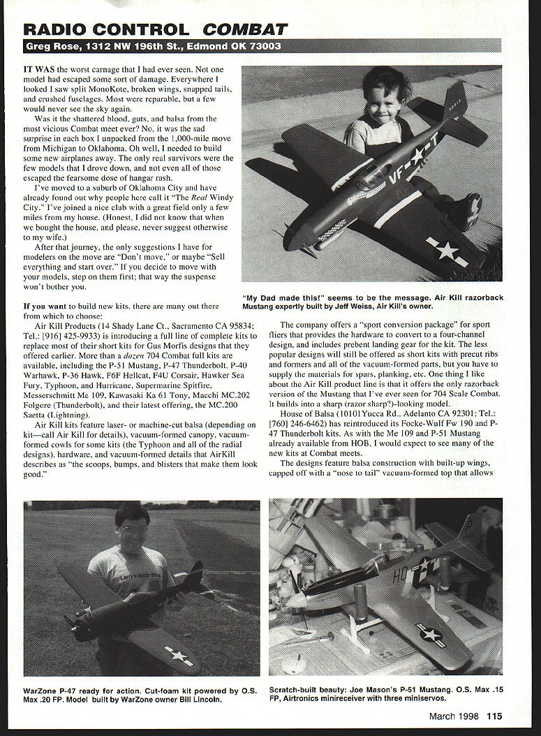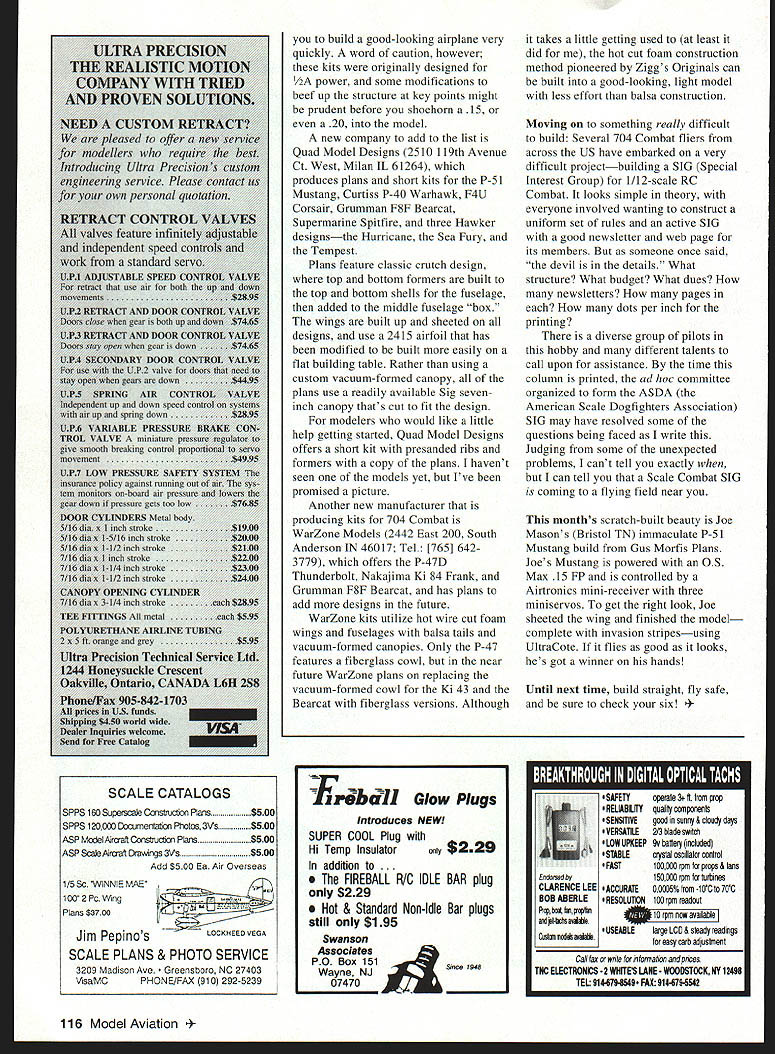 RADIO CONTROL COMBAT IT WAS worst carnage ever seen model escaped some sort damage Everywhere looked saw split MonoKote broken wings snapped tails crushed fuselages Most reparable few would never see sky again shattered blood guts balsa vicious Combat meet ever No sad surprise box unpacked 1000-mile move Michigan Oklahoma Oh well needed build some new airplanes away real survivors few models drove down escaped fearsome dose hangar rash Ive moved suburb Oklahoma City have already found out people call Real Windy City Ive joined nice club great field few miles house Honest did know bought house please never suggest otherwise wife After journey suggestions have modelers move Dont move maybe Sell everything start over decide move models step first way suspense won t bother you want build new kits out choose Air Kill Products 14 Shady Lane Ct Sacramento CA 95834 Tel [916] 425-9933 introducing full line complete kits replace short kits Gus Morfis designs offered earlier dozen 704 Combat full kits available including P-51 Mustang P-47 Thunderbolt P-40 Warhawk P-36 Hawk F6F Hellcat F4U Corsair Hawker Sea Fury Typhoon Hurricane Supermarine Spitfire Messerschmitt 109 Kawasaki Ka 61 Tony Macchi MC202 Folgore Thunderbolt latest offering MC200 Saetta Lightning Air Kill kits feature laser- machine-cut balsa depending kitcall Air Kill details vacuum-formed canopy vacuumformed cowls some kits Typhoon radial designs hardware vacuum-formed details AirKill describes scoops bumps blisters make look good company offers sport conversion package sport fliers provides hardware convert four-channel design includes prebent landing gear kit less popular designs will still offered short kits precut ribs farmers vacuum-formed parts have supply materials spars planking etc thing like about Air Kill product line offers razorback version Mustang Ive ever seen 704 Scale Combat builds sharp razor sharp-looking model House Balsa lOlOlYucca Rd Adelanto CA 92301 Tel [760] 246-6462 has reintroduced its Focke-WuIf Fw 190 F47 Thunderbolt kits As 109 P-51 Mustang already available HOB would expect see new kits Combat meets designs feature balsa construction built-up wings capped off nose tail vacuum-formed top allows March1998 115 Dad made seems message Air Kill razorback Mustang expertly built Jeff Weiss Air Kills owner WarZone P-47 ready action Cut-foam kit powered OS Scratch-built beauty Joe Masons P-51 Mustang OS Max 15 Max 20 FP Model built WarZone owner Bill Lincoln FP Airtronics minireceiver three miniservos ASiic M V WITH EN USTOM RE Leased offer tiers requir ng Ultra Precisic ring service F own personal qu CT CONT es feature infin nt speed rom standard se OJUSTABLE SPEED C use air botk ACT AND DOOR C both up 5TRACT AND DOOR C open gear ECONDARY DOOR C use UP2 valve open gears down SPRING AIR sent up down sp i~ii up spring down VARIABLE PRESSURE VALVE miniature pr breaking control pi IW PRESSURE SAFEl policy against running os monitors on-board air pressure down pressure gets too low CYLINDERS Metal body 1 inch stroke 9/l6inchstroke /2 inch stroke seb stroke /4 inch stroke 1/2 inch stroke OPENING CYLINDE] x 3-1/4 inch stroke FITIINGS metal LYURETHANE AIRLINE TIfl 5 ft orange grey Precision Technical nevsuclde Cresceni itario CANADA 842-1703 wide weteome Catalog build good-looking airplane very quickly word caution however kits originally designed /2A power some modifications beef up structure key points might prudent before shoehorn 15 20 model new company add list Quad Model Designs 2510 119th Avenue Ct West Milan IL 61264 produces plans short kits P-5 1 Mustang Curtiss P-40 Warhawk F4U Corsair Grumman F8F Bearcat Supermarine Spitfire three Hawker designsthe Hurricane Sea Fury Tempest Plans feature classic crutch design top bottom formers built top bottom shells fuselage added middle fuselage box wings built up sheeted designs use 2415 airfoil has modified built easily flat building table Rather using custom vacuum-formed canopy plans use readily available Sig seveninch canopy thats cut fit design modelers would like little help getting started Quad Model Designs offers short kit presanded ribs formers copy plans havent seen models yet Ive promised picture Another new manufacturer producing kits 704 Combat WarZone Models 2442 East 200 South Anderson IN 46017 Tel [765] 6423779 offers P-47D Thunderbolt Nakajima Ki 84 Frank Grumman F8F Bearcat has plans add designs future WarZone kits utilize hot wire cut foam wings fuselages balsa tails vacuum-formed canopies Only P-47 features fiberglass cowl near future WarZone plans replacing vacuum-formed cowl Ki 43 Bearcat fiberglass versions Although takes little getting used least did hot cut foam construction method pioneered Ziggs Originals can built good-looking light model less effort balsa construction Moving something really difficult build Several 704 Combat fliers across US have embarked very difficult projectbuilding SIG Special Interest Group 1/12-scale RC Combat looks simple theory everyone involved wanting construct uniform set rules active SIC good newsletter web page its members someone once said devil details What structure What budget What dues newsletters pages dots per inch printing diverse group pilots hobby different talents call upon assistance time column printed ad hoc committee organized form ASDA American Scale Dogfighters Association SIC may have resolved some questions being faced write Judging some unexpected problems cant tell exactly can tell Scale Combat SIG coming flying field near months scratch-built beauty Joe Masons Bristol TN immaculate P-Si Mustang build Gus Morfis Plans Joes Mustang powered OS Max 15 FP controlled Airtronics mini-receiver three miosservos get right look Joe sheeted wing finished model complete invasion stripesusing UltraCute flies good looks hes got winner hands Until next time build straight fly safe sure check six E CATALOGS SPPS 160 Suponstle Cmscton nans$500 SPPS 120000 Dooumentatm Pholcm 3W$500 ASP Model Airaft Oonsyucon
