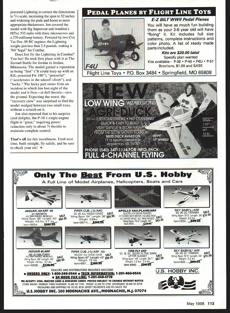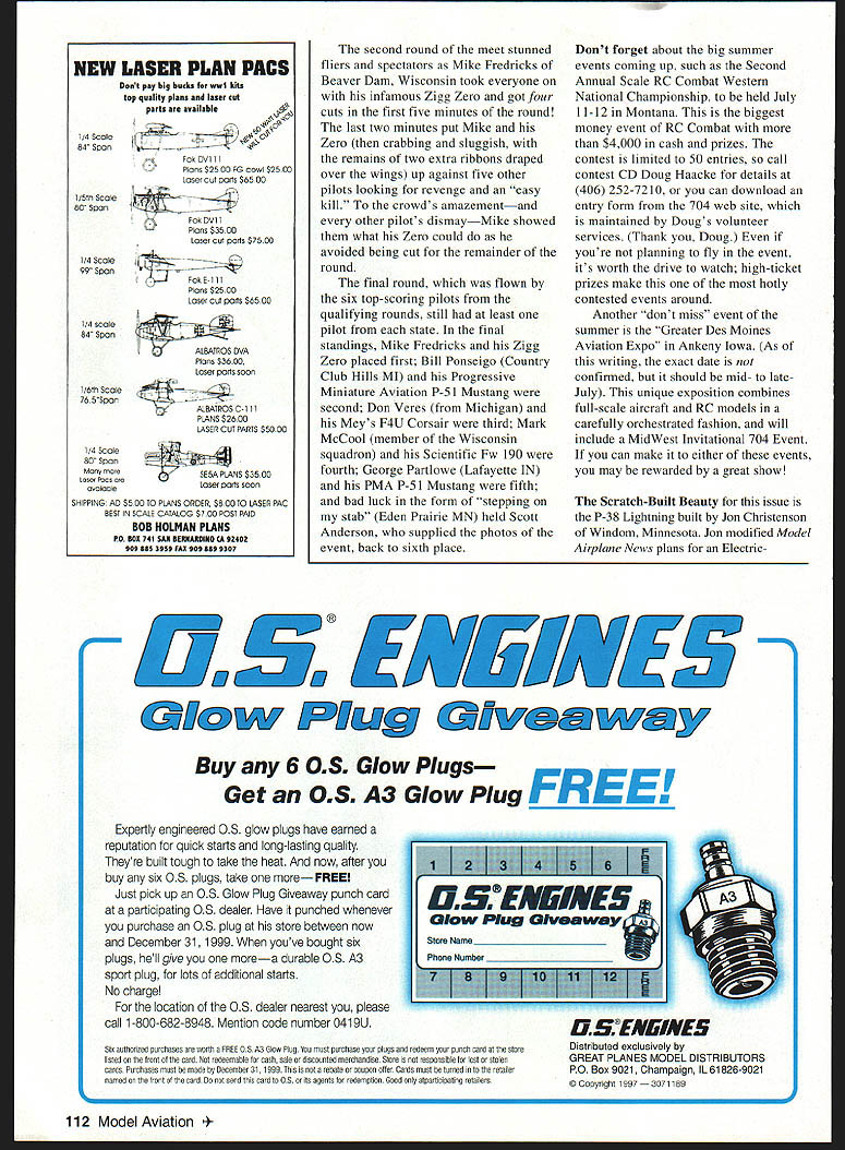 RADIO CONTROL COMBAT U 1 x UK THE BIGGEST news 704 Scale Radio Control RC Combat isnt new kit rules change its creation Special Interest Group SIG American Scale Dogfighters Association ADA group formed number reasons important other SICs people involved event can use experience promote direct its future Direction understand 704 Scale Combat understand impact changes have important ensure continued growth As SIC member can involved running organization propose vote potential rule changes have access Members section ASDA web site receive SIC newsletter 704 RC Combat pilots SIC members will benefit ASDA having sanctioned events fly events will run uniformly ever-better safety goals place 704 events today Information about SIC SIC membership can obtained writing ASDA Membership Department 20300 Lochmoor Harper Woods MI 48225 contact ASDA via Internet http/imtnet/-ims/Combat/combathtm download membership application some other neat stuff Event Coverage Ive received great photos couple falls 704 Combat events first packet pictures First Annual Blackfoot Idaho Combat Championship held September 20 Despite miserable weather offered cold strong winds 75 spectators showed up watch 10 pilots battle out Idaho pilots famous variety airplanes fly models scratch-built crowd treated Oscars Fiats Martin-Bakers battling out Mustangs Messerschmitts Spitfires Contest Director CD Wayne Van Orden wowed crowd gave lunchtime flight display 262 powered twin lOs dust settled blew away Colby Hone scratch-built Martin Baker MB-3 came away top honors Twenty-four hours later 1475 miles away Suburban Aerolub Chicago held its Second Annual Midwest Open 704 Combat fliers Chicago skies beautiful little no wind far cry Idaho event everything else similar good crowds 11 pilots hot action skies pilots came five states event pitted some experienced Combat fliers US against other May1998 111 Blackfoot fliers L-R Ron OBrien Wynn Hone Jesse OBrien Jared Sebring Colby Hone Wayne Van Orden Brett Anderson Eddy Murdock Richard Daley Josh Suburban Aerolub Chicago Second Annual Midwest Open Everything need some funil pilots 23 airplanes Scratch-Built Beauty Jon Christenson P-38 Model spans 52 inches has Sig Supercoat covering weighs less 25 pounds second round meet stunned fliers spectators Mike Fredricks Beaver Dam Wisconsin took everyone infamous Zigg Zero got four cuts first five minutes round last two minutes put Mike Zero crabbing sluggish remains two extra ribbons draped over wings up against five other pilots looking revenge easy kill crowds amazementand other pilots dismayMike showed what Zero could avoided being cut remainder round final round flown six top-scoring pilots qualifying rounds still least pilot state final standings Mike Fredricks Zigg Zero placed first Bill Ponseigo Country Club Hills MI Progressive Miniature Aviation P-5 1 Mustang second Don Veres Michigan Meys F4U Corsair third Mark MeCool member Wisconsin squadron Scientific Fw 190 fourth George Partlowe Lafayette IN PMA P-SI Mustang fifth bad luck form stepping stab Eden Prairie MN held Scott Anderson supplied photos event back sixth place Dont forget about big summer events coming up such Second Annual Scale RC Combat Western National Championship held July 11-12 Montana biggest money event RC Combat $4000 cash prizes contest limited 50 entries call contest CD Doug Haacke details 406 252-7210 can download entry form 704 web site maintained Dougs volunteer services Thank Doug youre planning fly event its worth drive watch high-ticket prizes make hotly contested events around Another dont miss event summer Greater Des Moines Aviation Expo Ankeny Iowa As writing exact date confirmed should mid- lateJuly unique exposition combines full-scale aircraft RC models carefully orchestrated fashion will include MidWest Invitational 704 Event can make either events may rewarded great show Scratch-Built Beauty issue P-38 Lightning built Jon Christenson Windom Minnesota Jon modified Model Airplane News plans ElectricGlow Plug Giveaway Buy 6 OMS Glow Plugs FREE Get OSM A3 Glow Plug _________ Expertly engineered 08 glow plugs have earned reputation quick starts long-lasting quality Theyre built tough take heat now after buy six 08 plugs take FREE Just pick up OS Glow Plug Giveaway punch card participating OS dealer Have punched whenever purchase OS plug store between now December 311999 youve bought six plugs hell give morea durable 05 A3 sport plug lots additional starts No charge location 05 dealer nearest please call 1 -800-682-8948 Mention code number 041 9U Six authorized purchases worth FREE OS A3 Glow Play must purchase p1090 redeem pooch curd ut otore isted trust ot tne card redeemable tor cash saie discoustod merchardise Store sot resporsihie tsr lost stoler cards Purchasex moot mode sy Decomoer 311999 sot rehate coupon offer Cards must turned retader named us tne frost ot tne cord rot sord cord 09 its ageots tsr redemptiso Good osly arparticgating retalers flSENEINE5 Distributed exclusively GREAT PLANES MODEL DISTRIBUTORS PO Box 9021 Champaign IL 61826-9021 @ copyright 19973071189 112 Model Aviation LASER PLAN PACS Dont pay big bucks wwl kits top quality plans laser cut parts available ce 217 Piana $2500 PG cowl $2500 aser cut Darts $65 00 Scale Pll Plana $3500 Laaer cut pada $7500 1/4 Scale 99 Span PokE-Ill Plans $2500 Laser cut pads $6500 ALBATROS DVA Plana $3600 Laaer pads soon l/6tPr Scale ALBAtROSC-ttt PLANS $2600 LASEIP cut PARTS $50 00 14 Scale Mono sereStSA PLANS $3500 Laser Pacs oreLasei pacs soon ovoloOle SHIPPiNG AD $500 TO PLANS ORDER $800 10 LAStR PAC tEST IN SCALE CAtALOG $700 POST PAID BOB HOLMAN PLANS PO 801 74t SAN BERNANOINO CA 82432 eve 885 3858 FAR 808 888 8307 I GIowPIaagGIinuay1 IZSENEINES NameI Phone Numbe powered Lightning correct dimensions /12-scale increasing span 52 inches widening pods boom appropriate thicknesses Jon covered model Sig Supercoat installed HiTec 535 radio three microservos 270 milliamp battery Powered two Cox Tee Dee 