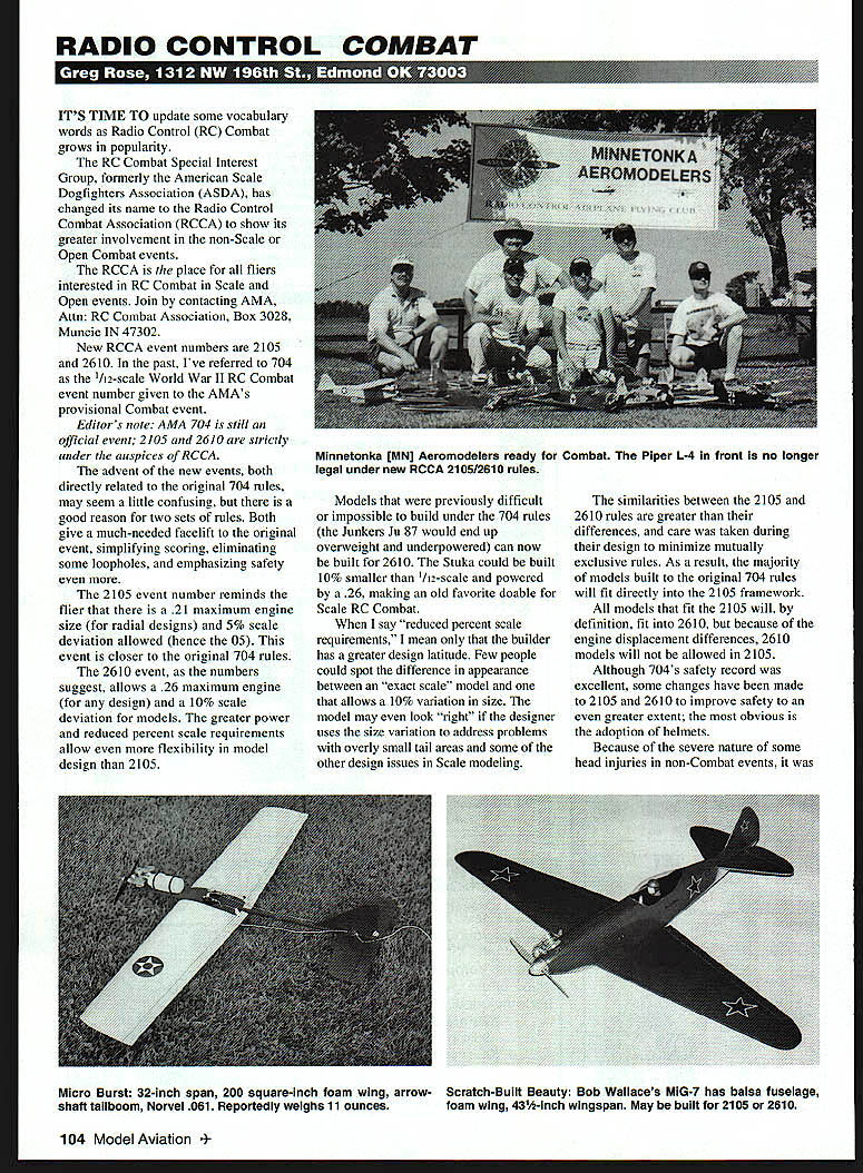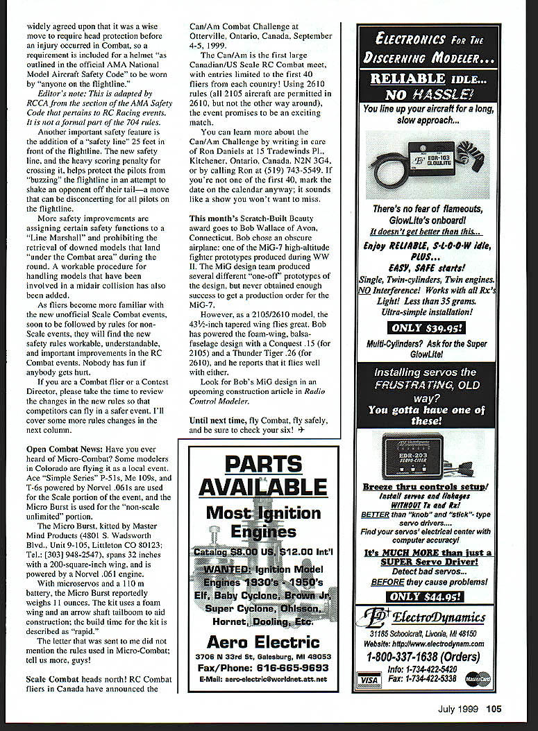RADIO CONTROL COMBAT k1YU ITS TIME TO update some vocabulary words Radio Control RC Combat grows popularity RC Combat Special Interest Group formerly American Scale Dogfighters Association ASDA has changed its name Radio Control Combat Association RCCA show its greater involvement non-Scale Open Combat events RCCA place fliers interested RC Combat Scale Open events Join contacting AMA Attn RC Combat Association Box 3028 Muncie IN 47302 New RCCA event numbers 2105 2610 past Ive referred 704 1/i2-scale World War II RC Combat event number given AMAs provisional Combat event Editors note AMA 704 still official event 2105 2610 strictly under auspices RCCA advent new events both directly related tbe original 704 rules may seem little confusing good reason two sets rules Both give much-needed facelift original event simplifying scoring eliminating some loopholes emphasizing safety 2105 event number reminds flier 21 maximum engine size radial designs 5% scale deviation allowed hence 05 event closer original 704 rules 2610 event numbers suggest allows 26 maximum engine design 10% scale deviation models greater power reduced percent scale requirements allow flexibility model design 2105 Models previously difficult impossible build under 704 rules Junkers Ju 87 would end up overweight underpowered can now built 2610 Stuka could built 10% smaller /12-scale powered 26 making old favorite doable Scale RC Combat say reduced percent scale requirements mean builder has greater design latitude Few people could spot difference appearance between exact scale model allows 10% variation size model may look right designer uses size variation address problems overly small tail areas some other design issues Scale modeling similarities between 2105 2610 rules greater differences care taken during design minimize mutually exclusive rules As result majority models built original 704 rules will fit directly 2105 framework models fit 2105 will definition fit 2610 because engine displacement differences 2610 models will allowed 2105 Although 704s safety record excellent some changes have made 2105 2610 improve safety greater extent obvious adoption helmets Because severe nature some head injuries non-Combat events 104 Model Aviation etonka [MN] Aeromodelers ready Combat Piper L-4 front no longer legal under new RCGA 210512610 rules Micro Burst 32-inch span 200 square-inch foam wing arrow- Scratch-Built Beauty Bob Wallaces MiG-7 has balsa fuselage shaft tailboom Norvel 061 Reportedly weighs 11 ounces foam wing 431/2-inch wingspan May built 2105 2610 widely agreed upon wise move require head protection before injury occurred Combat requirement included helmet outlined official AMA National Model Aircraft Safety Code worn anyone flightline Editors note adapted RCCA section AMA Safety Code pertains RC Racing events formal part 704 rules Another important safety feature addition safety line 25 feet front flightline new safety line heavy scoring penalty crossing helps protect pilots buzzing flightline attempt shake opponent off taila move can disconcerting pilots flightline safety improvements assigning certain safety functions Line Marshall prohibiting retrieval downed models land under Combat area during round workable procedure handling models have involved midair collision has also added As fliers become familiar new unofficial Scale Combat events soon followed rules nonScale events will find new safety rules workable understandable important improvements RC Combat events Nobody has fun anybody gets hurt Combat flier Contest Director please take time review changes new rules competitors can fly safer event Ill cover some rules changes next column Open Combat News Have ever heard Micro-Combat Some modelers Colorado flying local event Ace Simple Series P-S ls 109s T-6s powered Norvel 06 used Scale portion event Micro Burst used non-scale unlimited portion Micro Burst kitted Master Mind Products 4801 5 Wadsworth Blvd Unit 9-105 Littleton CO 80123 Tel [303] 948-2547 spans 32 inches 200-square-inch wing powered Norvel 061 engine microservos 110 m battery Micro Burst reportedly weighs 11 ounces kit uses foam wing arrow shaft tailboom aid construction build time kit described rapid letter sent did mention rules used Micro-Combat tell us guys Scale Combat heads north RC Combat fliers Canada have announced Can/Am Combat Challenge Otterville Ontario Canada September 4-5 1999 Can/Am first large Canadian/US Scale RC Combat meet entries limited first 40 fliers country Using 2610 rules 2105 aircraft permitted 2610 other way around event promises exciting match can learn about Can/Am Challenge writing care Ron Daniels 15 Tradewinds P1 Kitchener Ontario Canada N2N 3G4 calling Ron 519 743-5549 youre first 40 mark date calendar anyway sounds like show wont want miss months Scratch-Built Beauty award goes Bob Wallace Avon Connecticut Bob chose obscure airplane MiG-7 high-altitude fighter prototypes produced during WW II MiG design team produced several different one-off prototypes design never obtained enough success get production order MiG-7 However 2105/2610 model 431/2-inch tapered wing flies great Bob has powered foam-wing balsafuselage design Conquest 15 2105 Thunder Tiger 26 2610 reports flies well either Look Bobs MiG design upcoming construction article Radio Control Modeler Until next time fly Combat fly safely sure check six y RELMILE S-L-O-D-W idle PLUS. E4SV 54Ff studs Single Twin-cylinders Twin engines VO Interftrence Works Rxs Light Less 35 grants Ultra-simple installation luLl 2LYU Multi-Cylinders Ask Super GlowLitel lastall saives tad liakeges wrvevrr tad Ri BETTER knob stick- type servo drivers.. Find your servos electrical center computer accuracy Its MUCH MORE lust SUPER Servo Driver Detect bad servos. BEFORE cause problems WI EWE Y VLI EectroDipiamics 31185 Schoolcraft Livonia Ml 48150 Website http//w#welecfrodynamcom 1-800-337-1638 Orders 1-734-422-5420 VISA Fax 1-734-422-5338 July1999 105 line up aircraft long slow