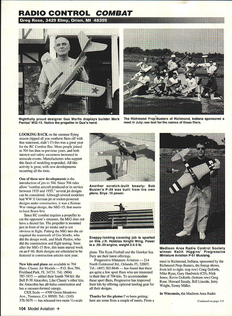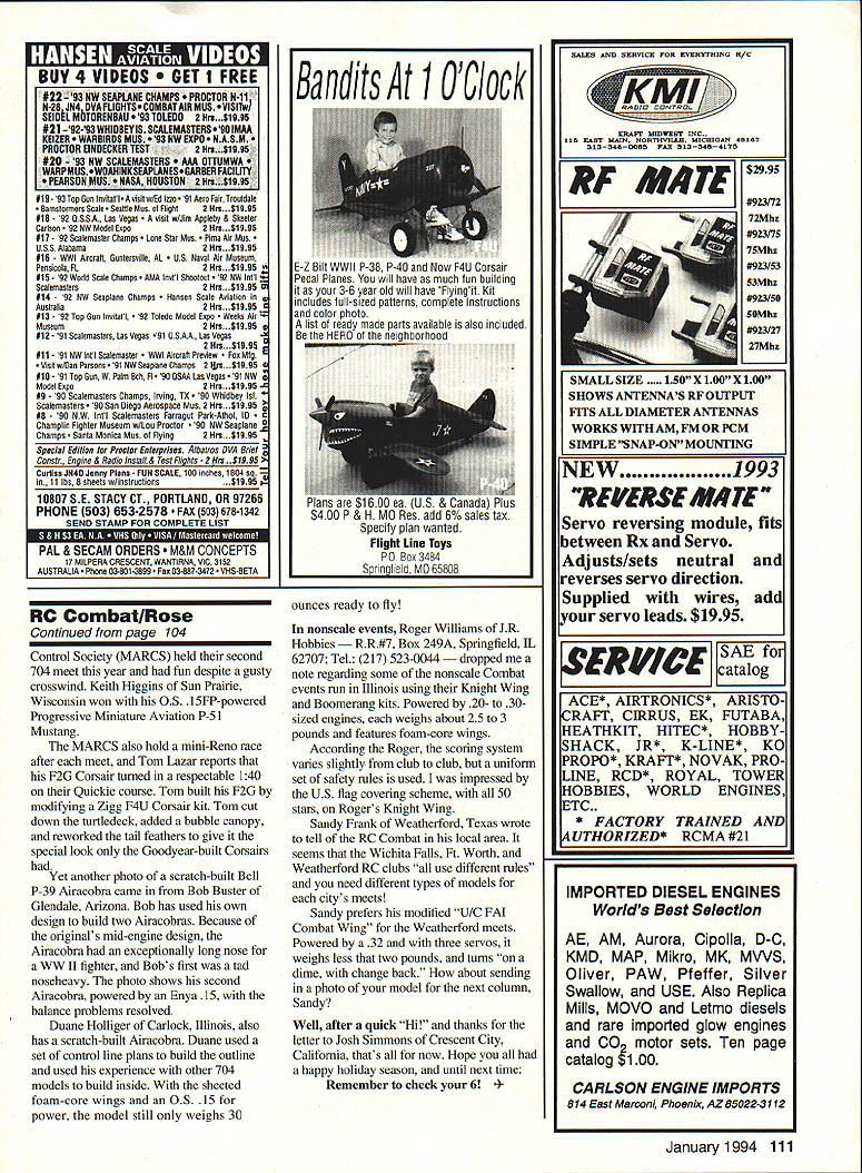 RADIO CONTROL COMBAT Ltf1U LOOKING BACK summer flying season tipped southern fliers off statement didnt great year RC Combat flier people joined 704 fun previous years both interest safety awareness increased nonscale events Manufacturers support facet modeling responded activity great new developments occurring time new developments introduction jets 704 Since 704 rules allow combat aircraft produced service between 1935 1955 several jet designs can considered Although several modelers WW II German jet rocket-powered designs under construction Korean War vintage design MiG-iS seems have flown first Since RC combat requires propeller cut opponents streamer MiG does have ducted fan propeller mounted just front jet intake obvious flight Putting MiG air required teamwork Gus Morfis did design work Mark Pantos did construction flight testing Soon after MiG-15 flew team started work F-86 Both designs scheduled featured construction articles next year New kits plans available 704 fliers Classic Air Models PO Box 784 Fruitland Park FL 34731 Tel 904 787-7475 d fourth 704 kit Bell P-39 Airacobra Like Classics other kits Airacobra has all-balsa construction has vacuum-formed canopy CRX Scale 4709 Green Meadows Ave Torrance CA 90505 Tel 310 378-5679 released two 1A2-scale plans Ryan Fireball Hawker Sea Fury latest offerings Progressive Miniature Aviation 214 North Goldenrod Rd Orlando FL 32807 Tel 407 382-8646 found quite few sport fliers interested line 704 kits accommodate sport fliers Progressive has improved kits offering optional landing gear designs Thanks photos Ive getting some couple meets meet Richmond Indiana sponsored Richmond Prop-Busters lineup shows left right top row Craig Goforth Mike Ryan Gary Hardwick CD Nick Jones Kevin Goforth bottom row Greg Rose Howard Steady Bill Lincoln Jerry Wright Sunny Miller Wisconsin Madison Area Radio Continued page 111 104 Model Aviation tfully proud designer Gus Morfis displays builder Mark Richmond PropBusters Richmond Indiana sponsored Pantos MiG-15 Notice propeller Guss hand meet July see text names fliers Another scratch-built beauty Bob Busters P-39 built own plans Enya 15 power Snappy-looking covering job sported JR Hobbies Knight Wing Power 20-30 engine weight 25-3 lb Madison Area Radio Control Society winner Keith Higgins Progressive Miniature Aviation P-51 Mustang RC Combat/Rose Continued page 104 Control Society MARCS held second 704 meet year fun despite gusty crosswind Keith Higgins Sun Prairie Wisconsin won 0S. l5FP-powered Progressive Miniature Aviation P-5 1 Mustang MARCS also hold mini-Reno race after meet Tom Lazar reports F2G Corsair turned respectable 140 Quickie course Tom built F2G modifying Zigg F4U Corsair kit Tom cut down turtledeck added bubble canopy reworked tail feathers give special look Goodyear-built Corsairs Yet another photo scratch-built Bell P-39 Airacobra came Bob Buster Glendale Arizona Bob has used own design build two Airacobras Because originals mid-engine design Airacobra exceptionally long nose WW II fighter Bobs first tad noseheavy photo shows second Airacobra powered Enya 15 balance problems resolved Duane Holliger Carlock Illinois also has scratch-built Airacobra Duane used set control line plans build outline used experience other 704 models build inside sheeted foam-core wings OS 15 power model still weighs 30 Bandits 1 OClock E-Z Bill WWII P-38 P-40 Now F4U Corsair Pedal Planes will have much fun building 3-6 year old will have Flyingit Kit includes full-sized patterns complete Instructions color photo list c made parts available also included ounces ready fly nonscale events Roger Williams JR Hobbies Box 249A Springfield IL 62707 Tel 217 523-0044 ped note regarding some nonscale Combat events run Illinois using Knight Wing Boomerang kits Powered 20- 30sized engines weighs about 25 3 pounds features foam-core wings According Roger scoring system varies slightly club club uniform set safety rules used impressed US flag covering scheme 50 stars Rogers Knight Wing Sandy Frank Weatherford Texas wrote tell RC Combat local area seems Wichita Falls Ft Worth Weatherford RC clubs use different rules need different types models citys meets Sandy prefers modified U/C FAI Combat Wing Weatherford meets Powered 32 three servos weighs less two pounds turns dime change back about sending photo model next column Sandy Well after quick Hi thanks letter Josh Simmons Crescent City California thats now Hope happy holiday season until next time Remember check 6 41993 REVERSE M4TE Servo reversing module fits between Rx Servo Adjusts/sets neutral reverses servo direction Supplied wires add servo leads $1995 abFagmhr SAB ~hIVW catalog ACE* AIRTRONICS* ARISTO CRAFT CIRRUS EK FUTABA HEATHKIT HITEC* HOBBY SHACK JR* KLINE* KC PROPO* KRAFT* NOVAK PRO LINE RCD* ROYAL TOWER HOBBIES WORLD ENGINES ETC. * FACTORY TRAINED AND 4UTHORIZED* RCMA #21 IMPORTED DIESEL ENGINES Worlds Best Selection AE AM Aurora Cipolla D-C KMD MAP Mikro MK MWS Oliver PAW Pfeffer Silver Swallow USE Also Replica Mills MOVO Letmo diesels rare imported glow engines CO motor sets Ten page catalog 00 CARLSON ENGINE IMPORTS 814 East Marconi Phoenx AZ 85022-3112 January1994 111 Buy 4 VIDEOS 1 FREE #22 -93 NW SEAPLANE CHAMPS TOR N-il N-28 JN4 OVA FLIGHTSCOMDATAIR MUS VISITW SEIDk MbTORENBAU OLEDO 2 Hm.$1995 #21 92-93 WHIOBEY IS SCALEMASTERS90 MM KEIZER IRDS MUS W EXPO . PROCTOR EINOECKER TEST 2 Nrs.51995 #20 -93 NW SCALEMASTERS OTTUMWA WARPMUS.WOAiIINKSEAPIANESGARBERFACILITY • PEARSON MUS HOUSTON 2 Nra. $1995 SALES AND SERVICE FOR EVERYTHING R/C ERAPI idmwunr INC 6 EAST MAIN NORTHVJLLK M CHIGAN 48187 313 248 0085 FAX SIN 548 4 75 II S #19 -93 Tsp Gus Invilati t wltd Inns era Fair Troaldale Barvstsrmers Scale tle Mis Flight 2 Hrs.$1995 #18 92 QSSA Las vegas vlsi w/Jim Applehy & Sheeter Cannon W Model tips 2 Hrs.S1 995 92 Sculemaster champs Less Star Mis Air Mis uss Alabama2 Hrs.$1995 WWI Aircraft Guntersville AL aval Air Museum Pensicola FL2ttrs.S1995 92 World Scale Ch