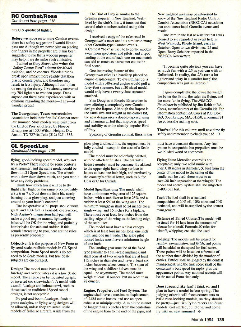 RADIO CONTROL COMBAT HAPPY NEW YEAR 1993 banner year RC combat events both 704 Scale nonscale ever before growth facet RC sport may attributed number things First more fliers see events realize small models fly well idea big models fly little ones flit stops modelers considering smaller designs may some truth lighter models such Texaco scale slam Texaco scale enjoy very much size weight power 704 Combat models balanced smooth realistic flying package Anyone has seen fly can attest onetwelfth scale 109 15 does notflit Another testament models excellent flying characteristics growing number kits plans sold solely sport flying also within reach both skill level pocketbook average flier use sport engines three- fourchannel radios small inexpensive kits allows modeler enjoy thrills events overextending modeling budget biggest reason growth RC combat seems events just plainfun havent tried Combat yet build winter give try Speaking Fun highlights flying season regional 704 meet held year Prop Busters Richmond Indiana Gary Mr 109 Hardwick CDs entire Prop Buster club helps make great experience fliers spectatc s alike nostalgic mood set playing Glen Miller tunes WW II broadcasts over sound system fall fourteen fliers participated flying models various sizes Jerry Wrights diminutive Polikarpov 1-17 several F4U Corsairs As may able tell photograph weather cool action hot Pictured group shot L-R standing Steve Blakeley Jerry Wright Mike Ryan Bob Ryan Gary Hardwick Wayne Norris Greg Rose kneeling Dave Lemke Tony Click Kurt Ziegler Vic Verhasselt Bill Lincoln Terry Garrett Nick Jones second photo shows five trophy winners left right First place Dave Lemke second place Wanye Norris third Jerry Wright tie fourth father son team Mike Bob Ryan end meet everyone able walk away prize Gary Hardwick asked thank folks Custom Cutters Progressive Miniature Aircraft Ziggs Originalsall manufacturers kits 704for help prizes scratch-built beauty month has go models flown Richmond meet Bill Lincoln built 109 Gus Morfis plans modifying incorporate lightweight honeycomb cut foam cores Bill also vacuum-formed perfect canopy model Bills 109 weighed less two pounds alas know old adage prettier plane shorter its life What may have radio glitch put dramatic very scalelike end Bills model Down Out Bill will back next year new 704 modeljust good Im sure other 704 Combat news earlier column prematurely mentioned Precision Aeros introduction FW-190D kit Well after whole summer flight testing perfect airfoil Precisions Dora has finally arrived appears have worth wait kit features vacuum-formed top mated quick-building balsa fuselage presheeted foam core wings Ron Eigenschink Precision sent picture new kit can seen FW-190D builds attractive model can contact Precision 1561 River Highlands Dr Oconomowoc WI 53066 Tel 414 567-5341 model pictured weighed slightly under two pounds OS Max l5FP miniservos camouflage paint scheme airbrushed over light blue MonoKote 1A2-scale German markings purchased Major Decals supply finishing touches Gus Morfis keeping scratch-builders busy plans 704 latest offerings CRX Scale Messerschmitt 262 jet designed twin lOs Yak 137 9 family Soviet fighters can reach CRX 4709 Green Meadows Ave Torrance CA 90505 Tel 310 378-5679 often-overlooked Yaks represented some finest fighters designed during WW II also some numerically important fighters produced examples Yak 9 built Continued page 13S 112 Model Aviation Busters Richmond Indiana hold annual Regional 704 meet names text Precision Aeros Fw190 D now available Ill-fated 109 Bill Lincoln scratch-built beauty modified Gus Morfis plans Georgetown Texas Aeromodelers Associations first RC Combat meet Hot-flying Raptor new Combat design kitted Phoebe Enterprises RC CombatlRose Continued page 112 US-produced fighter Before move Combat events safety suggestion would like pass Although never plan placing fingers propeller arc has suggested wooden propeller may help make such mistake talked Gary Shaw writes Safety Comes First colunm Model Aviation concurs Wooden props break upon impact readily plastic counterparts therefore may result less injury Although dont plan testing theory Ive already converted 704 fighters wooden props Does anyone out have experiences opinions regarding meritsif anyof wooden props Georgetown Texas Aeromodelers Association held first RC Combat meet last summer Most models built Bird Prey kit offered Phoebe Enterprises 1500 Wilson Heights Dr Austin TX 78746 Tel 512 327-4335 Bird Prey similar Gremlin popular New England Wellliked clubs fliers turns out several club members soloed using design received copy rules used Georgetowns meet similar other Gremlin-type Combat events Combat box used keep models away spectators pilots spot landing end one-on-one match can add much streamer cut final score interesting feature Georgetown rules handicap placed engine displacement things up model 40-sized engine would pull forty-foot streamer 20-sized model would have twenty-foot streamer attached Stan Douglas Phoebe Enterprises now offering completely new Combat design Raptor Although Raptor same size weight earlier kit new design uses double-tapered wing laminar airfoil improves speed stability over already-popular Bird Prey Speaking Gremlin combat fliers New England area may interested know New England Radio Control Combat Association NERCCA newsletter announces local Gremlin events results item last newsletter pleased see regarded event held West Warwick Rhode Island early October Open two divisions 25 Open Barry Schubert reported NERCCA Newsletter became quite obvious can have much fun 25 can Unlimited reality 25s turn lot tighter play smaller box competition just intense agree completely lower weight better flying safer flying fun flying NERCCA Newsletter published Jim Reith RA Cores manufacturers Gremlin kit information contact RA Cores PO Box 863 Southbridge MA 01550 nominal $1 fee covers mailing cost Thats column until next time fly safely remember ch