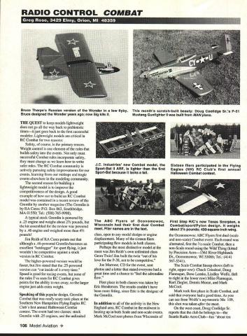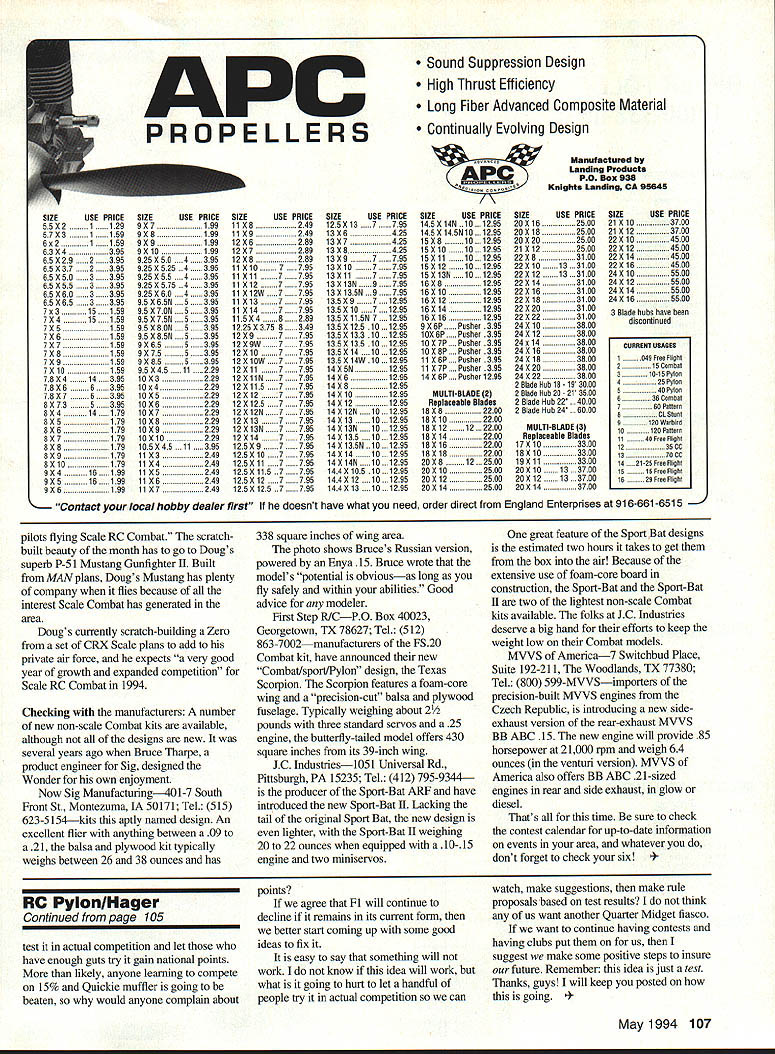 RADIO CONTROL COMBAT L17LIU TILE QUEST keep models lightweight does go way back prehistoric timesit just goes back first successful modeler Lightweight models critical RC Combat two reasons Safety course primary reason Weight control element rules builds safety events must successful Combat rules incorporate safety must change learn write safer rules RC Combat community actively pursuing safety improvements events learning mishaps tragic events elsewhere modeling community second reason building lightweight model improve competitiveness design good example build RC Combat model contained recent review Gremlin another magazine Gremlin RA Cores PO Box 863 Southbridge MA 01550 Tel 508 765-9998 typical stock Gremlin powered 25 engine weighs about 2 pounds kit assembled review powered 46 engine weighed 41/2 pounds Jim Reith RA Cores points out although 46-powered Gremlin becomes excellent hotdogger sport flying just wouldnt competitive against stock version RC Combat higher-powered version would faster Jim stated 25-powered version can cut inside time Speed good racing events rules Ive seen RC Combat gives points ability run away larger engine just adds extra weight Speaking popular design Gremlin Combat really scary took place Southern New Hampshire Flying Eagles RC Clubs first annual Halloween Combat contest event two classes stock Gremlin 25 engines unlimited class open model design engine displacement sixteen fliers participating flew models both classes Perhaps distinctive model meet Jim Reiths own unlimited class Grem Twin Jim built twin out love P-38 competitive Joe Marrone CD event sent photos letter stated everyone great time chance feel adrenaline flow First place both classes taken Eric Henderson results couldnt have fitting since Eric designer Gremlin addition activity New England area RC Combat midwest heating up both Scale non-scale events Mark McCool sent photos Wisconsin Oconomowoc ABC flyers first dual scale non-scale Combat event round alternated first 1A2-scale Combat non-Scale round using Wild Thing kitted Precision Aero1561 River Highlands Dr Oconomowoc WI 53066 Tel 414 567-5341 Scale Combat lineup shows left right upper row Chuck Grindrod Doug Flannagan Dave Lemke Lindley Wolfe left right lower row Mike Flannagan Kurt Ziegler Dennis Moran Mark McCool Mark took first place Scale Combat said everyone good time As can see Wolfes asymmetric 109 shot taken after meet west coast Doug Coolidge Sr reports club belongs tothe Seaffle Radio Aero Clubhas about ten 106 Model Aviation e Tharpes Russian version Wonder low flyby months scratch-built beauty Doug Coolidge Srs P-51 Bruce designed Wonder years ago now Sig kits Mustang Gunfighter II built MAN plans JC Industries new Combat model Sixteen fliers participated Flying Sport-Bat II ARF lighter first Eagles NH RC Clubs first annual Sport-Bat because lacks tail Halloween Combat contest ABC Flyers Oconomowoc First Step RICs new Texas Scorpion Wisconsin first dual Combat CombatlsportlPylon design weighs meet Flier names text about 2 pounds 430-square-inch wing SIZEUSEPRICE 55X21129 57X31159 6x21159 63X4395 65X292395 65X372395 65X503395 65 X553395 65 X603395 65 X653395 7x315159 7X415159 7X5159 7X6159 7X7159 7X8159 7X9159 7X10159 78X414395 78X66395 78X76395 8X73S395 8X414179 8X5179 8X6179 8X7179 8X8179 8X9179 8X10179 9X416199 9X516199 9X6199 APC PROPELLERS SIZEUSE PRICE 9X7199 9X8199 9X9199 9X10199 925 X 50 .. 4395 925 XS25 4395 925 X 55 .. 4395 925 XS75 4395 925 X 60 .. 4395 95 X 6SN .. 5395 95 X 7ON .. 5395 95 X 7SN .. 5395 95 X 8ON .. 5395 95 X 8SN .. 5395 9X65 395 9X75 395 9X85 395 95 X45 29 10X3229 10x4229 1OXS229 10X6229 10X7229 10X8229 10X9229 10X10229 105X45 11395 11X3249 11X4249 11XS249 11X6249 11X7249 Sound Suppression Design High Thrust Efficiency Long Fiber Advanced Composite Material Continually Evolving Design Manufactured Landing Poducte PO Box 038 Knights Landing CA 05645 SIZEUSE PRICE 11X8249 11X9249 12X6289 12X7289 12X8289 IiXiO7795 liXil7795 11X127795 11X12W7795 11X137795 11X147795 115X48289 1225 X 3758349 12X97795 12X9W7795 12X107795 12X10W7795 12X117795 12X11N7795 12X1157795 12X127795 12X1257795 12X12N7795 12X137795 12X13N7795 12X147795 125X97795 125X107795 12SX117795 125X1157795 125X127795 125X1257795 SIZEUSE PRICE 125X137795 13X6425 13X7425 13X8425 13X97795 13X107795 13X117795 13X13N9795 13X13SN.9795 135X971295 13SX1O71295 13SX11SN 71295 135 X 125 10 1295 135X133 101295 135 X 135 1295 135X14 101295 135 X 14W 1295 14XSN1295 14X61295 14X81295 14X101295 14X121295 14X12N101295 14X13101295 14X13N101295 14X135 101295 14X13SN.10.1295 14X14101295 14X14N101295 144X 105 101295 144X12 101295 144 X 13 .. 10 . 1295 SIZEUSE PRICE 145 X 14N . 10 . 1295 145 X14SN1O 1295 15X8101295 1SX1O101295 1SX11101295 15X12101295 1SX13N101295 16X81295 16X101295 16X121295 16X141295 16X161295 9X6PPusher 395 10X6PPusher 395 1OX7P .. Pusher 395 1OX8P .. Pusher 395 lix 6P .. Pusher 11 X7P.. Pusher 395 14 X 6P . . Pusher 1295 MULTI-BLADE 2 Replaceable Blades 18X82209 18X102200 18X12122200 18X142200 18X162200 18X182200 20X8122500 20X102500 20X122500 20X142500 SIZEUSE PRICE 20X162500 20X182500 20 X 202500 21X122500 22X83100 22X10133100 22X12133100 22X143100 22X163100 22X183100 22X203100 22X223100 24X103800 24X123800 24x143800 24X163800 24X183800 24 X 203800 24X223800 2 Blade Huh 18- 19 3000 2 Blade Huh 20- 21 3500 2 Blade Hub 22 . 4000 2 Blade Hub 24 . 6000 MULTI-BLADE 3 Replaceable Blades 17X103300 18X103300 lOX 113300 20X10133700 20X12133700 20X143700 SIZEUSE PRICE 21 X 103700 21X123700 22X104500 22X124500 22X144500 22X164500 24X105500 24X125500 24X145500 24X165500 3 Blade hubs have heen discontinued CURRENT USCSEB 040 Free FliutO 2ibCombat ta-la Pylon 42SPillon 54OPylot 36 Combat 7 unorn CL stunt U arbird 120 Pattern 1140 Free Flight 1235CC 1370CC 1421-25 Free Flight tS15 Free Flight 20 Free Flight Contact local hobby dealer first doesnt have what need order direct England Enterprises 916-661-6515 i pilots flying Scale RC Combat scratchbuilt beauty