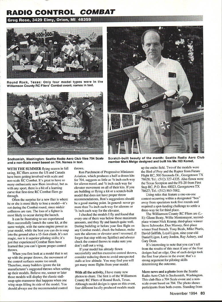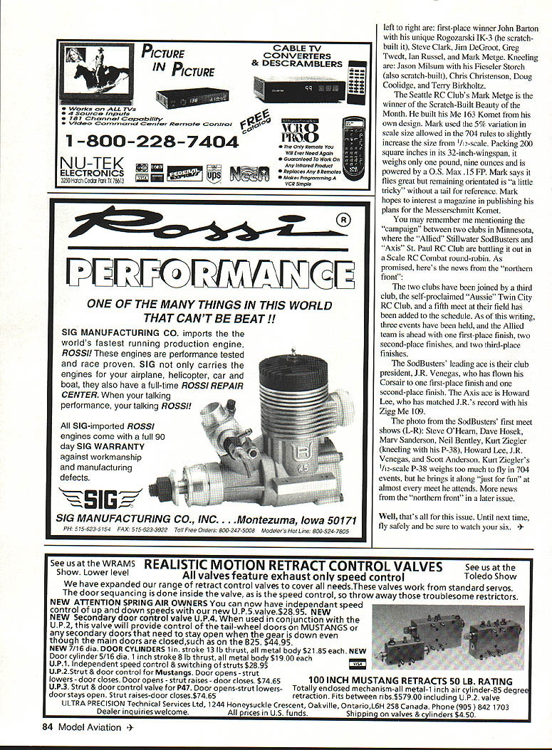 RADIO CONTROL COMBAT K t-tJ f&L-~ V4ZU j WITH THE SUNLlVIER flying season full swing RC fliers across US Canada have getting involved scale non-scale RC Combat Its great have enthusiastic new fliers involved sport bit learning curve first-time RC Combat fliers go through Often surprise new flier likely lose modelits during Combat round since midair collisions rare loss fighter likely occur during launch can frustrating see experienced fliers successfully launch same kit same weight same engine power model best can snap ground after 15-foot climb Its magic nor superior piloting skills its just experienced Combat fliers have learned cant ignore proper control throws first look model set up proper throws movement control surfaces seems too small Therefore builders ignore kit manufacturers suggested throws setting up models Believe sooner later models will display classic stallsnap-spin-maneuver happens wing stops lifting its side model should always use recommended control throws Ron Parchment Progressive Miniature Aviation produces half-a-dozen kits 704 suggests little inch way aileron travel 1/4 inch way elevator movement kits building flying kit scratch-built model does have proper throw recommendations Rons suggestions should good starting point general never go /16 inch way ailerons 3/ inch way elevator checked models fly found below maximum amounts fly launch quite well During building before first flight Combat model check balance make sure ailerons elevator arent reversed forgot step Spitfire always check control throws make sure dont stall out wing model has already flown successfully has excessive control throws consider reducing avoid unexpected stalls low altitude may find will get flights model activity have new photos share first Williamson County RC Fliers Round Rock Texas Although model design open event four different locally produced models made up entire field Two models Bird Prey Raptor Future Flight RC 500 Serenada Dr Georgetown TX 78628 Tel 512 327-4335 Also flown Texas Scorpion FS-20 First Step RC PO Box 40023 Georgetown TX 78627 Tel 512 863-7002 Using rules feature one-on-one contest occurring within designated box away spectators took five rounds required spot-landing challenge settle three-way tie third place Williamson County RC Fliers L R Glenn Beaty Willie Montemayor secondplace winner Nick Kramp third-place winner Steve Schroeder Dan Massey first-place winner Fred French Tony Beals Mike Pharis David Griffith Loyd Ligon nine-year-old Daniel Ligon Larry Jordon Ray Asbery Gary Dean Its interesting note cant tell results meet four designs edge design took first four places event thats strong argument piloting skills determining outcome news photo Seattle Radio Aero Club Snohomish Washington club flies 704 Scale event nonscale event based 704 photo shows participants both events Standing November1994 83 Round Rock Texas Only four model types Williamson County RC Fliers Combat event names text Snohomish Washington Seattle Radio Aero Club flies 704 Scale non-Scale event based 704 Names text Scratch-built beauty month Seattle Radio Aero Club member Mark Metge designed built Me163 Komet j u PICTURE IN PICTURE WOrks ALL TVs 4 Soroe Irpcts 781 ChonreI CoobIIty Voeo Commana Center Remote Control CABLE TV CONVERTERS & DESCRAMBLERS 1-800-228-7404 yRemoe WII Eve NeedAgon Guoron eed Wok Any nfroredPoduc 5Jfl0 Rep oces Any 6 Remo es NU-TEK ELECTRONICS 3250 Hatch Cedar PoX TX 78613jJT5TJS Mokes Flog 0mm ng left right first-place winner John Barton unique Rogozarski IK-3 scratchbuilt Steve Clark Jim DeGroot Greg Twedt Ian Russel Mark Metge Kneeling Jason Milsum Fieseler Storch also scratch-built Chris Christenson Doug Coolidge Terry Birkhohz Seattle RC Clubs Mark Metge winner Scratch-Built Beauty Month built 163 Komet own design Mark used 5% variation scale size allowed 704 rules slightly increase size 1/I2-scale Packing 200 square inches its 32-inch-wingspan weighs pound nine ounces powered OS Max 15 PP Mark says flies great remaining orientated little tricky tail reference Mark hopes interest magazine publishing plans Messerschmiitt Komet may remember mentioning campaign between two clubs Minnesota Allied Stillwater SodBusters Axis St Paul RC Club battling out Scale RC Combat round-robin As promised heres news northern front two clubs have joined third club self-proclaimed Aussie Twin City RC Club fifth meet field has added schedule As writing three events have held Allied team ahead first-place finish two second-place finishes two third-place finishes SodBusters leading ace club president JR Venegas has flown Corsair first-place finish second-place finish Axis ace Howard Lee has matched JR cord Zigg 109 photo SodBusters first meet shows L-R Steve OHearn Dave Hosek Mary Sanderson Neil Bentley Kurt Ziegler kneeling P-38 Howard Lee JR Venegas Scott Anderson Kurt Zieglers /12-scale P-38 weighs too much fly 704 events brings along just fun almost meet attends news northern front later issue Well thats issue Until next time fly safely sure watch six 484 Model Aviation NEE ONE OF THE MANY THINGS IN THIS WORLD THAT CANT BE BEAT! SIG MANUFACTURING CO imports the worlds fastest running production engine ROSS! engines performance tested race proven SIG carries engines airplane helicopter car boat also have full-time ROSS REPAIR CENTER talking performance talking ROSS! SIG-imported ROSS engines come full 90 day SIG WARRANTY against workmanship manufacturing defects ILi SIG MANUFACTURING CO INC..Montezuma Iowa 50171 PH 515 623 5154 FAX 515-623-3922 To/I Free Orders 800-247-5008 Modelers Hot Lne 800-524-7805 See us WRAMS REALISTIC MOTION RETRACT CONTROL VALVES See us Show Lower level valves feature exhaust speed control Toledo Show have expanded range retract control valves cover needsThese valves work standard servos door sequancing done inside valve speed control throw away troublesome restrictors NEW ATTENTION SPRING AIR OWNERS can now have indep end ant speed control up down speeds new 