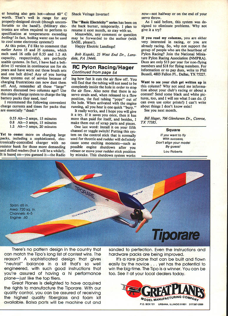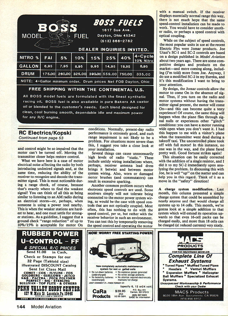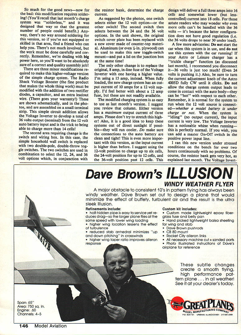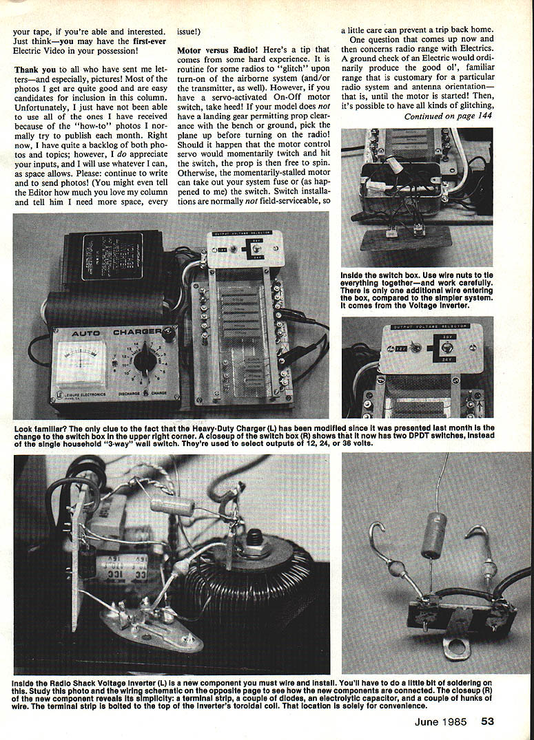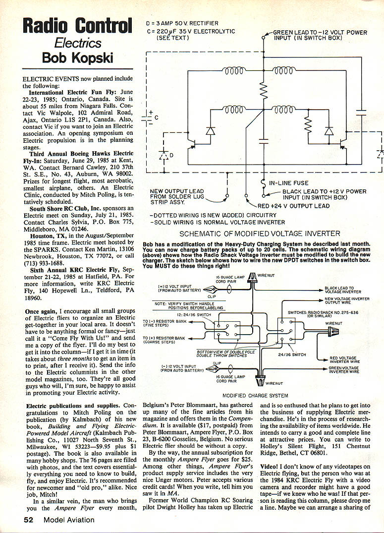 Radio Control Electrics Bob Kopski ELECTRIC EVENTS now planned include following International Electric Fun Fly June 22-23 1985 Ontario Canada Site about 55 miles Niagara Falls Con tact Vic Walpole 102 Admiral Road Ajax Ontario LiS 2P1 Canada Also contact Vic want join Electric association An opening symposium Electric propulsion planning stages Third Annual Boeing Hawks Electric Fly-Ia Saturday June 29 1985 Kent WA Contact Bernard Cawley 210 37th St SE No 43 Auburn WA 98002 Prizes longest flight acrobatic smallest airplane others An Electric Clinic conducted Mitch Poling ten tatively scheduled South Shore RC Club Inc sponsors Electric meet Sunday July 21 1985 Contact Charles Sylvia PO Box 775 Middleboro MA 01246 Houston TX August/September 1985 time frame Electric meet hosted SPARKS Contact Ken Martin 13106 Newbrook Houston TX 77072 call 713 933-1688 Sixth Annual KRC Electric Fly Sep tember 21-22 1985 Hatfield PA information write KRC Electric Fly 140 Hopewell Ln Teldford PA 18960 Once again encourage small groups Electric fliers organize Electric get-together local area doesnt have anything formal fancyjust call Come Fly Us send copy flyer Ill best get columnif get time takes about three months get item print after receive Send info Electric columnists other model magazines too Theyre good guys will Im sure happy assist promoting Electric activity Electric publications supplies Con gratulations Mitch Poling publication Kaimbach new book Building Flying ElectricPowered Model Aircraft Kaimbach PMb lishing Co 11027 North Seventh St Milwaukee WI 53223$995 plus $1 postage book also available hobby shops 76 pages filled photos text covers essential ly everything need know build fly enjoy Electric Its recommended newcomer old pro alike Nice job Mitch similar vein man brings Ampere Flyer month D 3AMP 50V RECTIFIER C 220jiF 35V ELECTROLYTIC SEE TEXT 1 -F IL OUTPUT LEAD FROM SOLDER LUG STRIP ASSY 6REEN LEADTO12 VOLT POWER INPUT IN SWITCH BOX ~~1 -LINE FUSE BLACK LEAD TO -1-12 V POWER UINPUT IN SWITCH BOX K RED 24 V OUTPUT LEAD -DOTTED WIRING IS NEW ADDED CIRCUITRY -SOLID WIRING IS NORMAL VOLTAGE INVERTER SCHEMATIC OF MODIFIED VOLTAGE INVERTER Bob has modification HavyDuty Charging System described last month can now charge battery packs up 20 ceils schematic wiring diagram above shows Radio Shack Voltage inverter must modified build new charger sketch beiow shows wire new DPDT switches switch box MUST things right 16 GUAGE LAMP jJ\WI RENUT CORD PAIR I2 VOLT INPUTNii CLIP ________________________ BLACK LEAD TO VOLTAGE INVERTER ______________________________NEW VOLTAGE INVERTER NOTE VERIFY SWITCH HANDLEOUTPUT WIRE POSITIONS BEFORE LABELING SWITCHES RADIO SHACK NO 275-636 I2 24/36 SWITCHIOR SIMILAR TO STOR BANK IFINE STEPS TO STOR BANK ICOARSE STEPS BOTTOM VIEW OF DOUBLE POLE DOUBLE THROW SWITCHES24/36 SWITCH RED VOLTAGE CLIPINVERTER WIRE _______________________ GREEN VOLTAGE INVERTER WIRE 1112 VOLT INPUT IFROMAUTO BATTERY C 16 GUAGE LAMP CORD PAIR 4 WIRENUT MODIFIED CHARGE SYSTEM Belgiums Peter Blommaart has gathered up fine articles magazine offers Compen dium available $17 postpaid Peter Blommaart Ampere Flyer PO Box 23 B-6200 Gosselies Belgium No serious Electric flier should copy way annual subscription monthly Ampere Flyer goes $25 Among other things Ampere Flyers product supply service includes very nice Unger motors Peter accepts various credit cards write tell him saw MA Former World Champion RC Soaring pilot Dwight Holley has taken up Electric enthused plans get business supplying Electric mer chandise Hes process research ing availability items worldwide intends carry good complete line attractive prices can write Holleys Silent Flight 151 Chestnut Ridge Bethel CT 06801 Video dont know videotapes Electric flying person 1984 KRC Electric Fly video camera recorder might have good tapeif knew per son reading column please drop line Maybe can arrange sharing 52 Model Aviation tape youre able interested Just thinkyou may have first-ever Electric Video possession Thank have sent let tersand especially pictures Most photos get quite good easy candidates inclusion column Unfortunately just have able use ones have received because how-to photos nor mally try publish month Right now have quite backlog both pho tos topics however appreciate inputs will use whatever can space allows Please continue write send photos might tell Editor much love column tell him need space issue Motor versus Radio Heres tip comes some hard experience routine some radios glitch upon turn-on airborne system and/or transmitter well However have servo-activated On-Off motor switch take heed model does have landing gear permitting prop clear ance bench ground pick plane up before turning radio Should happen motor control servo would momentarily twitch hit switch prop free spin Otherwise momentarily-stalled motor can take out system fuse hap pened switch Switch installa tions normally field-serviceable little care can prevent trip back home question comes up now concerns radio range Electrics ground check Electric would ordi narily produce good ol familiar range customary particular radio system antenna orientation until motor started its possible have kinds glitching Continued page 144 Look familiar clue fact HeavyDuty Charger L has modified since presented last month change switch box upper right corner cioseup switch box R shows now has two DPDT switches instead single household 3way wali switch Theyre used select outputs 12 24 36 voits inside Radio Shack Voitage inverter L new component must wire instali Youll have little bit soldering Study photo wiring schematic opposite page see new components connected closeup R new component reveais Its simplicity termInal strip couple diodes electrolytic capacItor coupie hunks wire terminsi strip boited top inverters toroidai coli iocation solely convenience RC Electrics/Kopski Continued page 53 control might impaired motor cant turned off Moving transmitter closer helps restore co