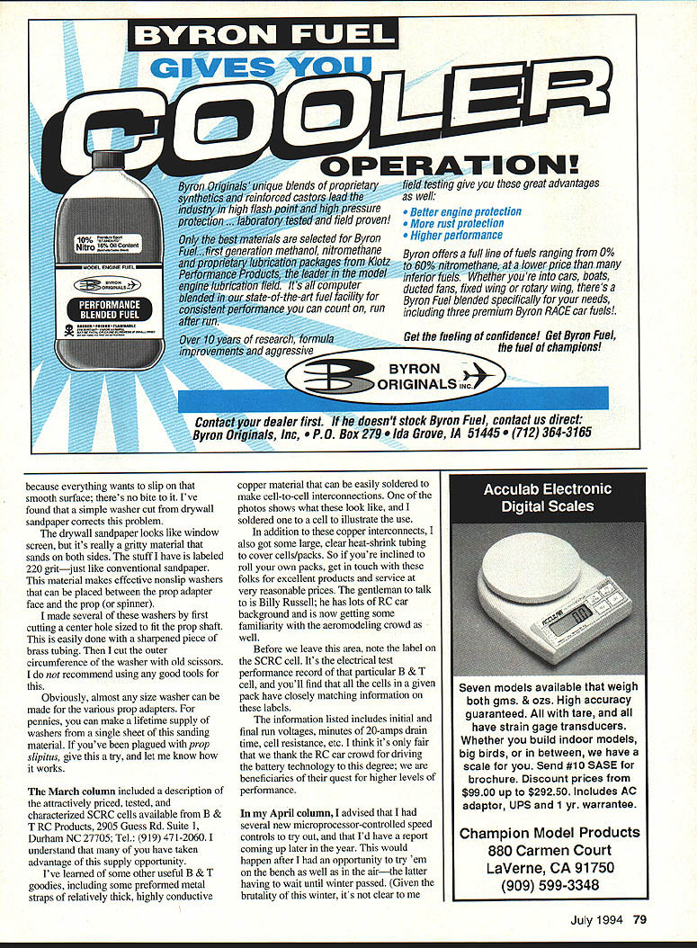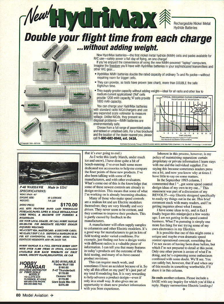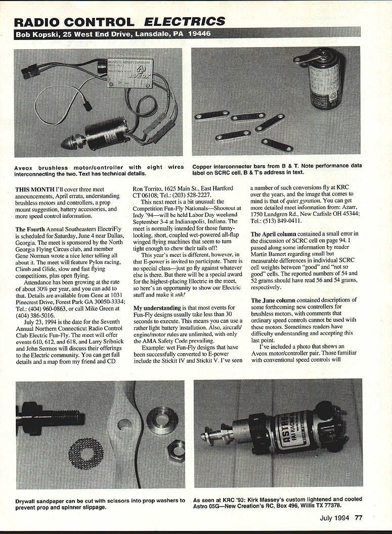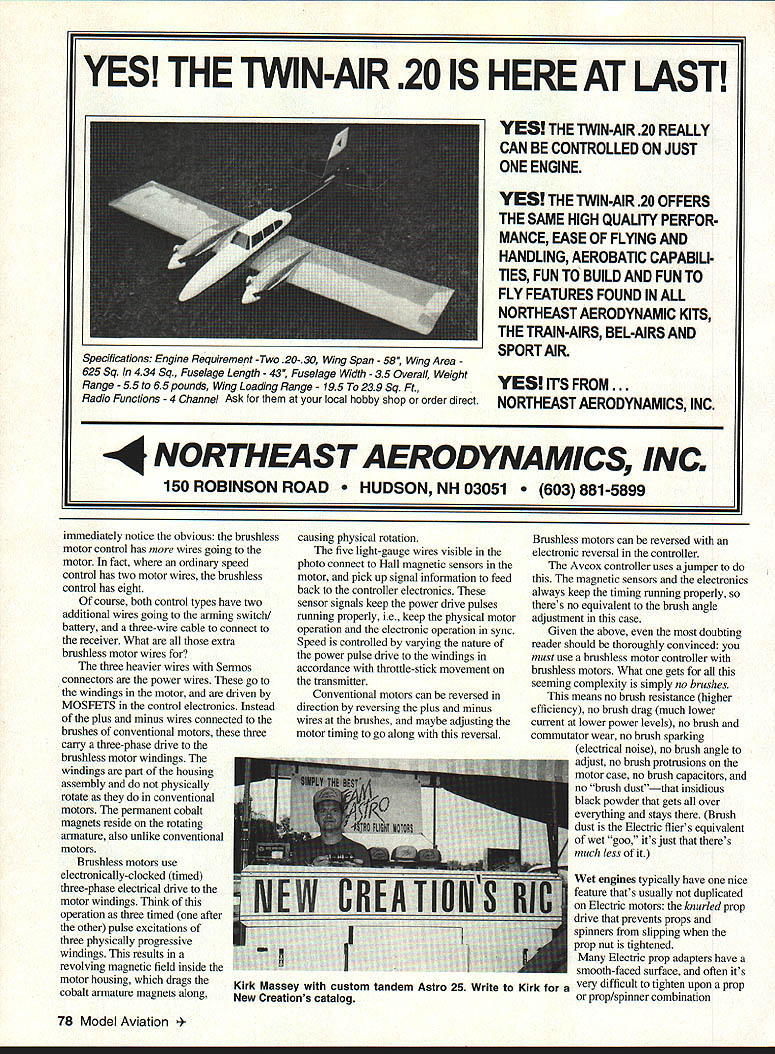 RADIO CONTROL ELECTRICS THIS MONTH Ill cover three meet announcements April errata understanding brushless motors controllers prop mount suggestion battery accessories speed control information Fourth Annual Southeastern ElectriFly scheduled Saturday June 4 near Dallas Georgia meet sponsored North Georgia Flying Circus club member Gene Norman wrote nice letter telling about meet will feature Pylon racing Climb Glide slow fast flying competitions plus open flying Attendance has growing rate about 30% per year can add Details available Gene 1031 Pinecrest Drive Forest Park GA 30050-3334 Tel 404 960-0863 call Mike Green 404 386-5016 July 23 1994 date Seventh Annual Northern Connecticut Radio Control Club Electric Fun-Fly meet will offer events 610 612 618 Larry Sribnick John Sermos will discuss offerings Electric community can get full details map friend CD Ron Torrito 1625 Maln St East Hartford CT 06108 Tel 203 528-2227 next meet bit unusual Competition Fun-Fly NationalsShootout Indy 94will held Labor Day weekend September 3-4 Indianapolis Indiana meet normally intended funnylooking short coupled wet-powered all-flap winged flying machines seem turn tight enough chew tails off years meet different however E-power invited participate no special classjust go fly against whatever else there will special award highest-placing Electric meet heres opportunity show Electric stuff make stik understanding events Fun-Fly designs usually take less 30 seconds execute means can use rather light battery installation Also aircraft] engine/motor rules unlimited AMA Safety Code prevailing Example wet Fun-Fly designs have successfully converted E-power include Stickit IV Stickit V Ive seen number such conversions fly KRC over years image comes mind quiet gyration can get detailed meet information Azarr 1750 Lundgren Rd New Carlisle OH 45344 Tel 513 849-0411 April column contained small error discussion SCRC cell page 94 passed along some information reader Martin Bamert regarding small measurable differences individual SCRC cell weights between good good cells reported numbers 54 52 grams should have read 56 54 grams respectively June column contained descriptions some forthcoming new controllers brushless motors comments ordinary speed controls cannot used motors Sometimes readers have difficulty understanding accepting last point Ive included photo shows Aveox motor/controller pair familiar conventional speed controls will July1994 77 Aveox brushless motor/controller eight wires Copper interconnecter bars B & T Note performance data interconnecting two Text has technical detailslabel SCRC cell B & Ts address text Drywall sandpaper can cut scissors prop washers toAs seen KRC 93 Kirk Masseys custom lightened cooled prevent prop spinner slippageAstro 05GNew Creations RC Box 496 Willis TX 77378 immediately notice obvious brushless motor control has wires going motor fact ordinary speed control has two motor wires brushless control has eight course both control types have two additional wires going arming switch battery three-wire cable connect receiver What extra brushless motor wires three heavier wires Sermos connectors power wires go windings motor driven MOSFETS control electronics Instead plus minus wires connected brushes conventional motors three carry three-phase drive brushless motor windings windings part housing assembly physically rotate conventional motors permanent cobalt magnets reside rotating armature also unlike conventional motors Brushless motors use electromcally-clocked timed three-phase electrical drive motor windings Think operation three timed after other pulse excitations three physically progressive windings results revolving magnetic field inside motor housing drags cobalt armature magnets along causing physical rotation five light-gauge wires visible photo connect Hall magnetic sensors motor pick up signal information feed back controller electronics sensor signals keep power drive pulses running properly ie keep physical motor operation electronic operation sync Speed controlled varying nature power pulse drive windings accordance throttle-stick movement transmitter Conventional motors can reversed direction reversing plus minus wires brushes maybe adjusting motor timing go along reversal Brushless motors can reversed electronic reversal controller Aveox controller uses jumper magnetic sensors electronics always keep timing running properly theres no equivalent brush angle adjustment case Given above doubting reader should thoroughly convinced must use brushless motor controller brushiess motors What gets seeming complexity simply no brushes means no brush resistance higher efficiency no brush drag much lower current lower power levels no brush commutator wear no brush sparking electrical noise no brush angle adjust no brush protrusions motor case no brush capacitors no brush dustthat insidious black powder gets over everything stays Brush dust Electric fliers equivalent wet goo its just theres much less Wet engines typically have nice feature thats usually duplicated Electric motors knurled prop drive prevents props spinners slipping prop nut tightened Electric prop adapters have smooth-faced surface often its Kirk Massey custom tandem Astro 25 Write Kirk very difficult tighten upon prop New Creations catalogor prop/spinner combination 78 Model Aviation 4YES THE TWIN-AIR 20 IS HERE AT LAST YES THE TWIN-AIR 20 REALLY CAN BE CONTROLLED ON JUST ONE ENGINE YES THE TWIN-AIR 20 OFFERS THE SAME HIGH QUALITY PERFOR MANCE EASE OF FINING AND HANDLING AEROBAliC CAPABIU TIES FUN TO BUILD AND FUN TO FLY FEATURES FOUND IN ALL NORTHEAST AERODYNAMIC KITS THE TRAIN-AIRS BEL-AIRS AND SPORT AIR YES ITS FROM . NORTHEAST AERODYNAMICS INC 4 NORTHEA ST AERODYNAMICS INC 150 ROBINSON ROAD ON NH 03051 881-5899 Specifications Engine Requirement -Two 20-30 Wing Span 58 Wing Area 625 Sq 434 Sq Fuselage Length 43 Fuselage Width 35 Overall Weight Range 55 65 pounds Wing Loading Range 195 239 Sq Ft Radio Funct