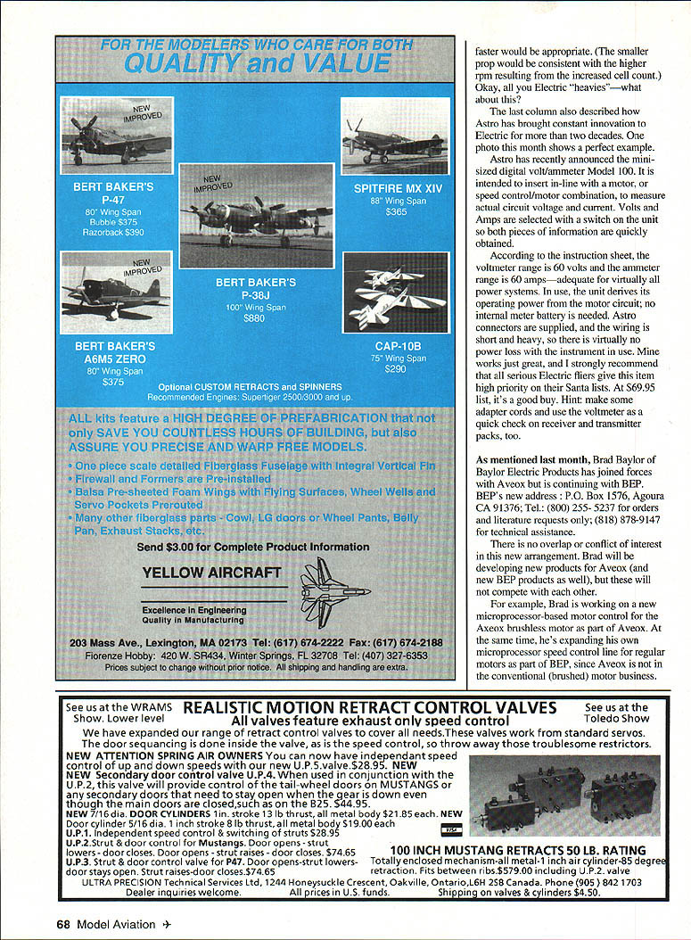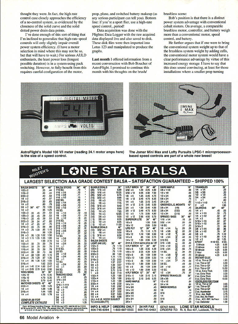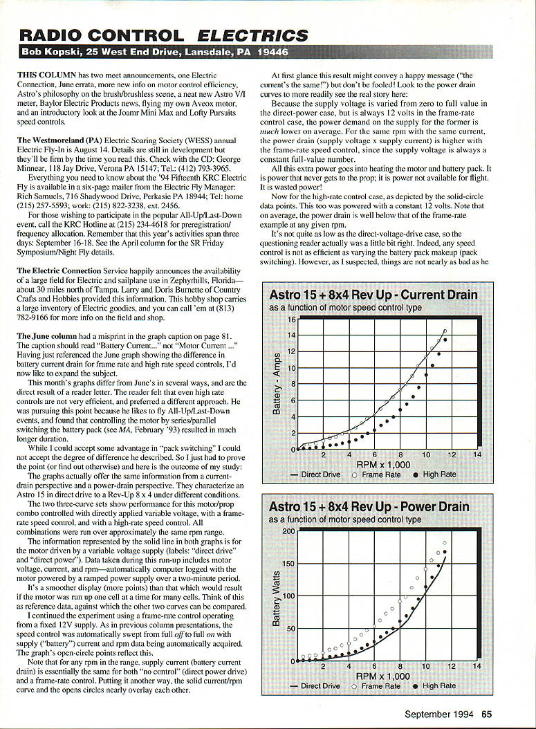 RADIO CONTROL ELECTRICS THIS COLUMN has two meet announcements Electric Connection June errata new info motor control efficiency Astros philosophy brush/brushless scene neat new Astro VII meter Baylor Electric Products news flying own Aveox motor introductory look Joamr Mini Max Lofty Pursuits speed controls Westmoreland PA Electric Soaring Society WESS annual Electric fly-In August 14 Details still development theyll firm time read Check CD George Minnear 118 Jay Drive Verona PA 15147 Tel 412 793-3965 Everything need know about 94 Fifteenth KRC Electric Fly available six-page mailer Electric Fly Manager Rich Samuels 716 Shadywood Drive Perkasie PA 18944 Tel home 215 257-5593 work 215 822-3238 ext 2456 wishing participate popular All-Up/Last-Down event call KRC Hotline 215 234-4618 preregistration frequency allocation Remember year s activities span three days September 16-18 See April column SR Friday Symposium/Night Fly details Electric Connection Service happily announces availability large field Electric sailplane use Zephyrhills Florida about 30 miles north Tampa Larry Doris Bumette Country Crafts Hobbies provided information hobby shop carries large inventory Electric goodies can call em 813 782-9166 info field shop June column misprint graph caption page 81 caption should read Battery Current. Motor Current Having just referenced June graph showing difference battery current drain frame rate high rate speed controls Id now like expand subject months graphs differ Junes several ways direct result reader letter reader felt high rate controls very efficient preferred different approach pursuing point because likes fly All-Up/Last-Down events found controlling motor series/parallel switching battery pack see MA February 93 resulted much longer duration could accept some advantage pack switching could accept degree difference described So just prove point find out otherwise outcome study graphs actually offer same information currentdrain perspective power-drain perspective characterize Astro 15 direct drive Rev-Up 8 x 4 under different conditions two three-curve sets show performance motor/prop combo controlled directly applied variable voltage framerate speed control high-rate speed control combinations run over approximately same rpm range information represented solid line both graphs motor driven variable voltage supply labels direct drive direct power Data taken during run-up includes motor voltage current rpmautomatically computer logged motor powered ramped power supply over two-minute period Its smoother display points would result motor run up cell time cells Think reference data against other two curves can compared continued experiment using frame-rate control operating fixed 12V supply As previous column presentations speed control automatically swept full off full supply battery current rpm data being automatically acquired graphs open-circle points reflect Note rpm range supply current battery current drain essentially same both no control direct power drive frame-rate control Putting another way solid current/rpm curve opens circles nearly overlay other first glance result might convey happy message currents same dont fooled Look power drain curves readily see real story Because supply voltage varied zero full value direct-power case always 12 volts frame-rate control case power demand supply former much lower average same rpm same current power drain supply voltage x supply current higher frame-rate speed control since supply voltage always constant full-value number extra power goes heating motor battery pack power never gets prop power available flight wasted power Now high-rate control case depicted solid-circle data points too powered constant 12 volts Note average power drain well below frame-rate example given rpm Ifs quite low direct-voltage-drive case questioning reader actually little bit right Indeed speed control efficient varying battery pack makeup pack switching However suspected things nearly bad September1994 65 00 C010Z~0C0fl3 C3w3w333wro CCCCCCC 01w 0~I n~ ~CC01 cvwi01 CC----- .. ~ ~0 C oC33 C0130 33303030 30 01 CC3- 3330 30 3G3C&3CC"t3 Z trt0 aC0 303 CO 30013-3 3CC-C-313103103031031 3003OC33310000.J030 0CCO30(00C ~3Cc3033000CC30C0130CCCe 0101 CCCrZ- -z ct0000000000033 C 00330C 330330 3131 0a3033C3310CCaw00-3-JtoaCa sC30t00~i34 33000000 0101r010CCra 3300111333OCr Oa003Ua01330fl003303333fl - - 0101aCOW OC C C C C 0 CCC 01 ,0C-3C-303 -CCC0C0C00CCC313t3-4C01jtJC31CCCO 310 3 C3103110013(31 33130C31 33030003030313131C 03003003303-3 0J~-3 4 33 3131 30030000031 3313131 0 33033030300303030303 a30O~30o30o30-304C 30C3030313 3000300300 33030 300000 0 0030 30 3030 3000 C3030300C 00 0330030 30000030C030000 00000 00 033300 oDo 01a 0 013 OTHERSIZESAVAILABLE F01 C 0 3Ca 001000N 00030 3330COC CCCaa C0-Ja 303010J 60103300330 3030 ICCO Z0 30 fl1-CCC30 0 ~ r33 rnmN555C5X000000000000 0000000 4SS -- E CO 1 0310 O 3 -030C04 0 063C03003 000030O0oo 0000030 0013O3C0 Coo 00 C 003 CO 0033003300 3030 030031 3 00300000 C ii CD -I CD ii rn 0 -I z C 0 rn 0 0 z -I ii CD -I w ICD CD -I CD 1 0 -I 0 z C C z -I rn ii 0 CD -u rTi 0 -L 0 0 0 i 3 DO n FJ c O O-t -3 en no o 0 00 0 0 CD CD w 0 CO 0 0 en en CD CD 0-I en neD 0 CDW CD C 5 0 0 0 en 0 0 0 0 0 en en 0 2 0 0 0 0 2 0 0 g- 06 ~ -l 301 0 6 -- 0 6 06 030 0 0 2306 0 0 0 0--3 0 02 6 0 0 6 0 0 02~ 0 - 0 0 00 0 0- 00 0 0 0 0 - 2 0 13 6 10 3000-600 0 - - 0- 6 2 0~ 0 06 0 6~ 00 00~0-- -00 0-300 020~0 3000000 030 0-00-0 30 00-0-6 2 0- 030 2 60 00030 00- o T0 0 6 60 o~ 00-0oo 10630-203 3000100 l00 6000 06~l1O~ 0 0 D 0 0 2 43 C, 2 ~0 ii 430 02 gb Ofl 0-0 01 cm 01-0 00 010 cnZ 011J1- C o M 00-Jz 3 00 p oro DZ wm 0 0-- C -iF cn 0 013 C- faster would appropriate smaller prop would consistent higher rpm resulting increased cell count Okay Electric heavieswhat about last column also described Astro has brought constant innovation Electric two decades photo month shows perfect example Astro has recently announced minisized digital voltlammeter Model 1