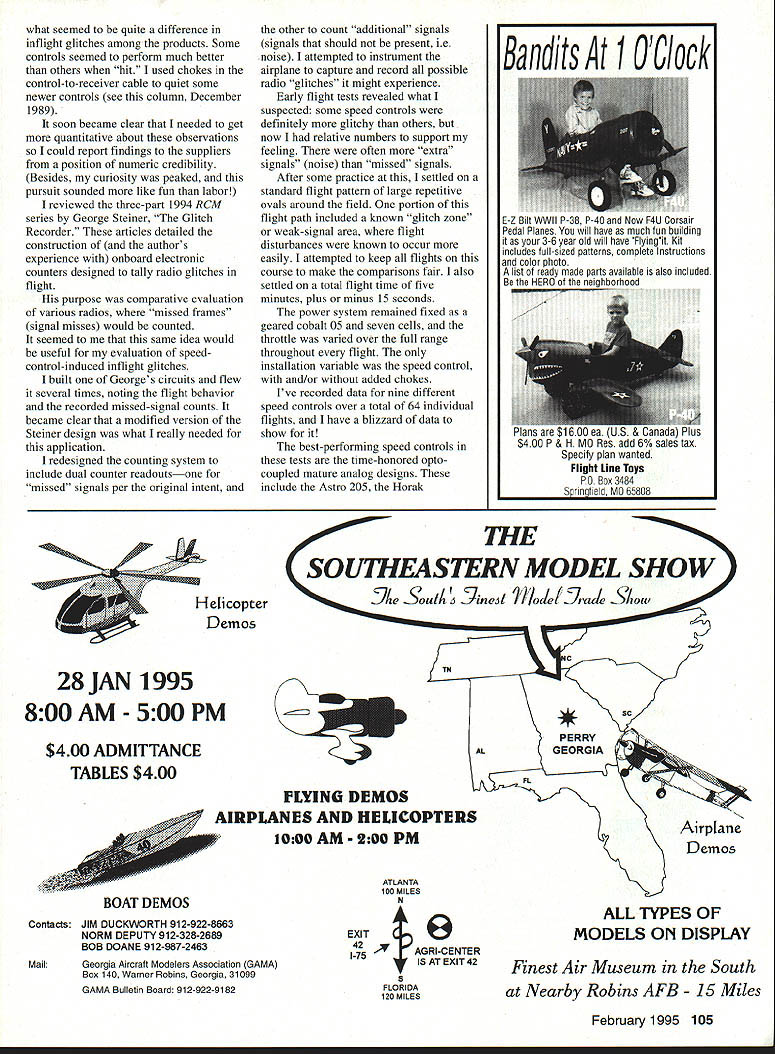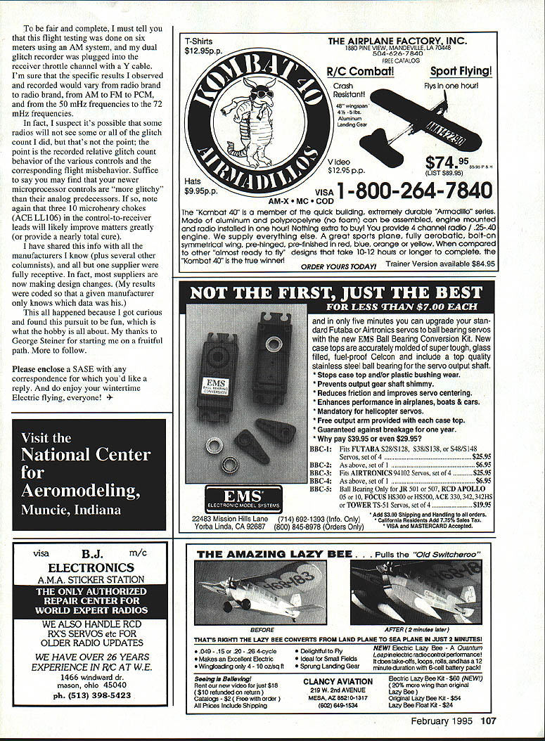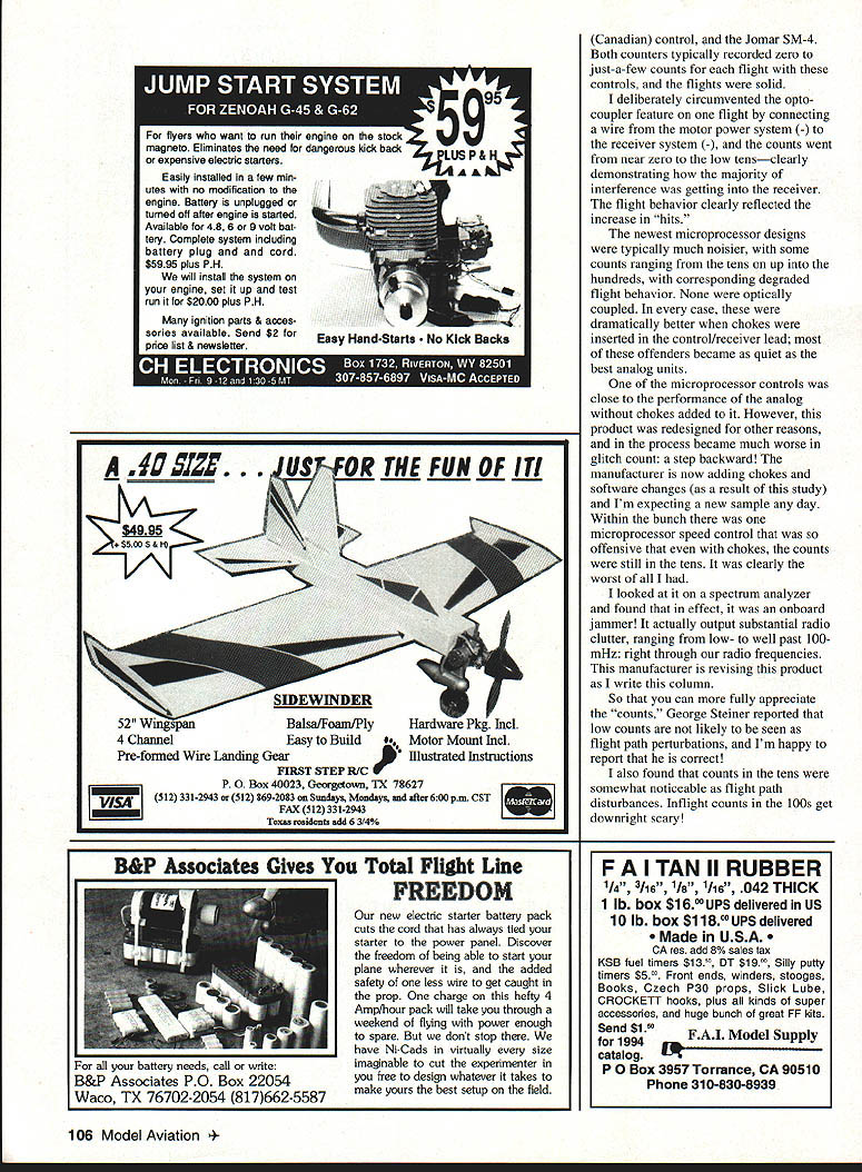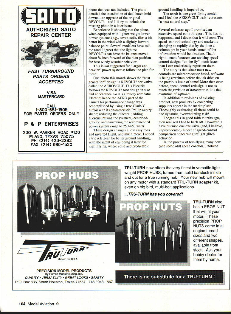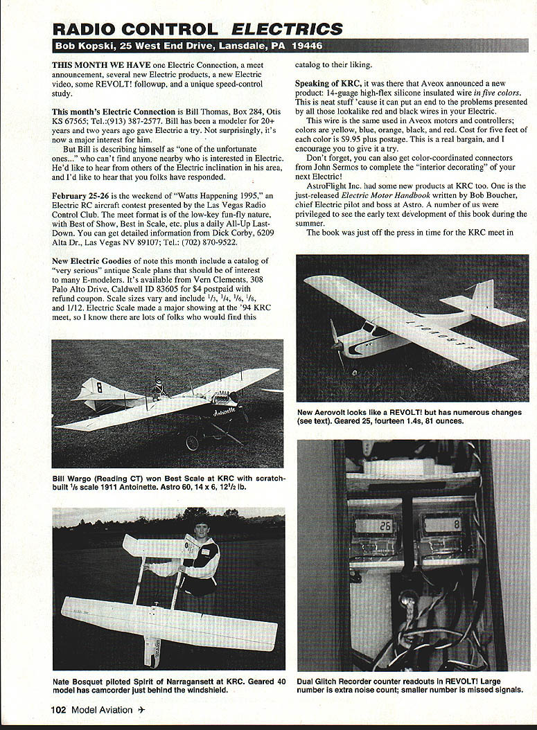 RADIO CONTROL ELECTRICS U f U THIS MONTH WE HAVE Electric Connection meet announcement several new Electric products new Electric video some REVOLT followup unique speed-control study months Electric Connection Bill Thomas Box 284 Otis KS 67565 Tel9 13 387-2577 Bill has modeler 20 years two years ago gave Electric try surprisingly its now major interest him Bill describing himself unfortunate ones. cant find anyone nearby interested Electric Hed like hear others Electric inclination area Id like hear folks have responded Fehruary 25-26 weekend Watts Happening 1995 Electric RC aircraft contest presented Las Vegas Radio Control Club meet format low-key fun-fly nature Best Show Best Scale etc plus daily All-Up LastDown can get detailed information Dick Corby 6209 Alta Dr Las Vegas NV 89107 Tel 702 870-9522 New Electric Goodies note month include catalog very serious antique Scale plans should interest E-modelers Its available Vein Clements 308 Palo Alto Drive Caldwell ID 83605 $4 postpaid refund coupon Scale sizes vary include 1/3 1/4 1/6 1/8 1/12 Electric Scale made major showing 94 KRC meet know lots folks would find catalog liking Speaking KRC Aveox announced new product 14-guage high-flex silicone insulated wire five colors neat stuff cause can put end problems presented lookalike red black wires Electric wire same used Aveox motors controllers colors yellow blue orange black red Cost five feet color $995 plus postage real bargain encourage give try Dont forget can also get color-coordinated connectors John Sermos complete interior decorating next Electric AstroFlight Inc some new products KRC too just-released Electric Motor Handbook written Bob Boucher chief Electric pilot boss Astro number us privileged see early text development book during summer book just off press time KRC meet Nate Bosquet piloted Spirit Narragansett KRC Geared 40 Dual Glitch Recorder counter readouts REVOLT Large model has camcorder just behind windshield number extra noise count smaller number missed signals 102 Model Aviation Aerovolt looks like REVOLT has numerous changes see text Geared 25 fourteen 14s 81 ounces Bill Wargo Reading CT won Best Scale KRC scratchbuilt 11e scale 1911 Antoinette Astro 60 14 x 6 121/2 lb September Bob autographing first copies made available public book must serious aspiring serious Electric modeler strongly recommend spend $1495 covers sorts things like set motor timing speedcontrol operation prop selection batteries etc explains just about everything about motors power systems use Bob also brought some other new Astro products including new catalog new helical-cut gear drives heavily vented cooling motors oval machined housings weight reduction two new microprocessor-controlled speed controls Isnt just great way Electric going/growing Another new product sorts KRC Electric Fly videoa professionally developed produced tape celebrates Electric highlighting fifteenth anniversary world-famous affair video covers three days activities write expected between two hours long includes highlights SR Friday Electric Symposium Second Annual SR Friday Night Fly extensive coverage Saturday Sunday field activities planes flying plus interviews prominent participants vendors attendance Particularly interesting video Electric airborne camera Don Nate Bosquet Rhode Island footage gives real overview perspective hundreds pilots models attendance Order KRC Video John Hickey 1624 Maple Ave Hatfield PA 19440 Cost $23 $20 S shippingforeign extra John said got 72 orders fieldand attendees since great way convince nonbelievers area Order own enjoyment turn club meeting program assure theres nothing like anywhere know will have impact REVOLT feedback starting come As write text November 1994 Model Aviation has out about two weeks seems few clarifications needed no cross-sheeting top bottom fuselage aft wing TE location except minimal amount shown plans battery area designed install packs standing up laying down proper cooling See photo page 33 November issue Regarding dihedral instructions text should have read propping up wing tips 3 4 bench same issue RC Electrics column text makes reference February 1995 103 few speed controls market Designs can change rapidly Most new controls microprocessor based YES THE TWIN-AIR 20 IS HERE AT LAST YES THE TWiN-AIR 20 REALLY CAN BE CONTROLLED ON JUST ONE ENGINE YES THE WV N-AIR 20 OFFERS THE SAME HIGH QUALITY PERFOR MANCE EASE OF FLYING AND HANDLING AEROBATIC CAPABIU TIES FUN TO BUILD AND FUN TO FLY FEATURES FOUND IN ALL NORTHEAST AERODYNAMIC KITS THE TRAIN-AIRS BEL-AIRS AND SPORT AIR YES ITS FROM . NORTHEAST AERODYNAMICS INC 4 NORTHEAST AERODYNAMICS INC 150 ROBINSON ROAD ON NH 03051 881-5899 Specifications Engine Requirement -Two 20-30 Wing Span 58 Wing Area 625 Sq 434 Sq Fuselage Length -43 Fuselage Width -35 Overall Weight Range -55 65 pounds Wing Loading Range 195 239 Sq Ft Radio Functions -4 Channel Ask local hobby shop order direct 4-1111) AUTHORIZED SAITO REPAIR CENTER VISA MASTERCARD CALL 1-800-651-1505 FOR PARTS ORDERS ONLY P & P ENTERPRISES 230 W PARKER ROAD 130 PLANO TEXAS 75075 PH 214 423-2282 FAX 214 980-1520 photo included photo detailed installation dual hatch holddownsan upgrade original REVOLTand Ill try include missing photo later issue Experience showing plane equipped lighter-weight lower power systems eg seven-cell flies bit better wind slightly forward balance point Several modelers have told agree lightest REVOLTs can have balance moved about /4 inch forward plan position best windy weather behavior suggested larger heavier power systems follow plan photo month shows next generation design REVOLT derivative called AEROVOLT Electric follows REVOLT root design size appearance its mildly aerobatic Electric hence AFRO part nameThis performance change accomplished using true Clark-Y airfoil its characteristic Phillips-entry shape reducing dihedral adding ailerons raising vertical center-ofgravity narrowing recommended power system range 250-450 wa