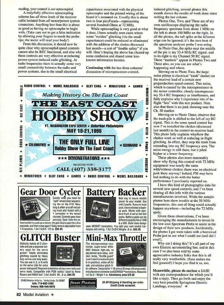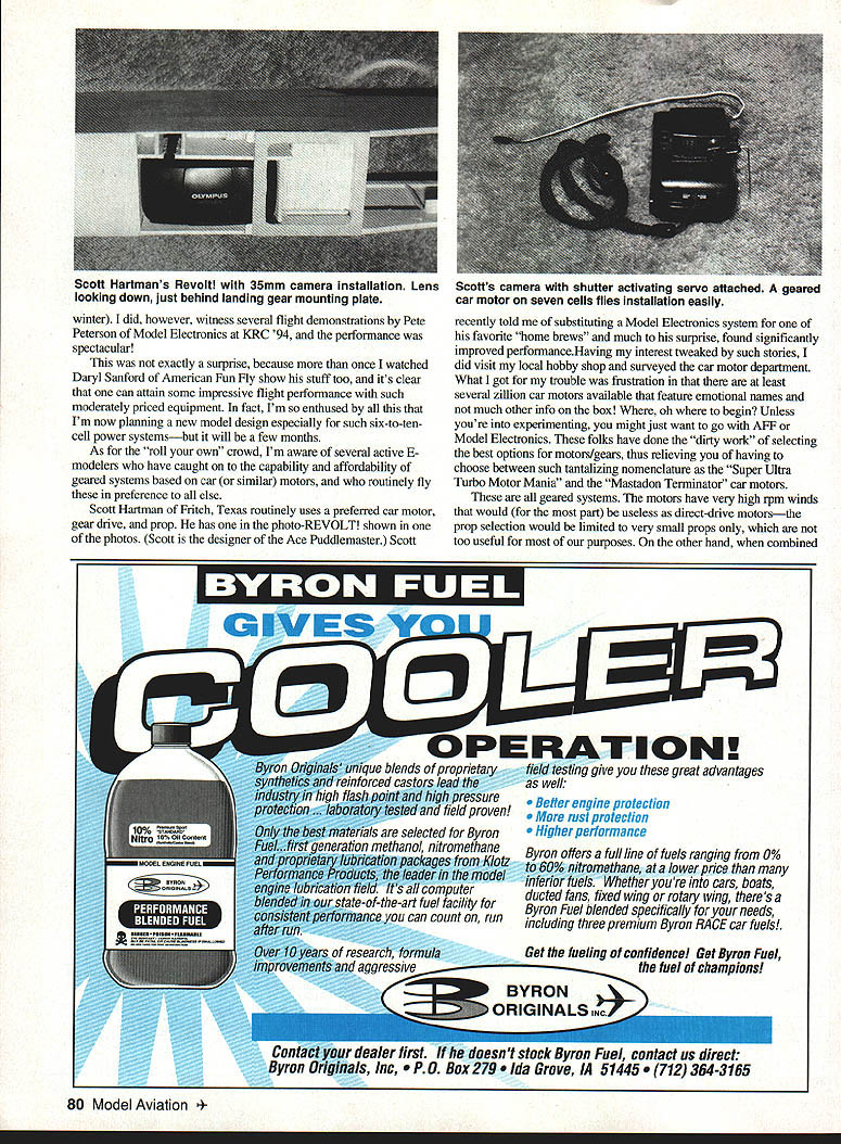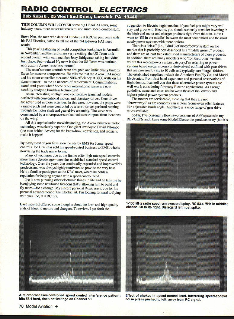 RADIO CONTROL ELECTRICS N 4-YEU COLUMN WILL COVER some big USA/FAI news some industry news motor alternatives speed-control stuff Steve Neu man dazzled hundreds KRC past years FM Electrics called tell 94 E-Power FAI meet results years gathering world competitors took place Australia November results very exciting US Team took second overall team member Jerry Bridgeman iaking individual first place Butrelated big news US Team outfitted custom Aveox brushless motors teams motor controls designed individually built Steve extreme compactness tells Aveox FM motor motor controller measured 90% efficiency 3000 watts dynamometerto unheard-of achievement Congratulations team guess what Some other international teams now carefully studying brushless technology As interesting sidelight competitive team models ouffitted conventional motors planetary drives Gear drives never used activities case however props variable pitch controlled servo-driven pushrod running through motor shaft gear-drive assembly servo commanded microprocessor sensor inputs locations wing sophistication notwithstanding Aveox brushless motor technology clearly superior giant attaboy David Palombo man behind Aveox know-how conviction moxie make happen now have seen ads EMS Jomar speed controls Joe Utasi has sold speed-control business EMS now using trade name Jomar know Joe first offer high-rate speed controls decade agonow established standard speed-control technology Over years Joe continually expanded improved products always highly motivated provide very best Hes familiar participant KRC meet holds reputation helping anyone speed control need Joe now pursuing other electronic things life tells enjoying some newfound freedom thats allowing him build fly morefor change sincere personal thank Joe personal advancement Electric art Im looking forward flying Joe KRC 95 Last month offered some thoughts about low- high-quality ends Electric motors chargers review put forth suggestion Electric beginners feel might very well stay grow Electric should seriously consider investing high-end motor charger products right start Now want fill middle between economical cosfly power systems options class ie kind motor/power system market probably best described middle ground product least two established manufacturers products addition modelers roll own versions within motor/power system categoryIm referring power systems based car motors derivatives ouffitted gear drives powered six 10 cells typically turn large folders established suppliers include American Fun Fly Co Model Electronics first-hand experience personal observations flight demos can tell alternative power systems well worth considering Electric applications As rough guideline associated costs between lowest- highest-priced power-system products motors serviceable meaning throwaways economy can motors Some offer features like adjustable brush angle wide range gear drive ratios available So far Ive personally flown two versions AFF systems REVOLTs have some Model Electronics products try its 78 Modei Aviation 0 MHz radio spectrum sweep display RC 534 MHz middle channel 50 its right Disregard leftmost spike microprocessor-controlled speed control interference pattern hits 534 hard does infringe Channel 50 Effect chokes speed-control lead Interfering speed-control noise pile pushed left away RC signal winter did however witness several flight demonstrations Pete Peterson Model Electronics KRC 94 performance spectacular exactly surprise because once watched Daryl Sanford American Fun Fly show stuff too its clear can attain some impressive flight performance such moderately priced equipment fact Im enthused Im now planning new model design especially such six-to-tencell power systemsbut will few months As roll own crowd Im aware several active E modelers have caught capability affordability geared systems based car similar motors routinely fly preference else Scott Hartman Fritch Texas routinely uses preferred car motor gear drive prop has photo-REVOLT shown photos Scott designer Ace Puddlemaster Scott recently told substituting Model Electronics system favorite home brews much surprise found significantly improved performanceHaving interest tweaked such stories did visit local hobby shop surveyed car motor department What got trouble frustration least several zillion car motors available feature emotional names much other info box oh begin Unless youre experimenting might just want go AFF Model Electronics folks have done dirty work selecting best options motors/gears thus relieving having choose between such tantalizing nomenclature Super Ultra Turbo Motor Mania Mastadon Terminator car motors geared systems motors have very high rpm winds would part useless direct-drive motorsthe prop selection would limited very small props too useful purposes other hand combined 80 Model Aviation t Hartmans Revolt 35mm camera Installation Lens looking down just behind landing gear mounting plate Scotts camera shutter activating servo attached geared car motor seven cells flies installation easily full line fuels ranging 0% banA ata lower price youre cars boats UUUWU IdiIS wwu wing rotay wing theres Byron Fuel blended specifically needs including three premium Byron RACE car fuels Get fueling confidence Get Byron Fuel sivethe fuel champions aler first , doesnt stock Byron Inc ox 279 Grove IA gear drives turning large props motors afford much performance flying fun course model design lends itself well large prop large folding prop some judgment required plan have detailed info product choices applications future now suggest send info suppliers get feel whats available American Fun Fly Co 7543 Maple Ave Pulaski NY 13142 Tel 315 298-3630 315 676-4988 Model Electronics 6500 6th Ave NW Seaffle WA 98117 Tel 206 7827458 February issue has out about two weeks readers reacting strongly speed-control discussion therein Im seeing lot reader interest because lot readers experiencing glitching problems also bec
