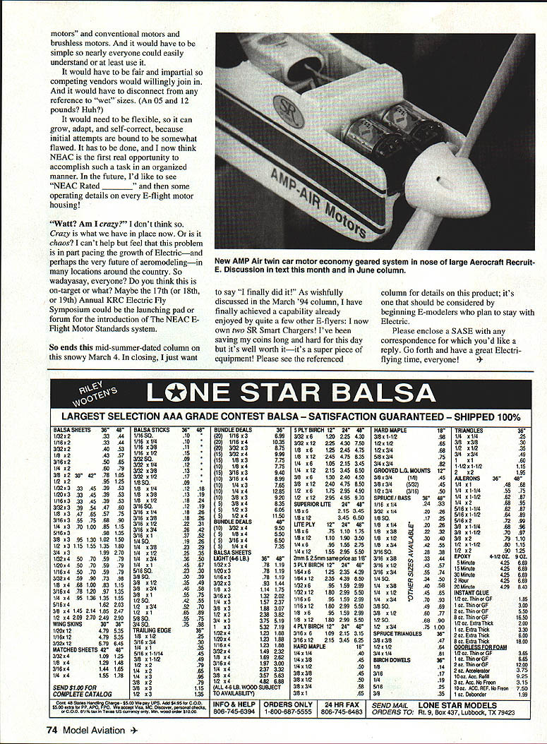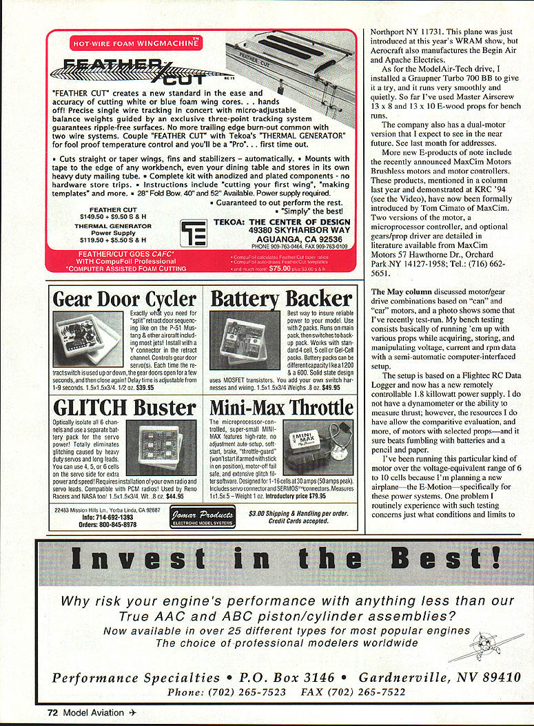 RADIO CONTROL ELECTRICS THIS MONTH WELL OPEN some sad news look upcoming E-meets new products testing motors watts like golden opportunity NEAC did friend fellow E-modeler fellow E-columnist Charlie Spear Mocksville NC departed flying field life Monday February 27 following recent illness first met Charlie KRC meet about decade ago flown him nearly year since KRC and/or Annual Labor Day Vintage Reunion Selinsgrove PA always enjoyed shared happy times will miss Charlie great deal Charlie lifelong modeler beginning rubber-powered twin pusher built Popular Mechanics plans 1931 became very interested free flight FF competition dabbled CL bit too Charlie also got involved full-scale employee Curtiss Wright job covering rudders P 40 fighters Next came early 50s Charlies entry RC participated some original Selinsgrove meetsthe gathering place RC greats daythe RC pioneers Charlie skilled graphic artist photographer own complete darkroom facility often made printed-circuit hoard artwork earliest RC equipment including what may have first receiver use transistor As years passed Charlie took interest Electric became well versed pursuit wellto extent Charlie Dr John Mountjoy became co authors Electric column RC Report several years ago recently Charlie John presented papers 94 KRC Symposium As happens got own copy 94 KRC video just two days after Charlies passing having great E-time within days receiving own copy Happy silent flying forever friend July 15-16 dates years Mid-America Electric Fun Fliesone large growing E-weckend jointly sponsored Ann Arbor Falcons Electric Flyers Only Saline MI its held weekend its viewed two meets club hosting day affair Ken Myers Keith Shaw respective CDs Ive past years know meet rapidly growing size attendance radius Everything hear about meet upbeat can get detailed info Ken Myers 1911 Bradshaw Ct Walled Lake MI 43890 Tel 810 669-8124 Keith Shaw 2756 70 Model Aviation 4Astro cobalt 05 G several geared car can motors John Worths unusual Vintage Cement Mixer has pusher folder discussed text Usable cell count varies six ten Master Airscrew motor amidships long torque rod rear ModelAir-Tech belt-drive unit Graupner Turbo 700 BB attached Will accept wide variety motors see text Motor voltage current rpm data taken over 200 linear voltage sweep Values can imported spreadsheet Elmwood Ann Arbor MI 48104-6624 Tel 313 973-6309 Unfortunately same dates Sixth Annual Voltaires Electric Fun-Fly central NY E-group established third weekend July annual event its very hard everyone keep track other example planned attending meet last year called directions week following meet Anyway folks have lots planned yearincluding free flight activity Theres too much else include get touch Jim McMaster 315 676-4870 Bill Griggs 315 6978152 Tim Smarzo 315 673-1278 FF info its exclusively E-meet above-referenced Selinsgrove Vintage meet attracts lot E-fliers have outfitted RC Vintage designs contemporary quiet power Ive truly enjoyed gathering Selingsgrove PA past several Labor Day weekends Unfortunately historic Selinsgrove facility available 95 Annual Vintage Reunion will held Delaware RC Clubs field state park near Newark DE field rescue came about through efforts John Stare September 2-3 meet being organized Vintage RC Society VRCS can get full details John Worth 4326 Andes Dr Fairfax VA 22030 Tel 703 273-0607 Sixteenth Annual KRC Electric Fly scheduled September 15-17 Like last year Larry Sribnick SR Batteries will host all-day Friday Symposium featuring about 10 guest speakers will also host Third Annual KRC Night Fly evening like years past meet itself will feature Electric stuff can see anywhere time fun flyin can tolerate Theres now some early discussion about possibility demonstrating Electric control line expert CL modelers including world champion Bob Hunt Flying Models can get detailed mailer meet manager Anthony Assetto 639 Neshaminy Ave Warrington PA 18976 Tel 215 491-9419 have mentioned professionally produced video 94 KRC meet several times 112-minute tape available everyone presents great overview hundreds Electrics huge crowd last year includes excerpts Sysmposium Night Fly really looks good daytime activities Hundreds have sold VHS tapes still available $23 includes US first-class postage KRC Video John Hickey 1624 Maple Ave Hatfield PA 19440 great-granddaddy Electric meetsthe Astro Champsis scheduled September 23-24 25th anniversary first-in-the-nation E meet hosted year Southern California Electric Flyers support Bob Boucher Astro Flight Activities include Pylon Racing 7-Cell Cargo Scale Aerobatics plus fun-fly events everyone particular note innovative Cargo event basically weight lifting contest airplanes powered Astro 05 motors past event won 12-pound flight Chuck Hollinger Cargo has specific rules/requirements sounds like great challenging fun can get particulars John Raley SCEF 1375 past potential computer radio users fog about systems fearing just too difficult program introduction Hitecs Prism 7 Computer Radio no longer case Prism 7 has cleared way make computer programmers out everyone has ever wanted own sophisticated systems Prism 7 easiest-to-program computer radio market today user-friendly two-loop menu selection models functions servo directions other key features program ming snap Its easy anyone can stylish transmitter case ergonomically de signed regular pilots mind Smooth con tours logical switch placement finger ridges molded rear case make trans mitter look feel like costing hundreds Included system Hitec/RCDs Bullet Proof 8 channel Supreme receiver powerful HS 422 servos full system nicads Prism 7 represents outstanding value computer radios So fear no get down local Hitec/RCD dealer today demonstration really easy computer radio use Logan Ave Costa Mesa CA 92626 Tel day 714 641-1776 evening 714 8924405 Fax 714 641-1050 Last month mentioned both AMP Air Gear Box ganged motors ModelAir-Tech belt driveboth new products intended large-but-economical Elec