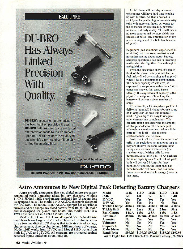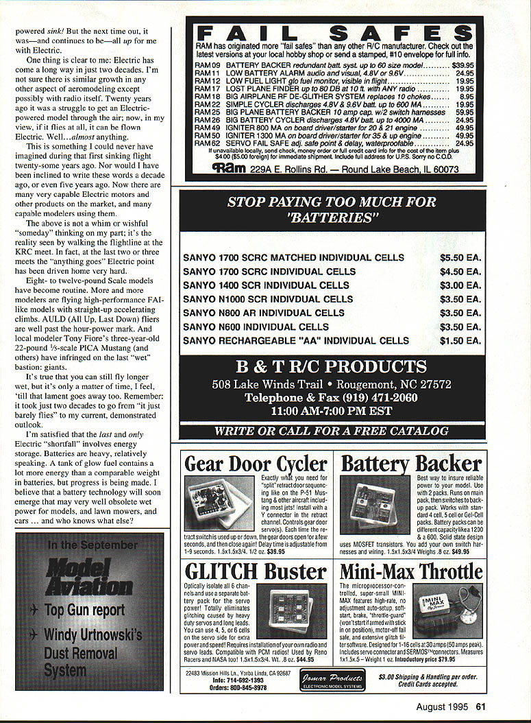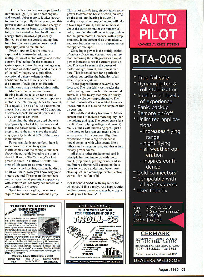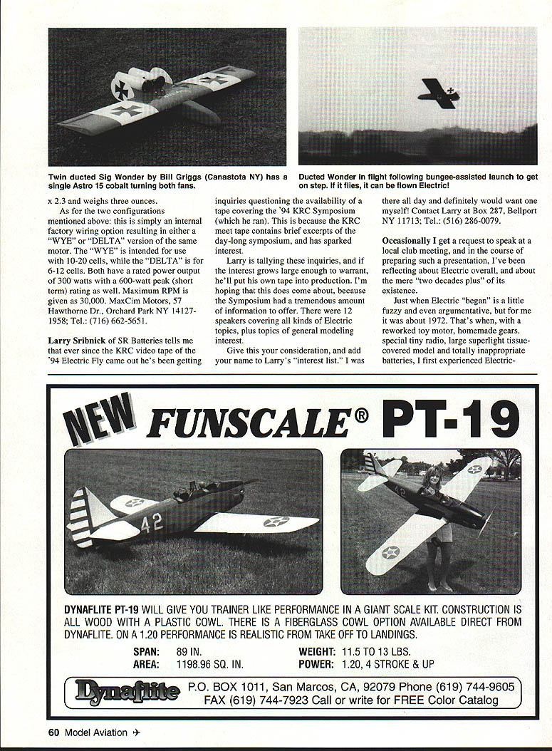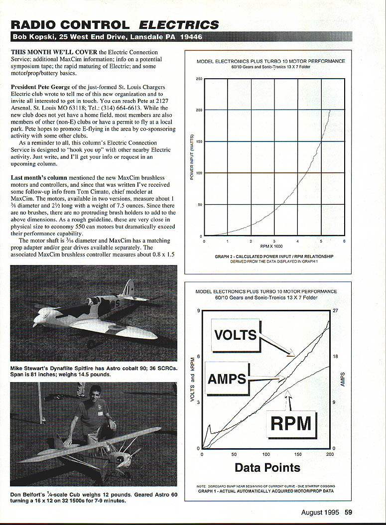 RADIO CONTROL ELECTRICS 11 U ri k1 W4iU'gL-l m 1 IE I THIS MONTH WELL COVER Electric Connection Service additional MaxCim information info potential symposium tape rapid maturing Electric some motor/prop/battery basics President Pete George just-formed St Louis Chargers Electric club wrote tell new organization invite interested get touch can reach Pete 2127 Arsenal St Louis MO 63118 Tel 314 664-6613 new club does yet have home field members also members other non-E clubs have permit fly local park Pete hopes promote E-flying area co-sponsoring activity some other clubs As reminder columns Electric Connection Service designed hook up other nearby Electric activity Just write Ill get info request upcoming column Last months column mentioned new MaxCim brushless motors controllers since written Ive received some follow-up info Tom Cimato chief modeler MaxCim motors available two versions measure about 1 3/ diameter 2/2 long weight 75 ounces Since no brushes no protruding brush holders add above dimensions As rough guideline very close physical size economy 550 can motors dramatically exceed performance capability motor shaft 3/is diameter MaxCim has matching prop adapter and/or gear drives available separately associated MaxCim brushless controller measures about 08 x 15 August1995 59 MODEL ELECTRONICS PLUS TURBO 10 MOTOR PERFORMANCE 60/10 Gears arid Sonic-Tronics 13 X 7 Folder 250 200 150 S z w 100 C S 50 0 012 455 RPM X 1000 GRAPH 2 ULATED POWER INPUT 1RPM RELATIONSHIP DERIVED FROM THE DATA DISPLAYED IN GRAPH 1 Mike Stewarts Dynaflite Spitfire has Astro cobalt 90 36 SCRCs Span 81 inches weighs 145 pounds MODEL ELECTRONICS PLUS TURBO 10 MOTOR PERFORMANCE 60/10 Gears Sonic-Tronics 13 X 7 Folder 27 VOLTS 18 0 03 C C, I-J 0 39 00 050100150200 Data Points NOTE DISREGARD BUMP NEAR BEGINNING OF CURRENT CURVE DUE STARTUP COGGING GRAPH AL AUTOMATICALLY ACQUIRED MOTOR/PROP DATA Don Belforts 1A-scale Cub weighs 12 pounds Geared Astro 60 turning 16 x 12 32 1500s 7-9 minutes x 23 weighs three ounces As two configurations mentioned above simply internal factory wiring option resulting either WYE DELTA version same motor WYE intended use 10-20 cells DELTA 6-12 cells Both have rated power output 300 watts 600-watt peak short term rating well Maximum RPM given 30000 MaxCim Motors 57 Hawthorne Dr Orchard Park NY 141271958 Tel 716 662-5651 Larry Sribnick SR Batteries tells ever since KRC video tape 94 Electric Fly came out hes getting inquiries questioning availability tape covering 94 KRC Symposium ran because KRC meet tape contains brief excerpts day-long symposium has sparked interest Larry tallying inquiries interest grows large enough warrant hell put own tape production Im hoping does come about because Symposium tremendous amount information offer 12 speakers covering kinds Electric topics plus topics general modeling interest Give consideration add name Larrys interest list day definitely would want myself Contact Larry Box 287 Bellport NY 11713 Tel 516 286-0079 Occasionally get request speak local club meeting course preparing such presentation Ive reflecting about Electric overall about mere two decades plus its existence Just Electric began little fuzzy argumentative about 1972 Thats reworked toy motor homemade gears special tiny radio large superlight tissuecovered model totally inappropriate batteries first experienced ElectricFUNSCALE PT1 9 DYNAFLITE PT-19 WILL GIVE YOU TRAINER LIKE PERFORMANCE IN GIANT SCALE KIT CONSTRUCTION IS ALL WOOD WITH PLASTIC COWL THERE IS FIBERGLASS COWL OPTION AVAILABLE DIRECT FROM DYNAFLITE ON 120 PERFORMANCE IS REALISTIC FROM TAKE OFF TO LANDINGS SPAN89 IN AREA 119896 SQ IN WEIGHT 115 TO 13 LBS POWER 1204 STROKE & UP PO BOX 1011 San Marcos CA 92079 Phone 619 744-9605 1 FAX 619 744-7923 Call write FREE Color Catalog 60 Model Aviation ducted Sig Wonder Bill Griggs Canastota NY has aDucted Wonder flight following bungee-assisted launch get single Astro 15 cobalt turning both fanson step flies can flown Electric powered sink next time out wasand continues beall up Electric thing clear Electric has come long way just two decades Im sure similar growth other aspect aeromodeling except possibly radio itself Twenty years ago struggle get Electricpowered model through air now view flies can flown Electric Well. almost anything something could never have imagined during first sinking flight twenty-some years ago Nor would have inclined write words decade ago five years ago Now very capable Electric motors other products market capable modelers using above whim wishful someday thinking part its reality seen walking flightline KRC meet fact last two three meets anything goes Electric point has driven home very hard Eight- twelve-pound Scale models have become routine modelers flying high-performance FAI like models straight-up accelerating climbs AULD Up Last Down fliers well past hour-power mark local modeler Tony Fiores three-year-old 22-pound 1A-scale PICA Mustang others have infringed last wet bastion giants Its true can still fly longer wet its matter time feel till lament goes away too Remember took just two decades go just barely flies current demonstrated outlook Im satisfied last Electric shortfall involves energy storage Batteries heavy relatively speaking tank glow fuel contains lot energy comparable weight batteries progress being made believe battery technology will soon emerge may very well obsolete wet power models lawn mowers cars . knows what else SANYO 1700 SCRC INDIVIDUAL CELLS SANYO 1400 SCR INDIVIDUAL CELLS $300 EA SANYO N1000 SCR INDIVDUAL CELLS $350 EA SANYO N800 AR INDIVIDUAL CELLS $350 EA SANYO N600 INDIVIDUAL CELLS $350 EA SANYO RECHARGEABLE AA INDIVIDUAL CELLS Gear Door Cycler put retractdoorsequenc ing like P-51 Mus g jets Install tang & other aircraft includ Y connector retract channel Controls gear door servos time re tract switch used up ordown geardoors open torafew seconds close again Delaytime isadjustablefrom 1-9 seconds 15x15x3/4 1/2 sz $39