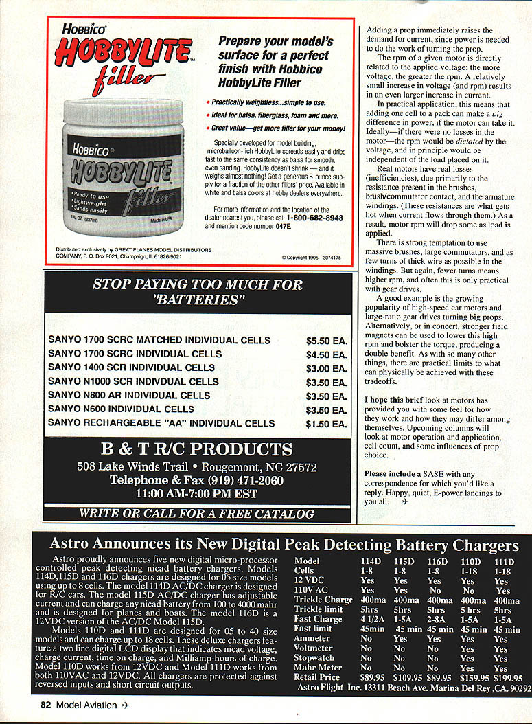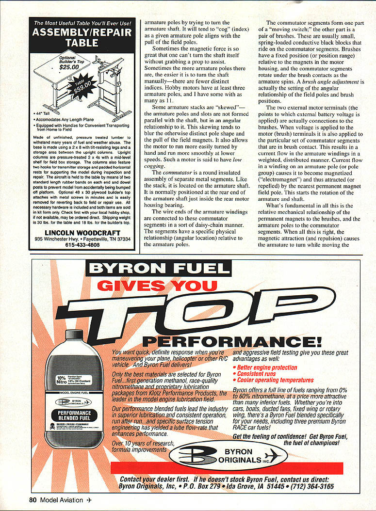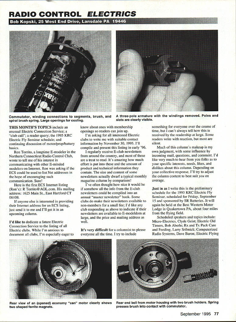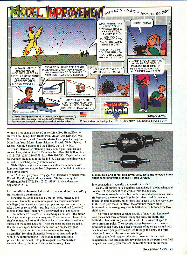 RADIO CONTROL ELECTRICS THIS MONTHS TOPICS include unusual Electric Connection Service club call reader query 1995 KRC Electric Fly Seminar schedule continuing discussion motor/prop/battery basics Ron Torrito longtime E-modeler Northern Connecticut Radio Control Club wrote tell interest communicating other E-minded modelers Internet Ron asking ECS could used list Net addresses hope encouraging such communication Sure first ECS Internet listing Rons R Torrito@AOLcom mailing address 1625 Main St East Hartford CT 06108 anyone else interested providing Internet address ECS listing just send Ill get upcoming column know about ones membership openings readers can join up Im asking interested Electric clubs write suitable contact information November 30 1995 Ill compile present listing early 96 regularly receive E-club newsletters around country treat read Its amazing much effort put amount product technical information contain size content some newsletters actually dwarf typical monthly magazine column comparison Ive often thought nice would somehow info E-club newsletters could compiled annual master newsletter book Some clubs make newsletters available non-members small fee Id like club responding above indicate newsletters available E-modeldom large price mailing address well Id like dedicate future Electric Connection Service listing Electric clubs Im anxious to Its very difficult columnist please document clubs Im especially eager everyone time try include something everyone over course time cant always tell received readership large Some readers write reaction silent Much columns makeup own judgment some influence incoming mail questions comment Id like very much hear folks specific interests needs likes dislikes about column Depending collective response Ill try adjust column content best suit average Just write preliminary schedule 1995 KRC Electric Fly Seminar scheduled Friday September 15 sponsored SR Batteries will again held Best Western Motor Lodge Quakertown PA about four miles flying field Scheduled speakers topics include Micro-Electrics Clyde Geist Electric Old Timers Bob Aberle Rx Tx Pack Care Feeding Larry Sribnick Computerized Radio Systems Dave Baron Electric Flying September1995 77 Commutator winding connections segments brush spiral brush spring Large openings cooling three-pole armature windings removed Poles slots clearly visible Rear view opened economy r clearly showsRear end bell motor housing two brush holders Spring two shaped ferrite magnetspresses brush contact commutator Wings Keith Shaw Electric Control Line Bob Hunt Electric Ducted Fan Flying Tom Hunt Twin Motor Gear Drives Clyde Geist Electronic Speed Controls Martin Euredjian Getting Most Motor Larry Sribnick Electric Night Flying Bob Kopski Online Services NEAC Larry Sribnick interested attending 9 am-5 pm seminar can contact Larry Sribnick SR Batteries Inc Box 287 Bellport NY 11713 Tel 516 286-0079 fax 516 286-0901 Registration reservations required fee $15 Last years seminar sellout dont dilly-dally Night Flying begins about two hours after seminar closes Last year 200 persons field witness nifty display SASE will get five-page KRC Electric Fly mailer Electric Fly Manager Anthony Assetto 639 Neshaminy Ave Warrington PA 18976 Tel 215 491-9419 Meet dates September 15-17 Last months column included discussion Motor/Battery/Prop Basics continuation Modelers often puzzled motor terms makeup operation Examples common questions concern armature windings turns motor magnets proper voltage Lets take look some starting conventional brnshed motors brushless motors will covered later column motors use permanent magnet motorsthe motor housing contains permanent magnets also referred field magnets typically attached around curved inner surface motor housing magnets also shaped inner space between forms empty cylinder Normally motors have two magnets magnet assemblies forming diametrically opposed magnetic poles within motor housingthe classic north south poles individual field pole magnets connected other iron motor housing interconnection actually magnetic circuit Nearly motors have openings somewhere housing some inner stuff visible outside annaturethe assembly motor shaftresides inside between two magnetic poles just described does touch field magnets sized spaced rotate very close field pole faces effect armature metalwork immersed strong magnetic field exists between two field poles typical armature consists mainly thin laminated iron plates form stack along armature shaft individual laminations hence stack shaped form armature poles spaces/grooves between armature poles called slots poles groups poles wound insulated wire magnet wire passed through slots form what known armature windings Unlike field magnets iron armature poles magnetized armature has few poles permanent field magnets strong can feel resulting pull metal September 1995 79 ROAR1S SURFACE DEFLECTION INDICATOR IS GREAT FOR PRECISION ADJUSTMENTS OF ELEVATORS AILERONS FLAPS AND RUDDER ANDTOMAKESURE PIkIIJtO AMD PROP TURN THE ROART HIALANCER tools correctly set up model fly time Send eelf -addressed stamped complete product cataloe todayRolart Manufacturing IncPOox 1247 Eleven-pole three-pole armatures Note skewed stack laminations visible 11-pole version Optional Builders Top $2500 44 Tall Accomodates Any Length Plane Equipped Handes Convenient Transporting Home Fietd Made unfinished pressure treated lumber withstand years fuel weather abuse base made using 2 8 tilt-resisting legs storage area between upright columns Upright cot umna pressure-treated 2 4s mid-level shelf field boa storage cotumna also feature two hooks transmitter storage padded horizontal rests supporting model during inspection repair aircraft hetd table means two standard length rubber bands end dowet posts prevent modet accidentally being bumped off platform Optional 48 30 plywood builders top attaches metal screws minutes easily removed reverting back field repair use necessary 